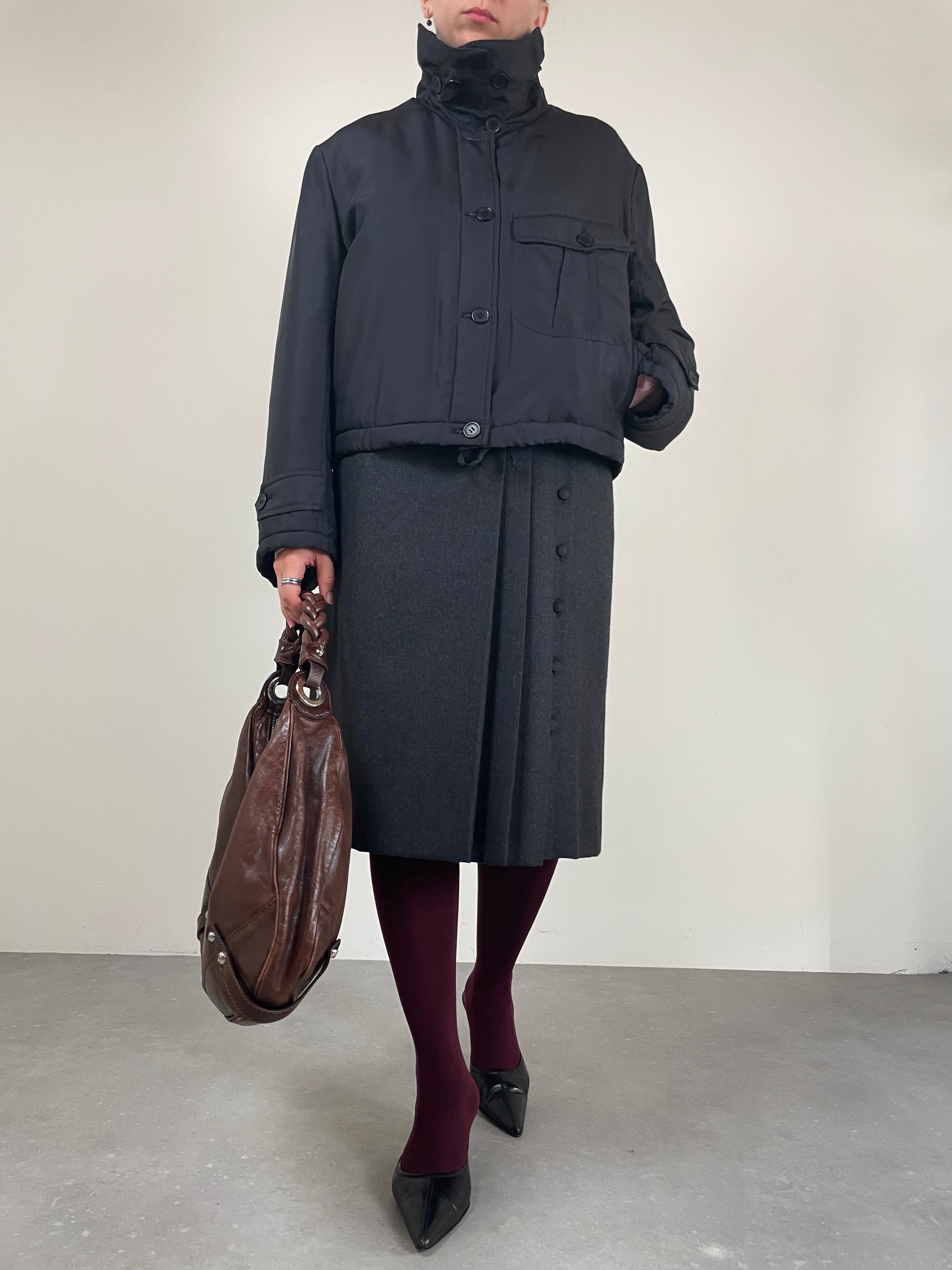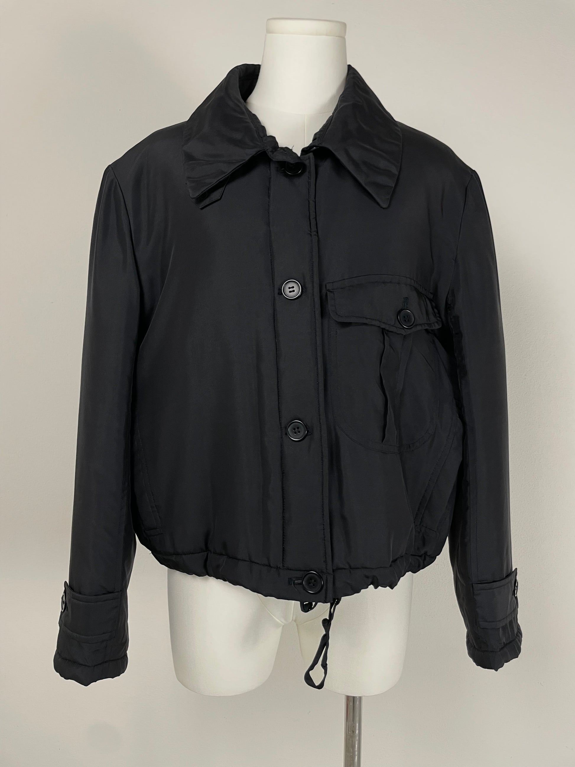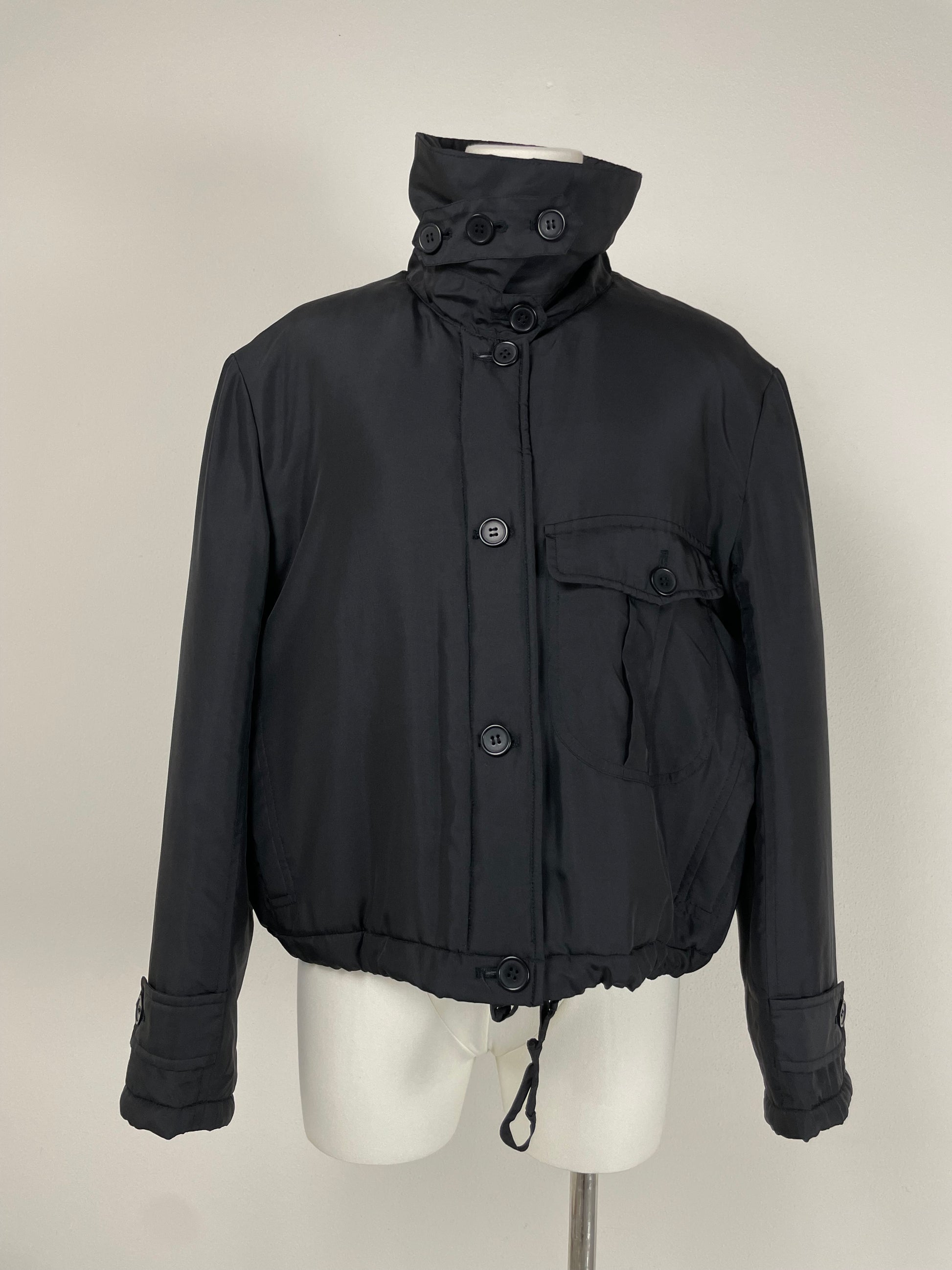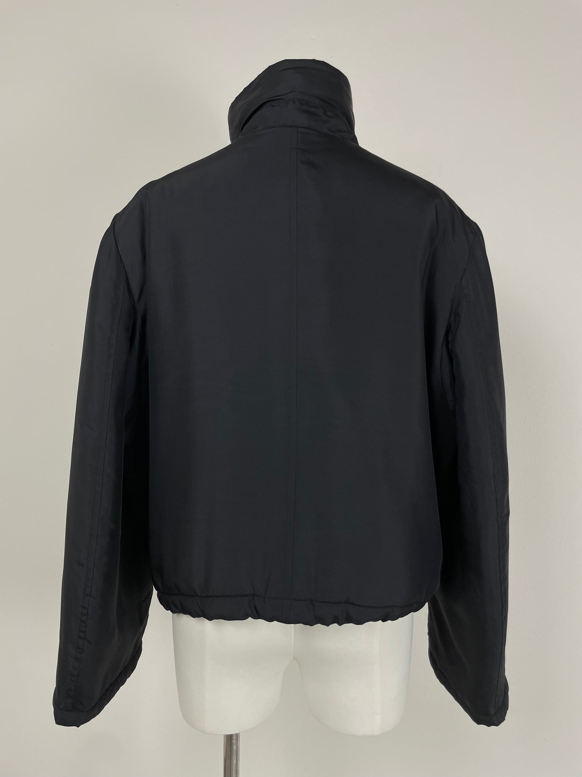 Piumino corto in pura seta nera, vintage Made in Italy, leggermente imbottito, dal design minimale e costruzione sartoriale.