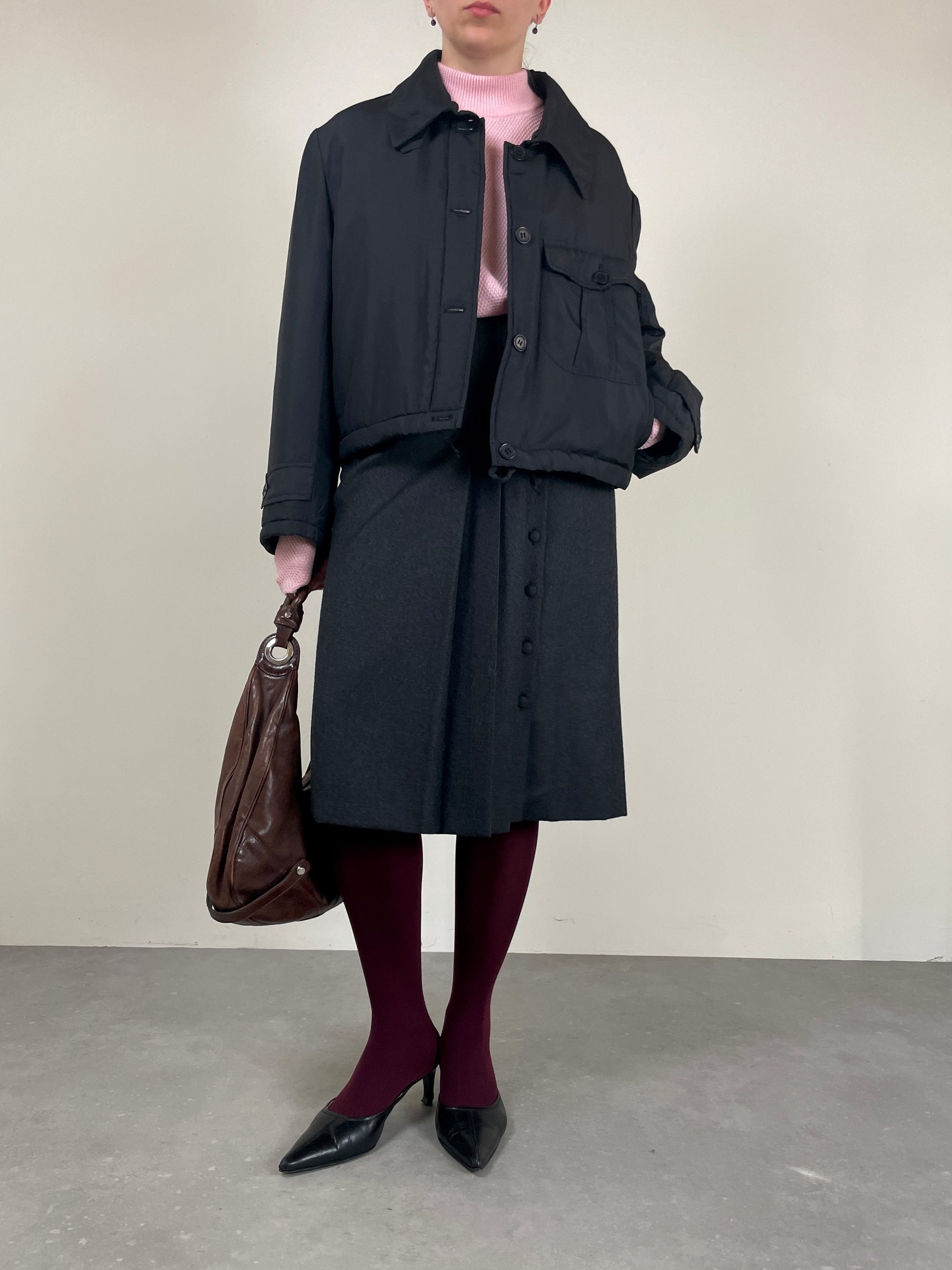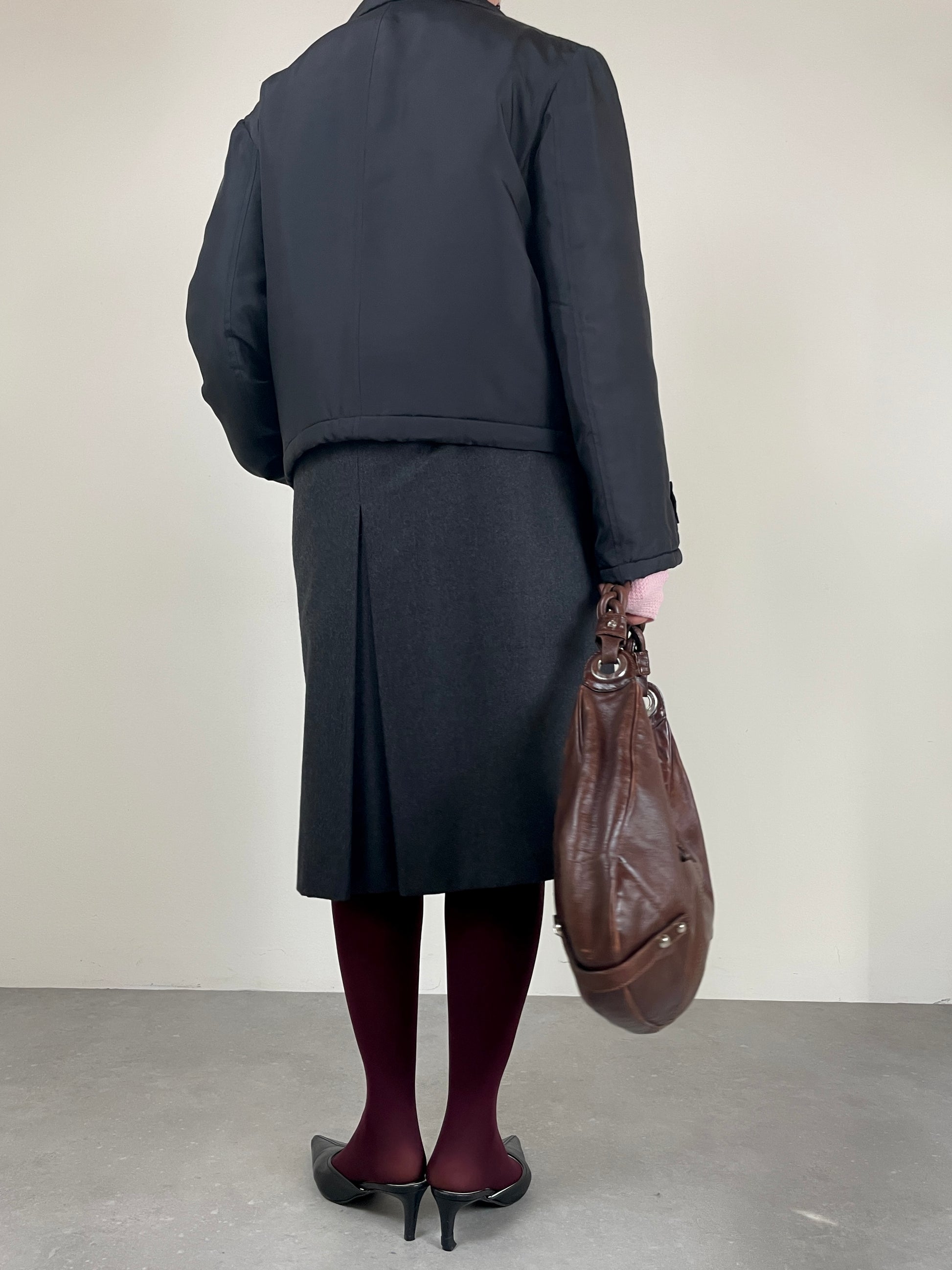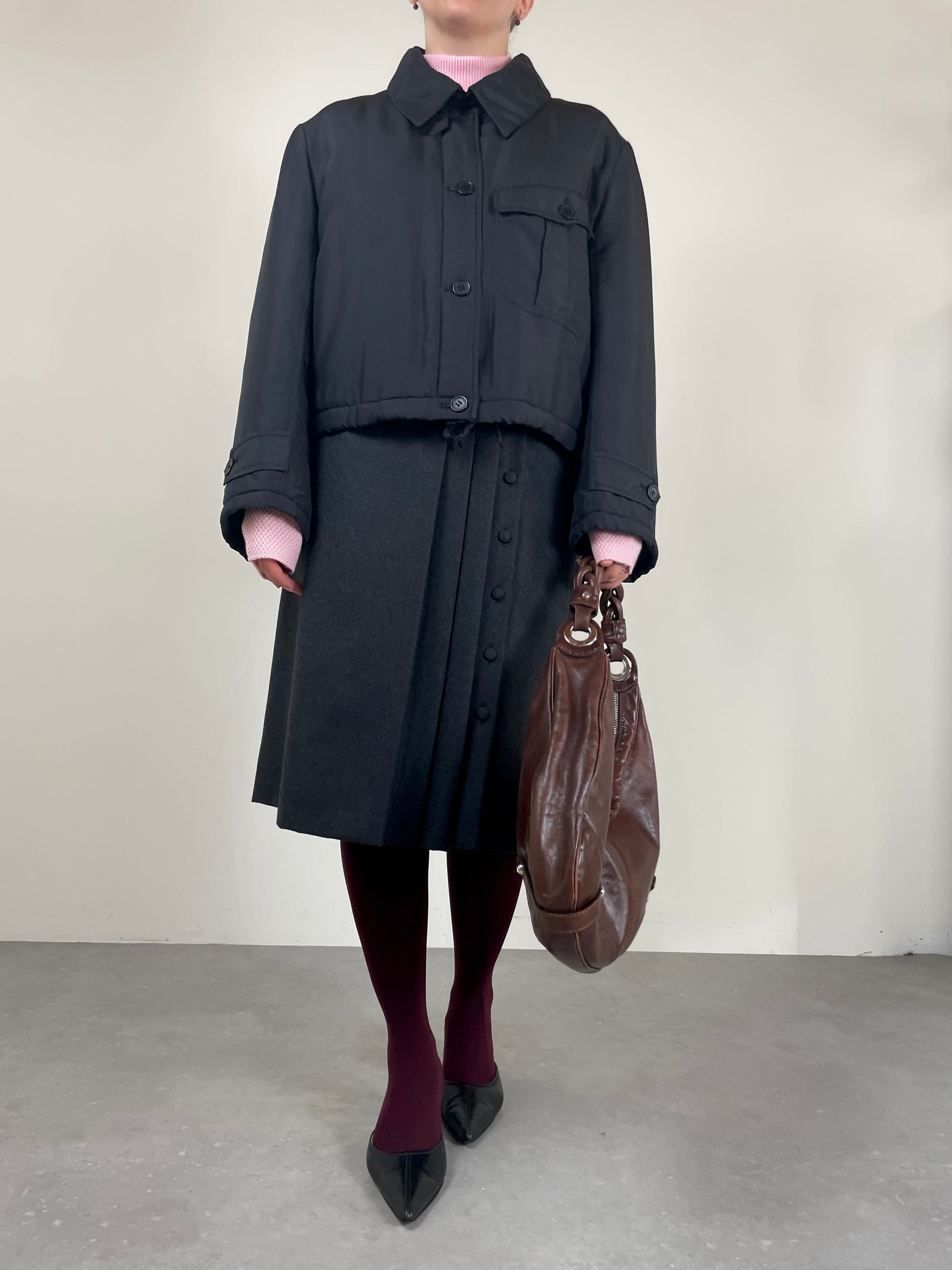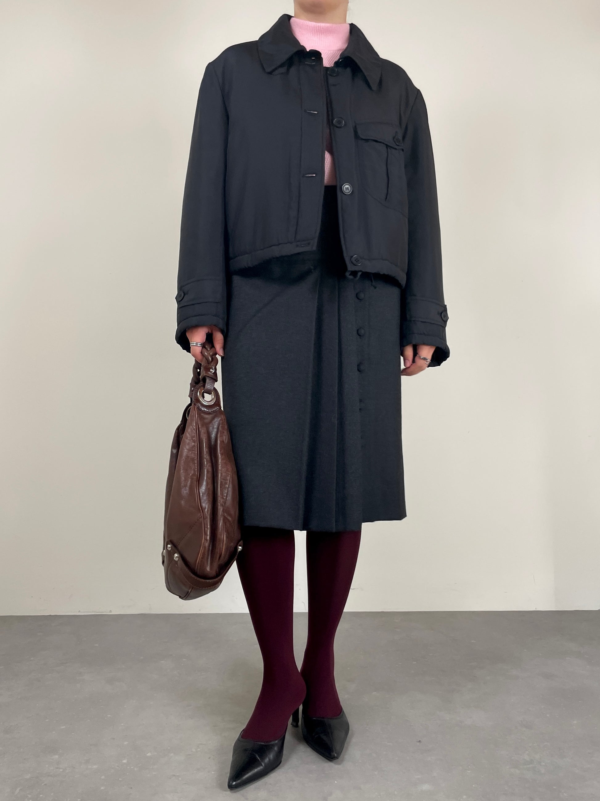 Piumino corto in pura seta nera, vintage Made in Italy, leggermente imbottito, dal design minimale e costruzione sartoriale.