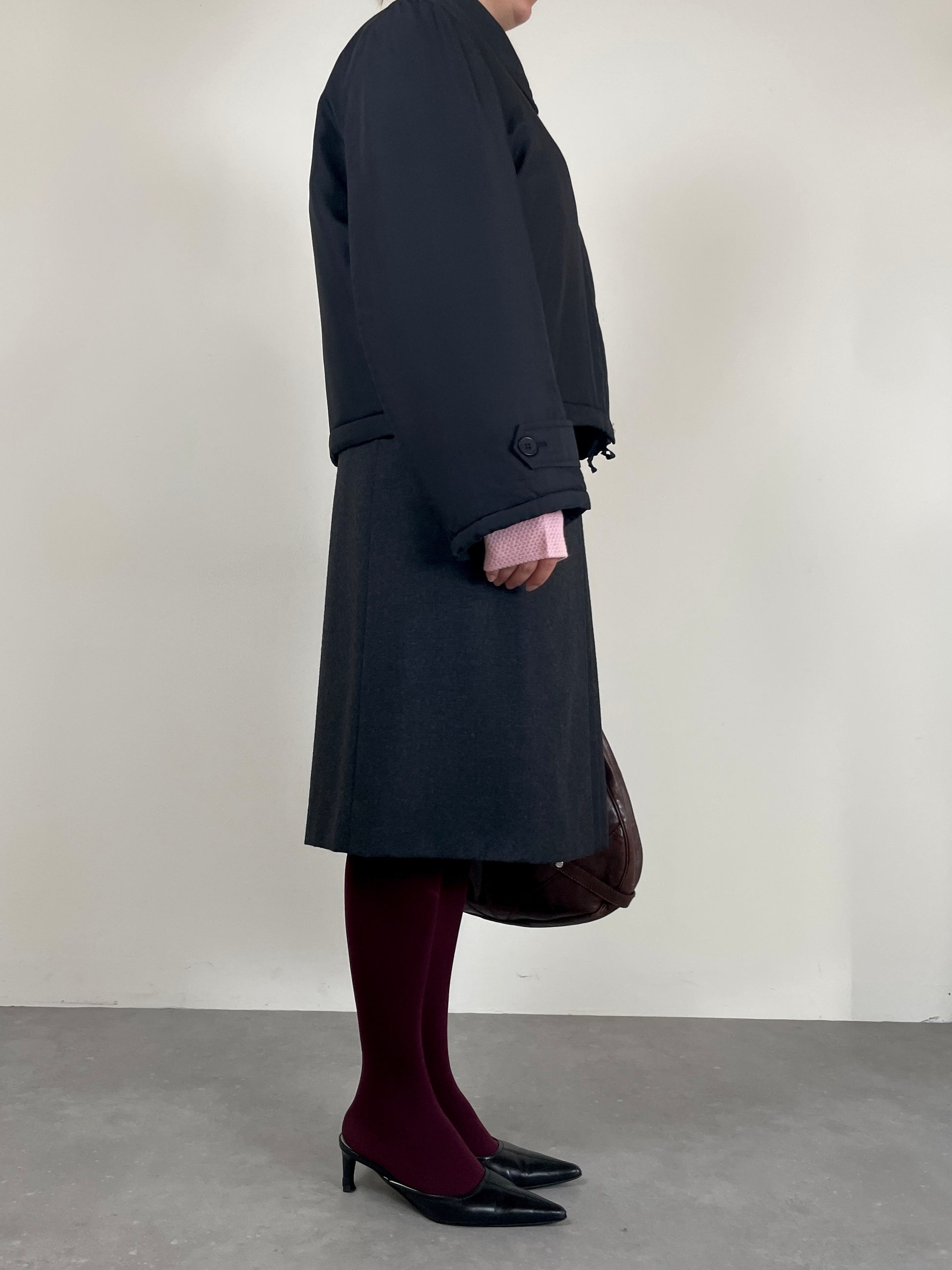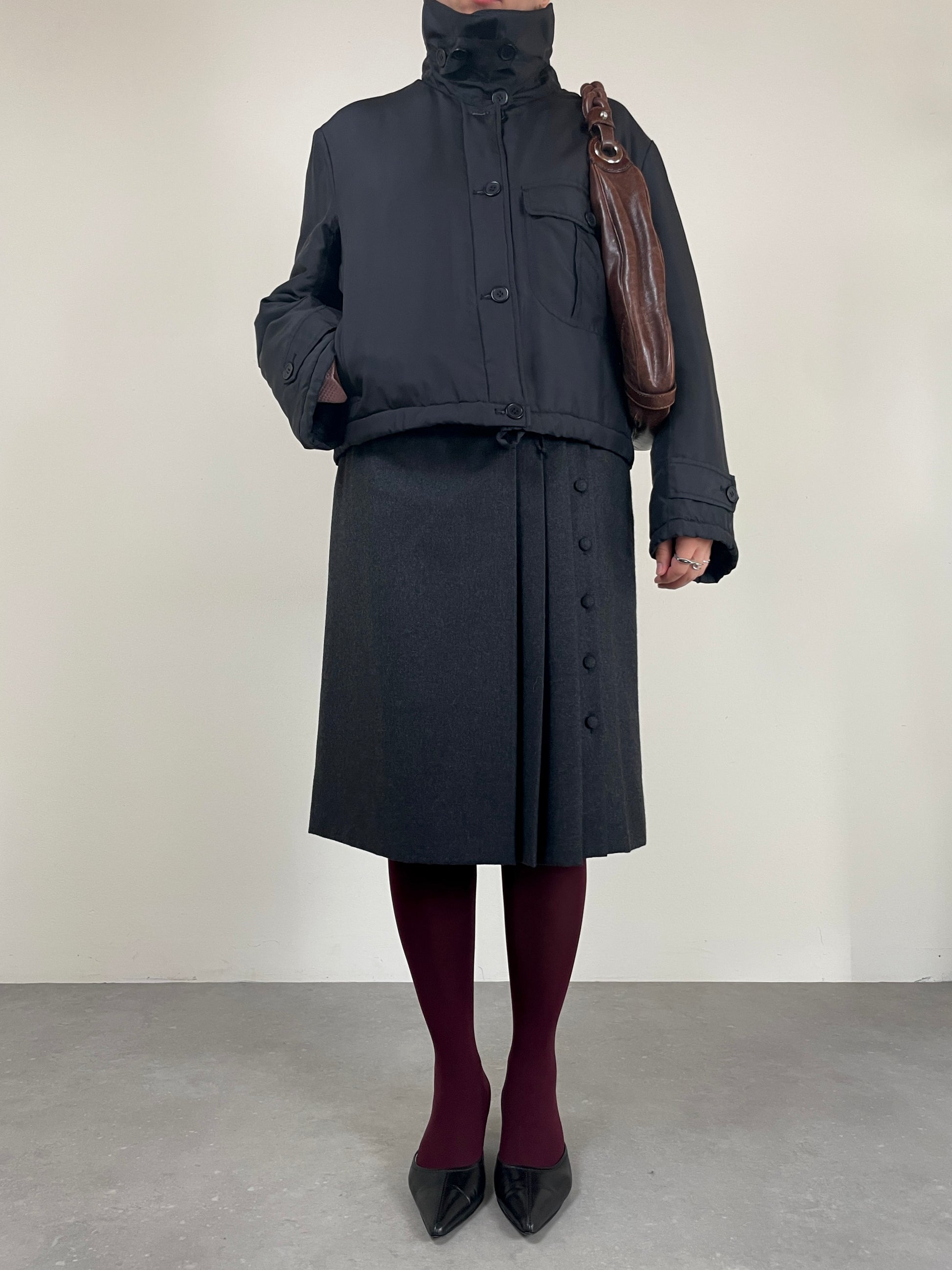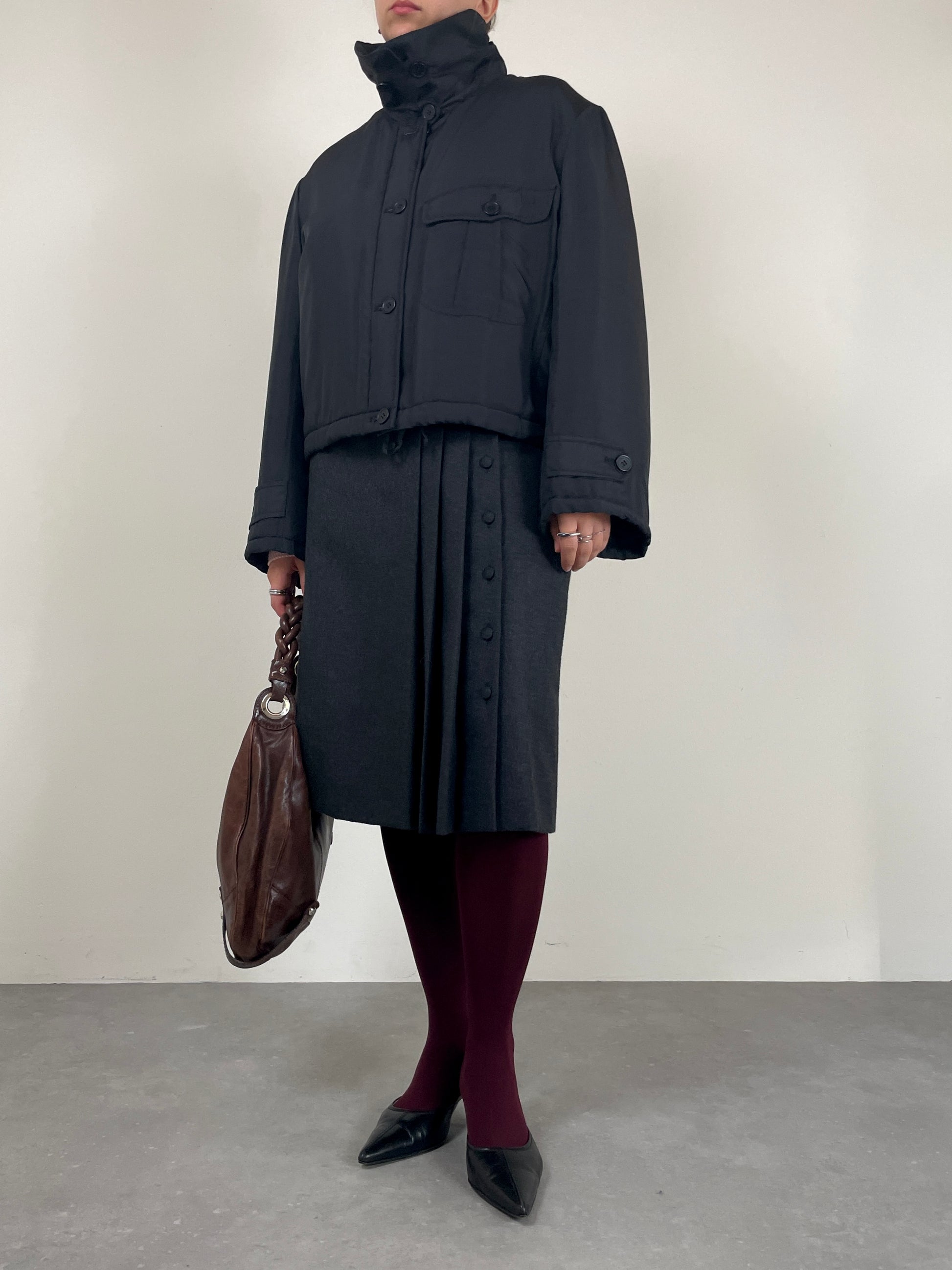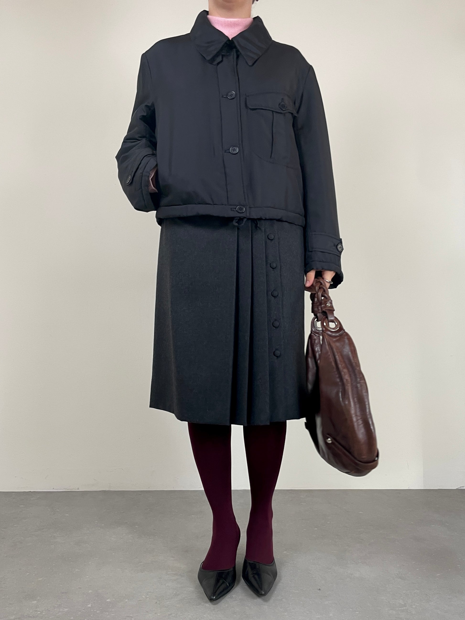 Piumino corto in pura seta nera, vintage Made in Italy, leggermente imbottito, dal design minimale e costruzione sartoriale.