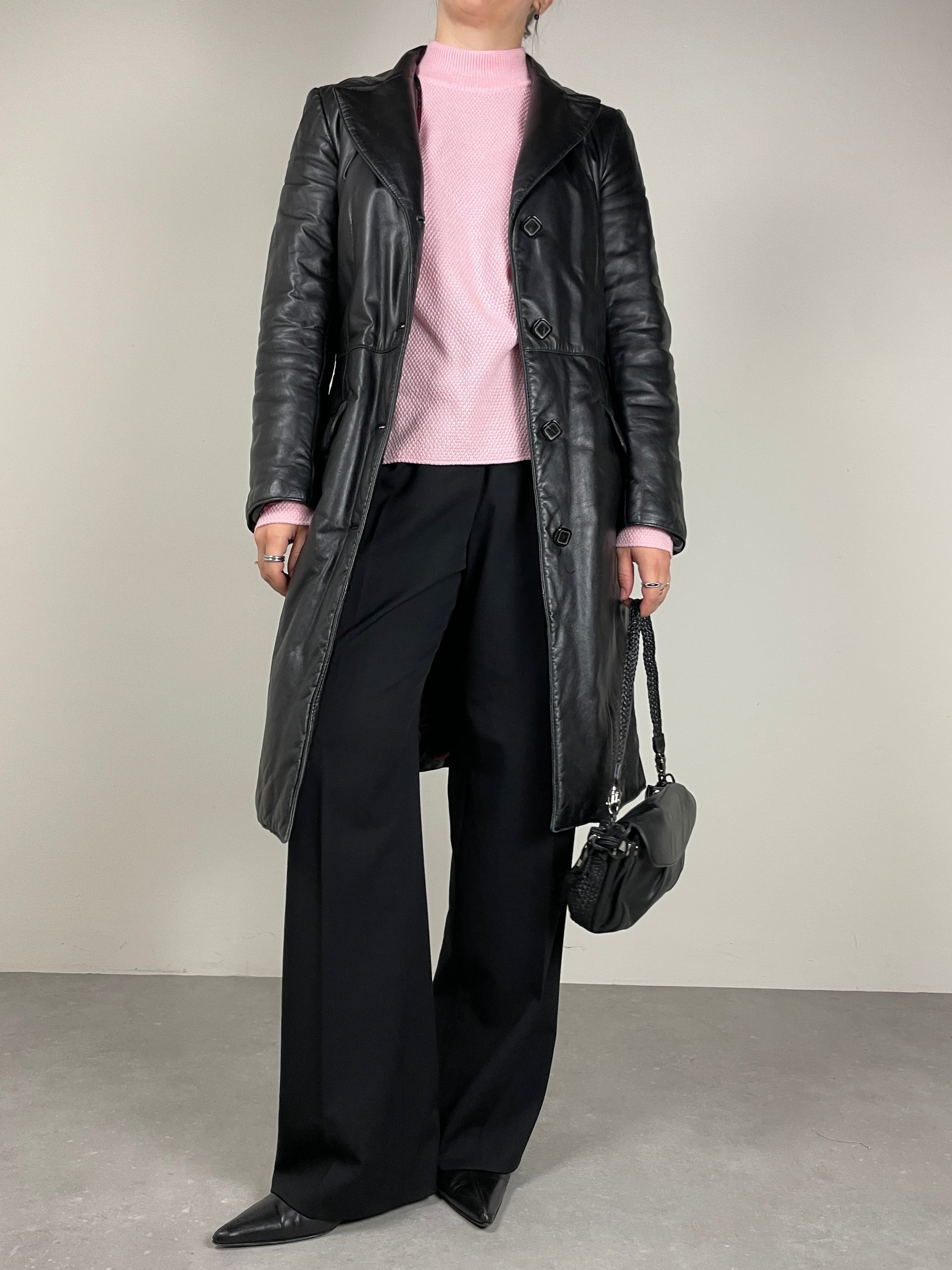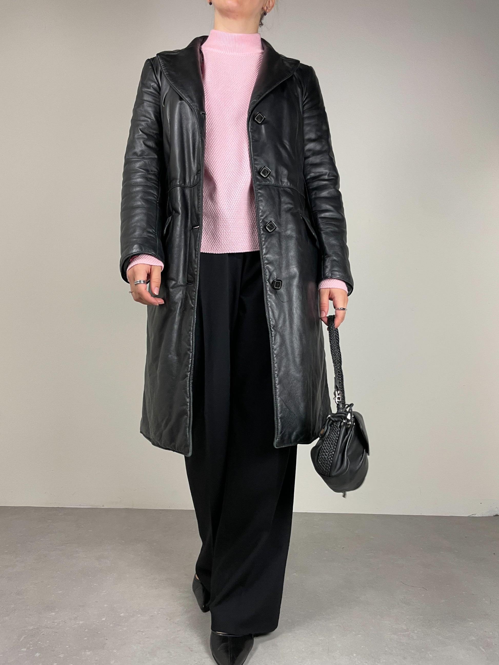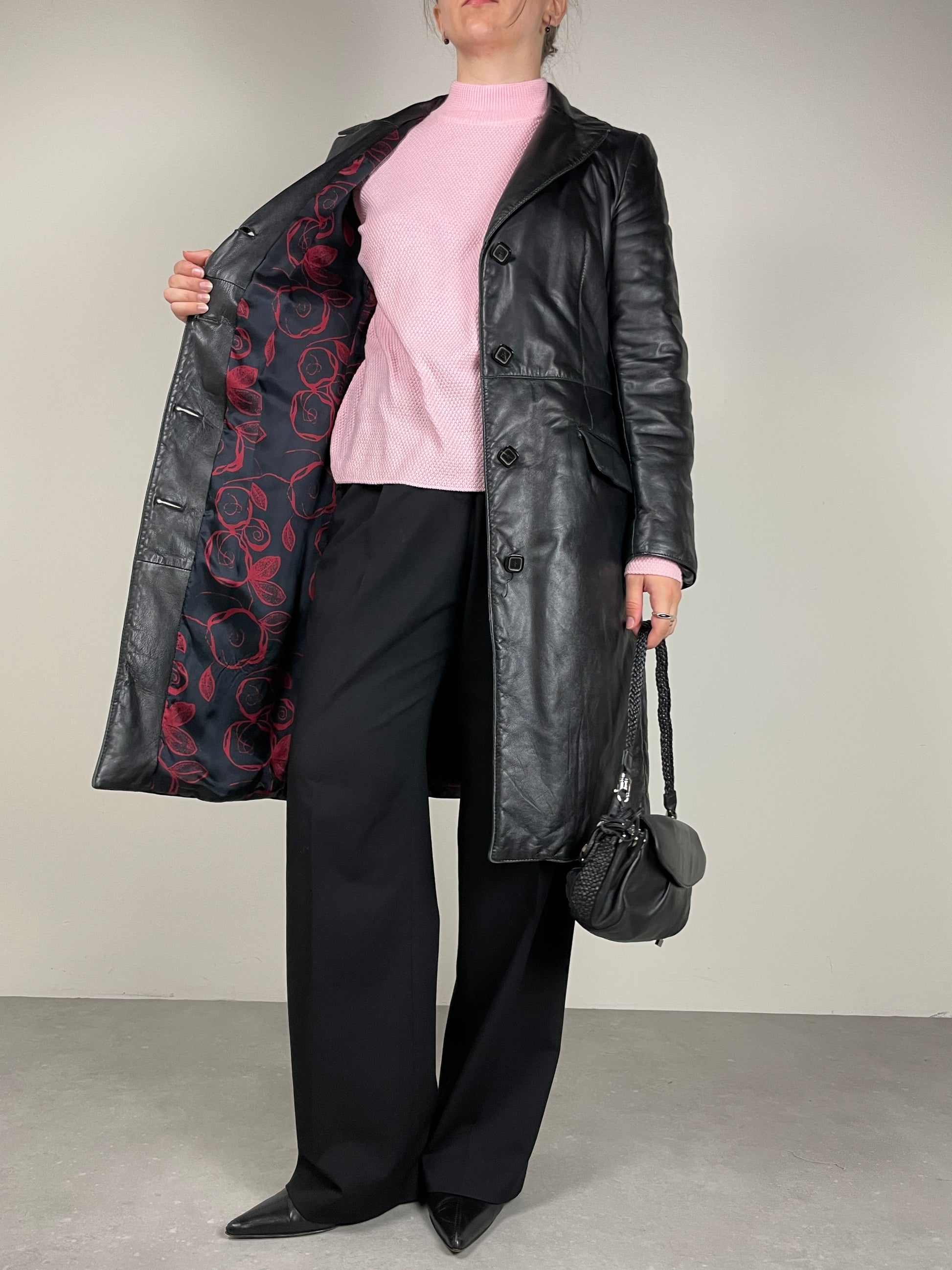 Trench lungo in vera pelle nera, vintage Made in Italy, realizzato in morbidissima pelle di altissima qualità, leggermente imbottito e rifinito con interno stampato a motivi floreali rossi.