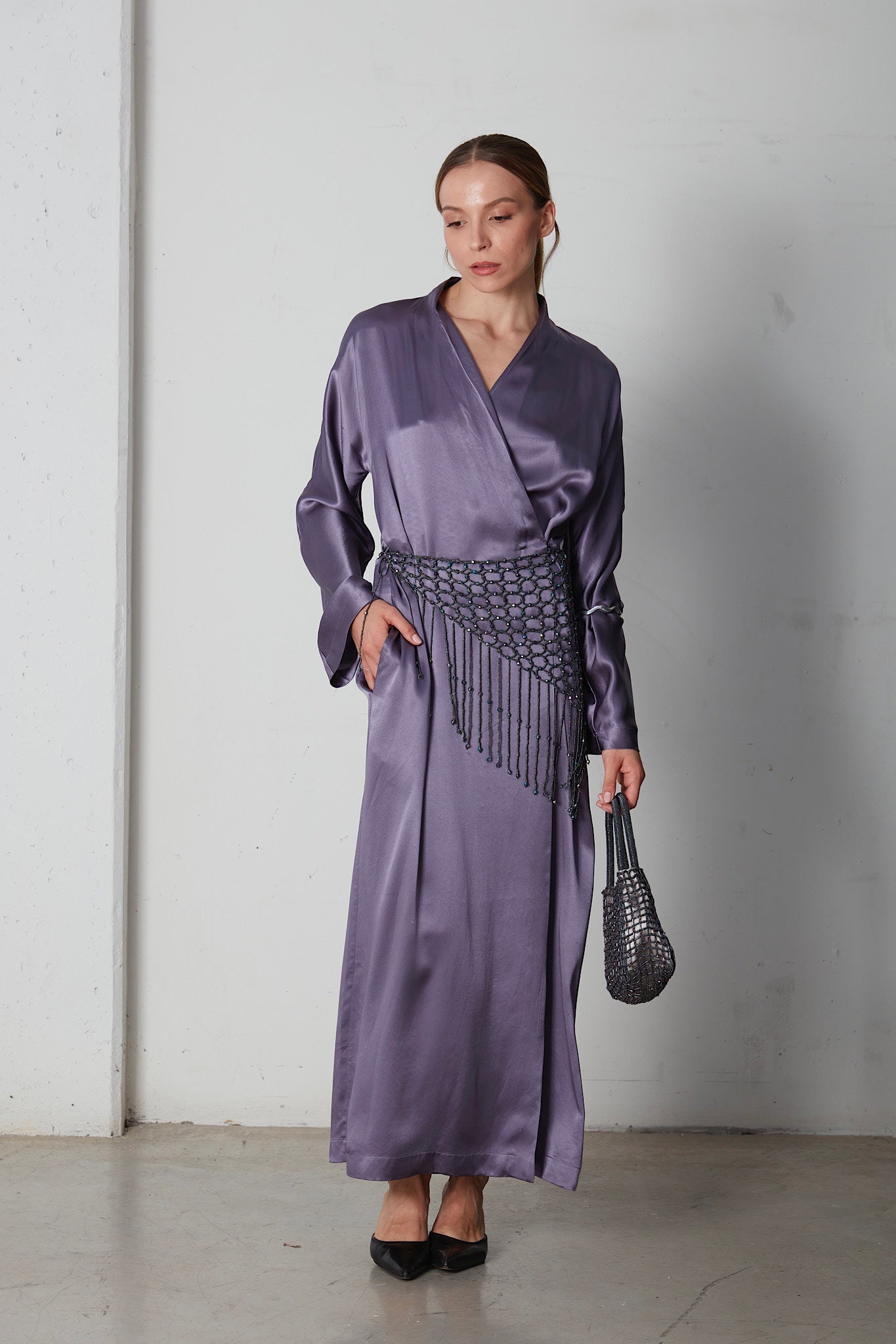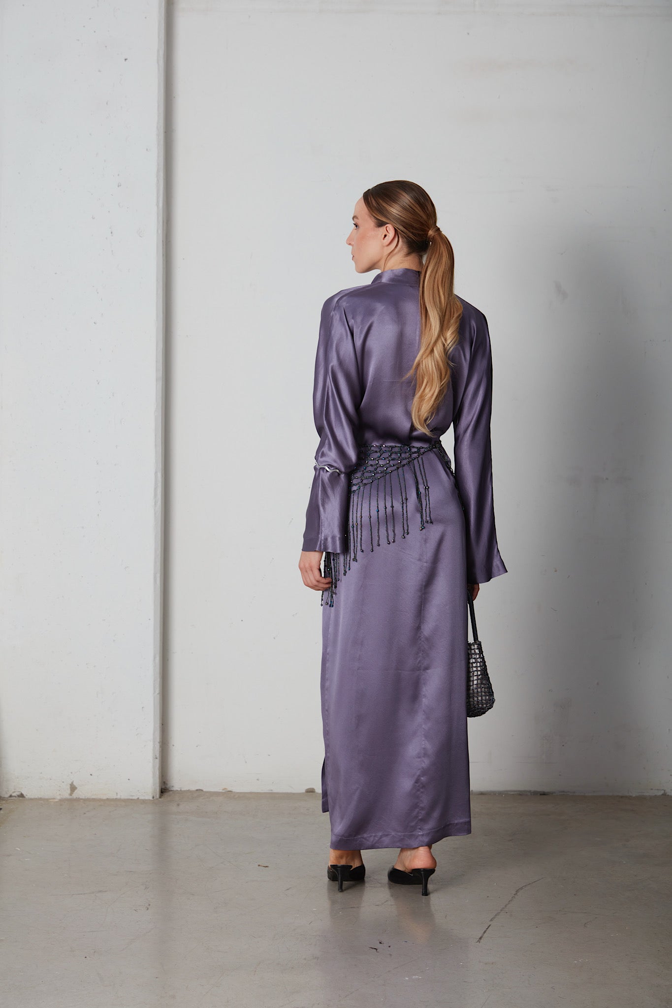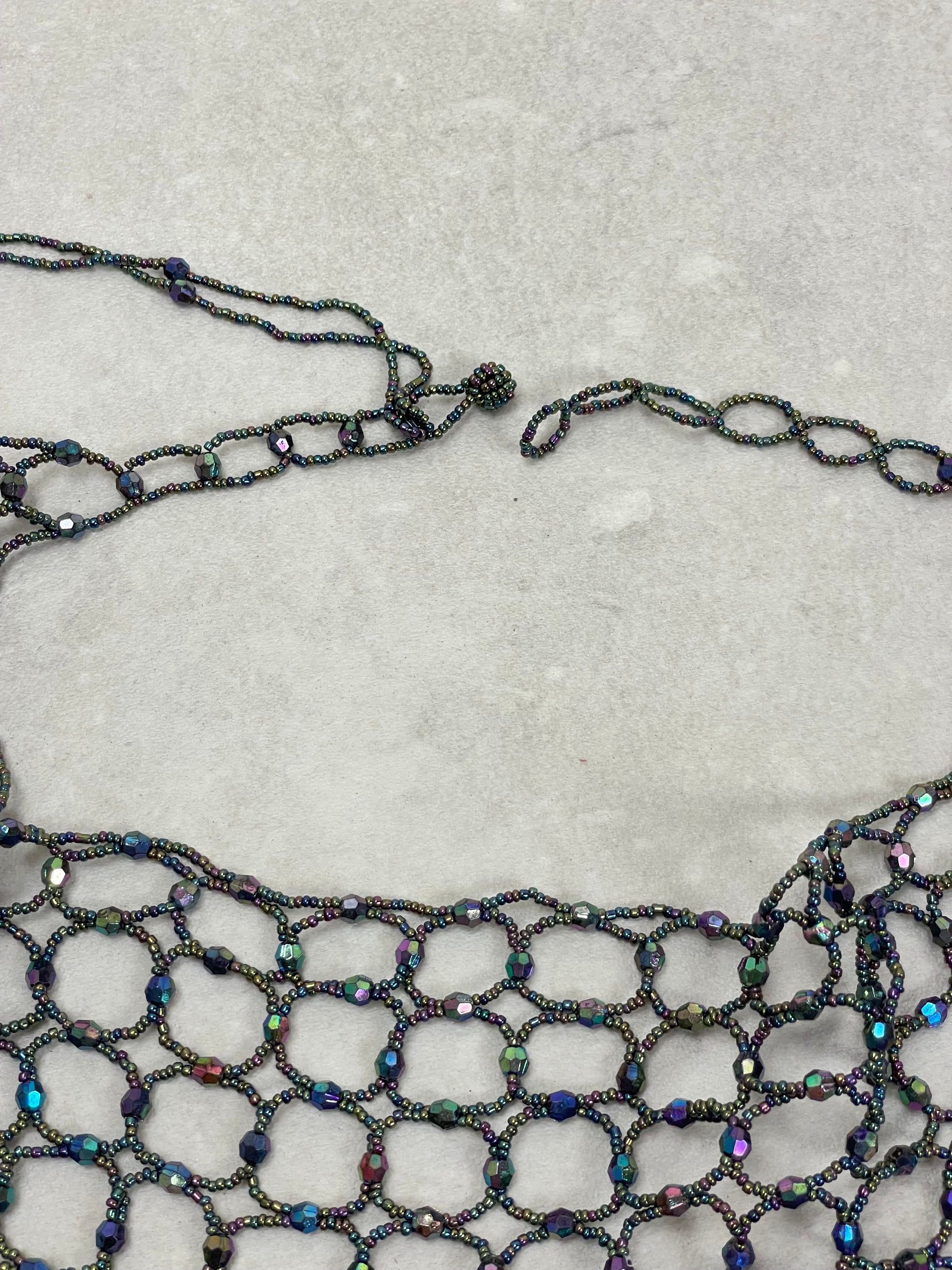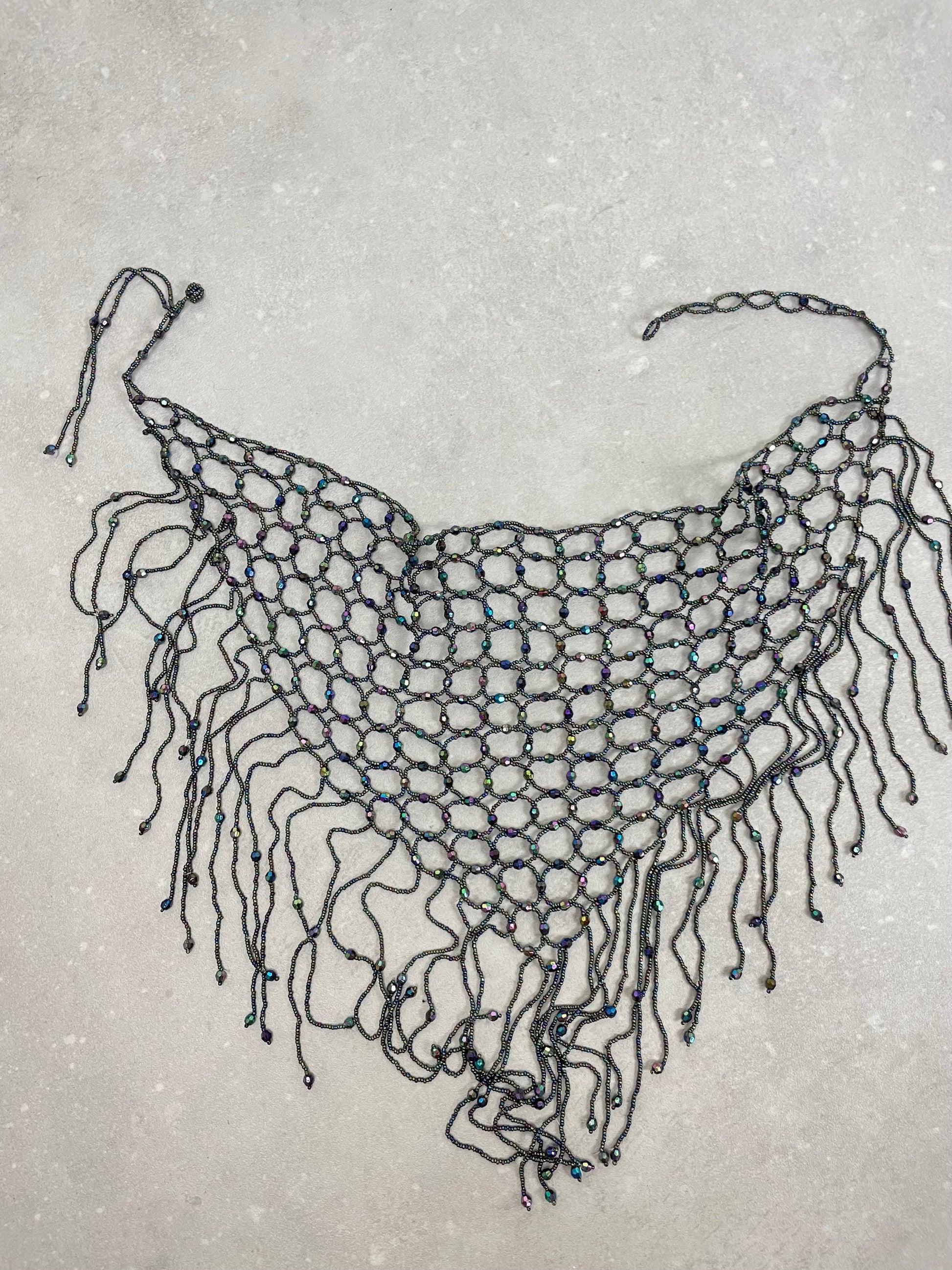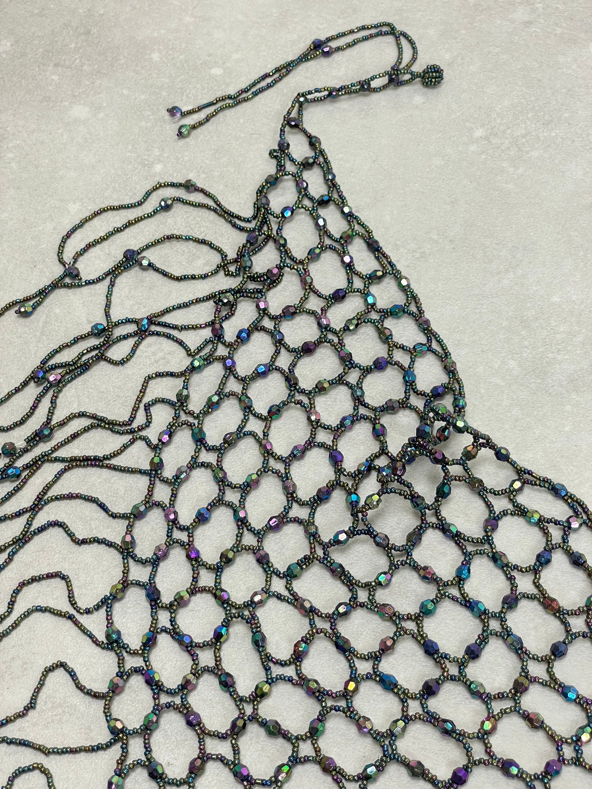 Cintura artigianale in perline cangianti, lavorata interamente a mano con motivo a rete irregolare e lunghe frange pendenti.