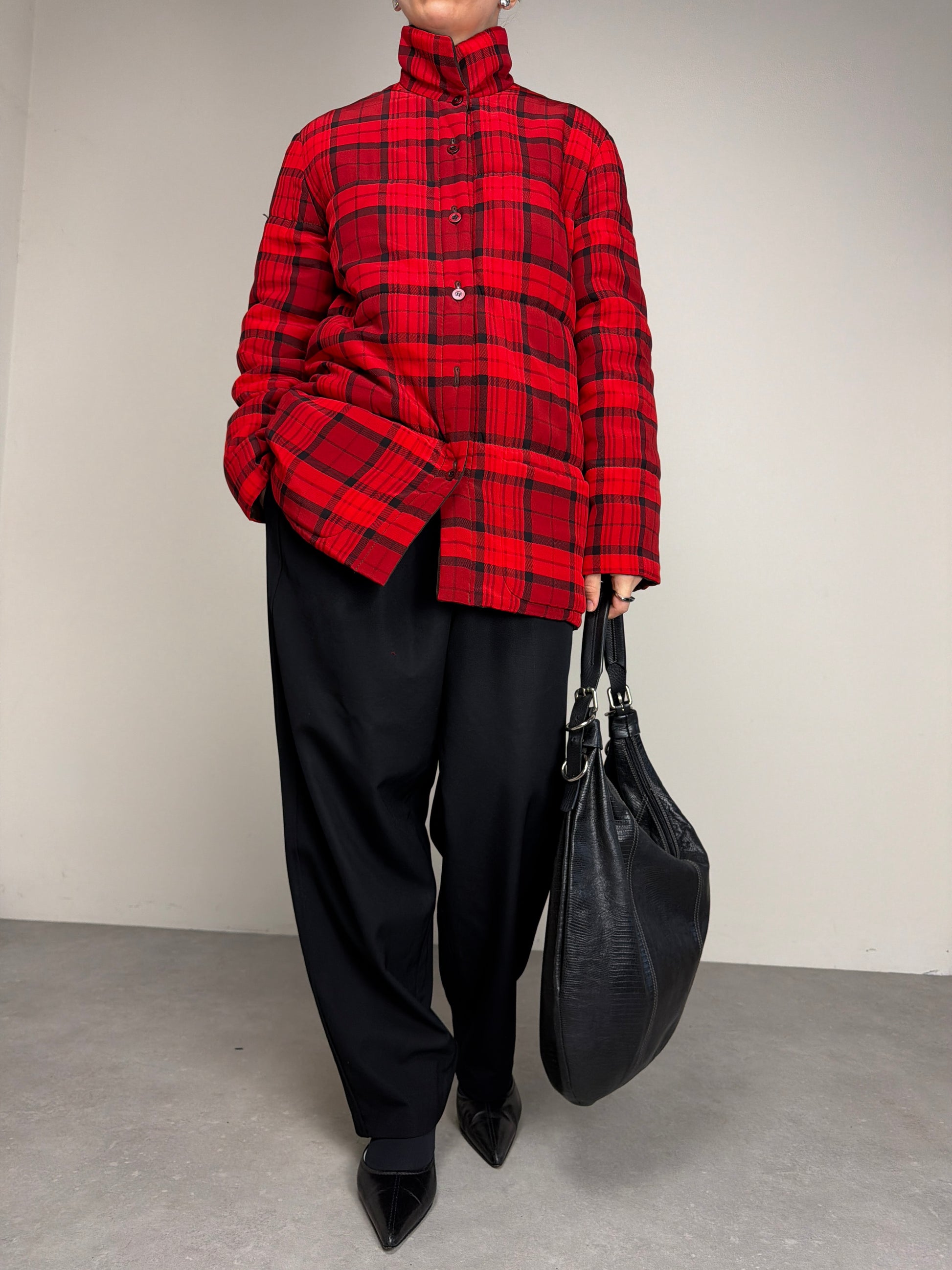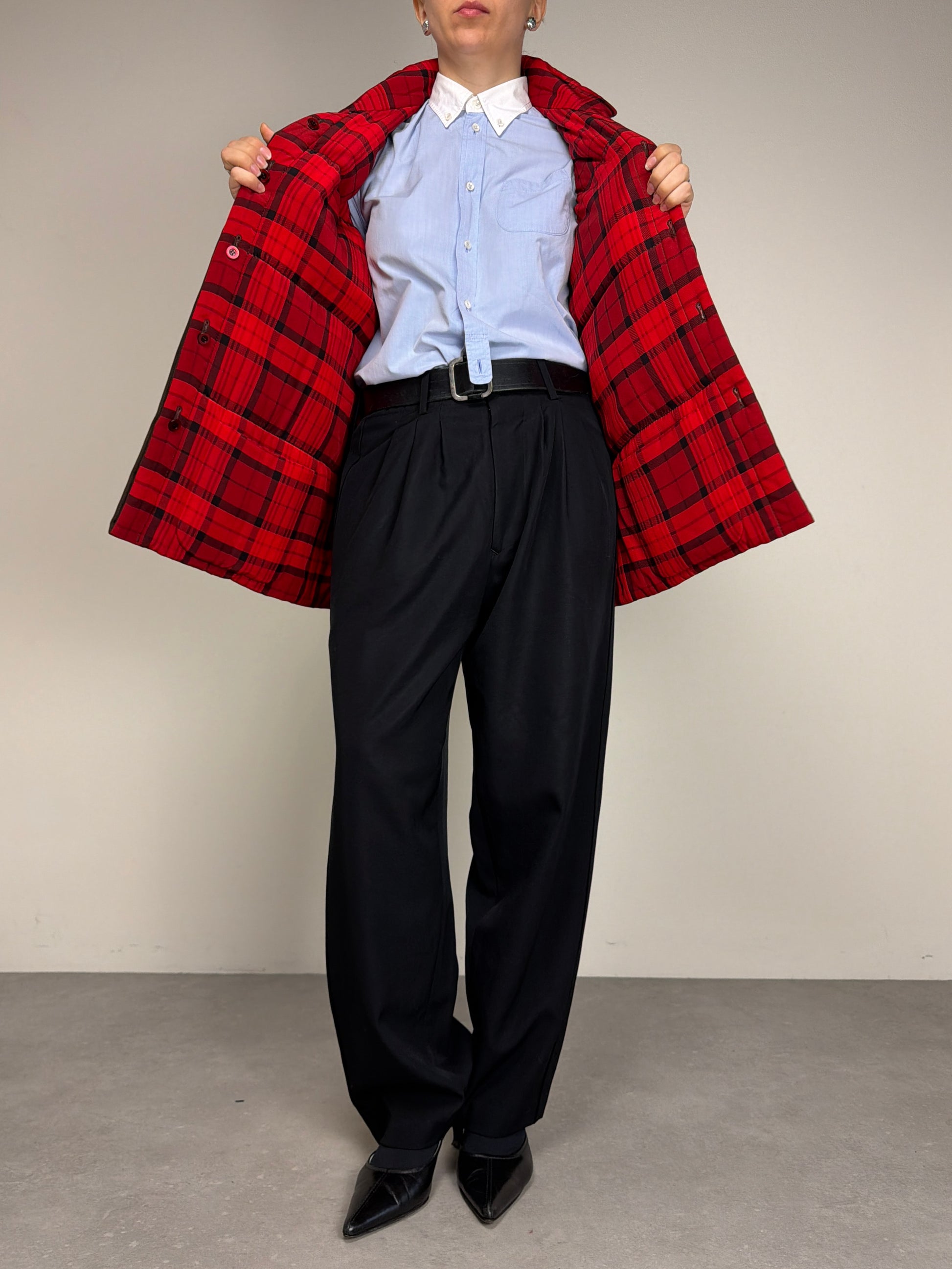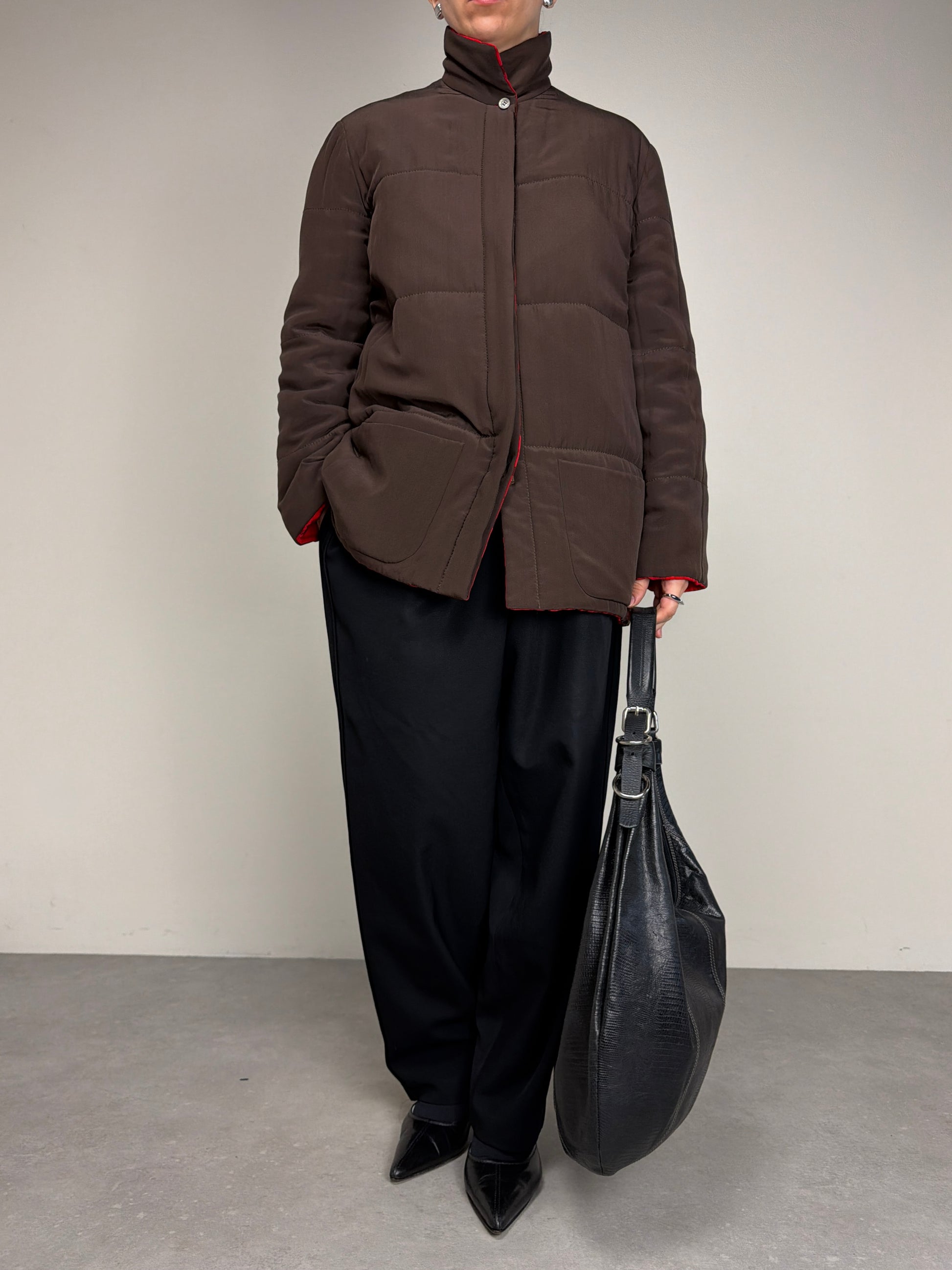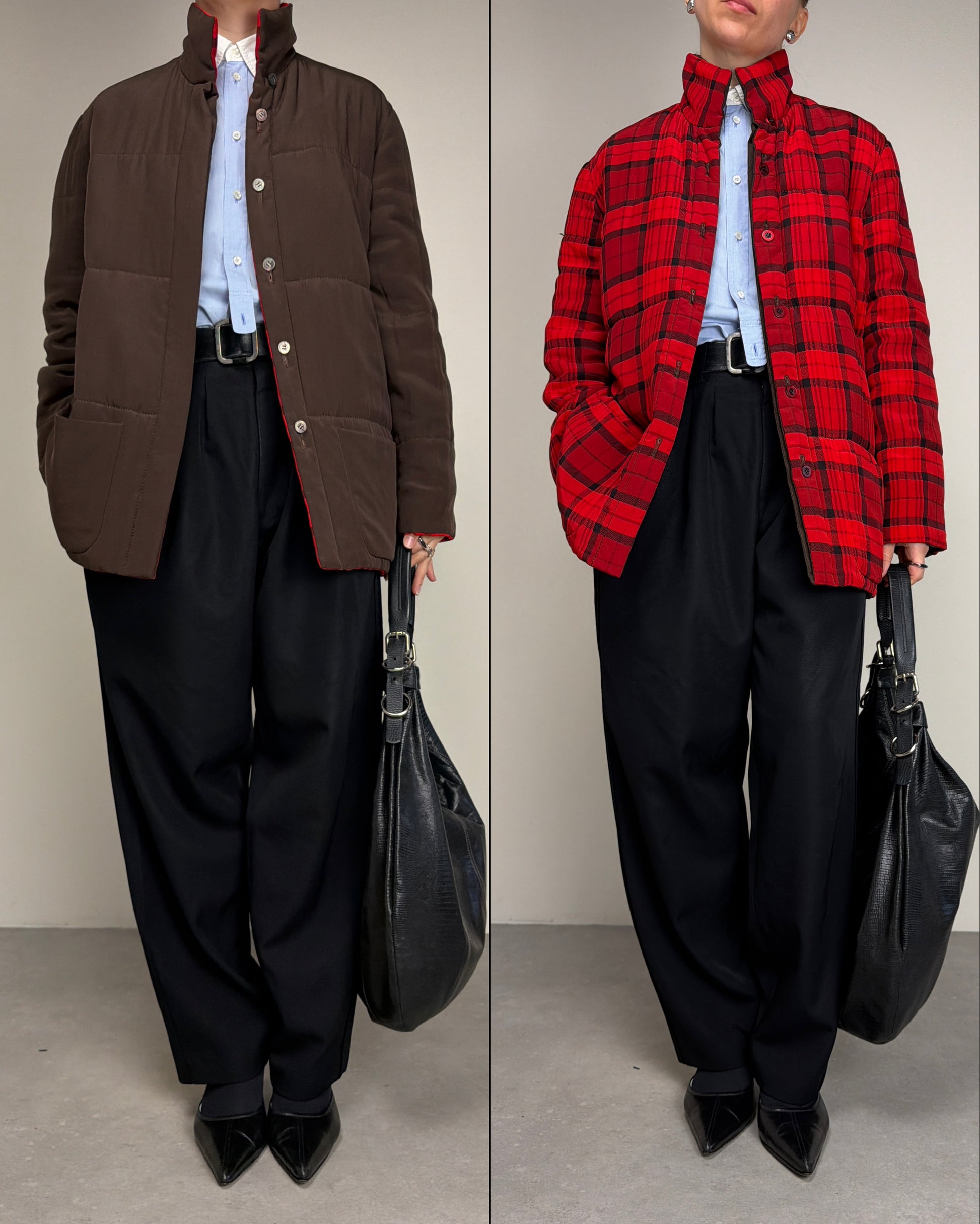 Giacca vintage made in Italy in 100% seta, double face, da un lato marrone e dall’altro tartan rosso e nero, leggermente imbottita perfetta per la mezza stagione.