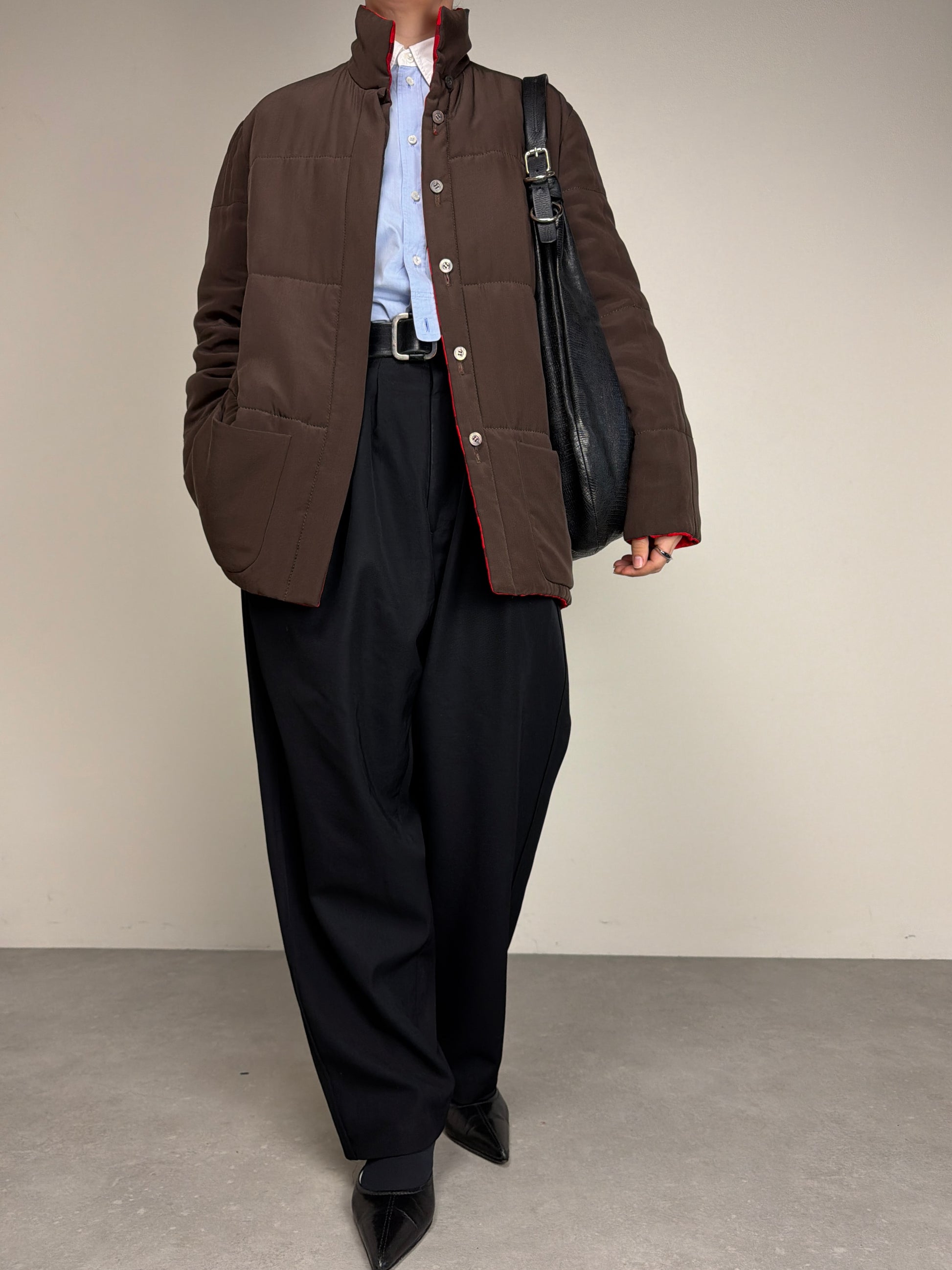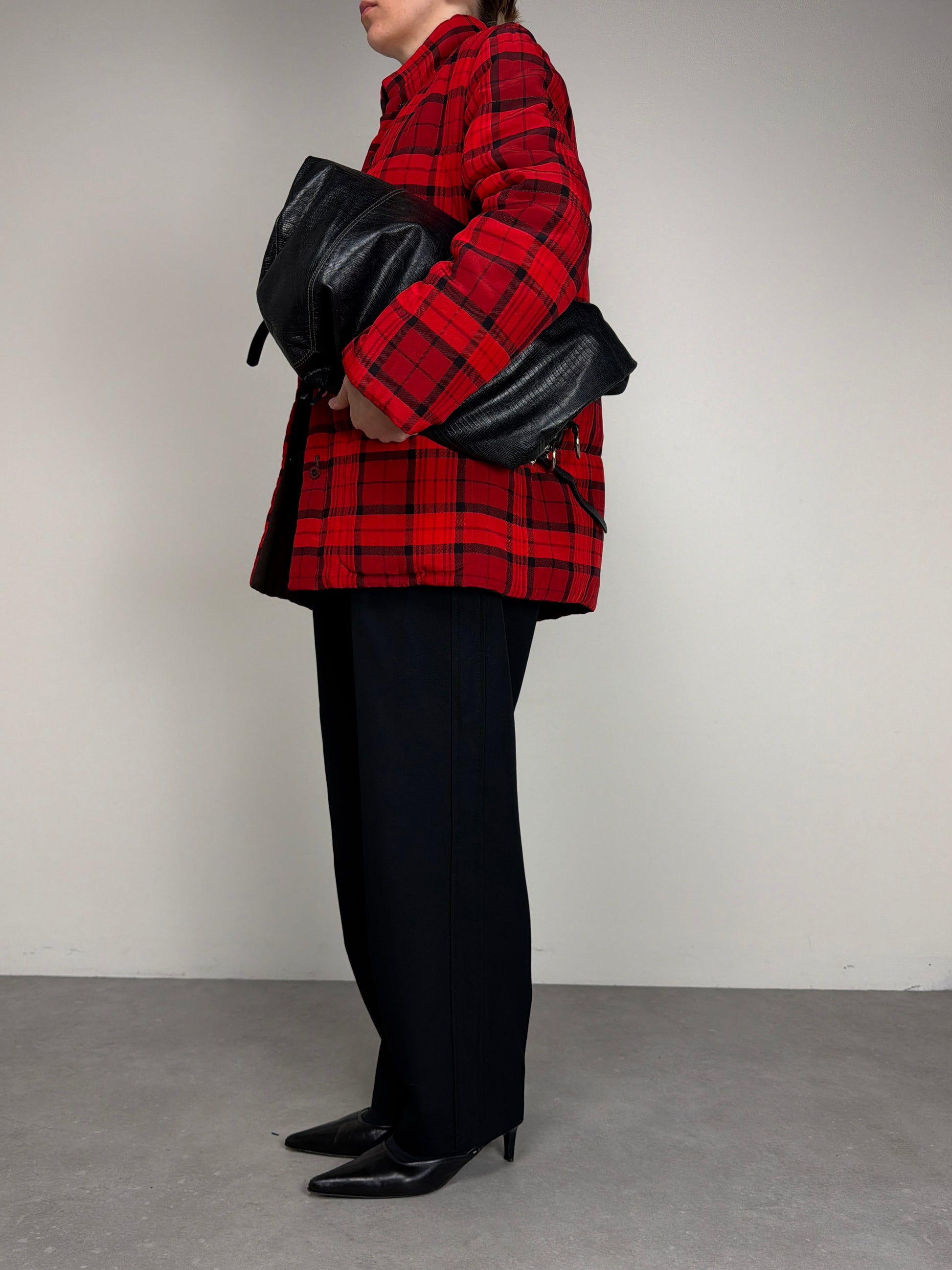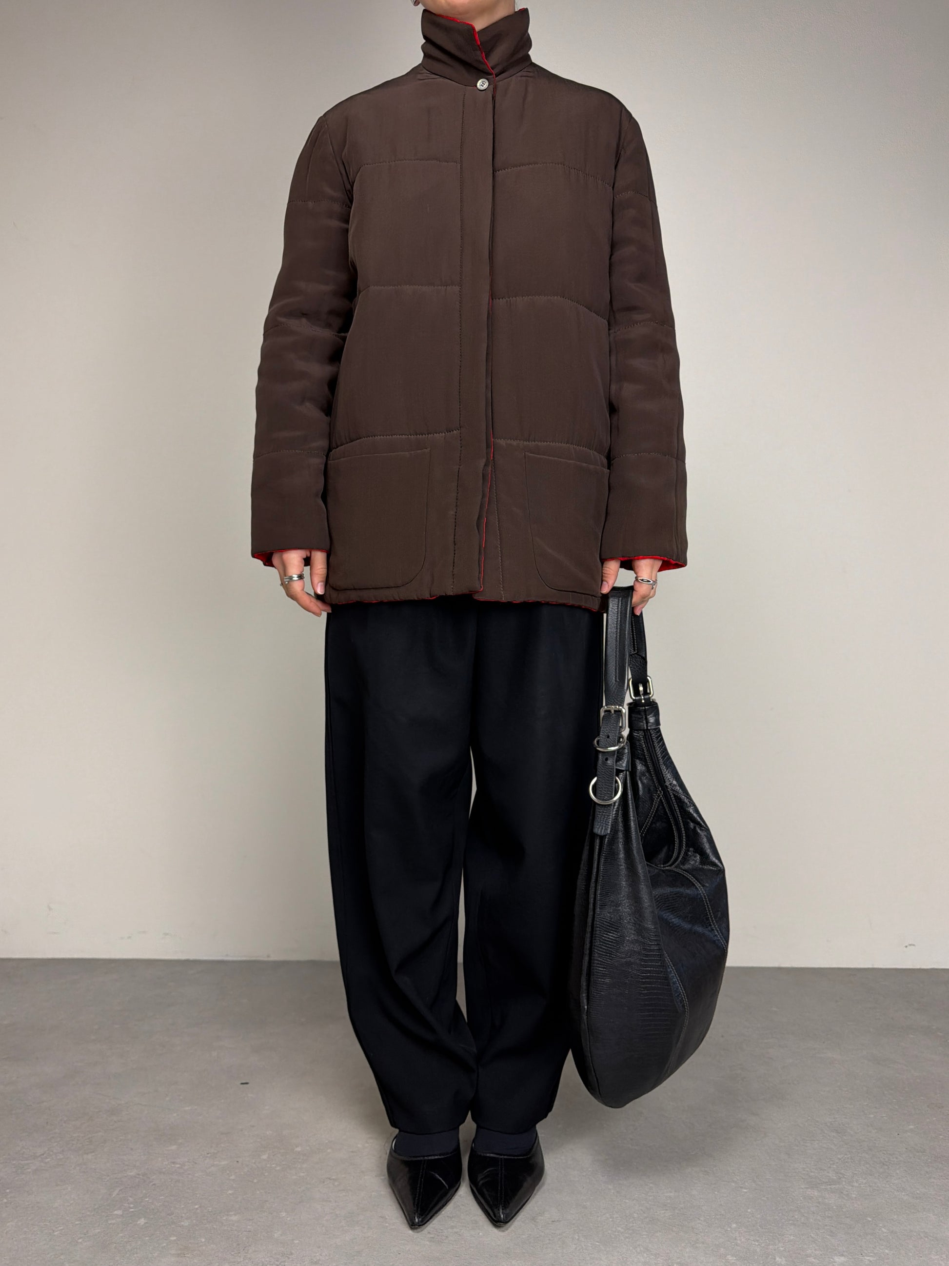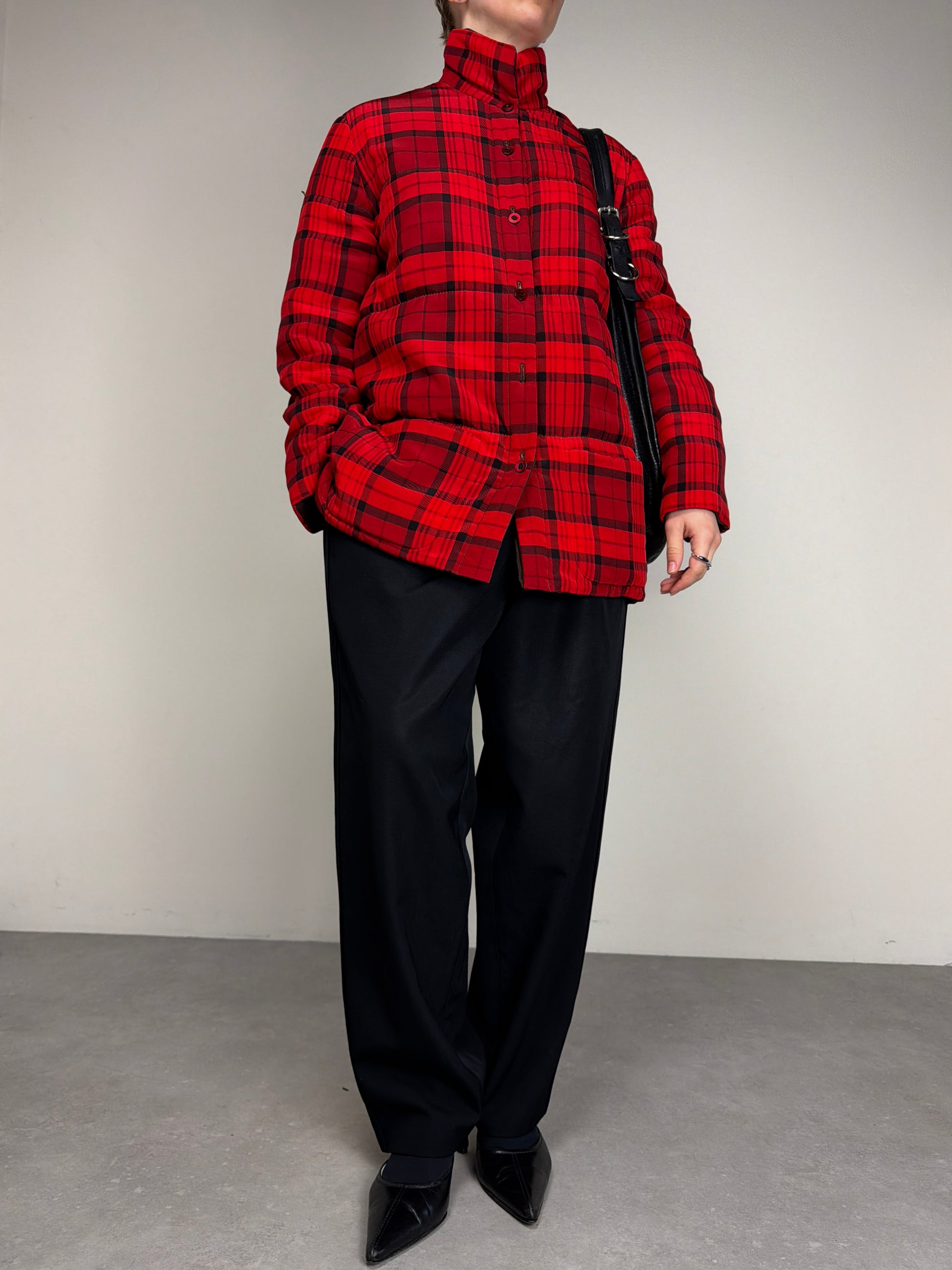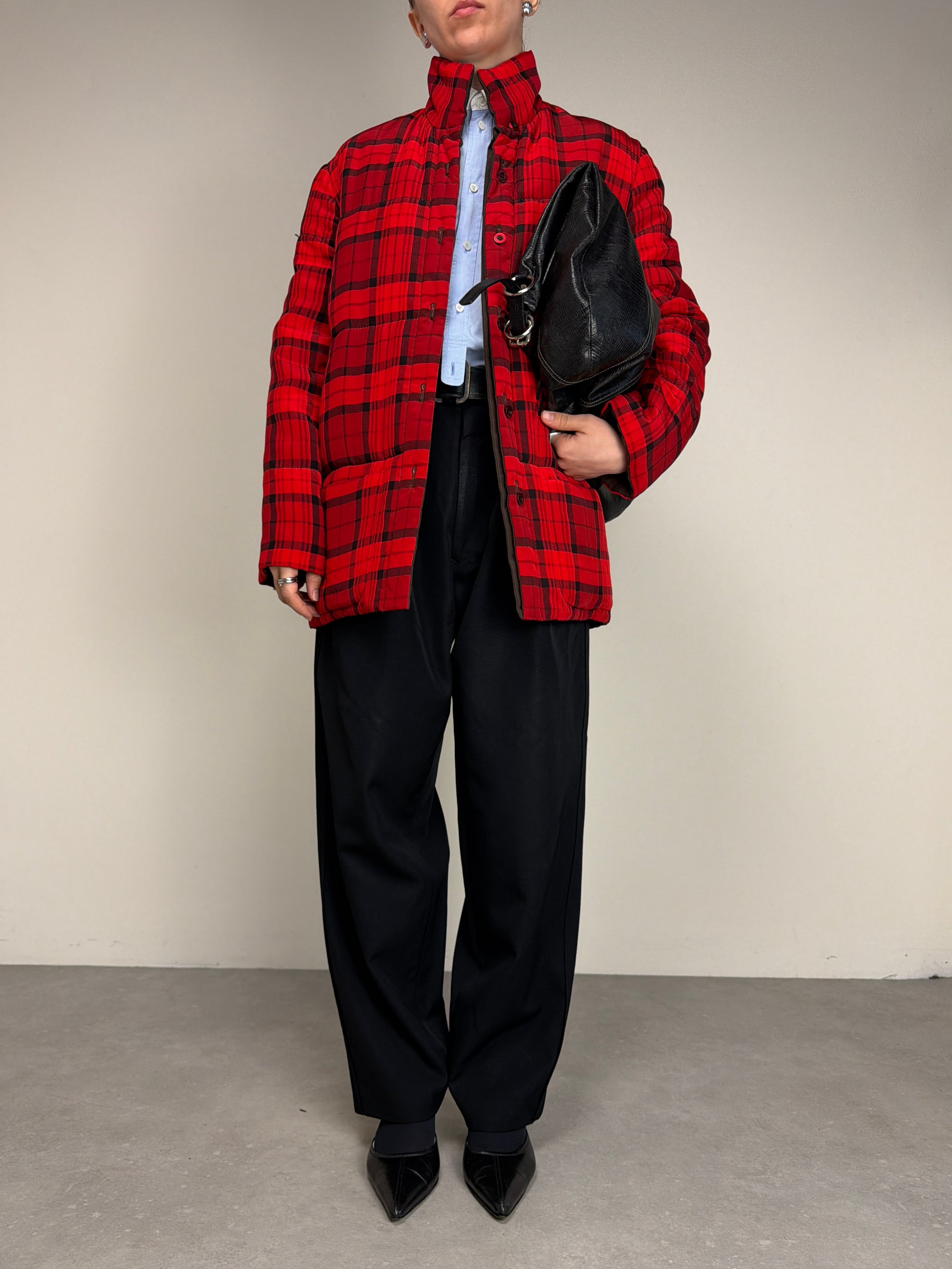 Giacca vintage made in Italy in 100% seta, double face, da un lato marrone e dall’altro tartan rosso e nero, leggermente imbottita perfetta per la mezza stagione.