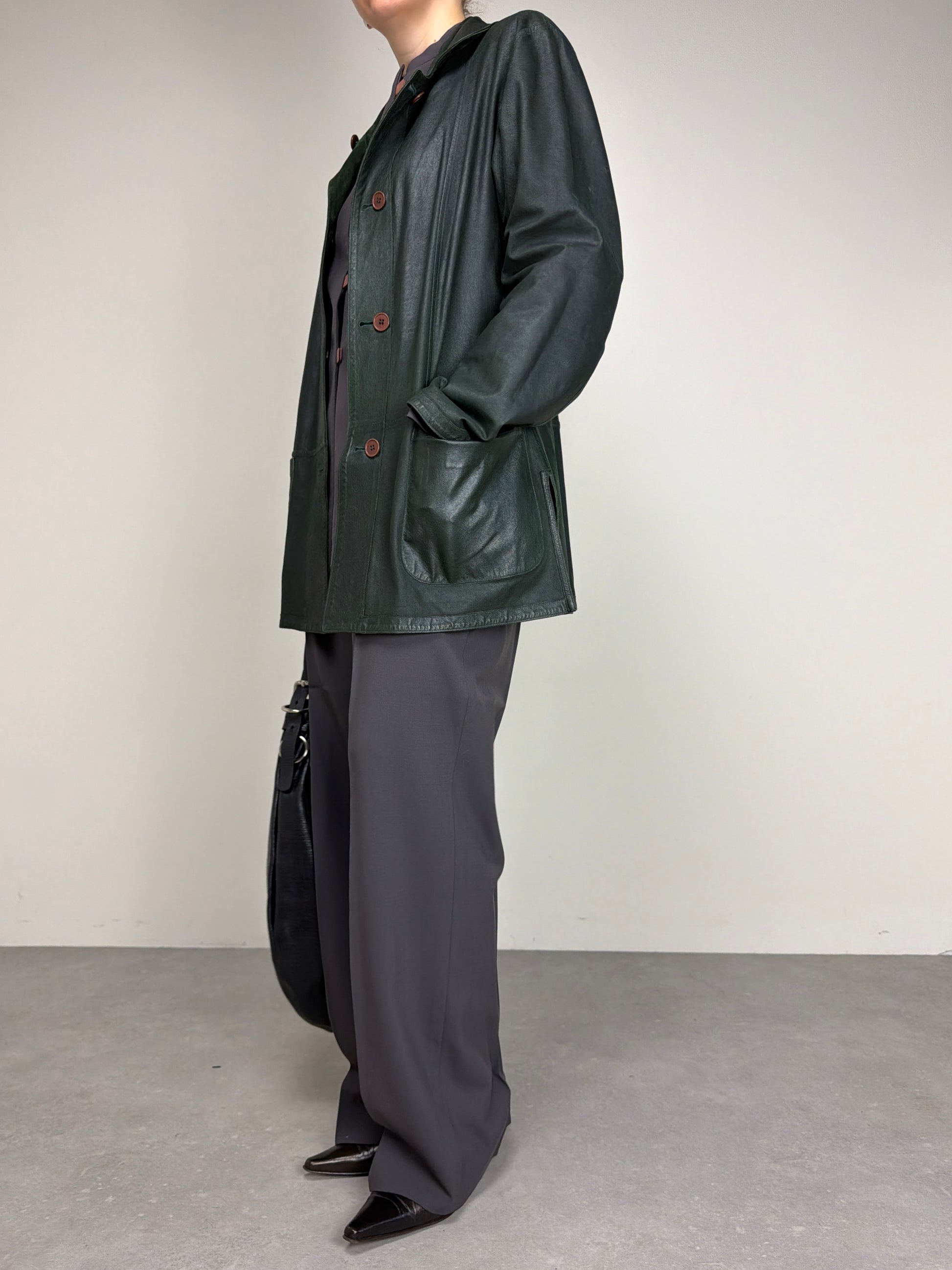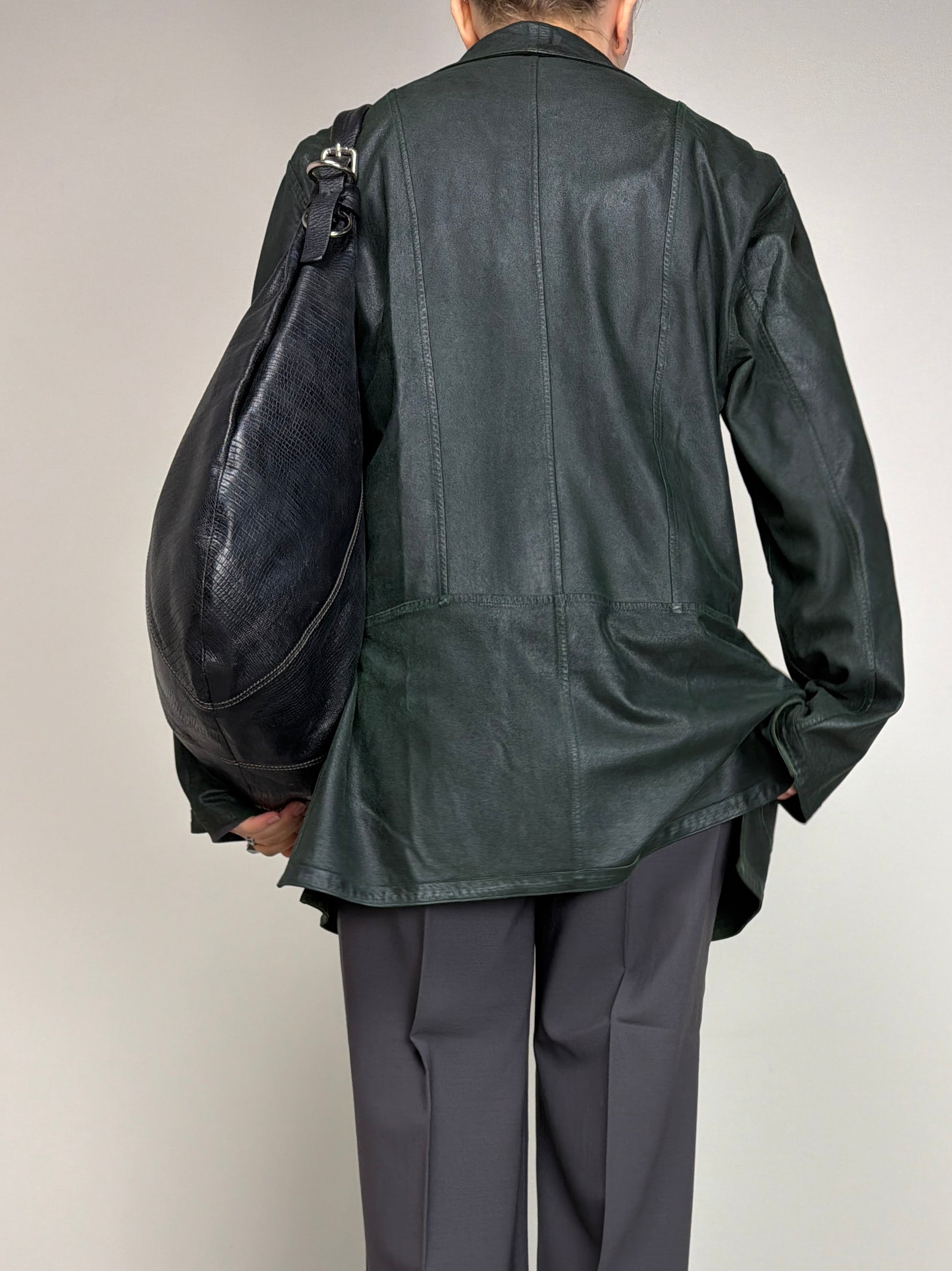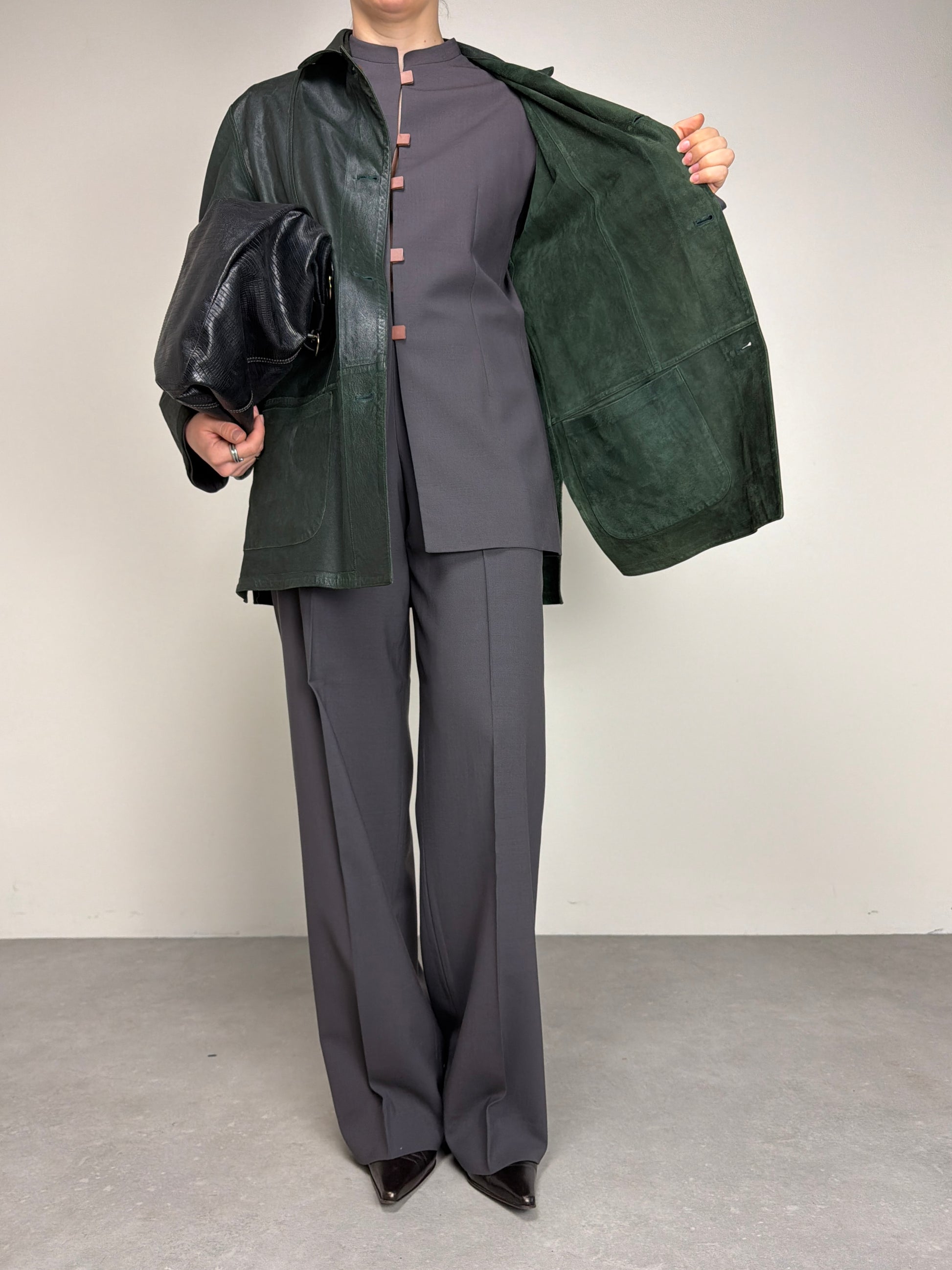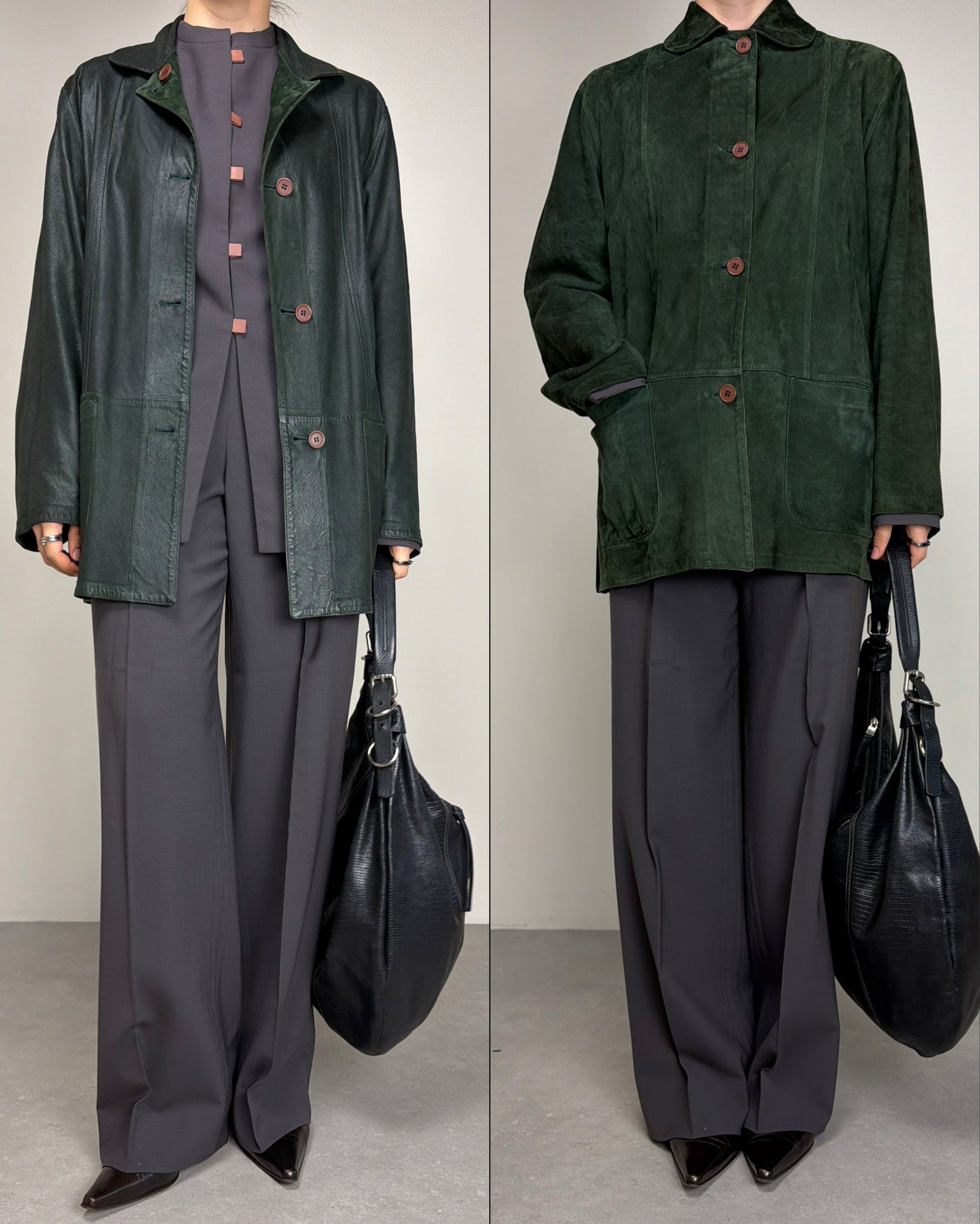 Giacca double-face in vera pelle verde, con un lato in pelle lucida e l’altro in pelle scamosciata.