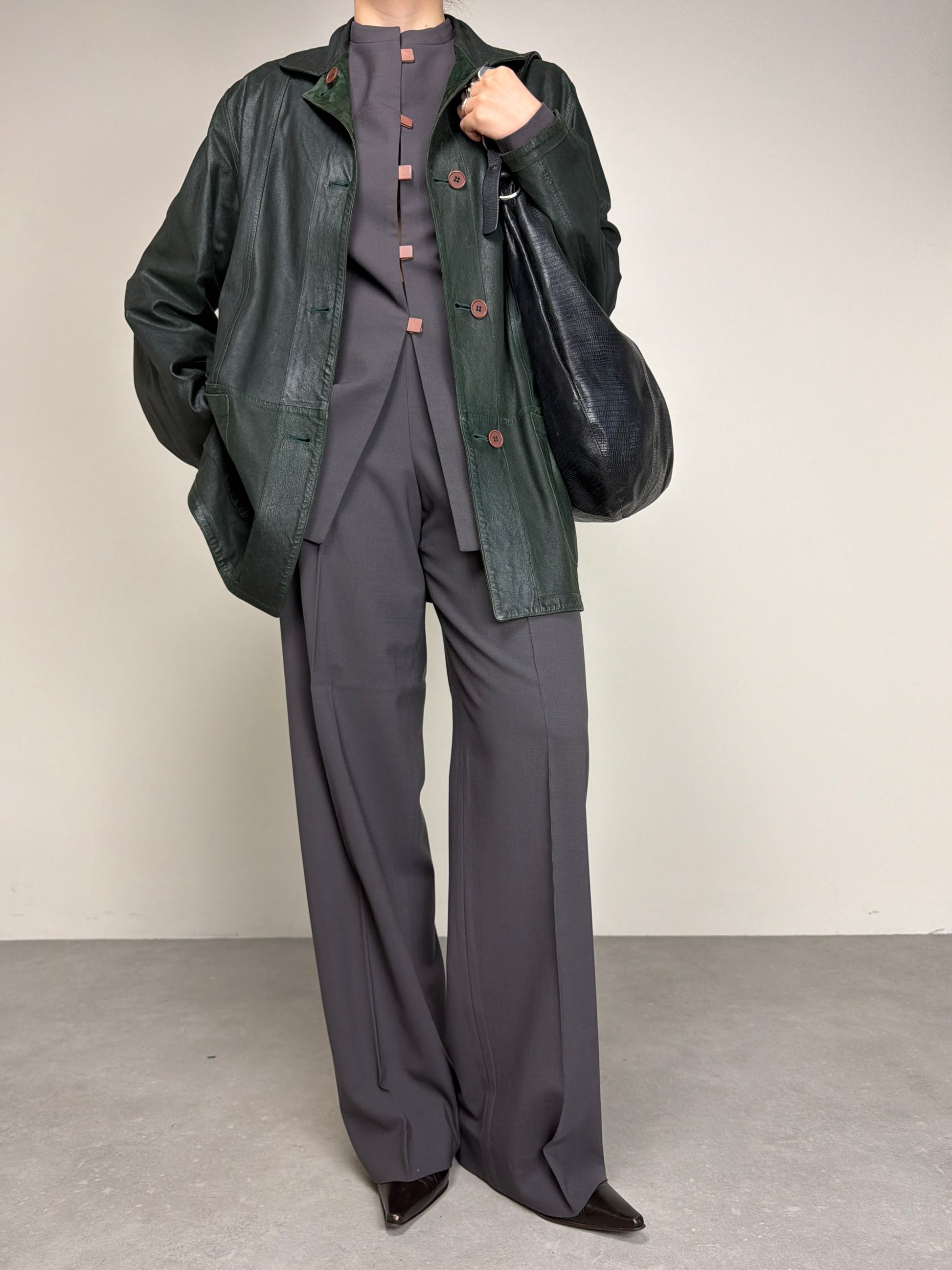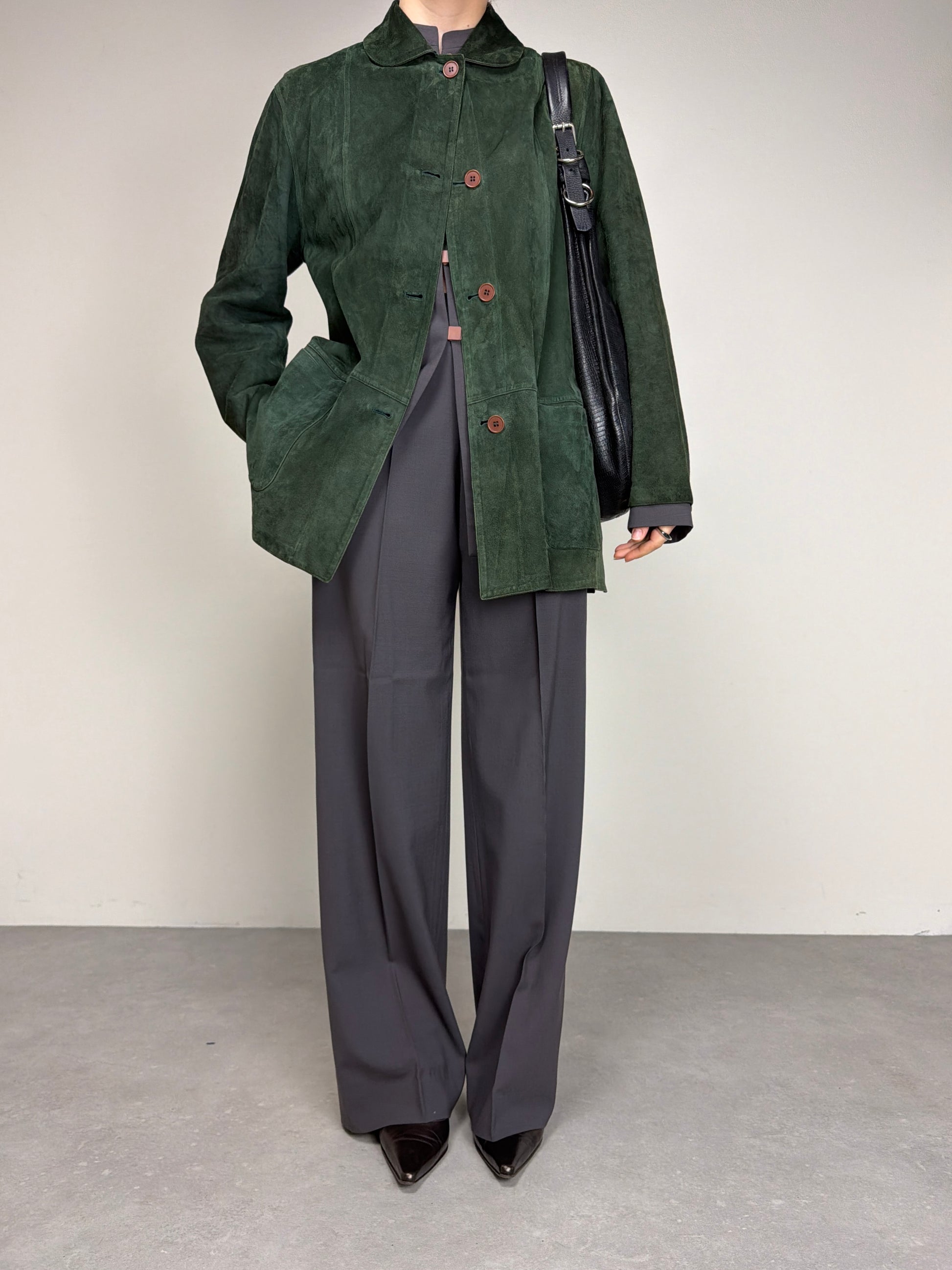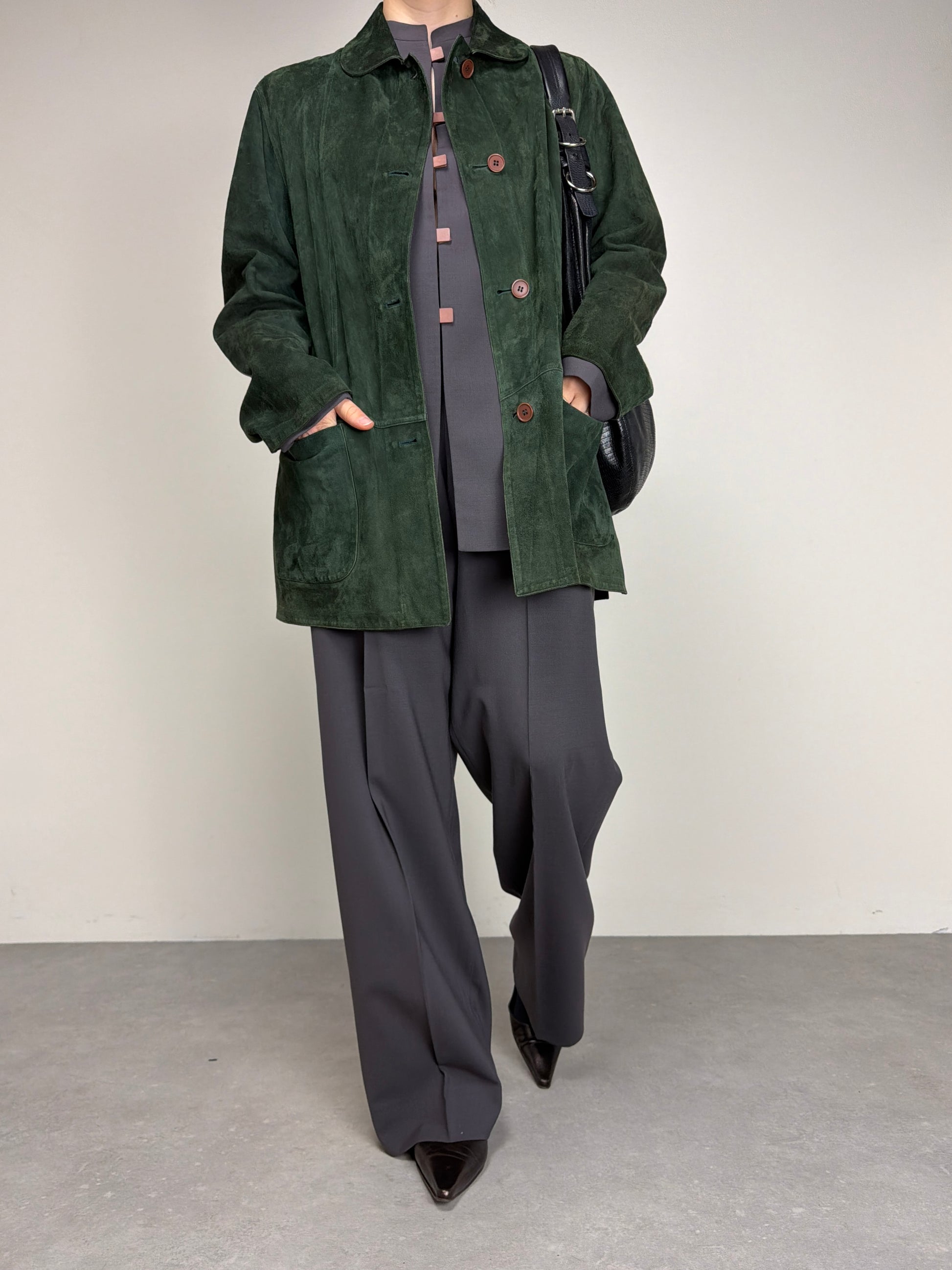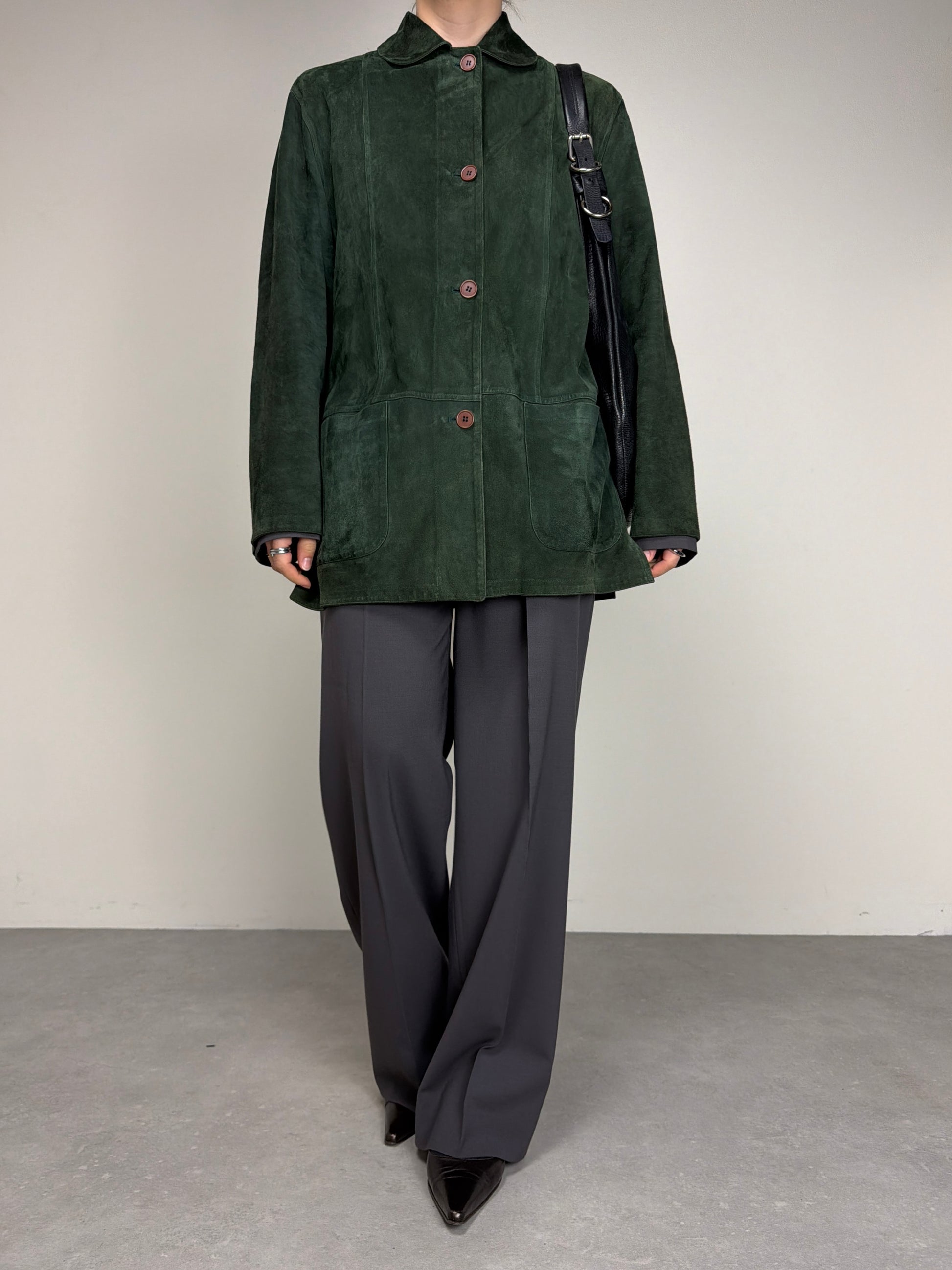 Giacca double-face in vera pelle verde, con un lato in pelle lucida e l’altro in pelle scamosciata.