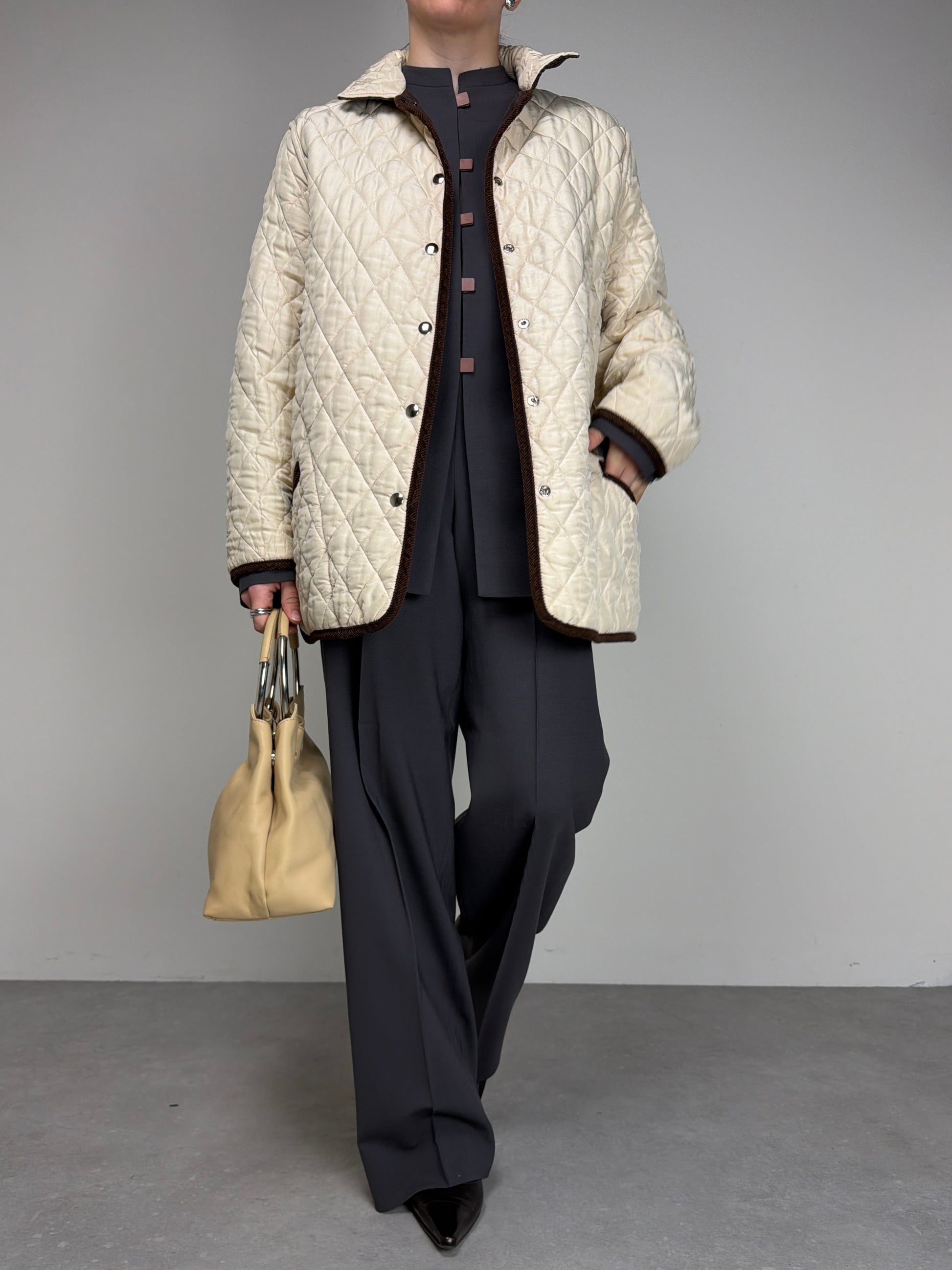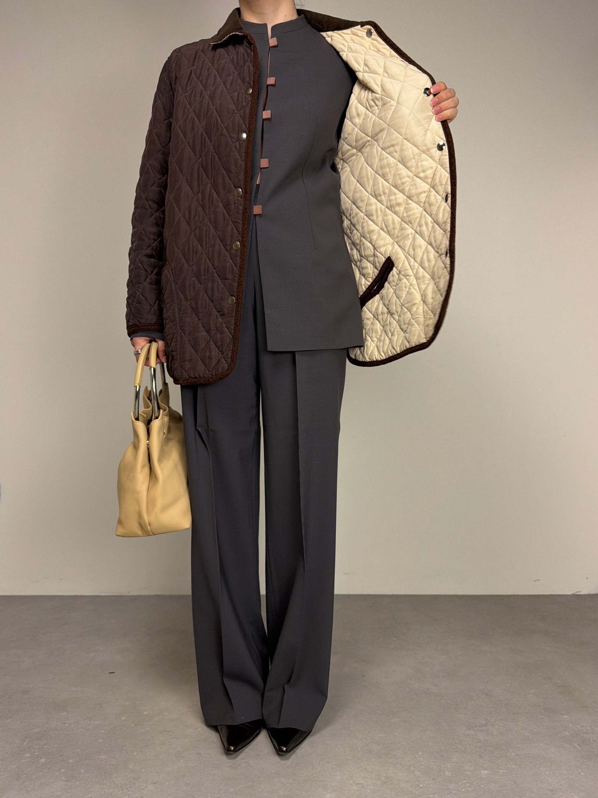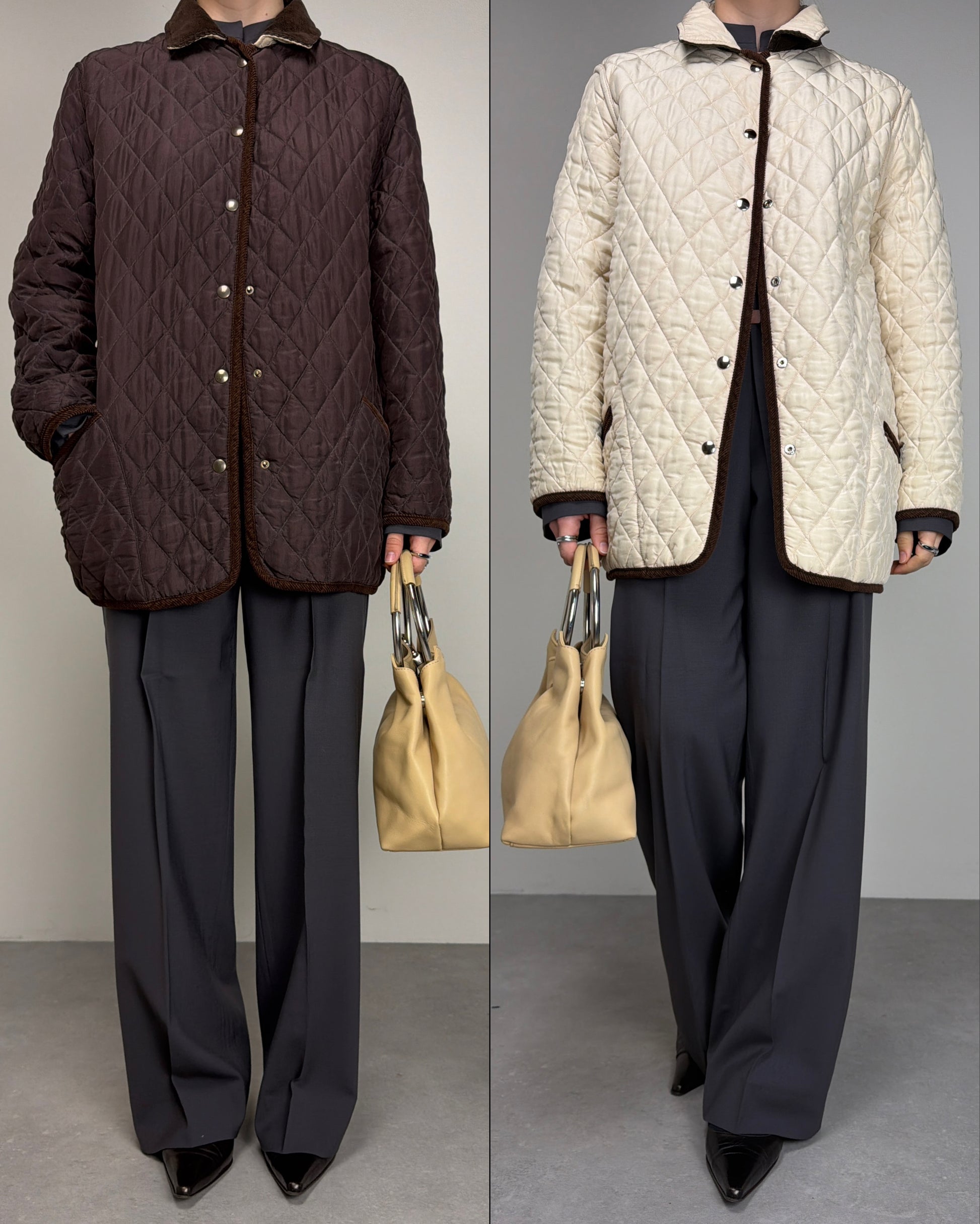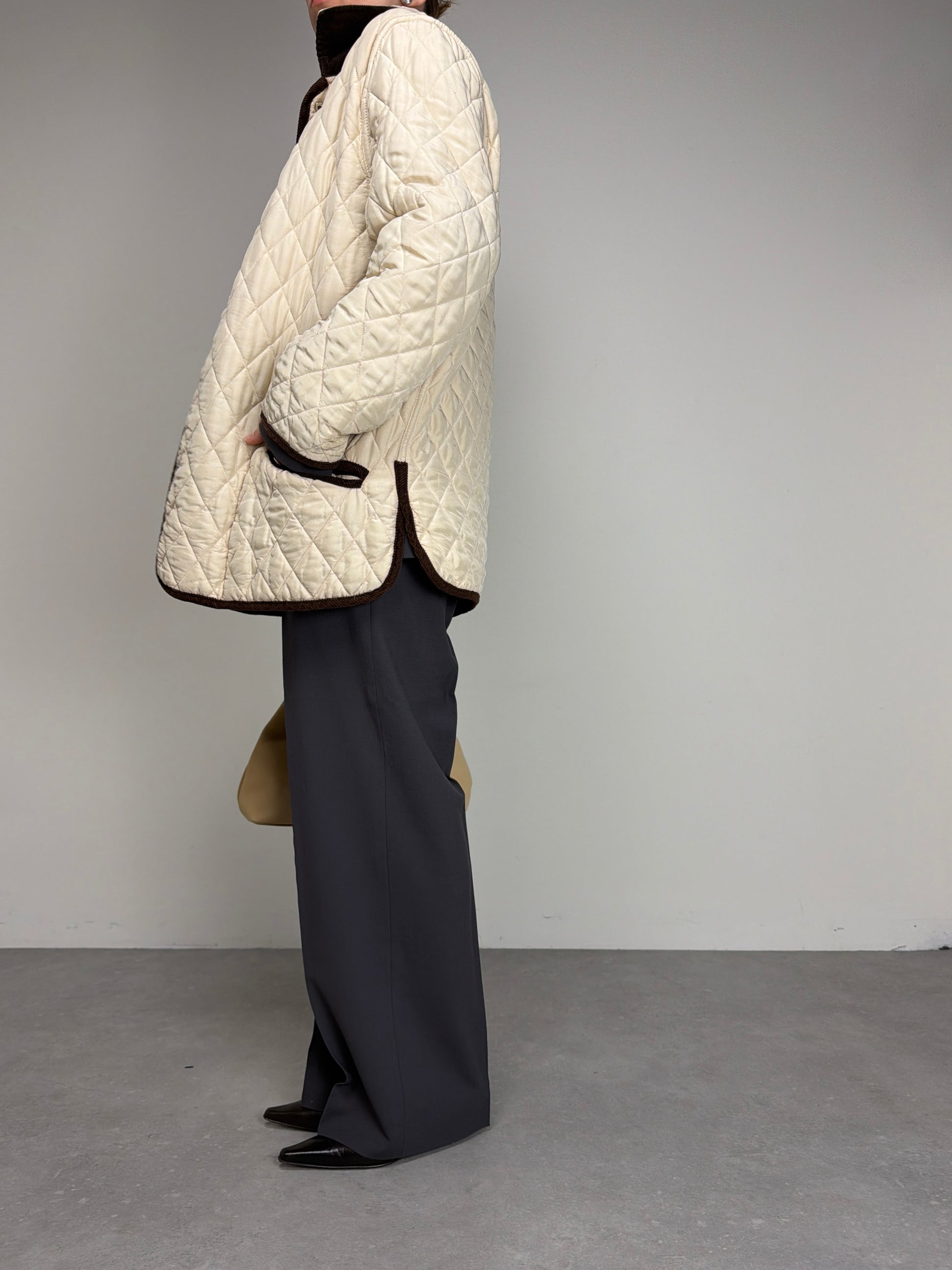 Giacca trapuntata, vintage made in Italy, in 100% seta, double face, da una parte marrone e dall’altra color crema, con rifiniture in velluto a coste marroni.