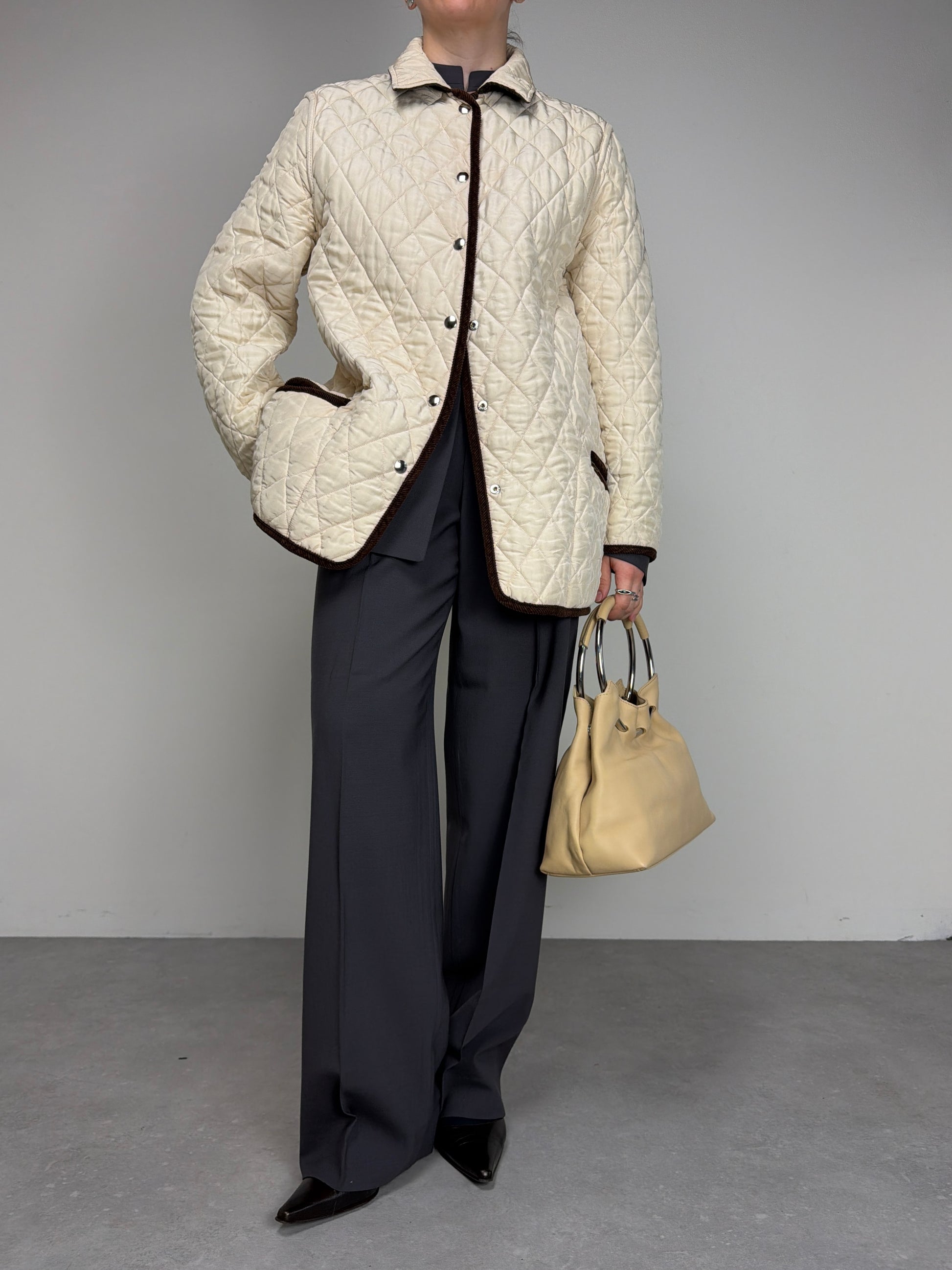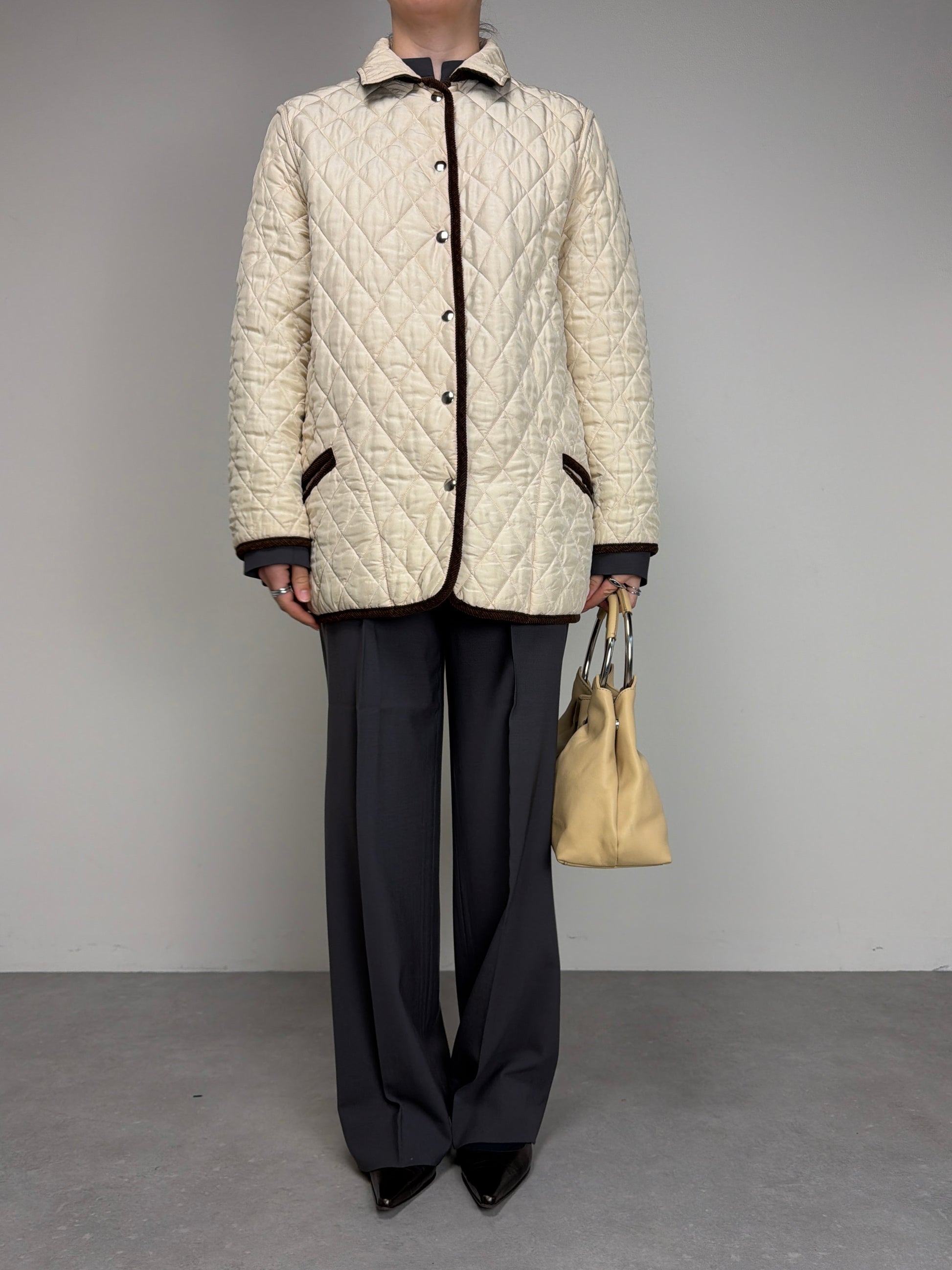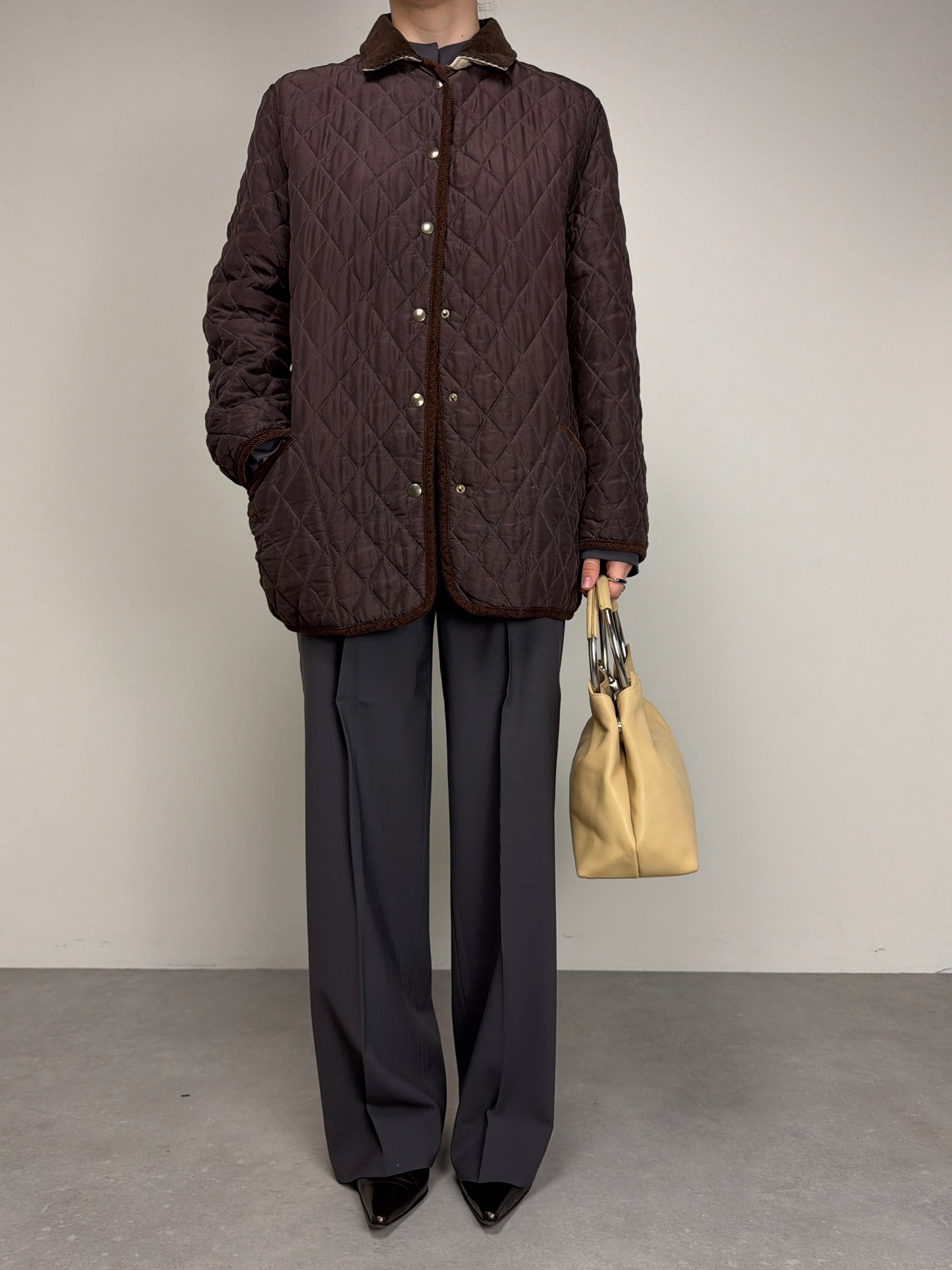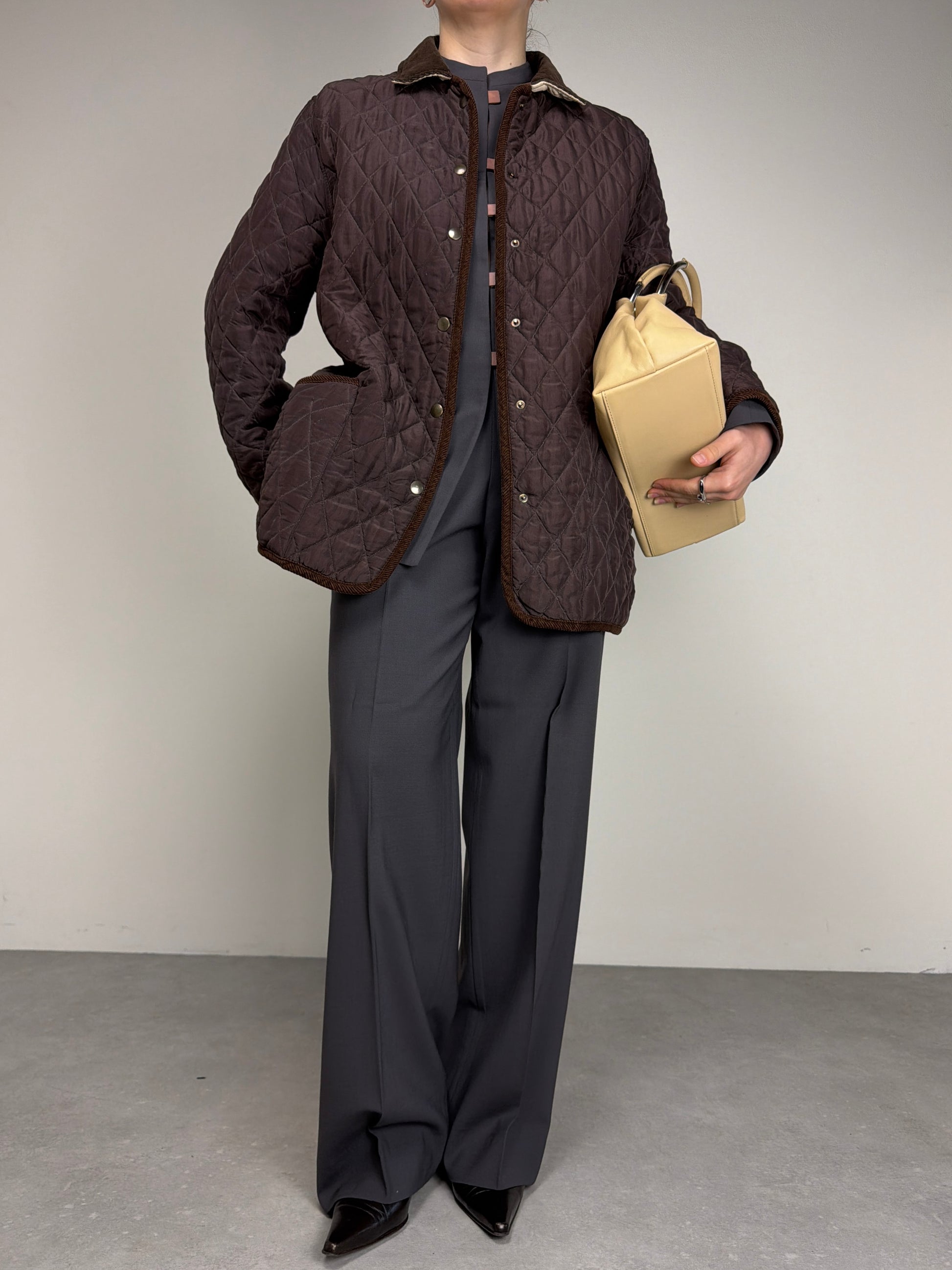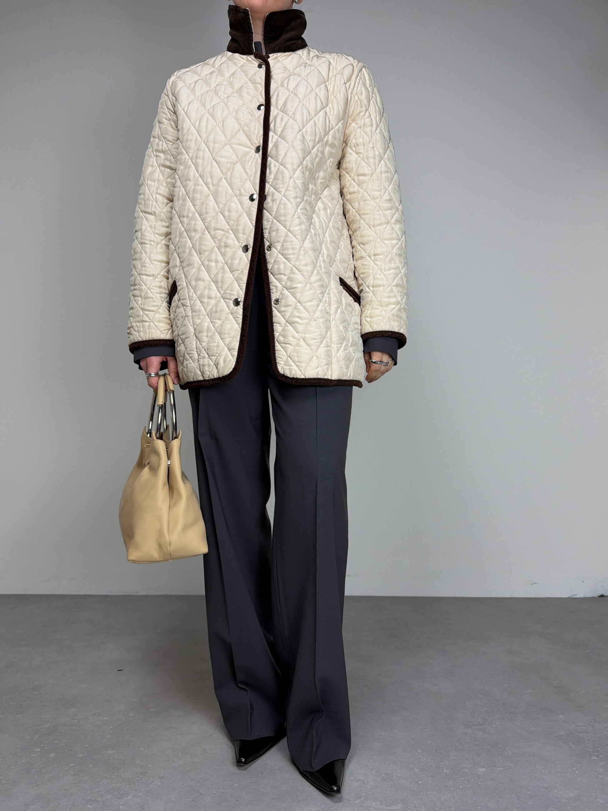 Giacca trapuntata, vintage made in Italy, in 100% seta, double face, da una parte marrone e dall’altra color crema, con rifiniture in velluto a coste marroni.