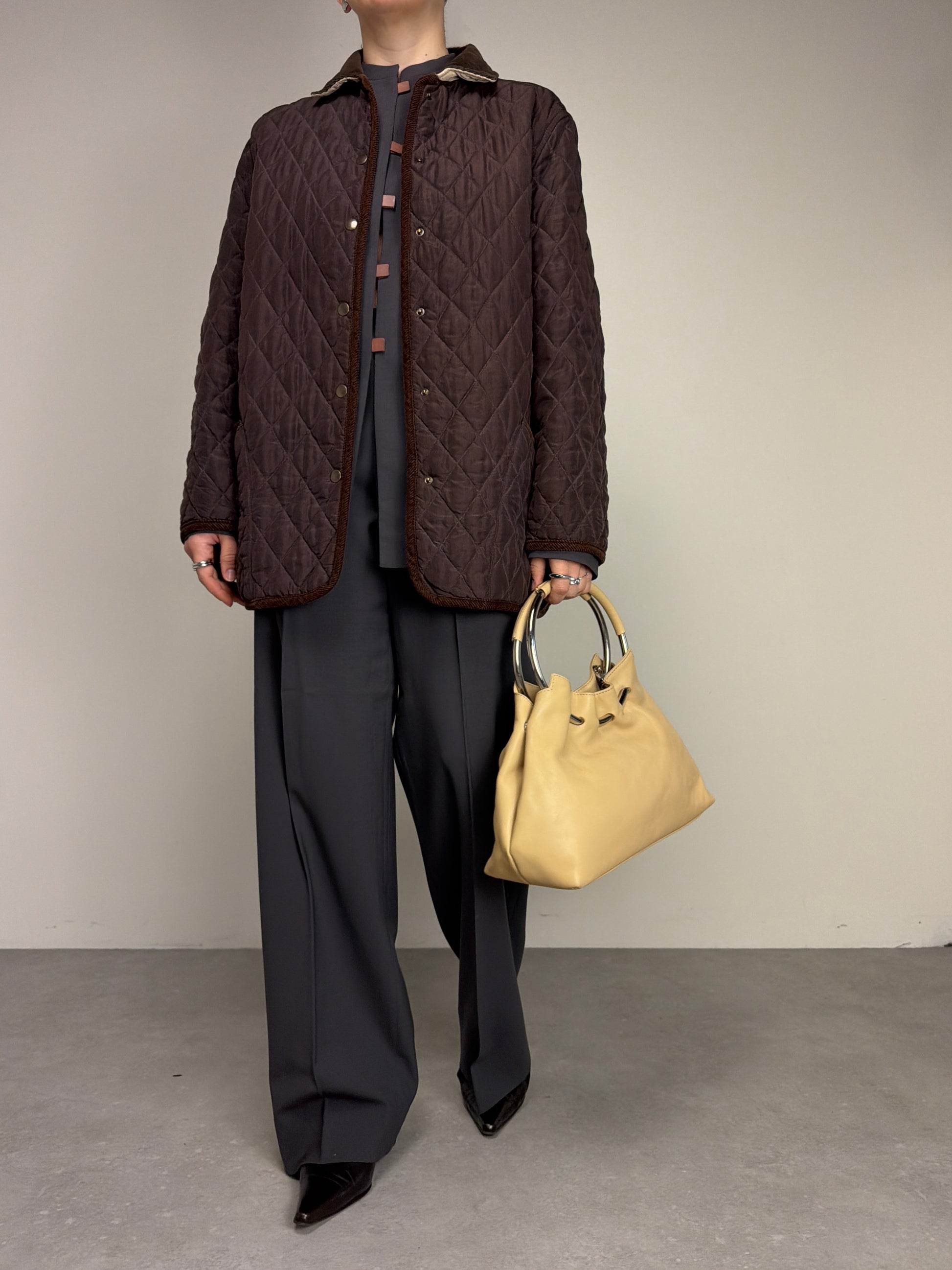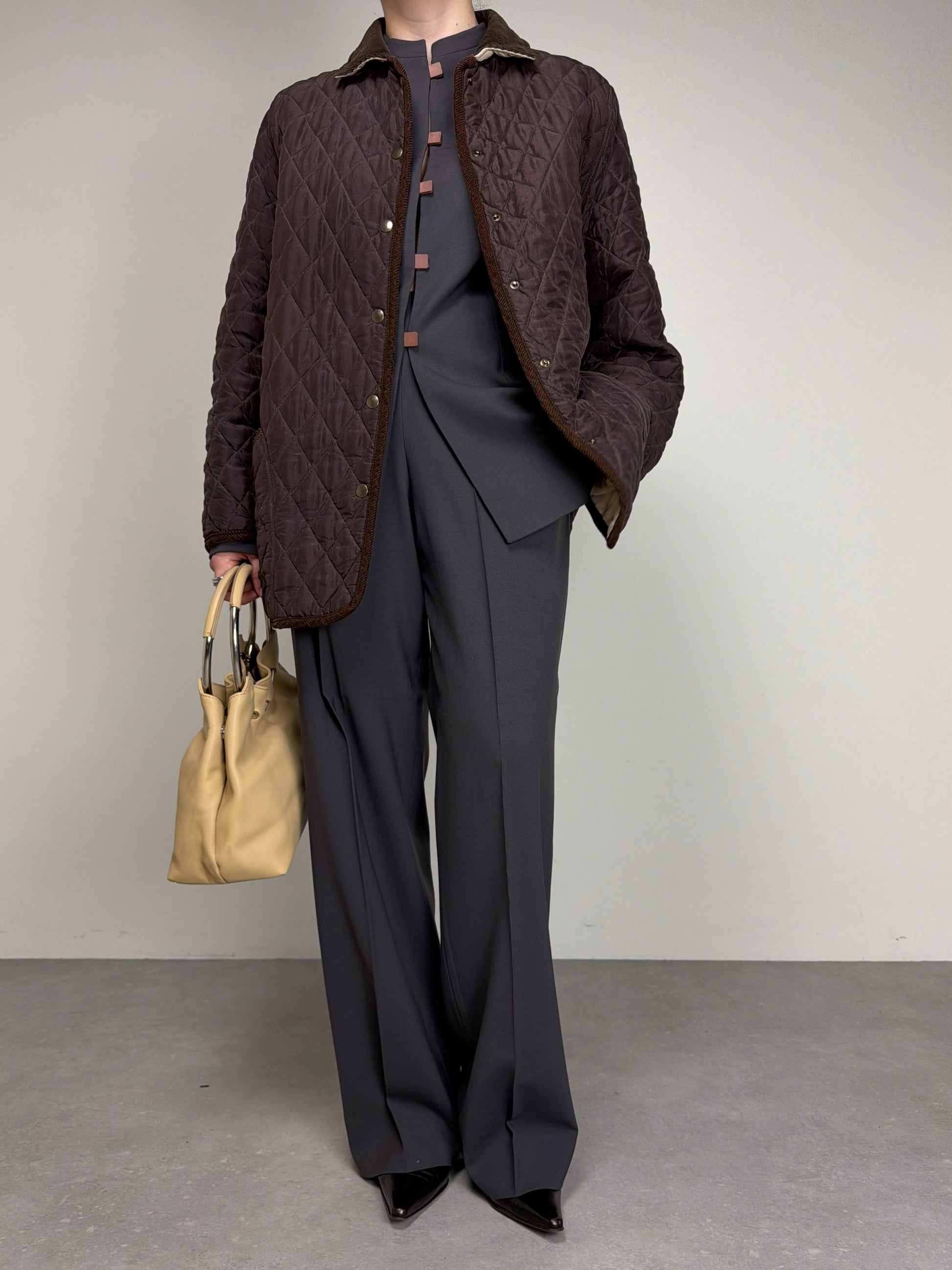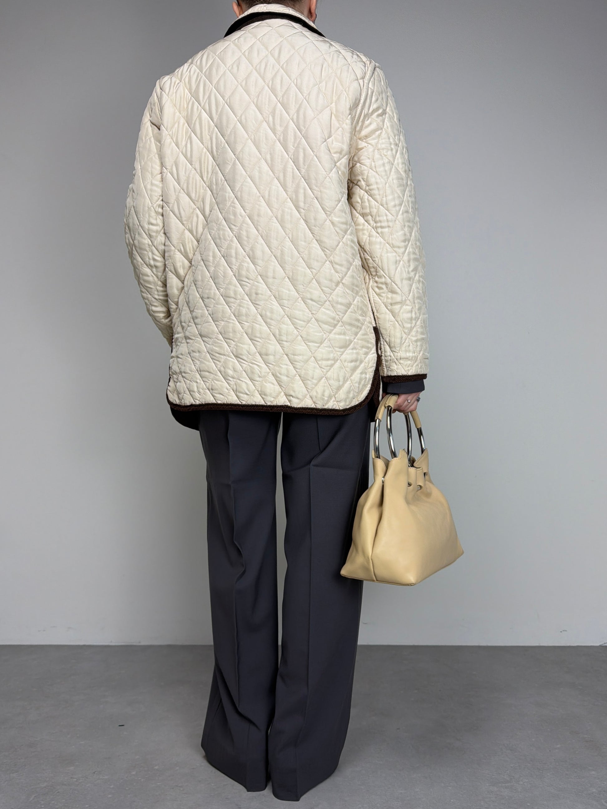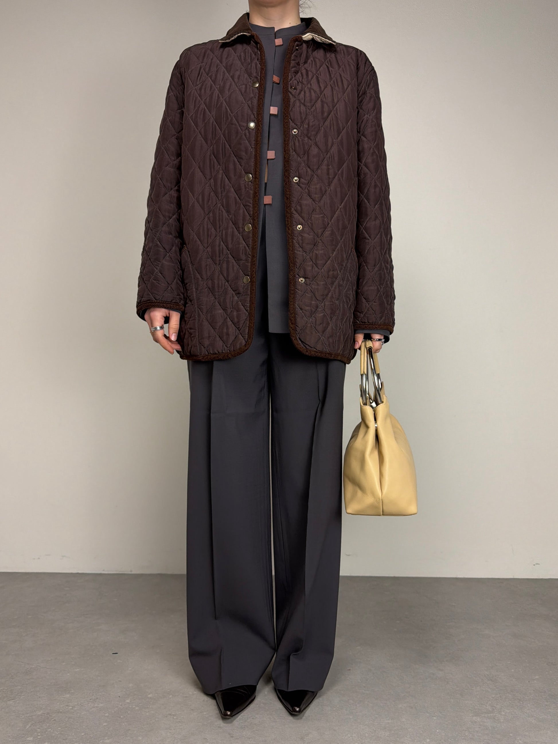 Giacca trapuntata, vintage made in Italy, in 100% seta, double face, da una parte marrone e dall’altra color crema, con rifiniture in velluto a coste marroni.