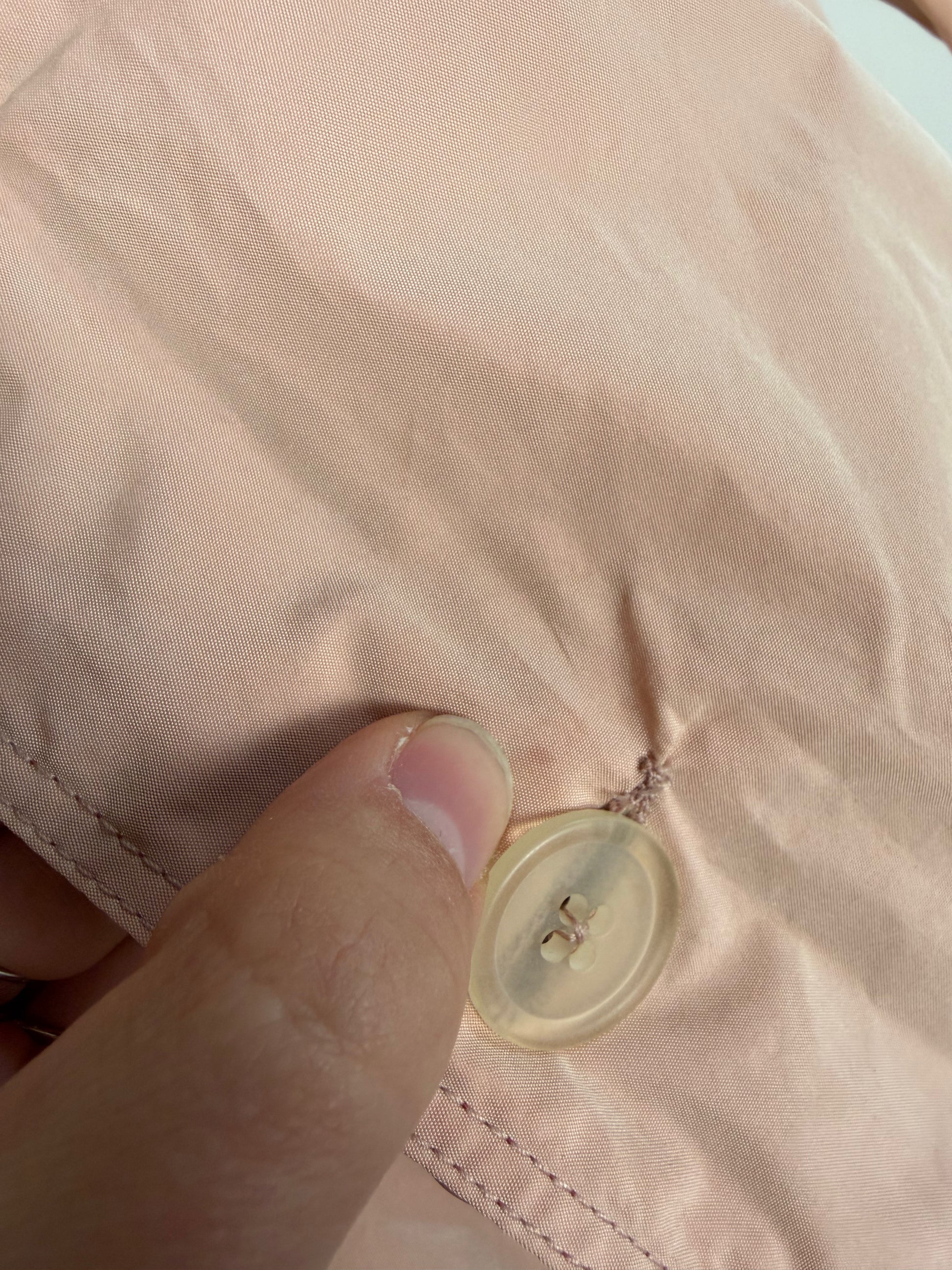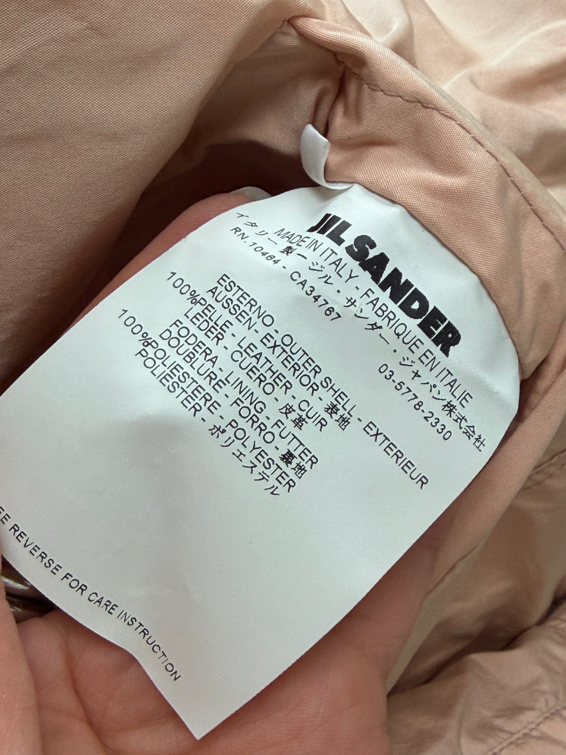 Blazer Jil Sander double-face, da un lato in pelle di agnello color pesca e dall’altro in tessuto tecnico rosa cipria leggermente croccante.
