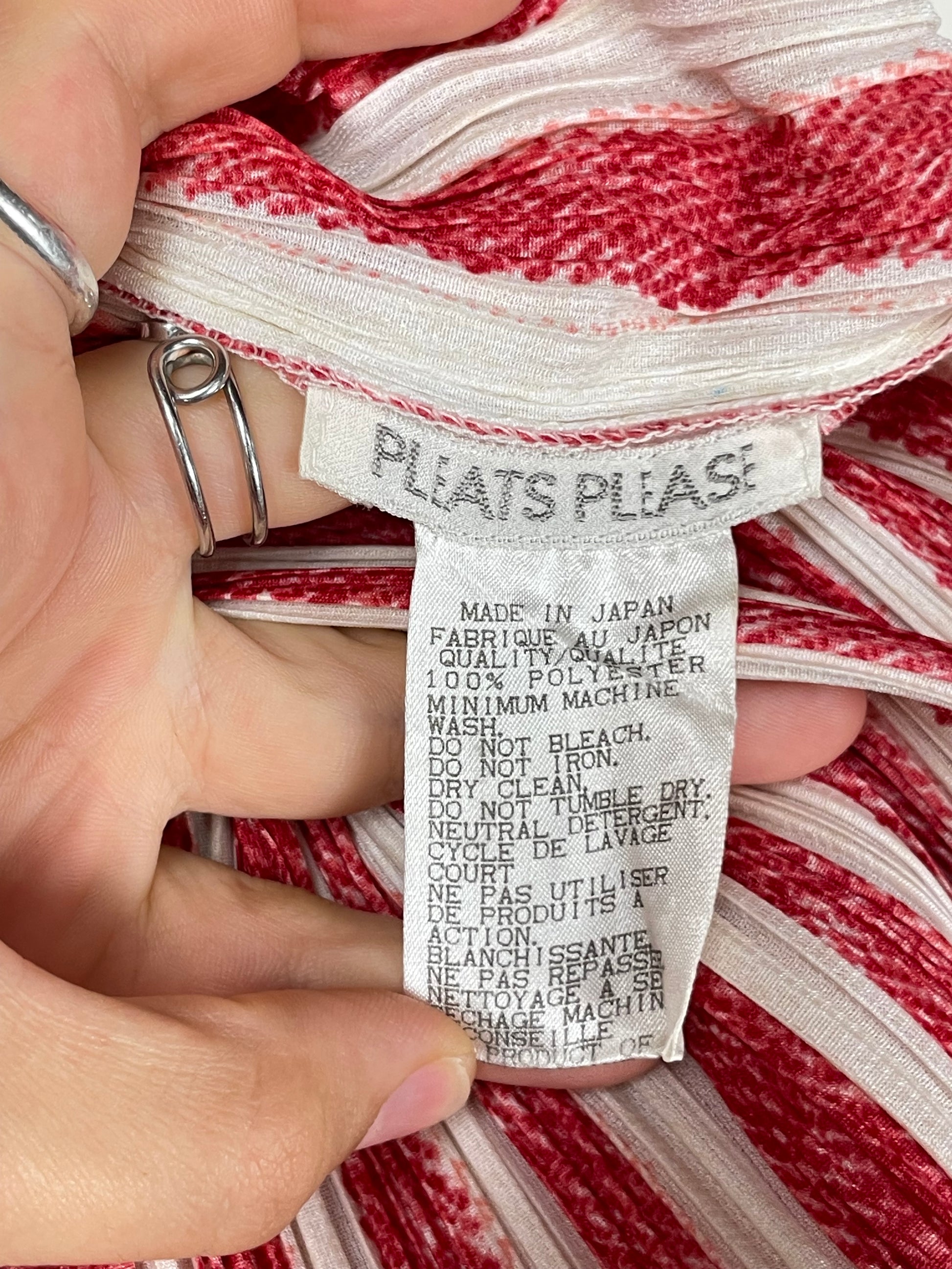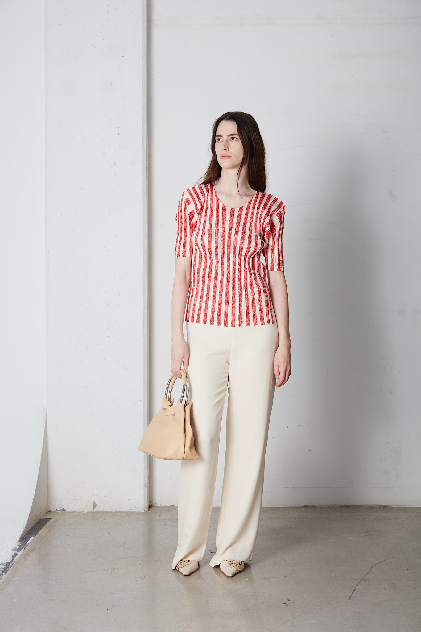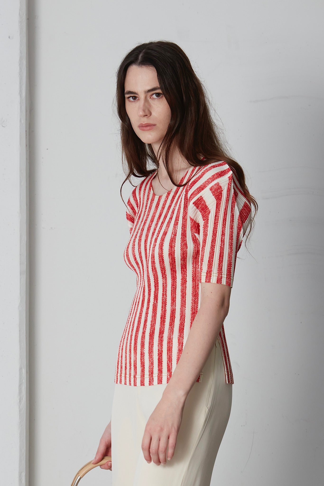 Top a righe verticali rosse e panna di Pleats Please by Issey Miyake, con classica lavorazione plissé che segue la linea del corpo.
