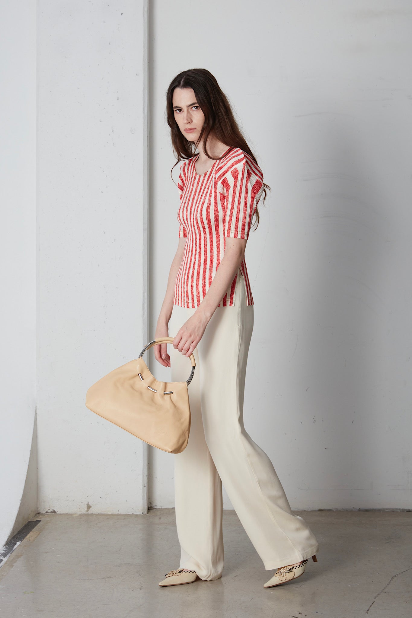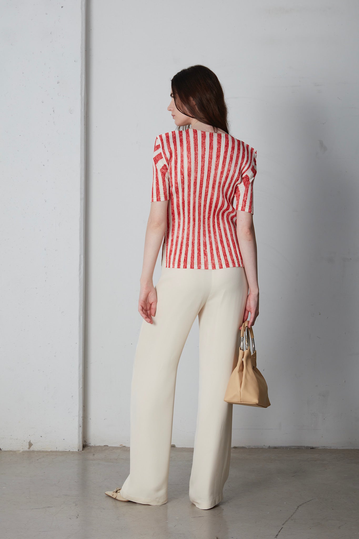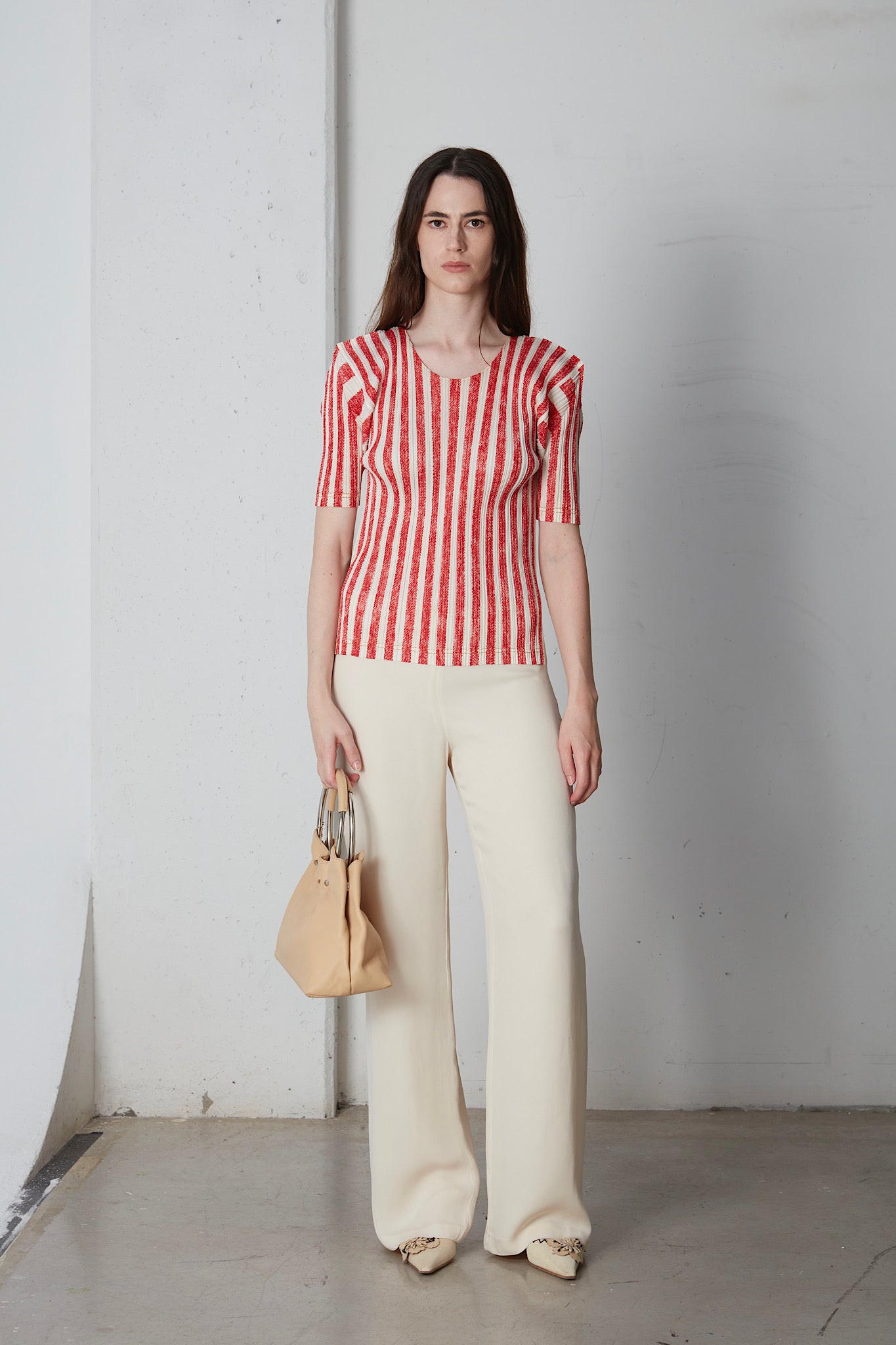 Top a righe verticali rosse e panna di Pleats Please by Issey Miyake, con classica lavorazione plissé che segue la linea del corpo.