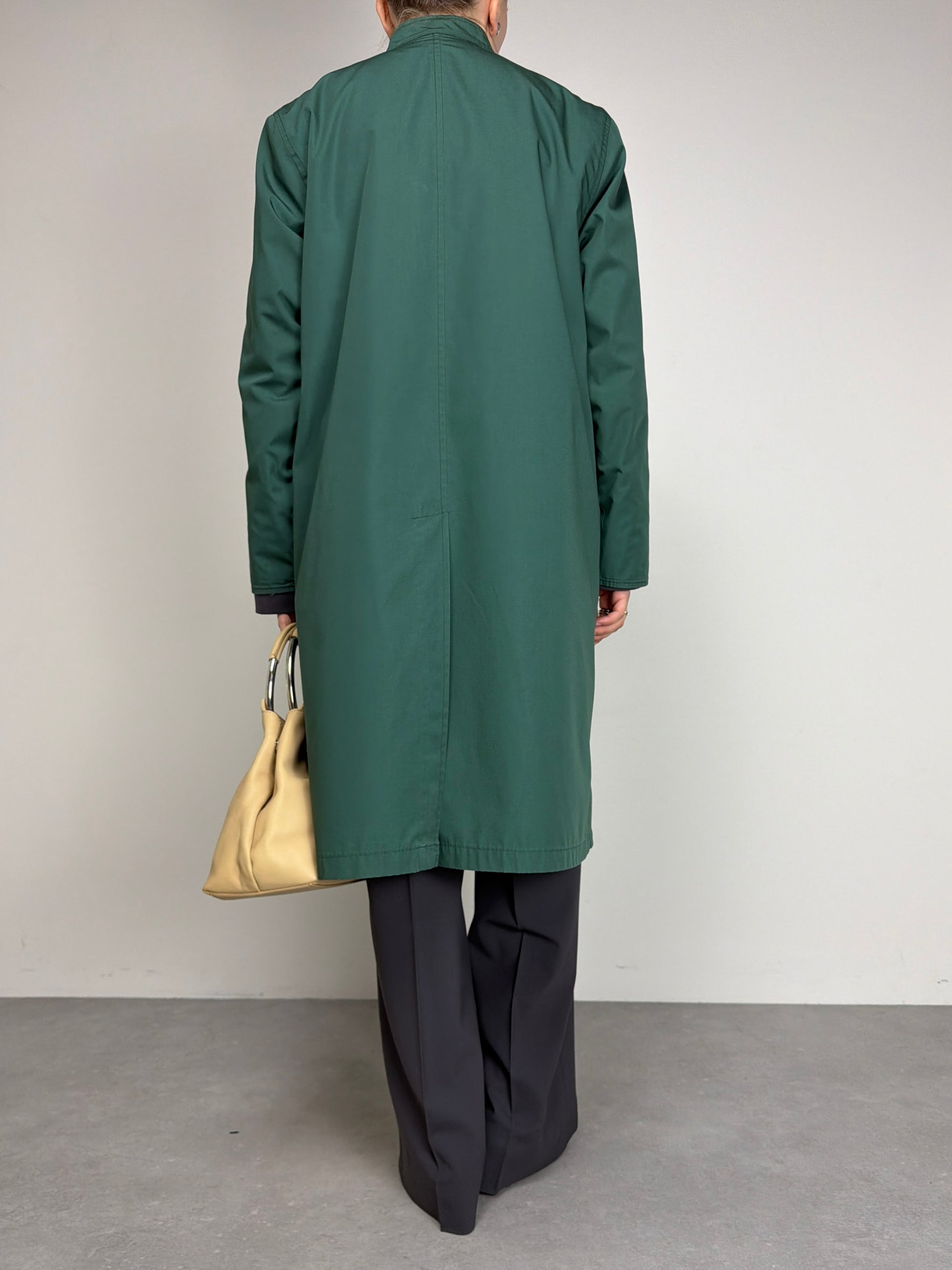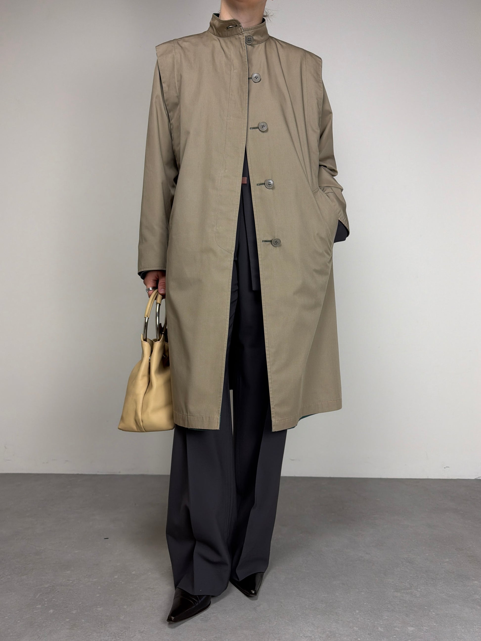 Trench vintage sartoriale double face in misto cotone, da un lato verde mirto e dall’altro beige sabbia.