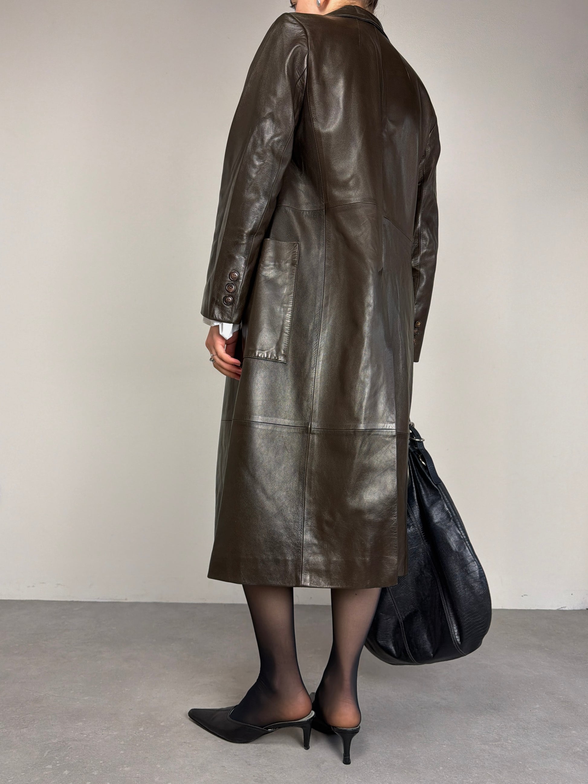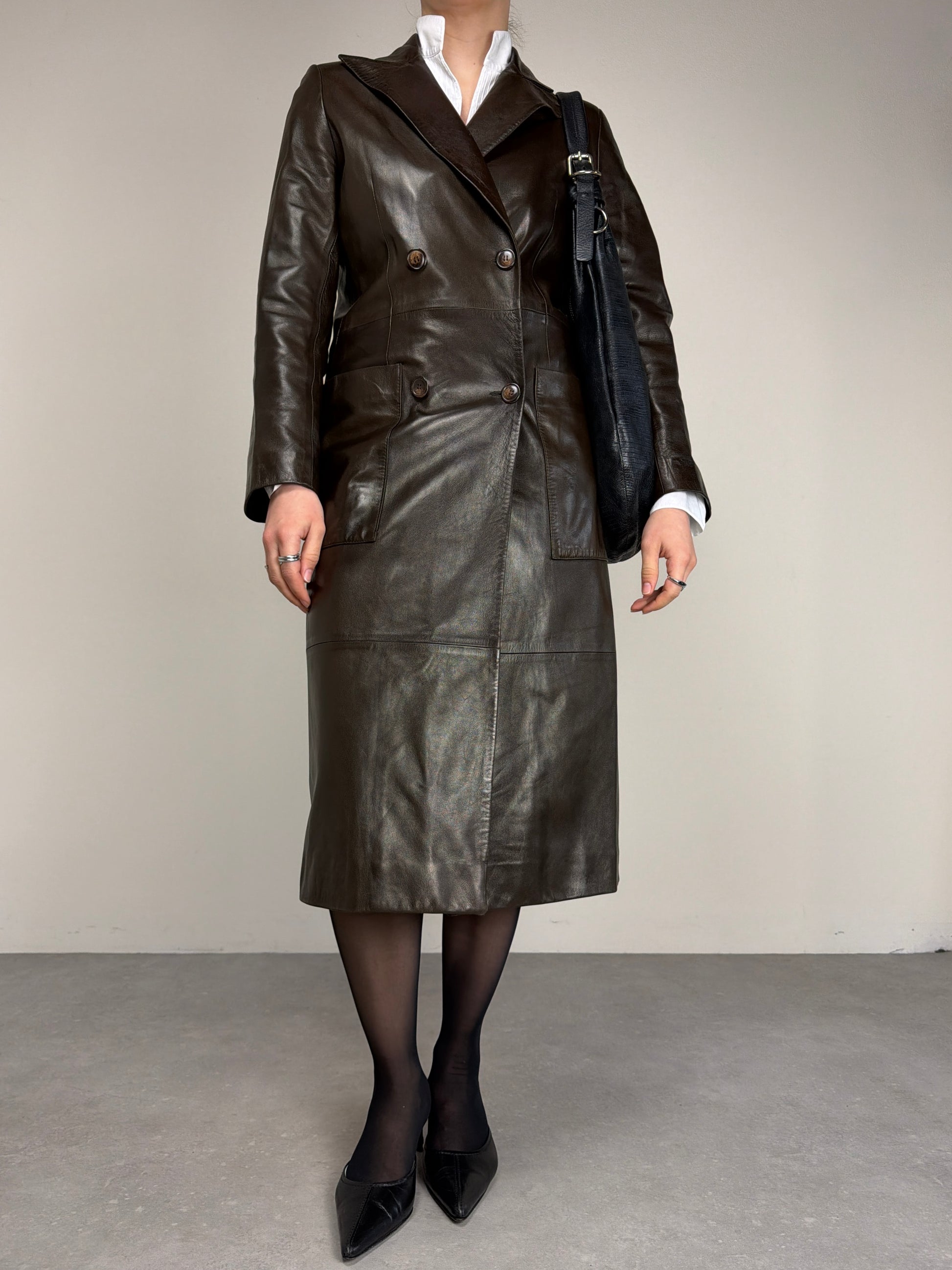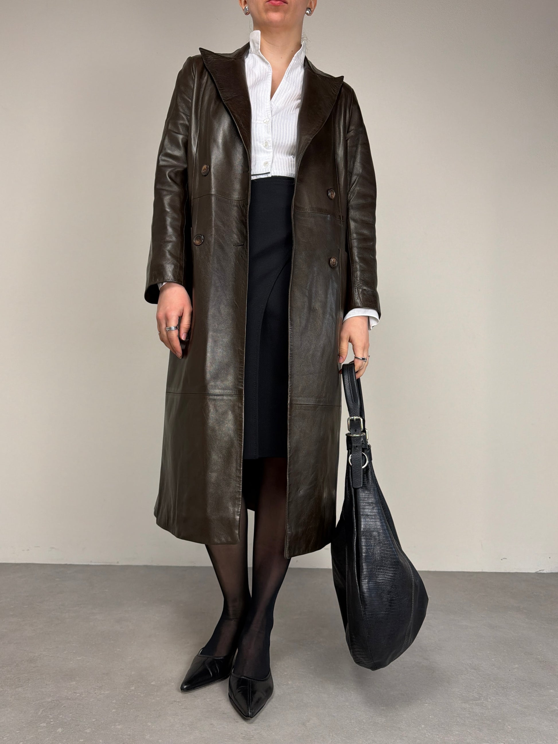 Trench in vera pelle marrone, dalla mano morbidissima e di alta qualità, con costruzione doppiopetto.