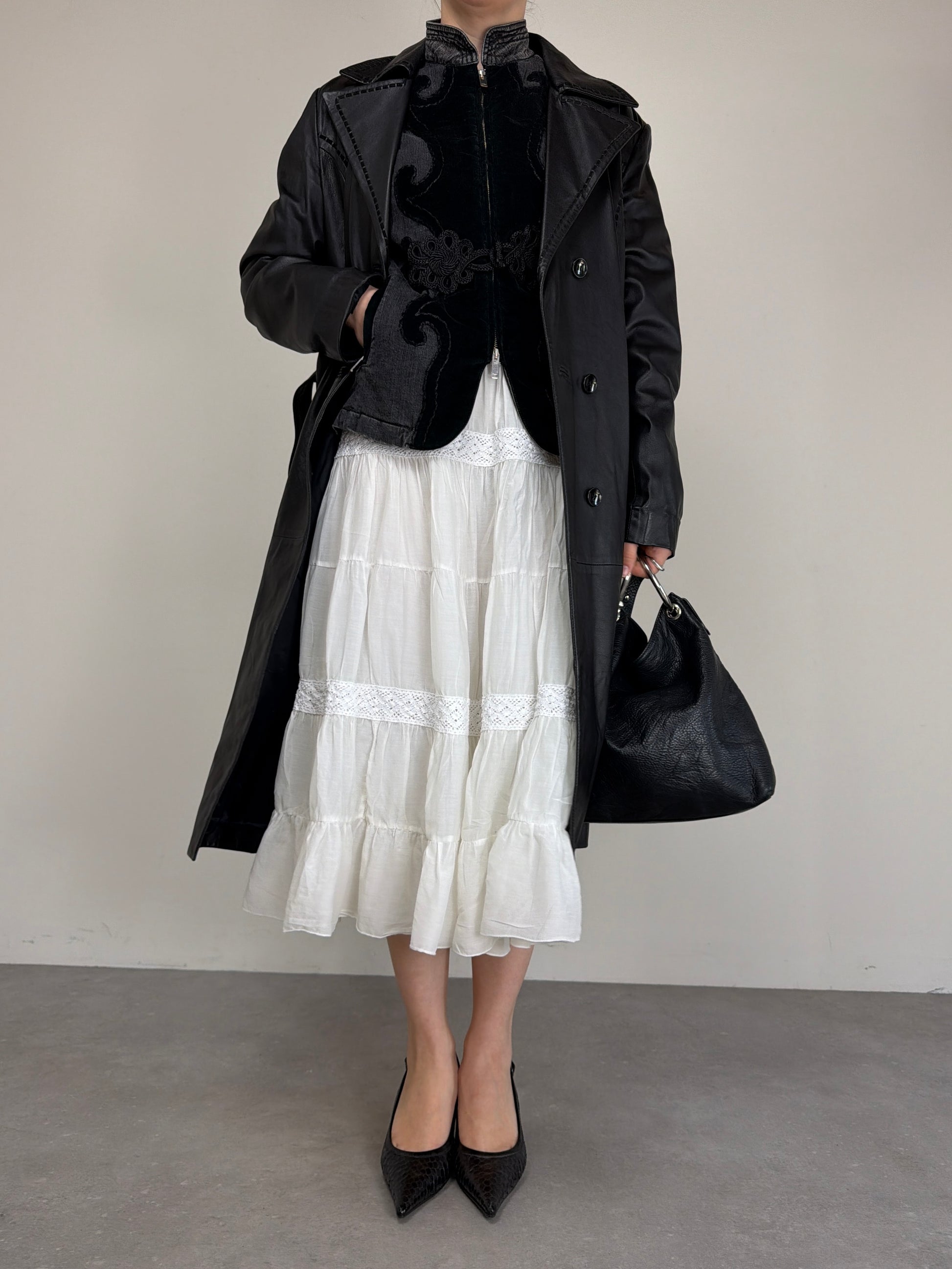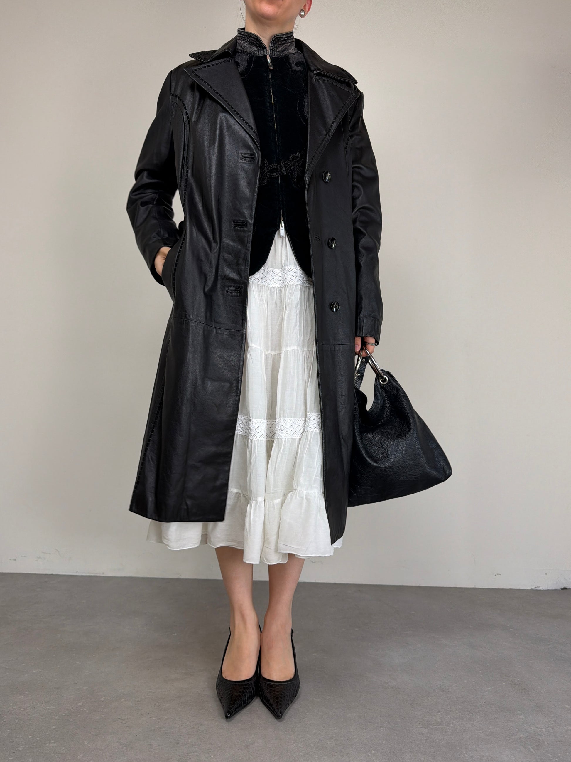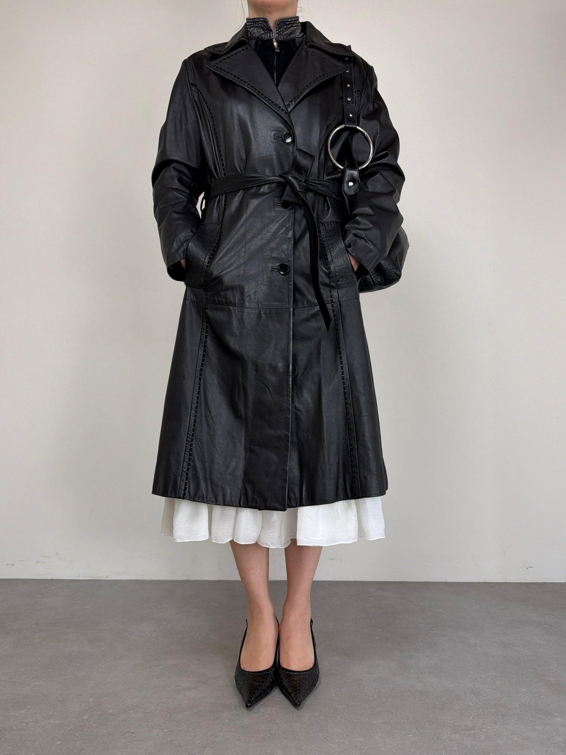 Trench vintage Made in Italy in vera pelle nera con costruzione doppiopetto, caratterizzato da impunture lungo i bordi realizzate in pelle scamosciata.