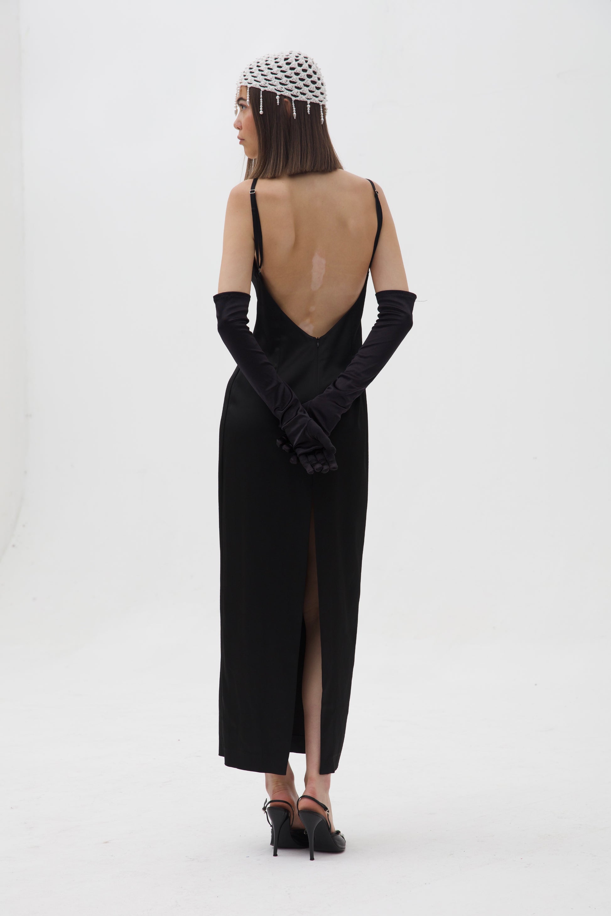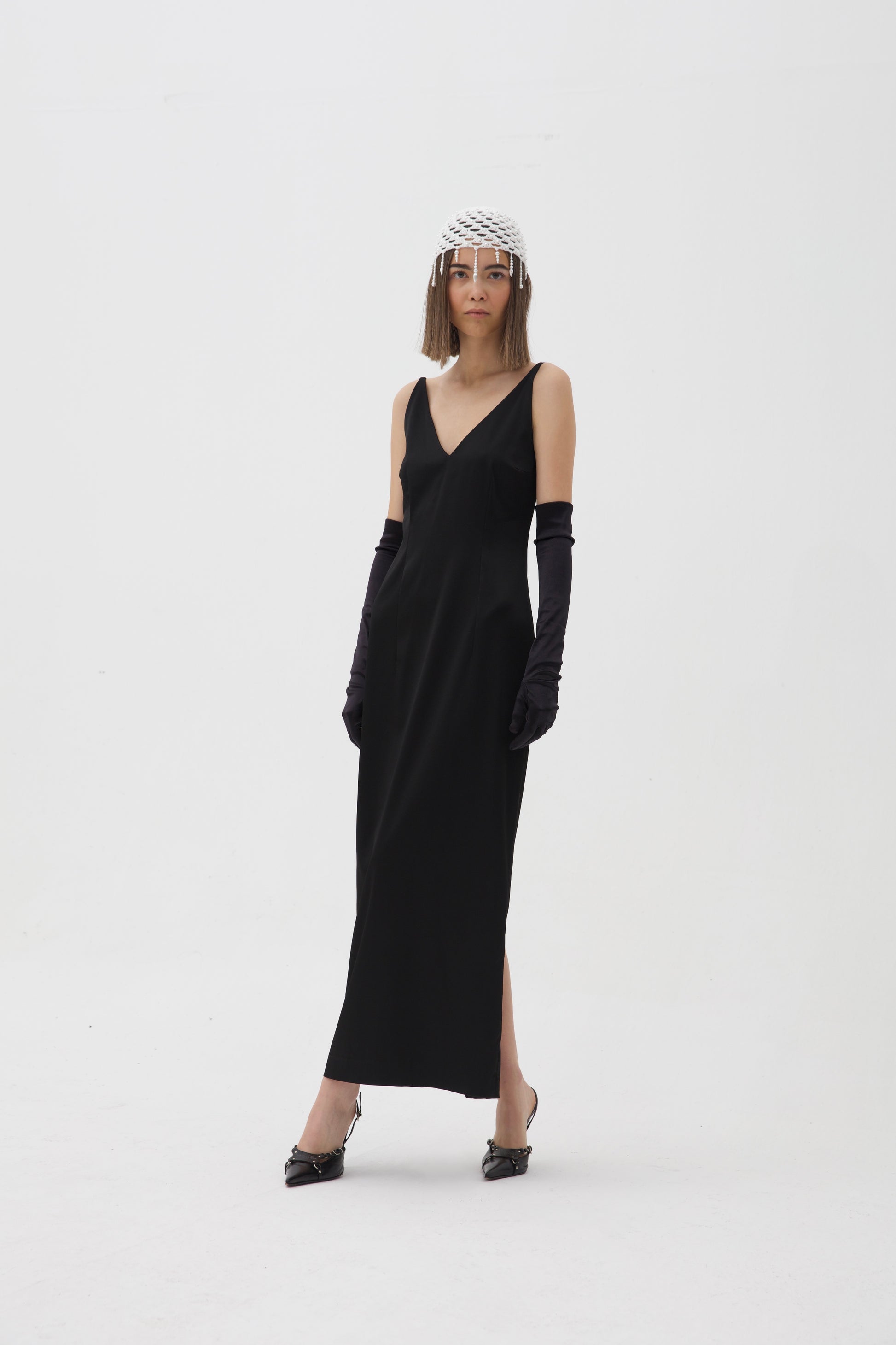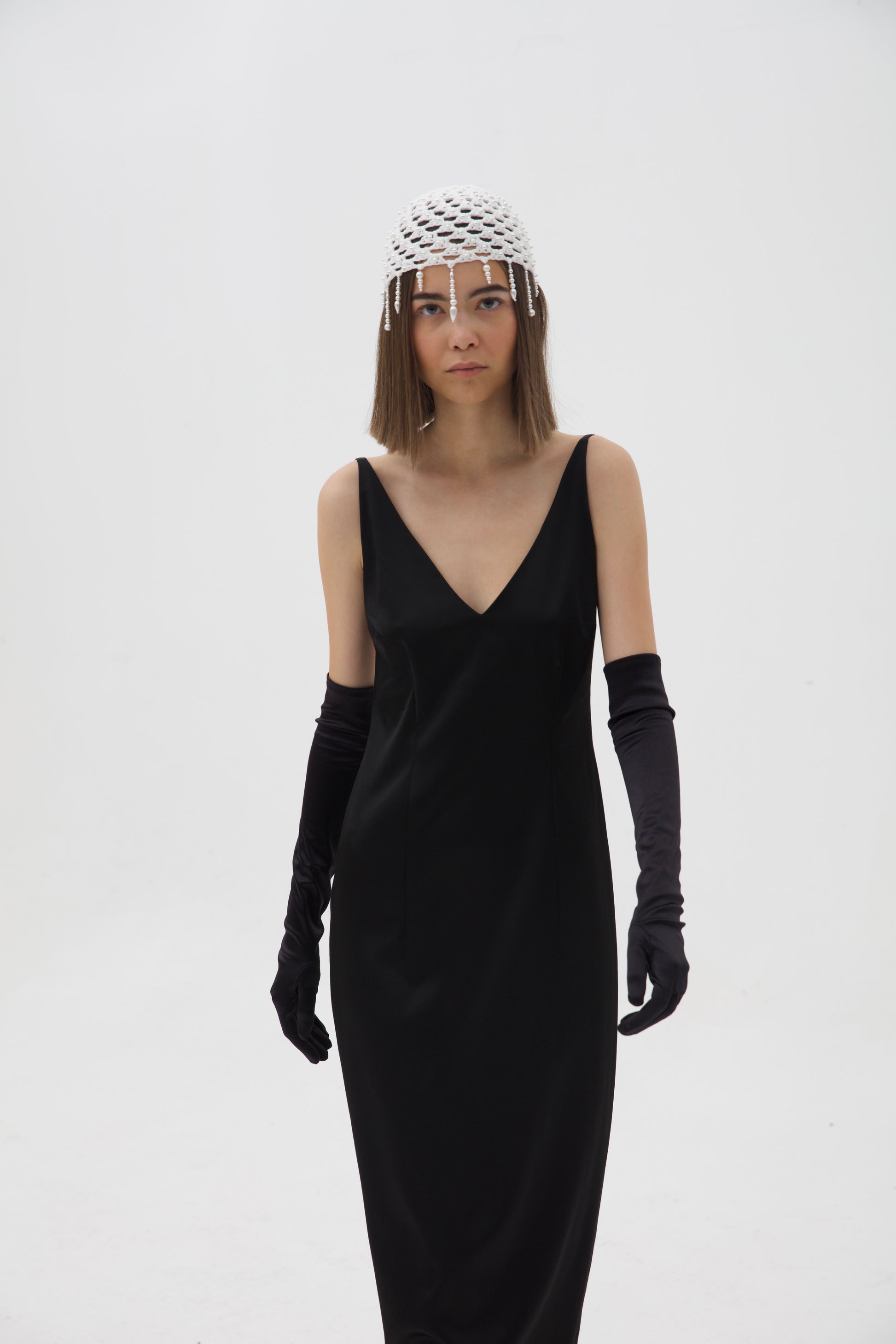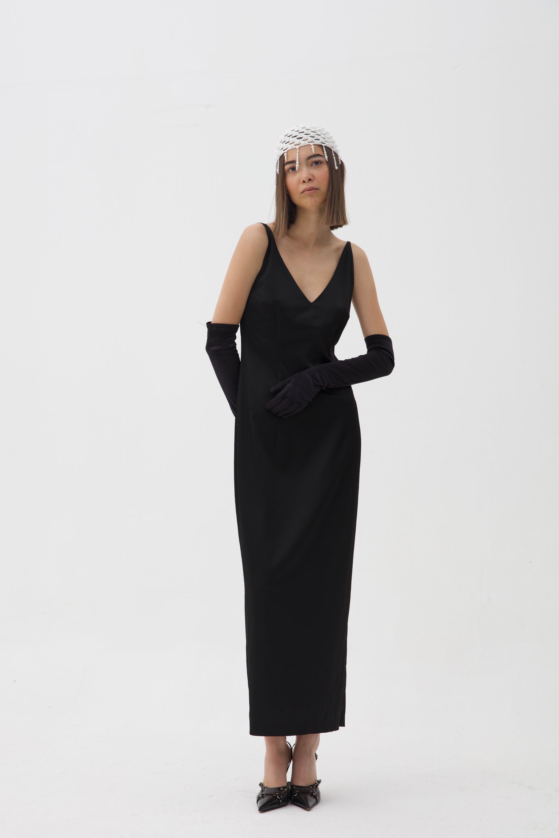 Abito vintage Made in Italy in cady nero, con uno scollo a V davanti che segue sul retro, rivelando una porzione significativa della schiena che dona una silhouette molto affascinante.