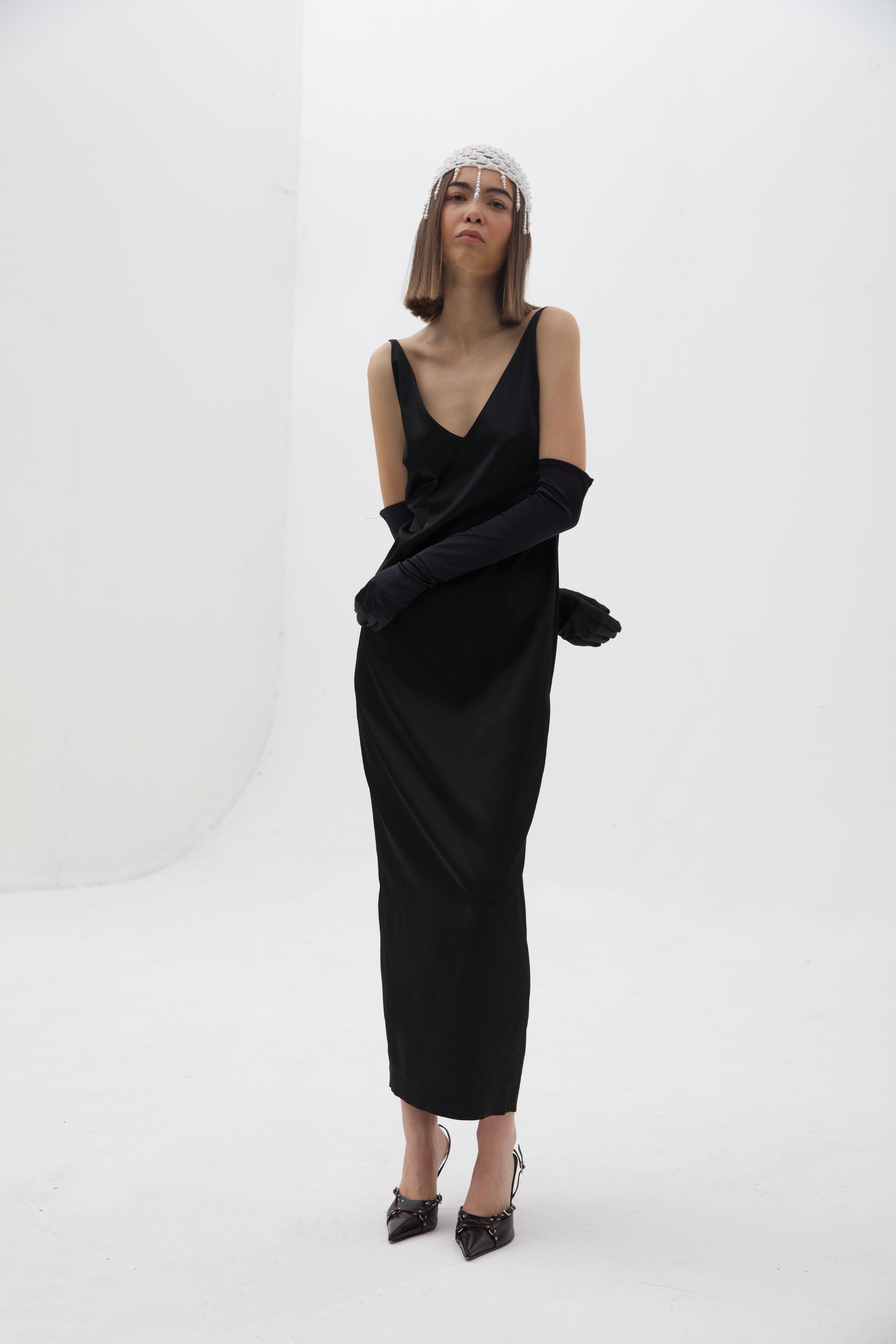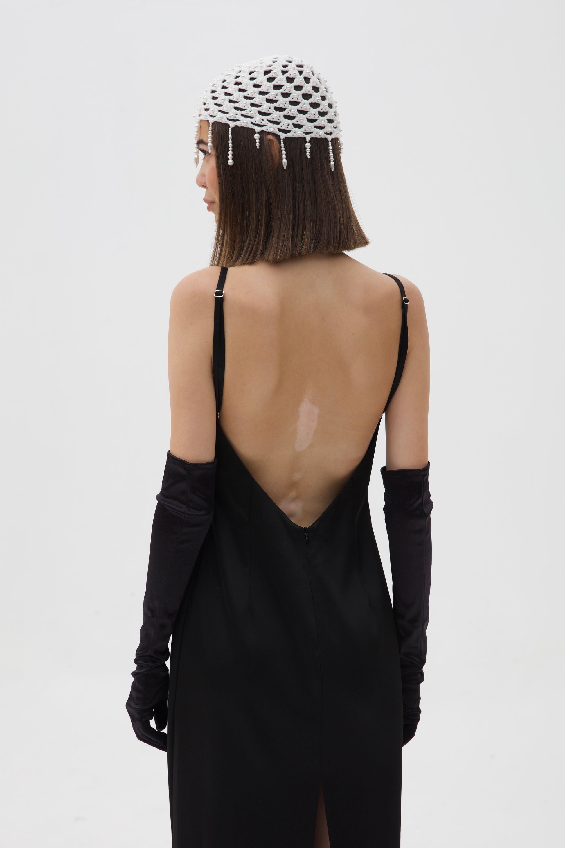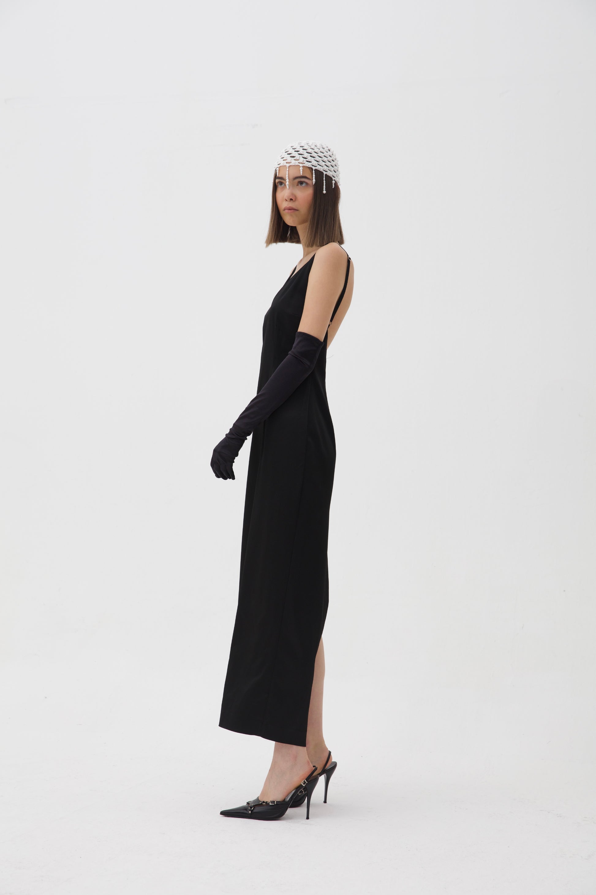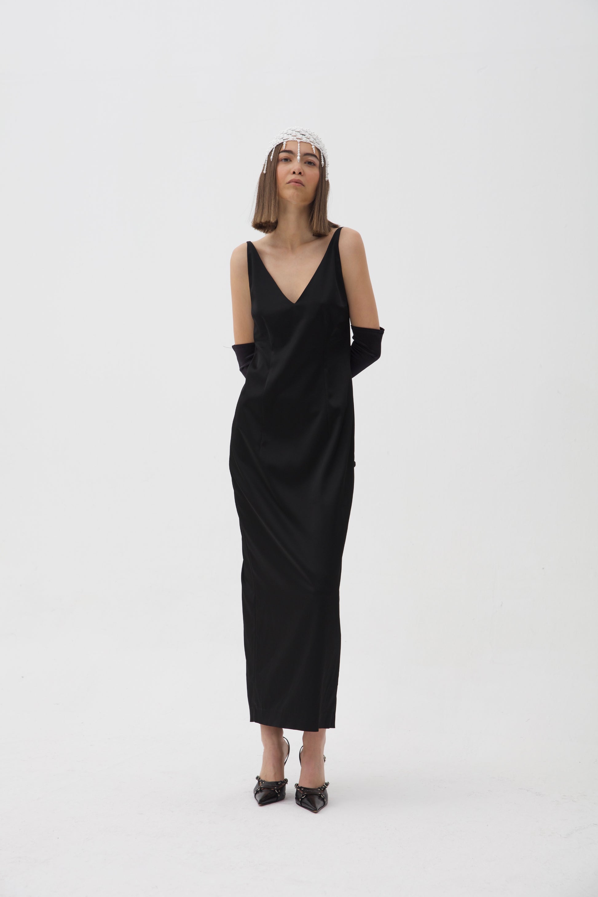 Abito vintage Made in Italy in cady nero, con uno scollo a V davanti che segue sul retro, rivelando una porzione significativa della schiena che dona una silhouette molto affascinante.