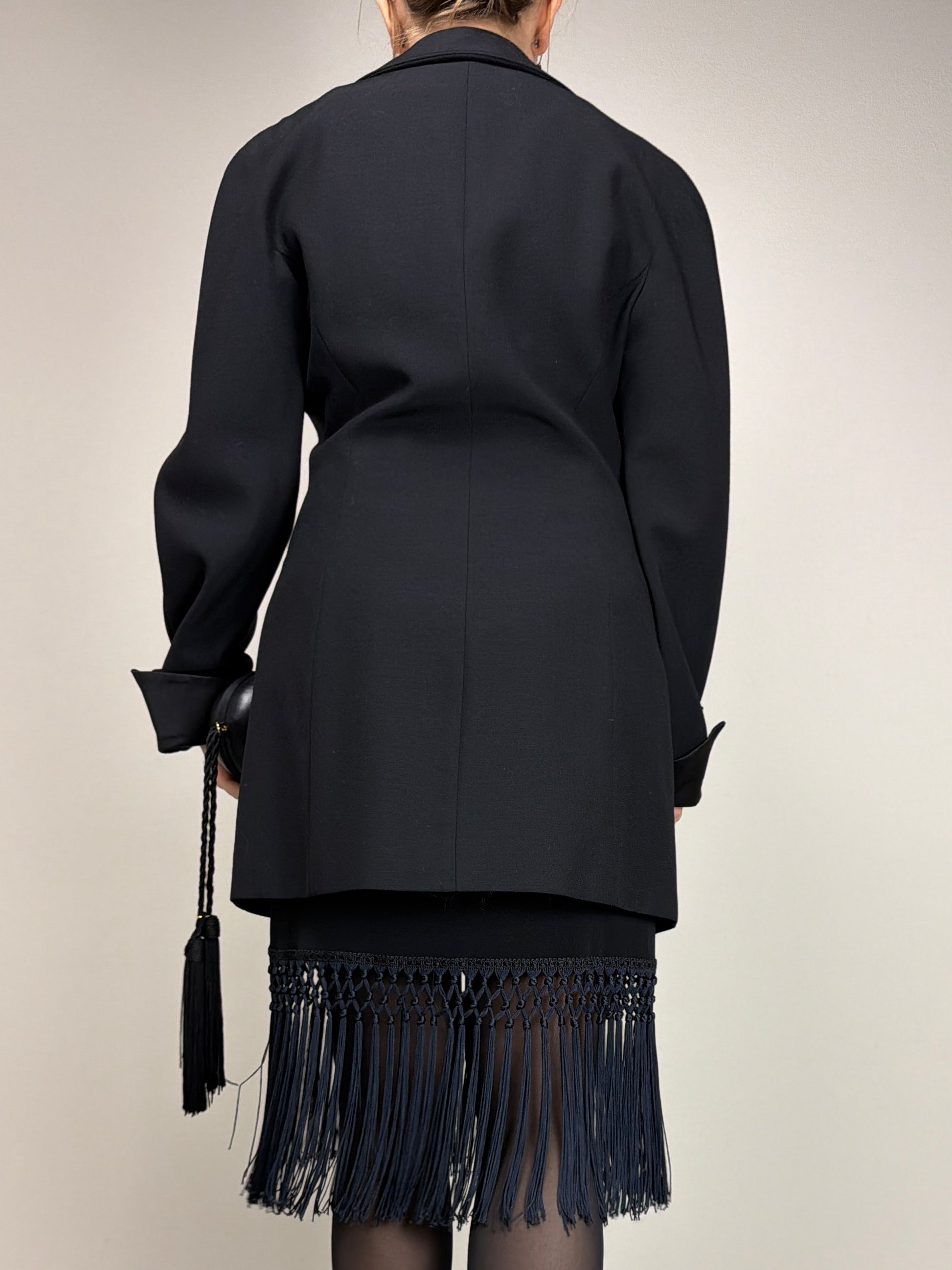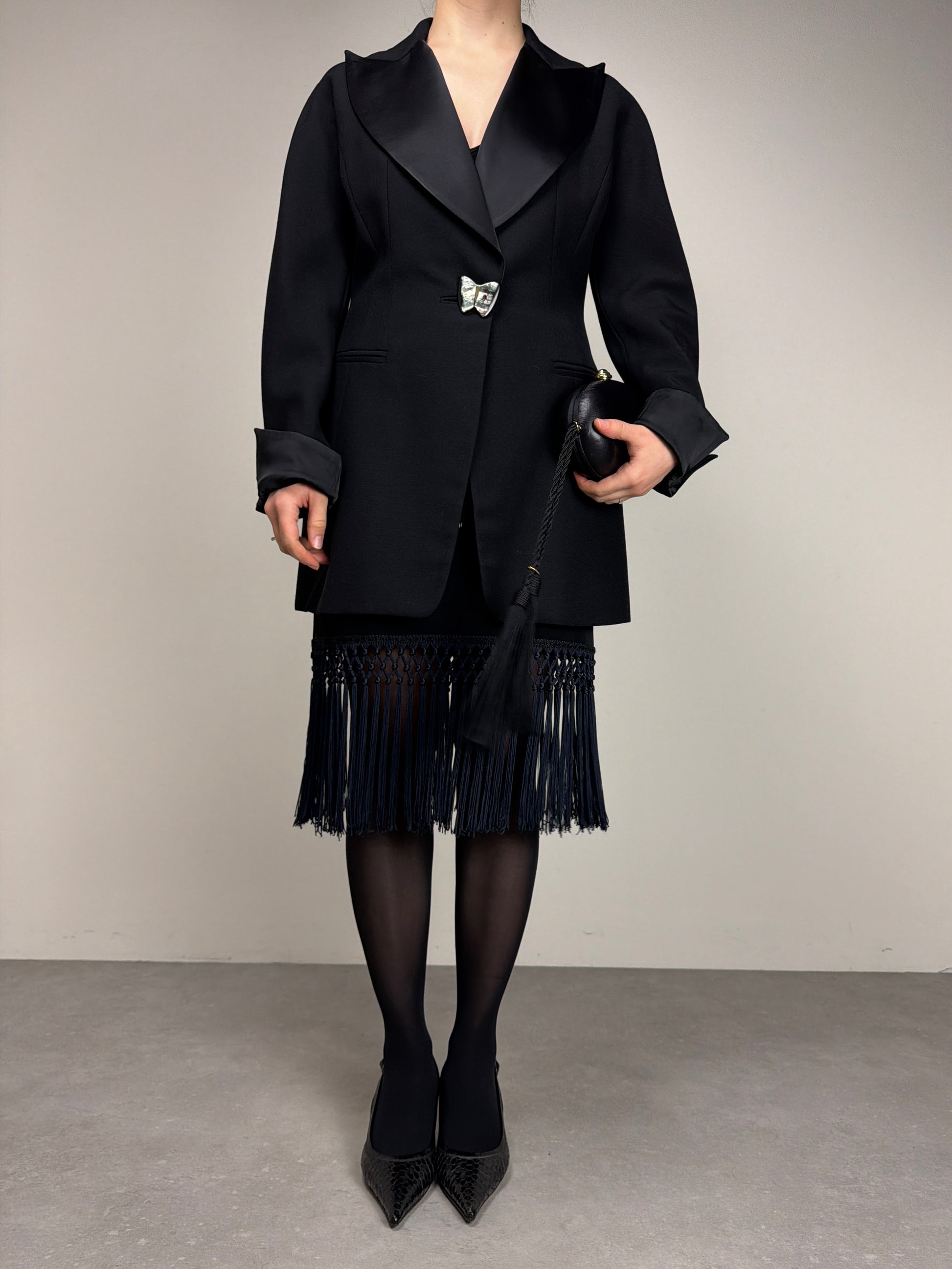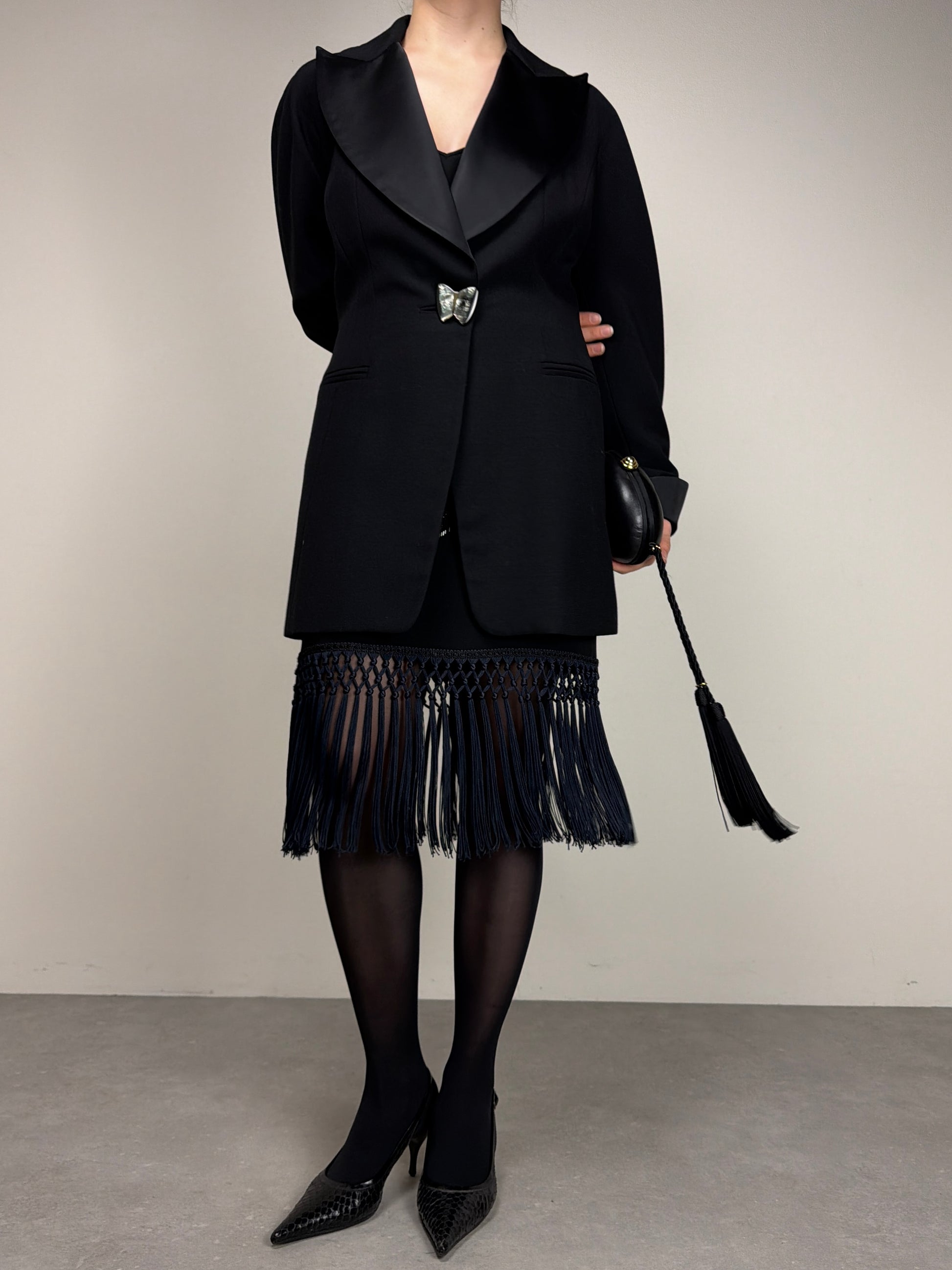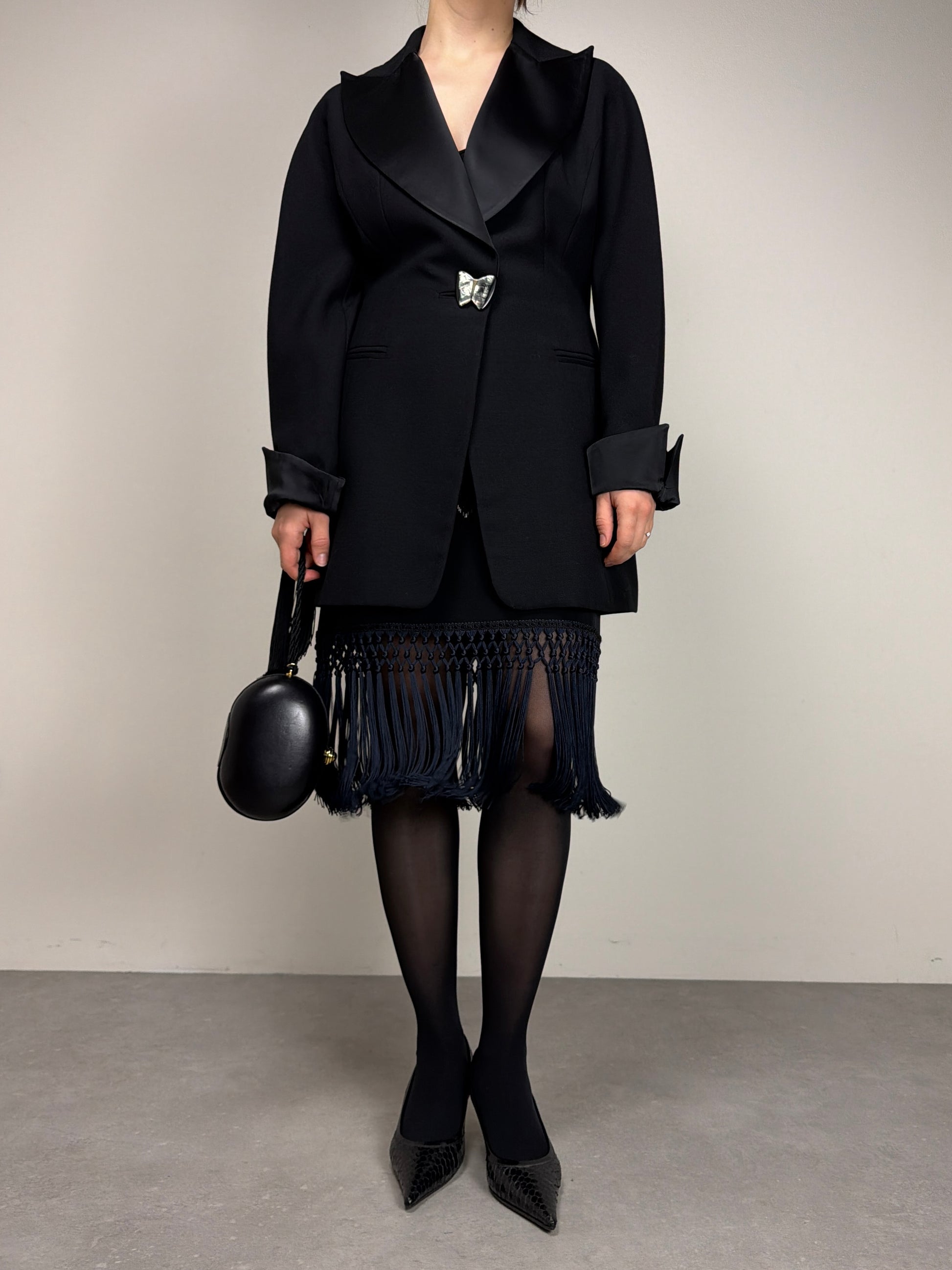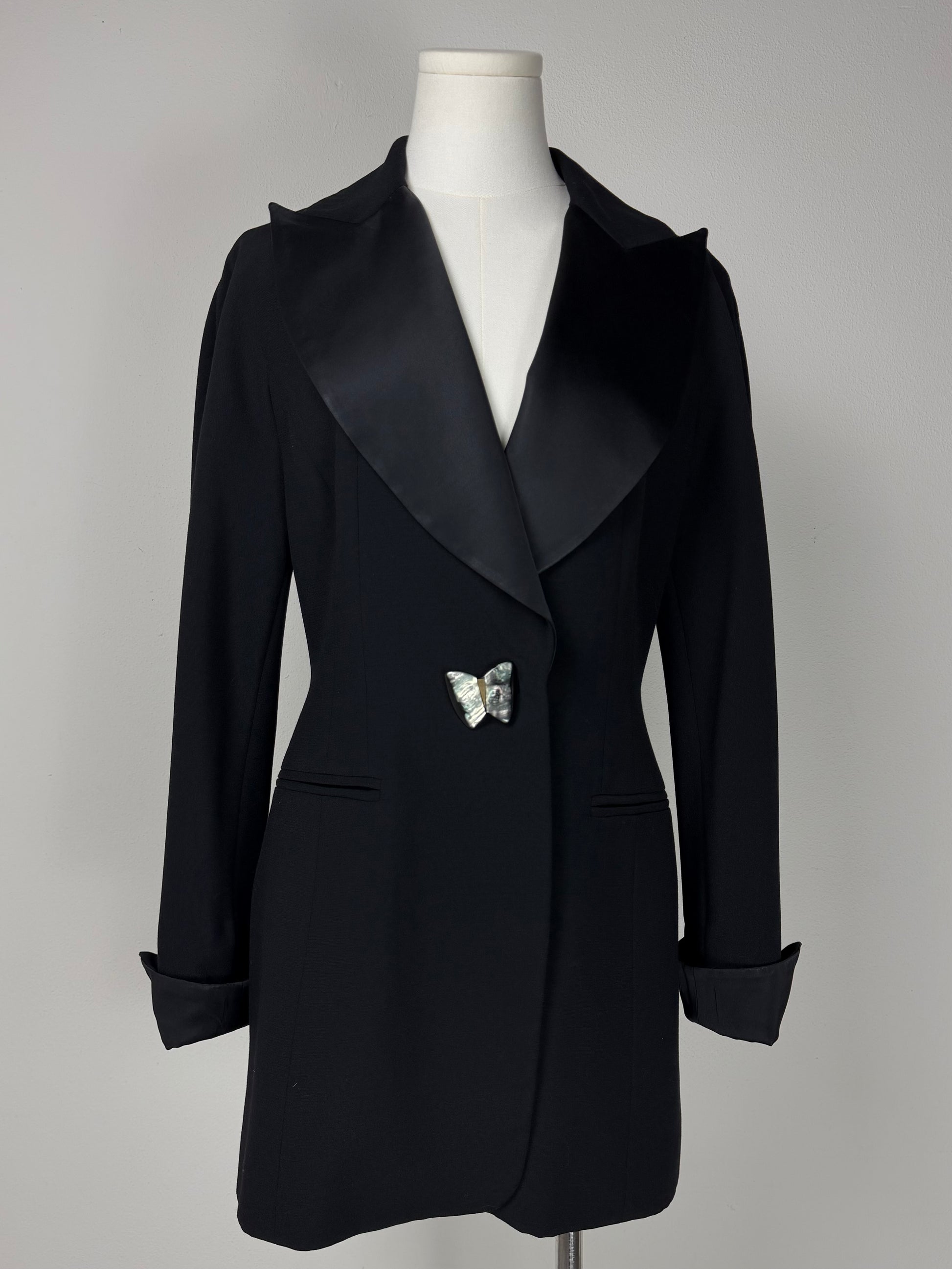 Blazer Vintage Made in Italy color nero, linea leggermente avvitata con costruzione a kimono, rever ampio in raso e bottone gioiello a forma di farfalla.
