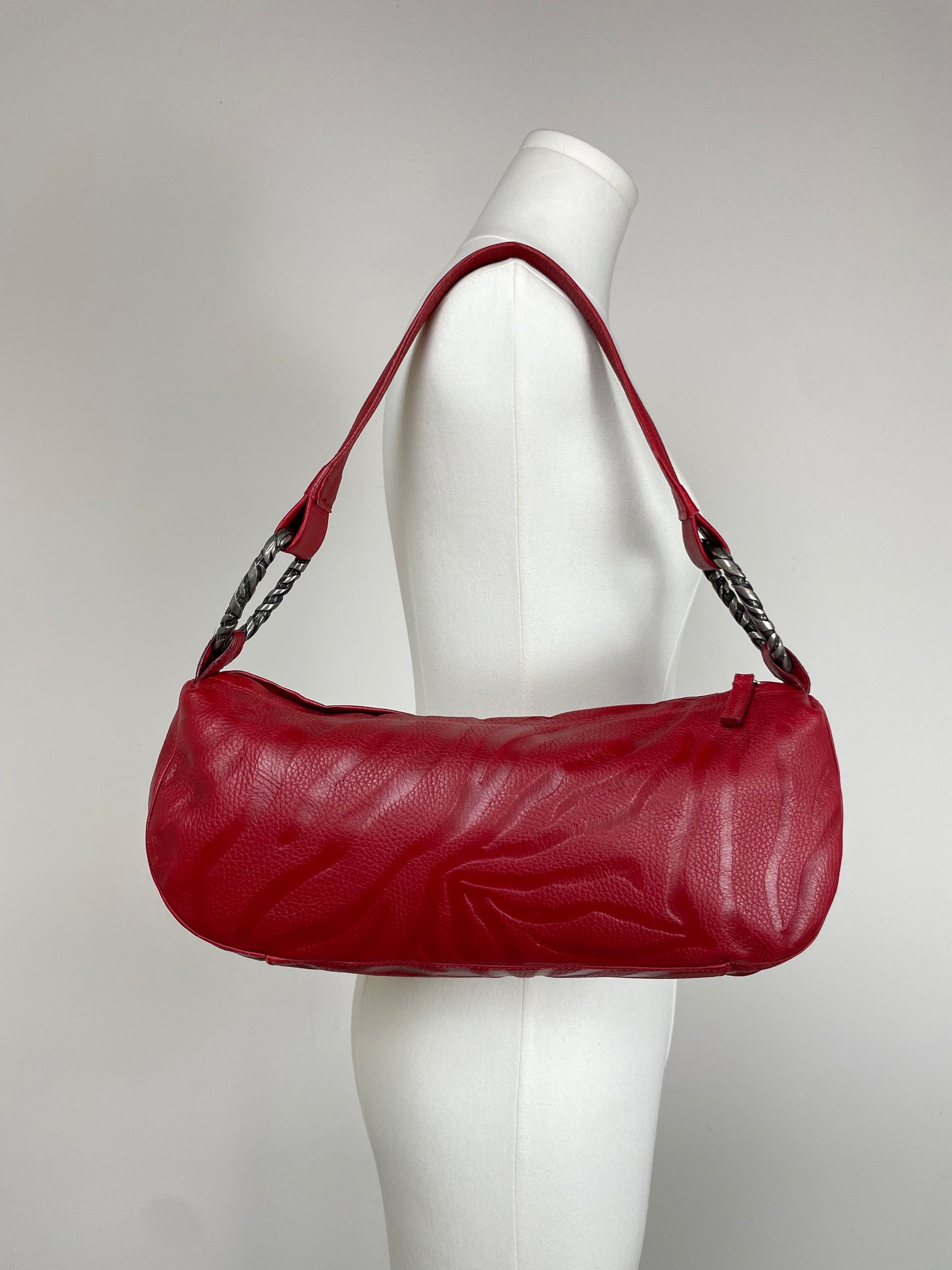Borsa a spalla vintage in vera pelle martellata color bordeaux, con linea allungata e struttura morbida. La superficie è caratterizzata da una particolare lavorazione zebrata a rilievo, ripresa anche nell’incisione decorativa degli anelli metallici che raccordano il manico.