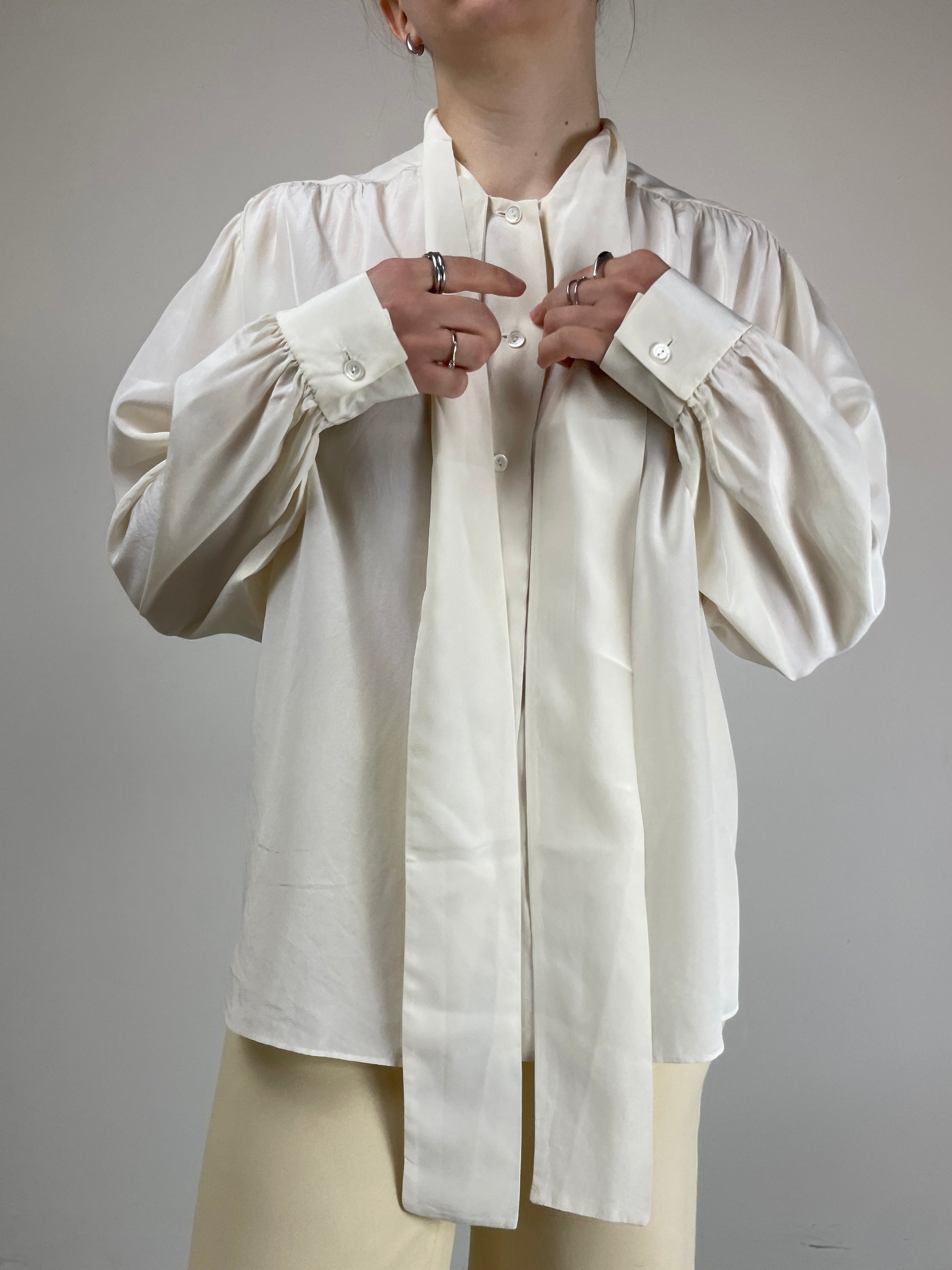Camicia vintage in pura seta, sartoriale, realizzata da una sartoria veronese, color avorio con collo lavallière.