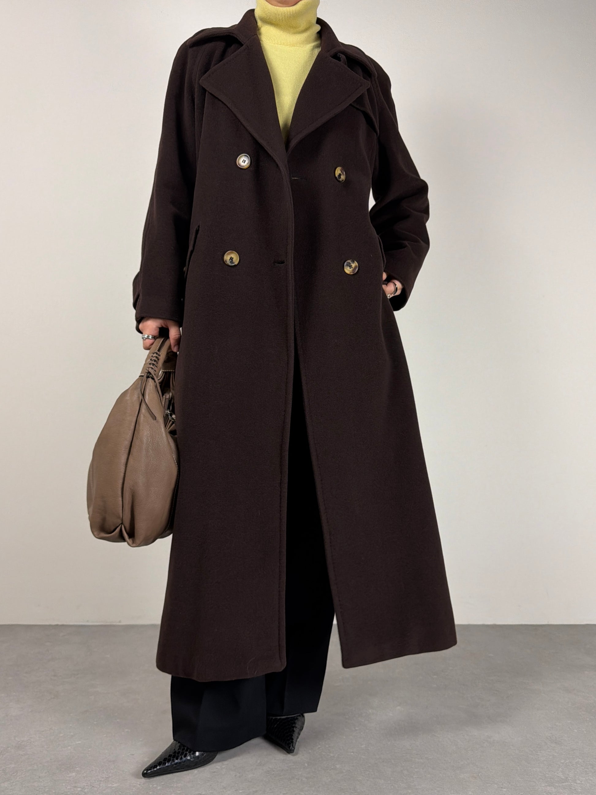 Cappotto lungo in misto lana e angora color cioccolato fondente, doppiopetto con cintura in vita e costruzione raglan che accompagna la spalla.