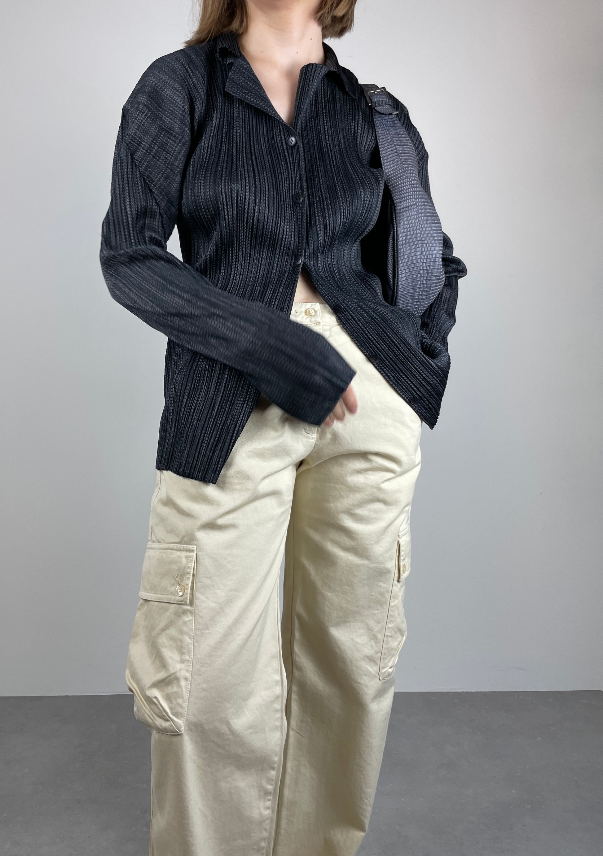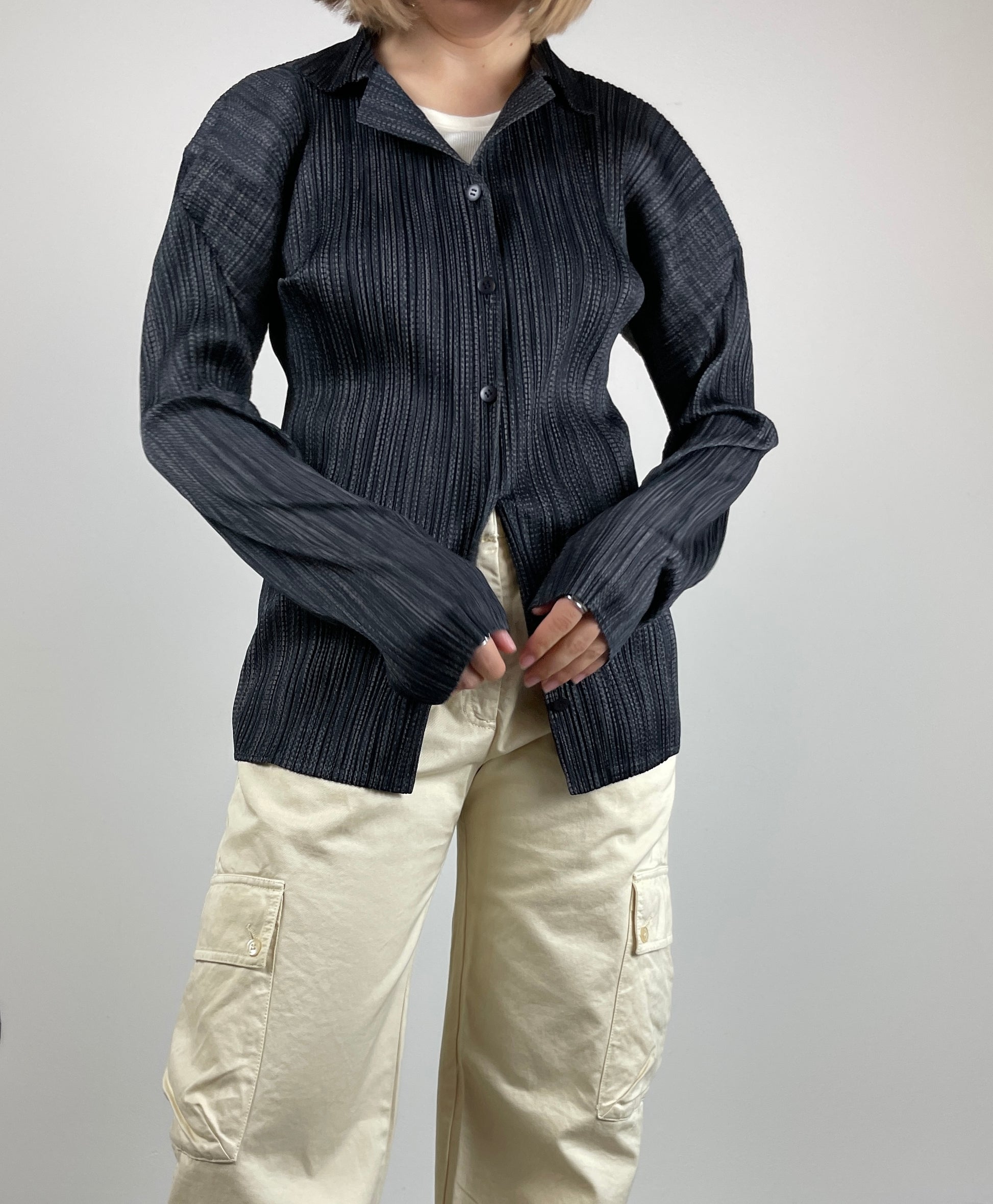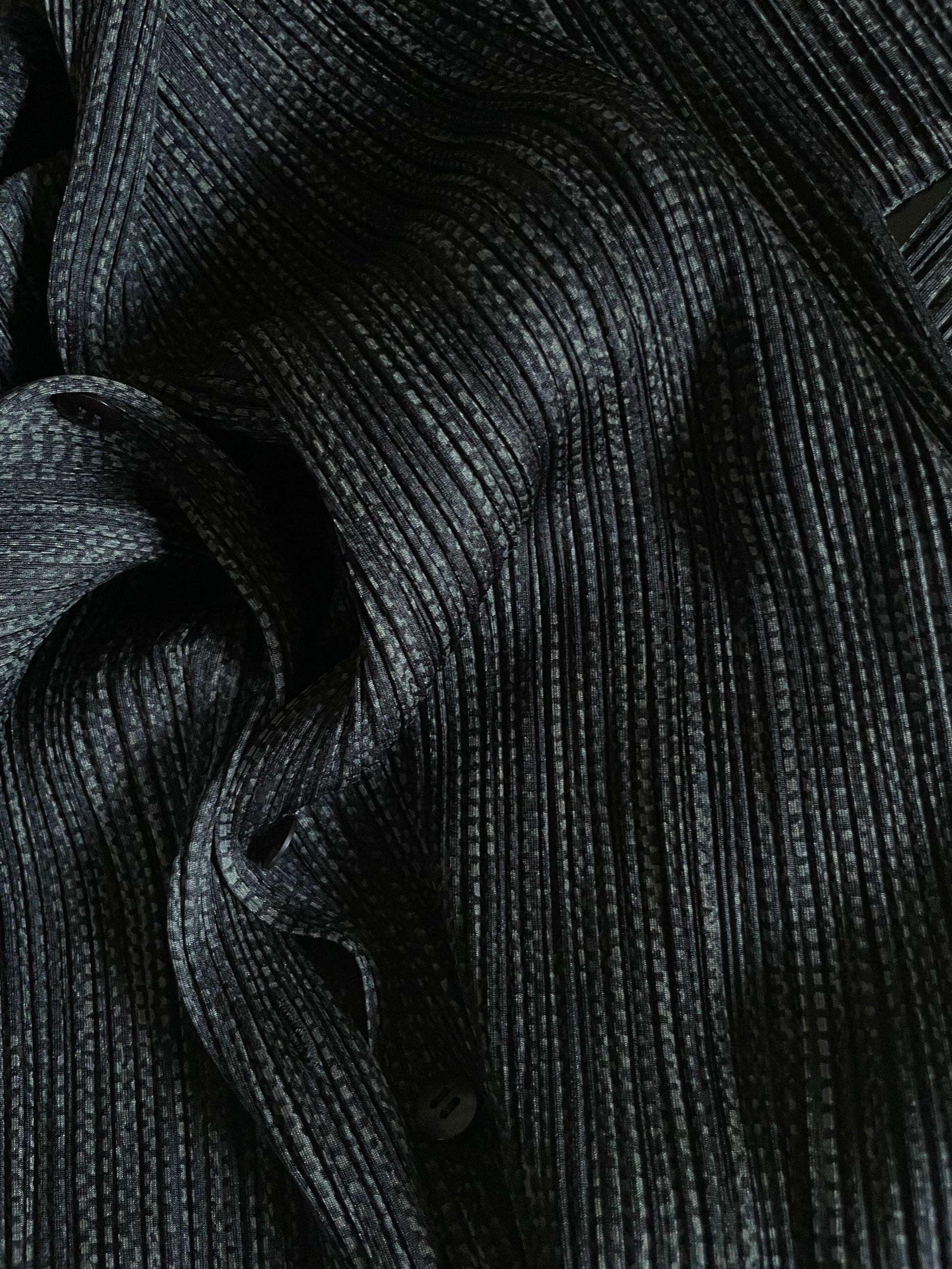 Cardigan Pleats Please by Issey Miyake in un tessuto plissettato a fantasia dalle sfumature del grigio.