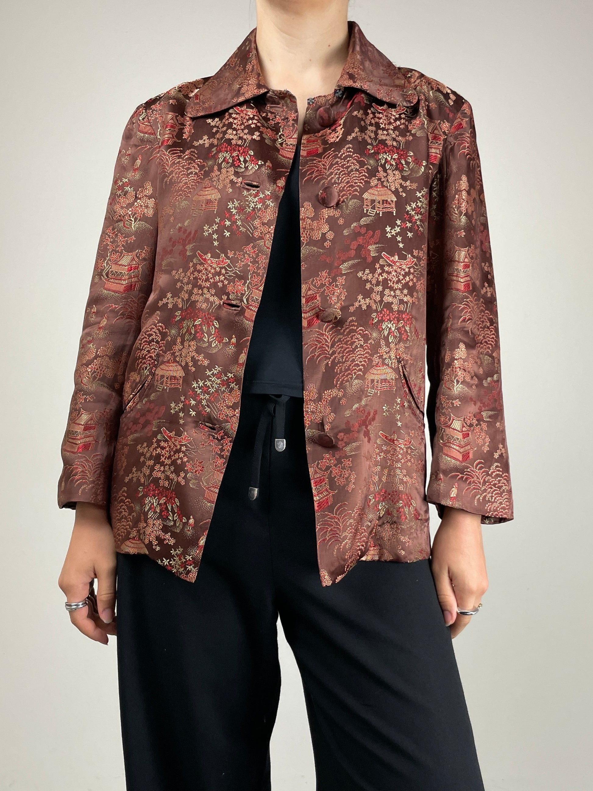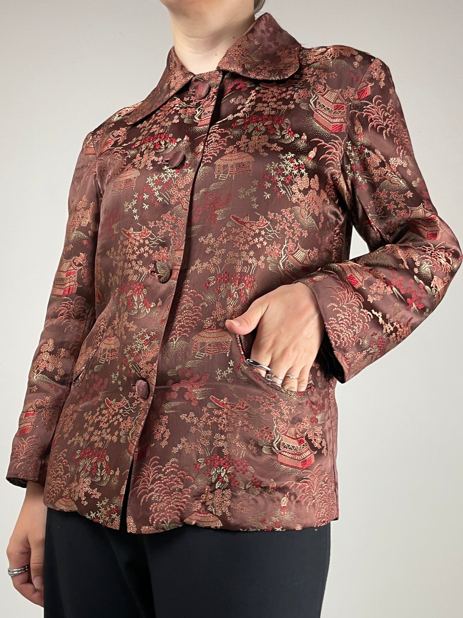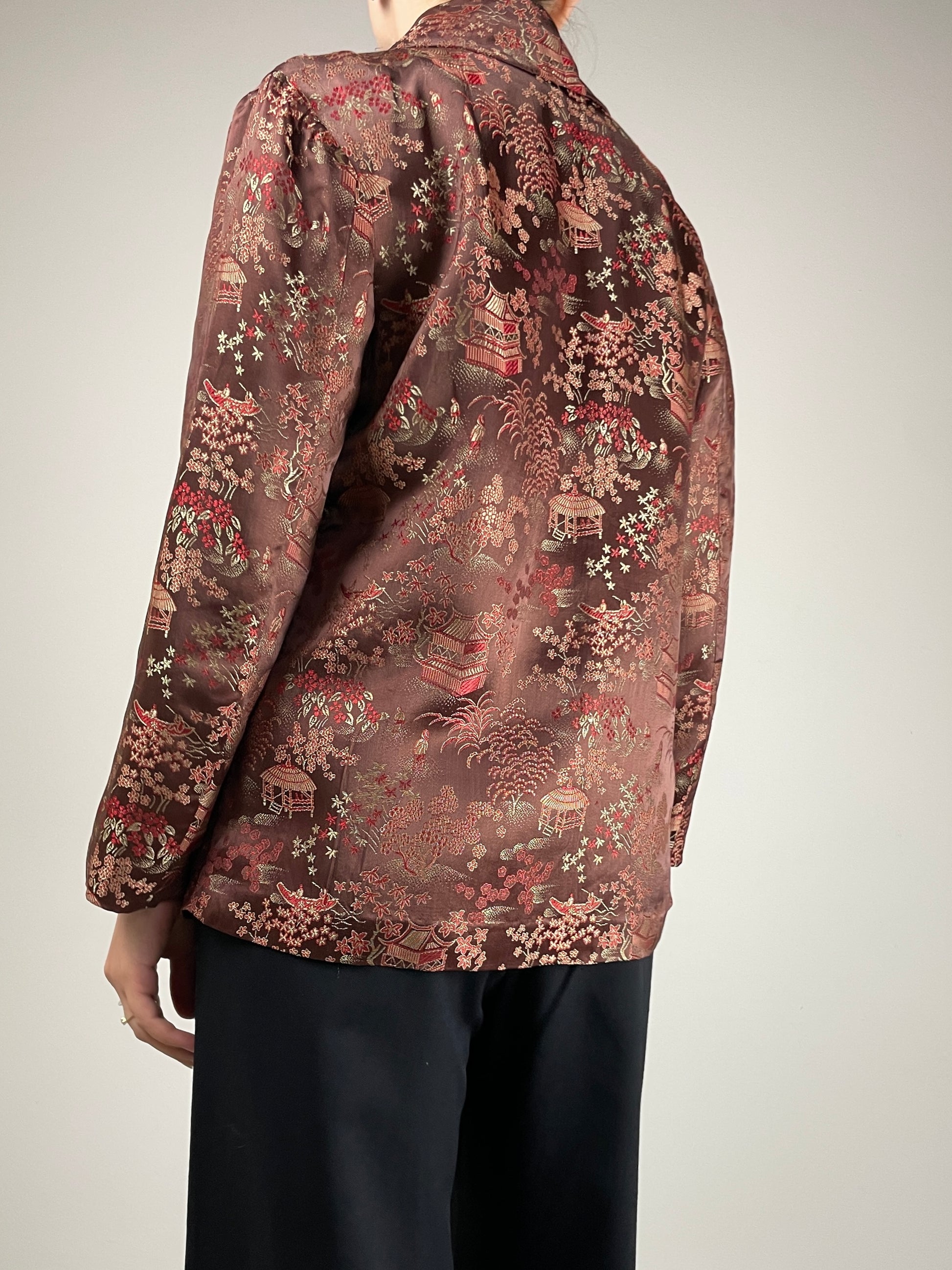 Giacca sartoriale acquistata in Cina, in jacquard misto seta e viscosa con una bellissima fantasia che ritrae scene paesaggistiche orientali.