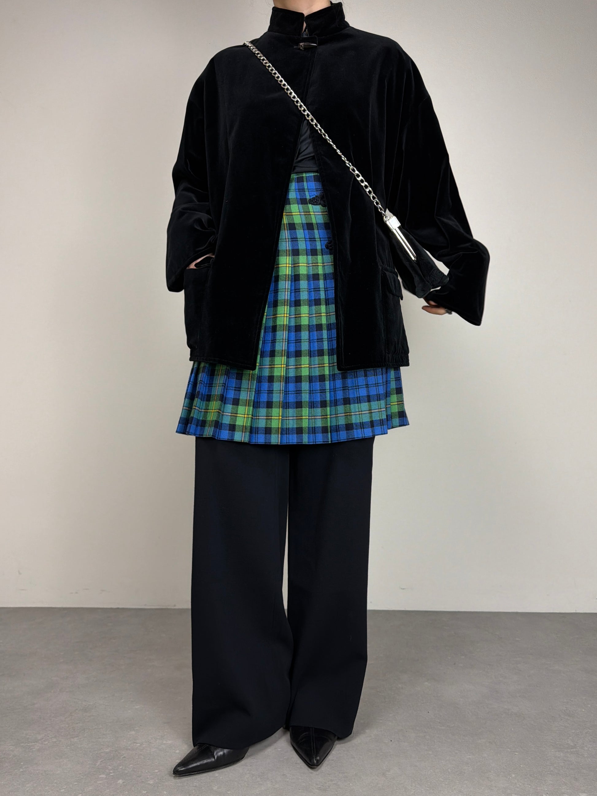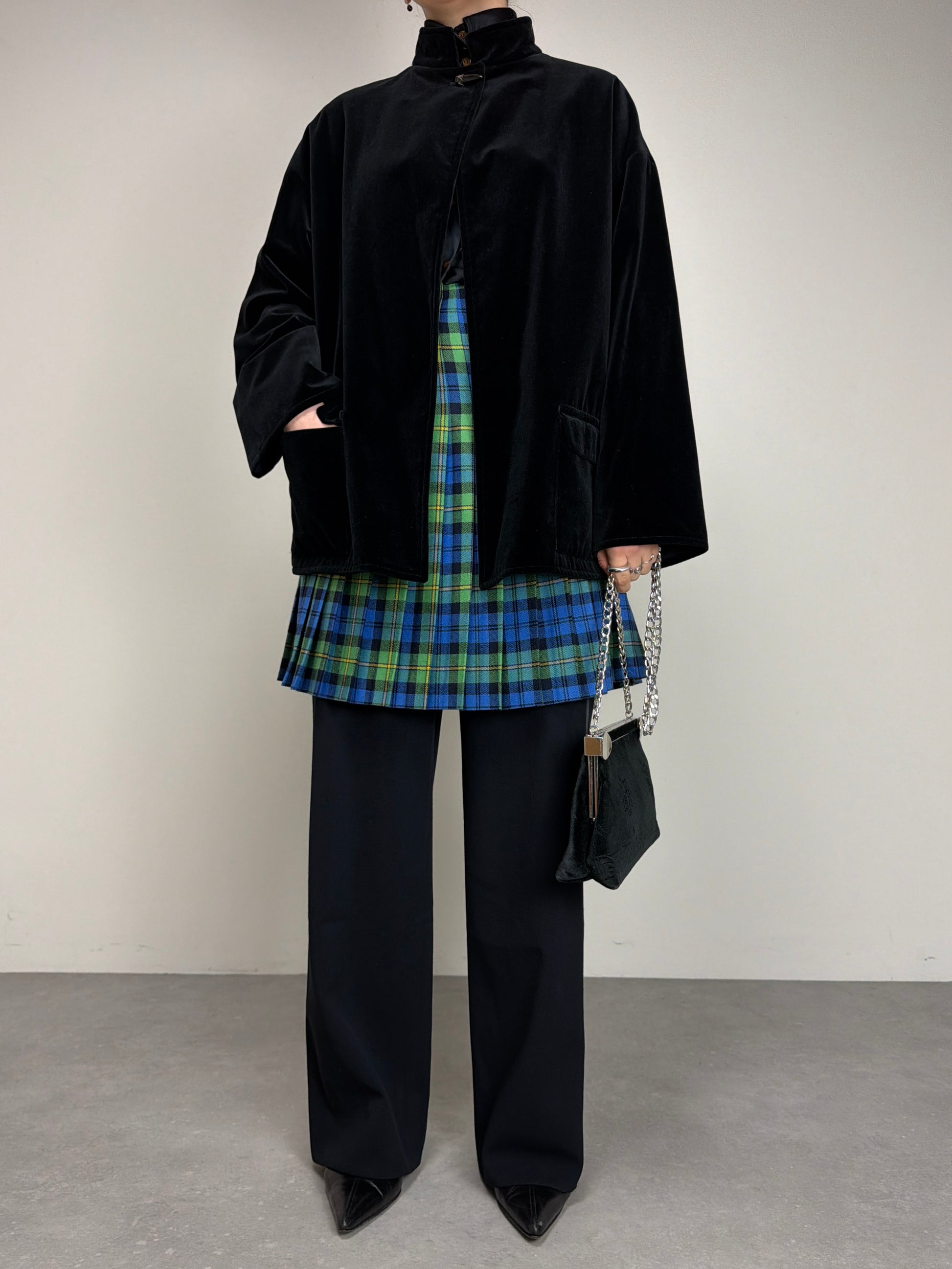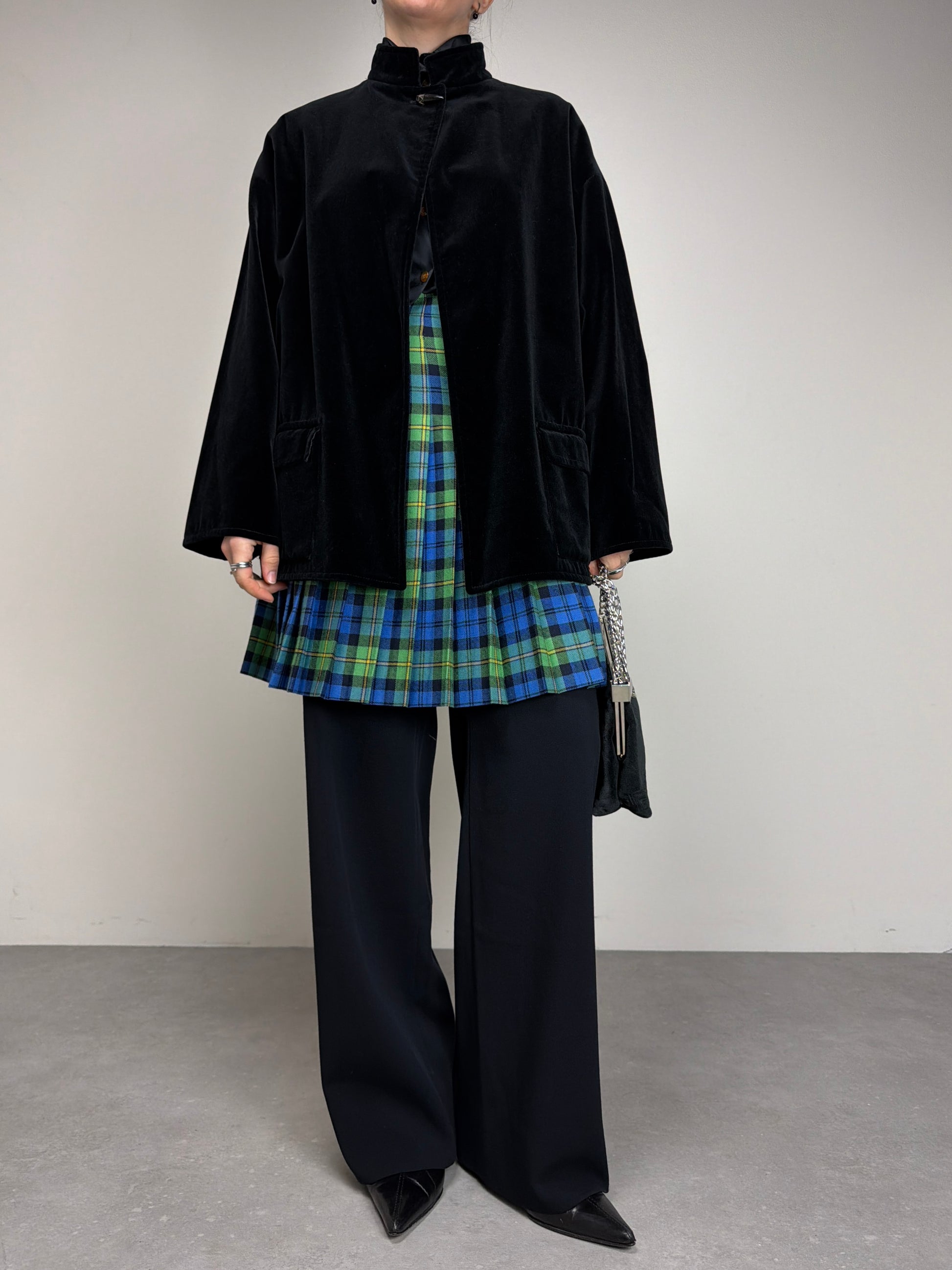 Giacca vintage in velluto di cotone nero con chiusura al collo