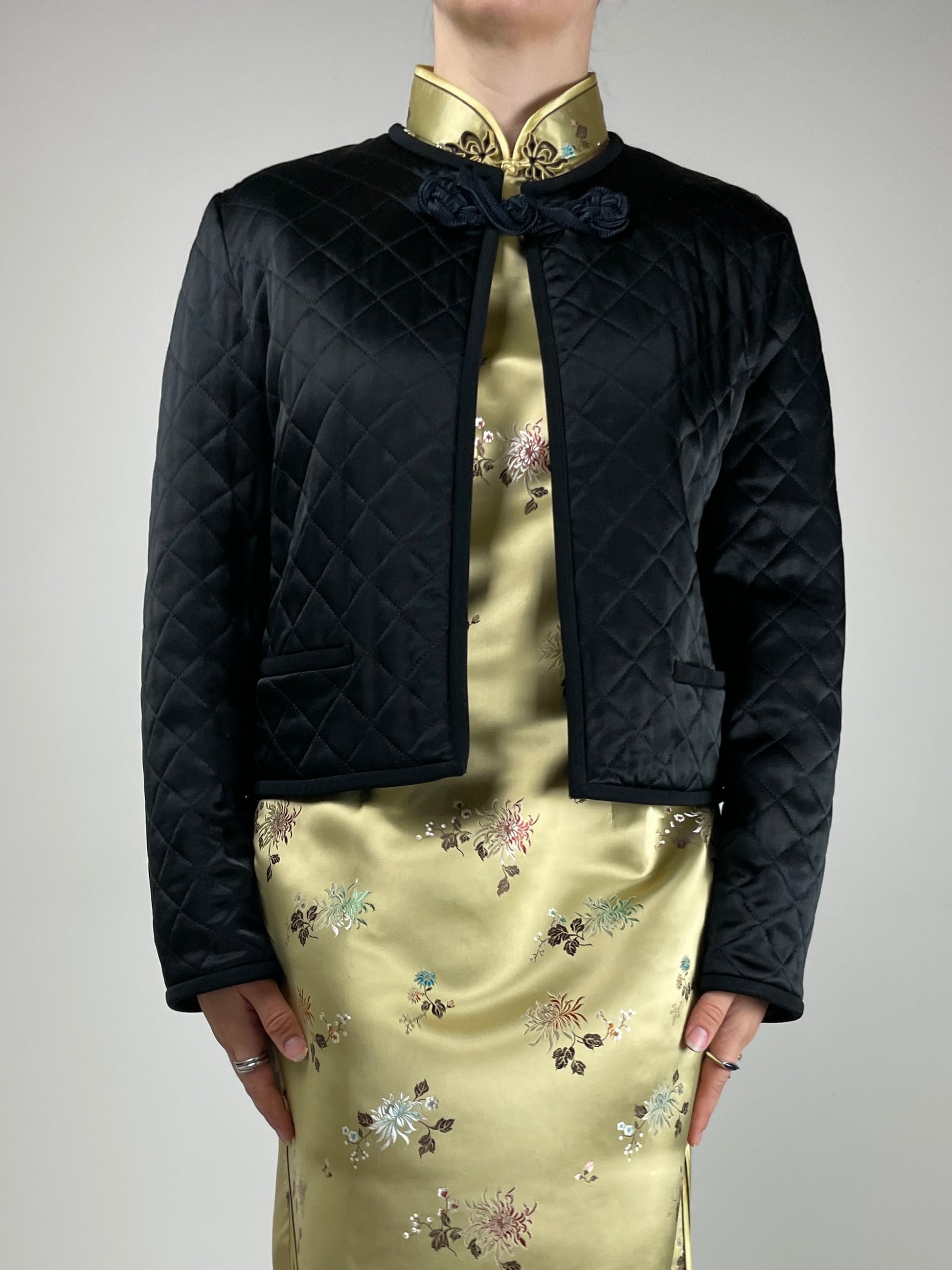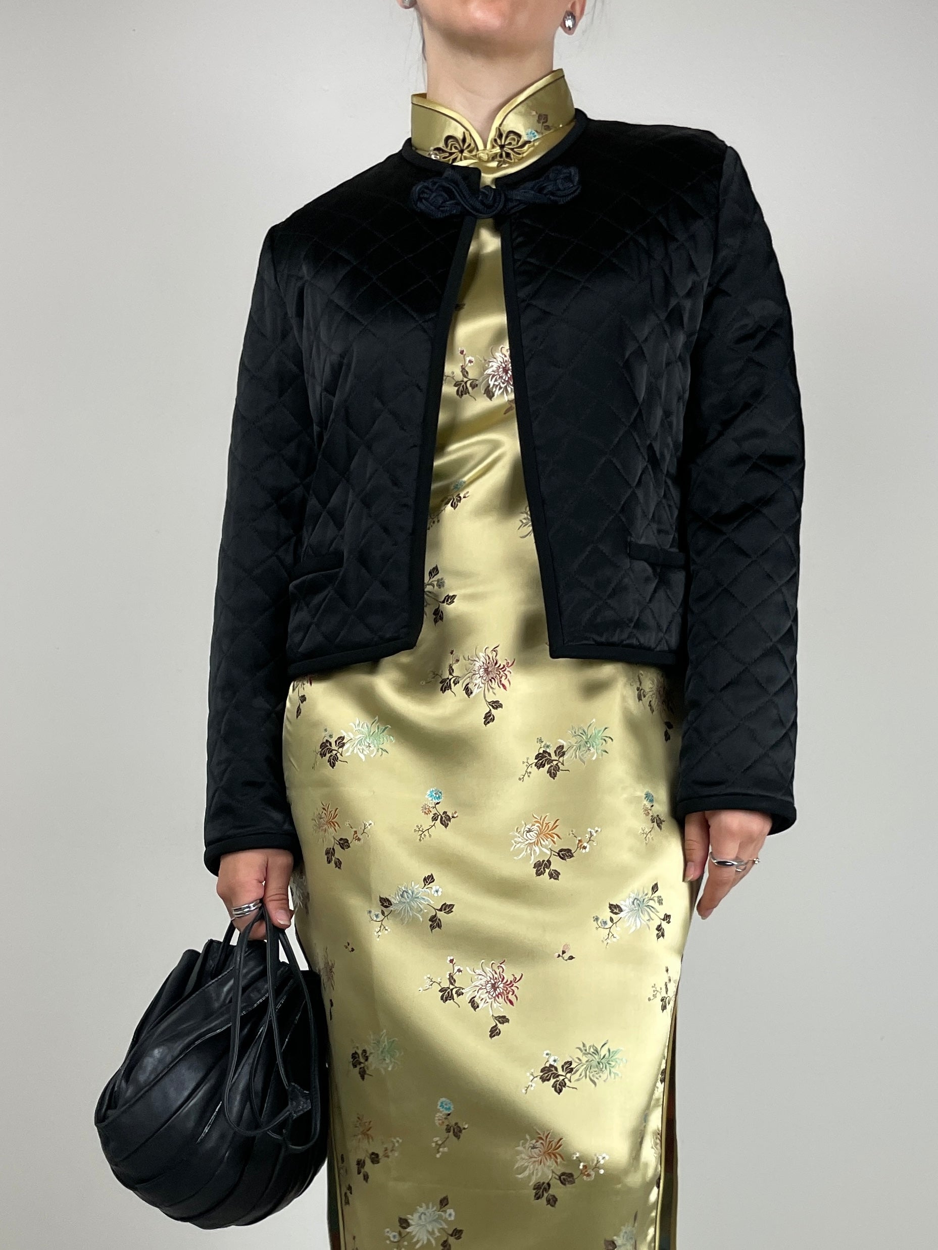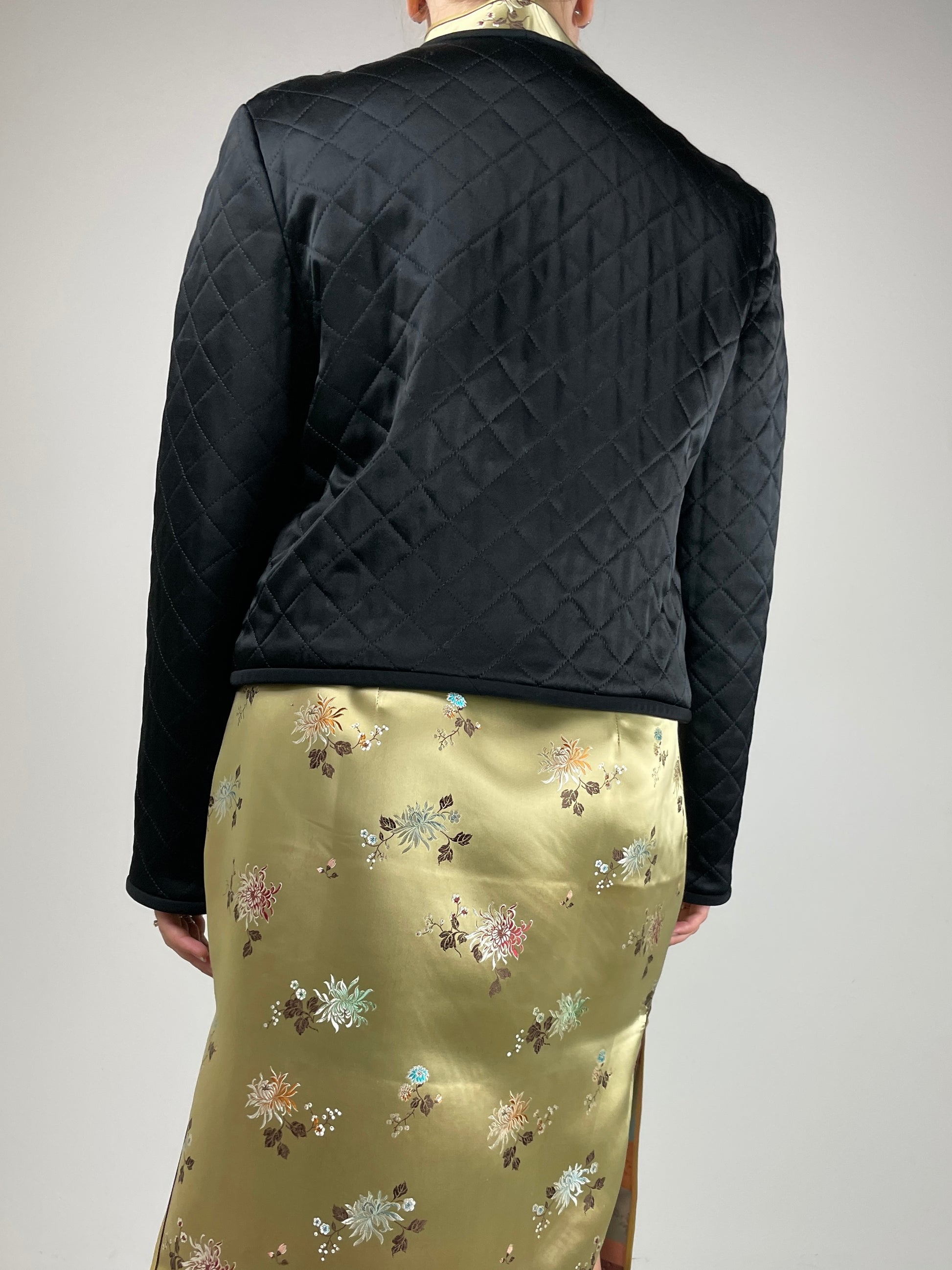 Giacchino trapuntato in raso di seta made in France, nero, con chiusura ad alamaro in tessuto.