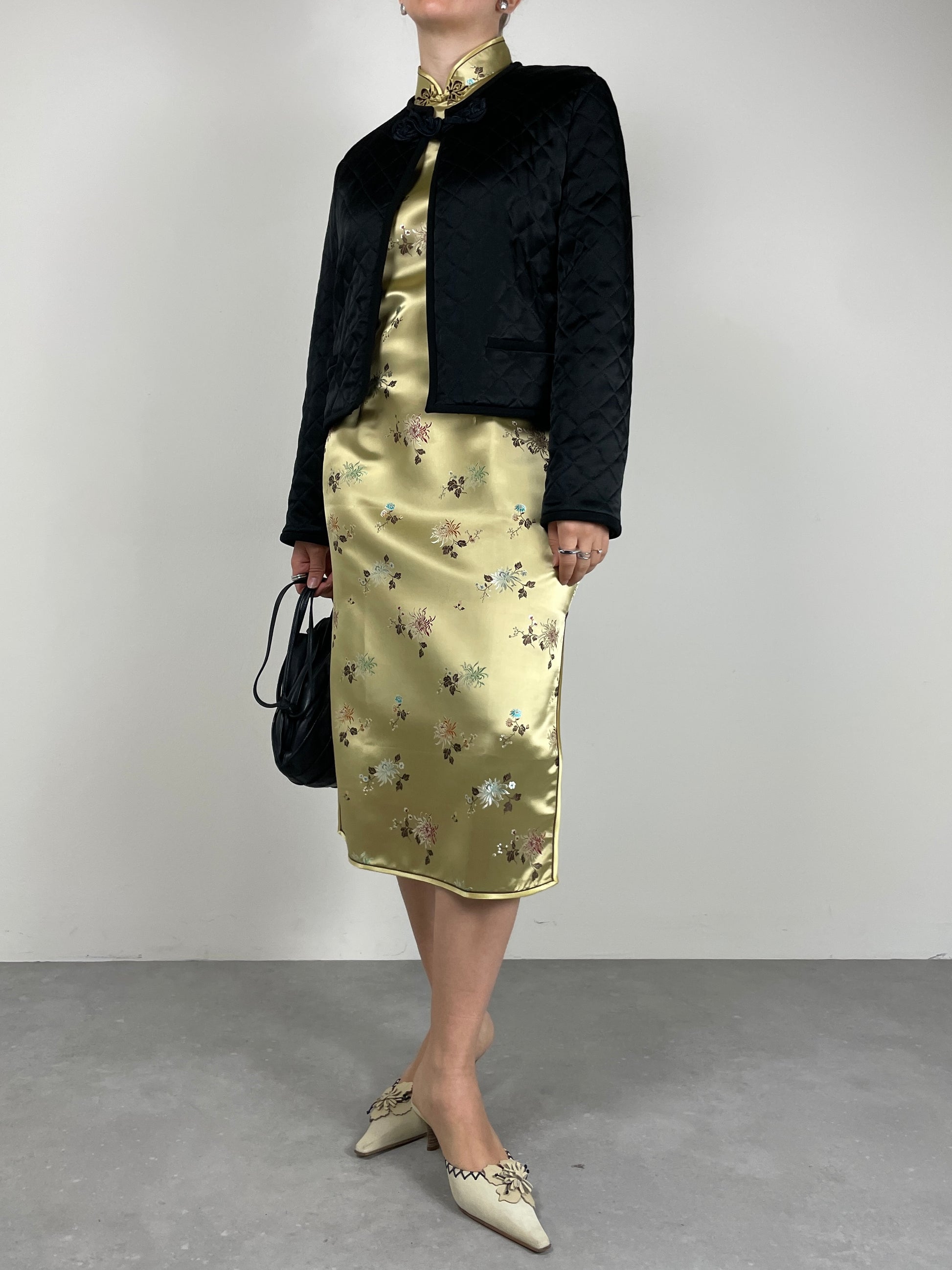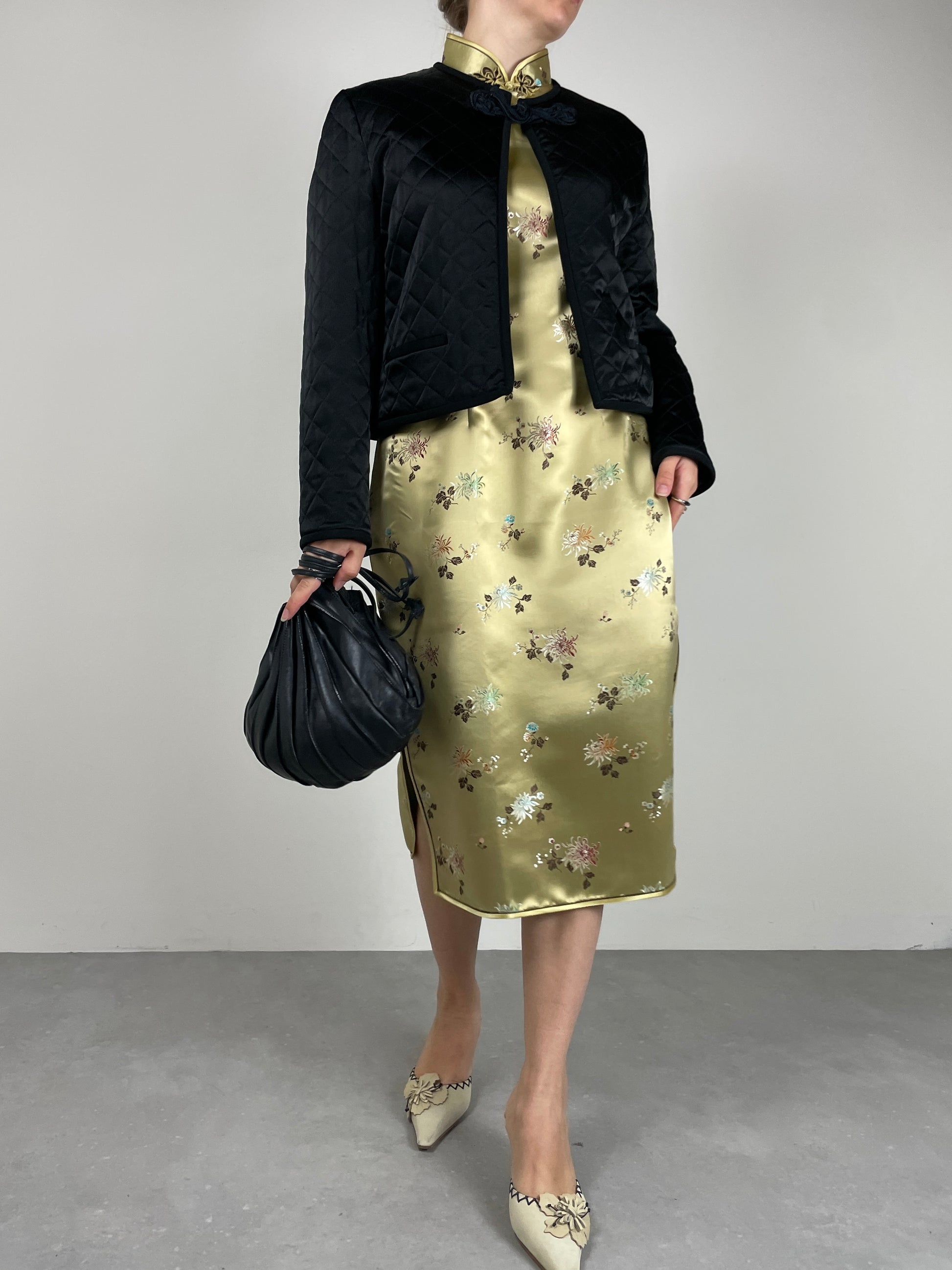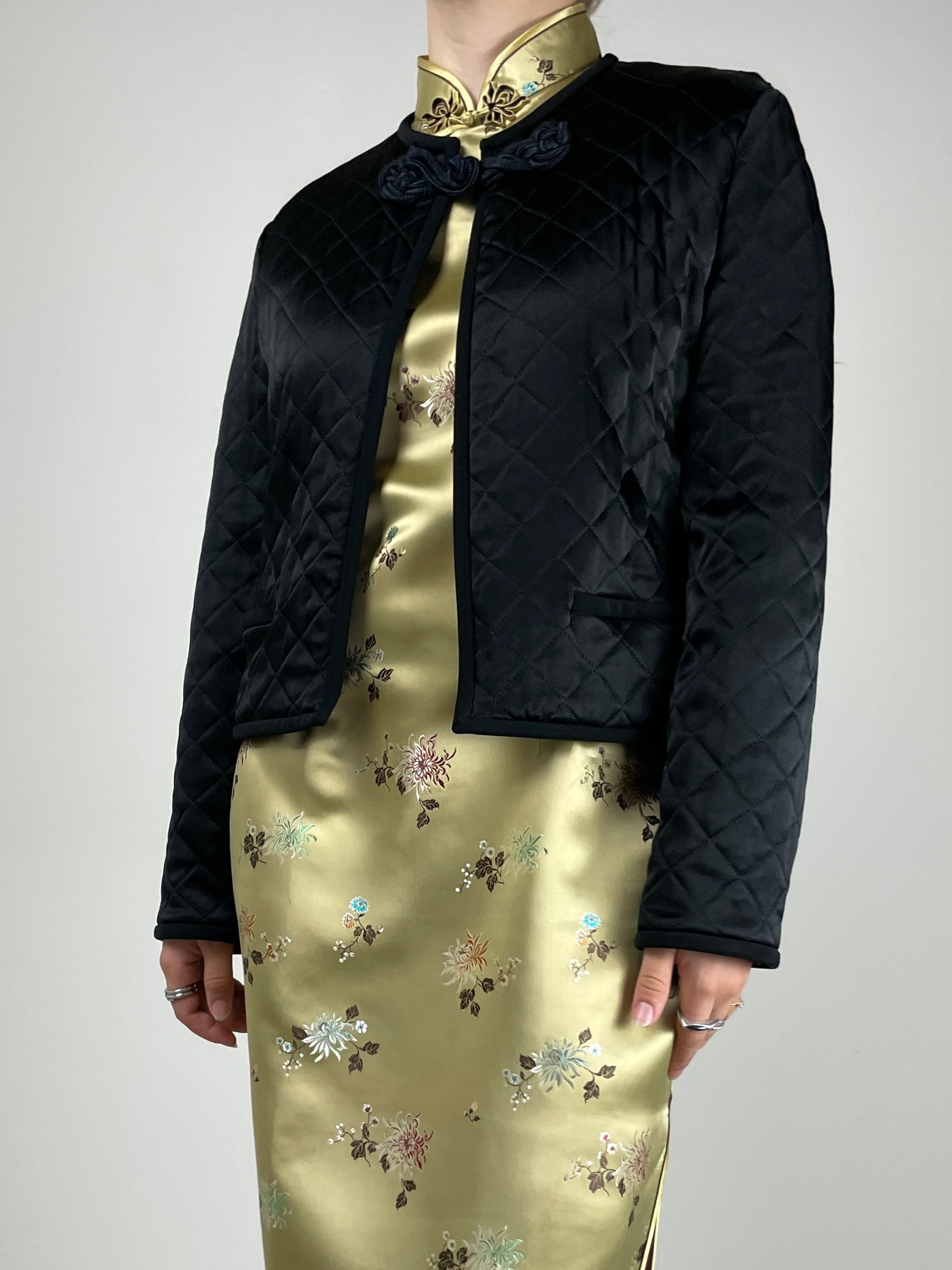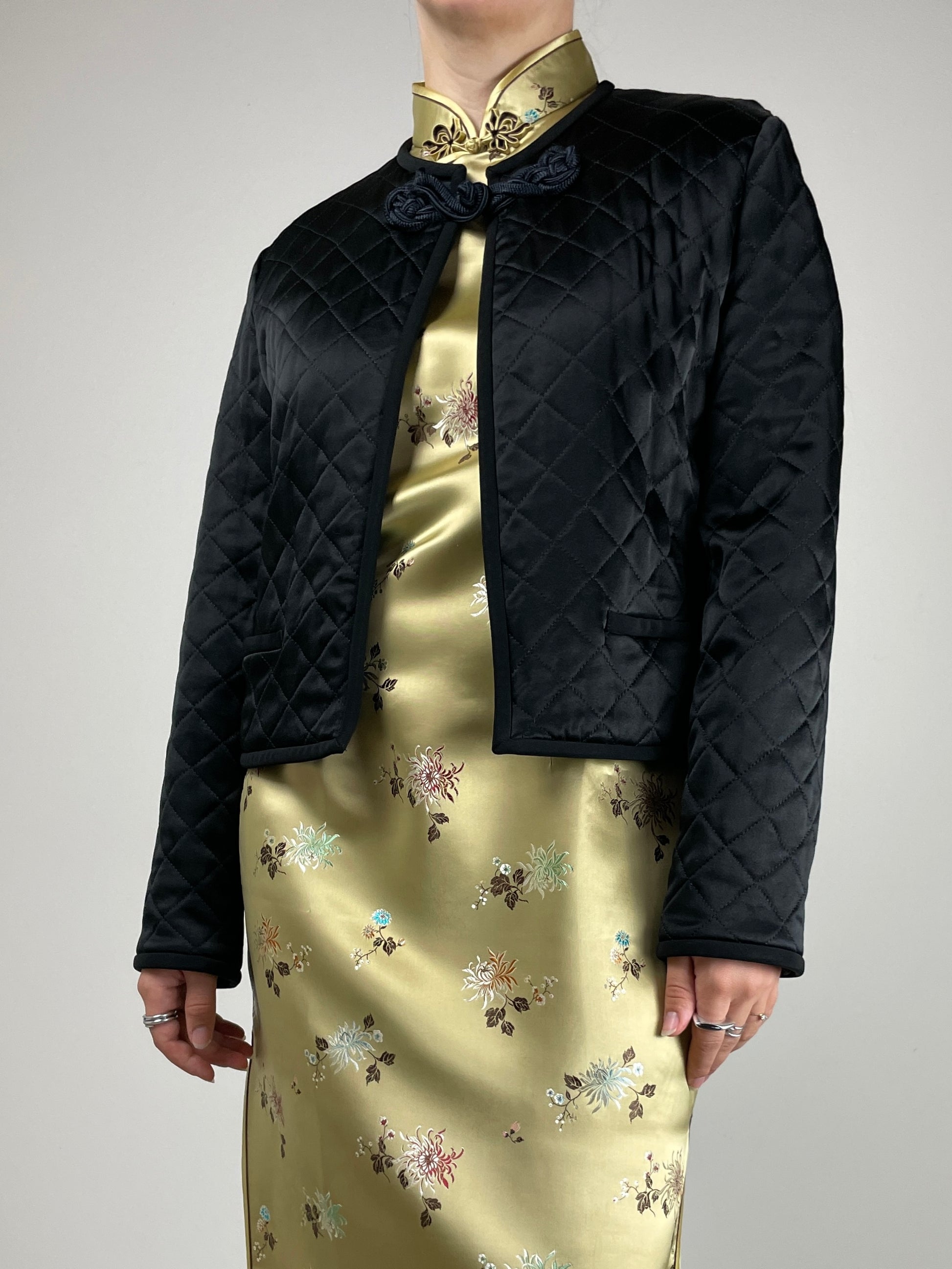 Giacchino trapuntato in raso di seta made in France, nero, con chiusura ad alamaro in tessuto.