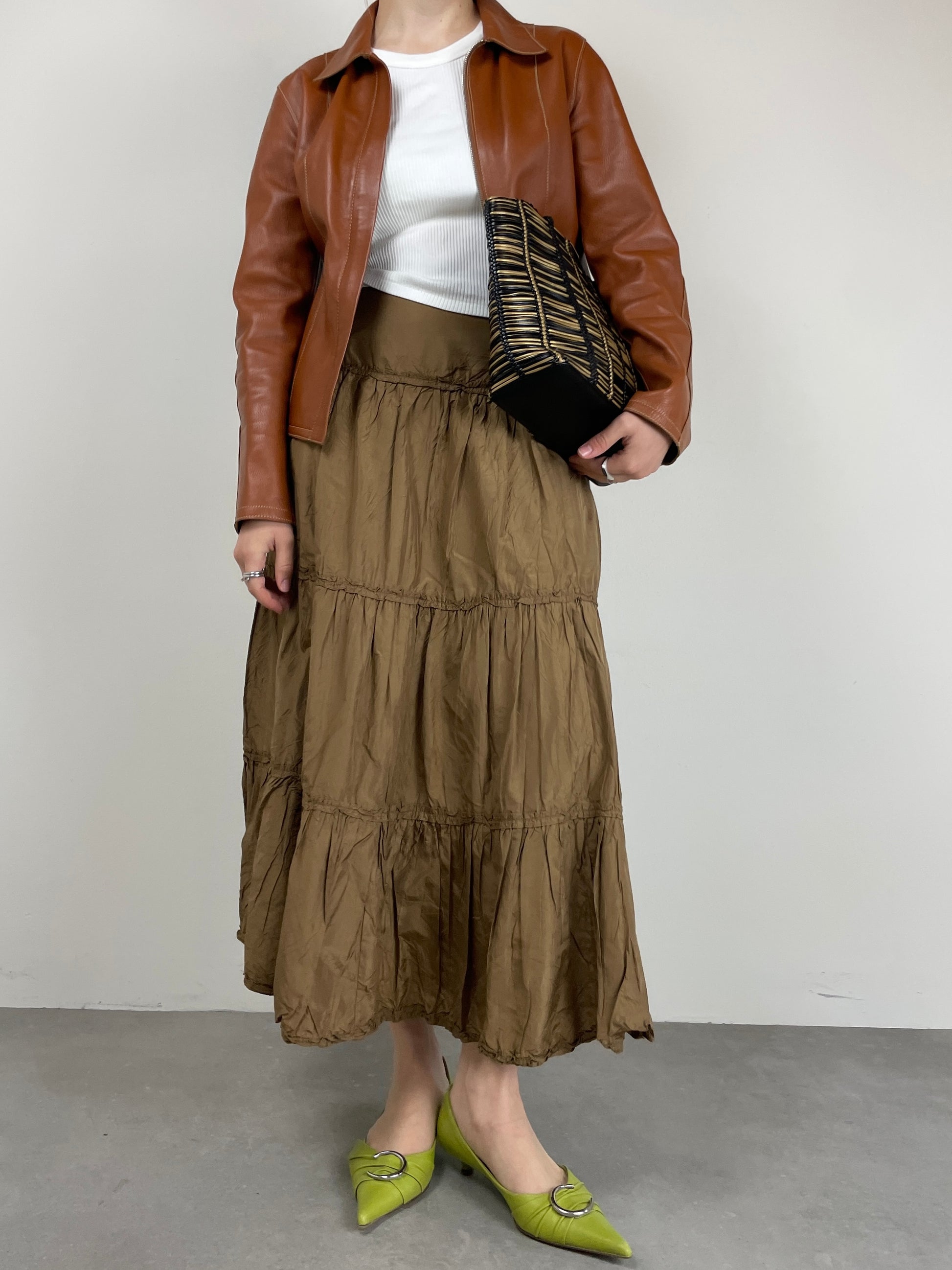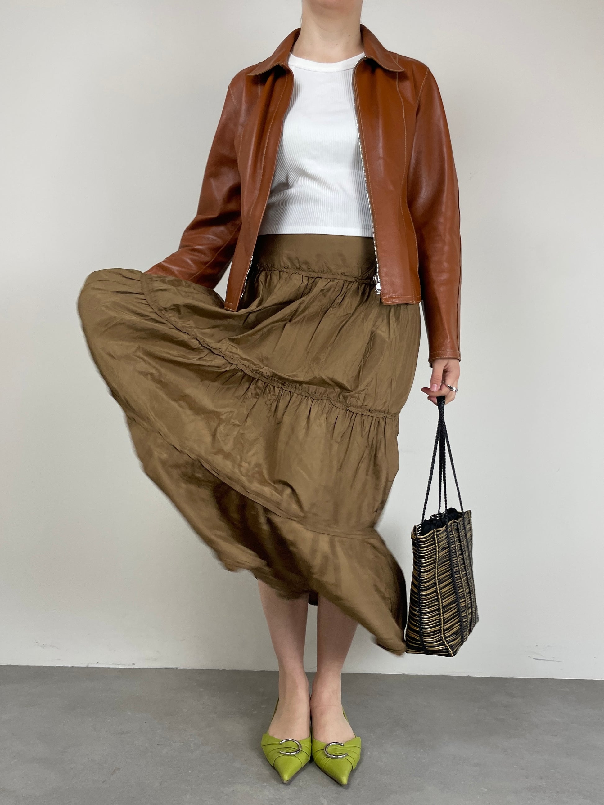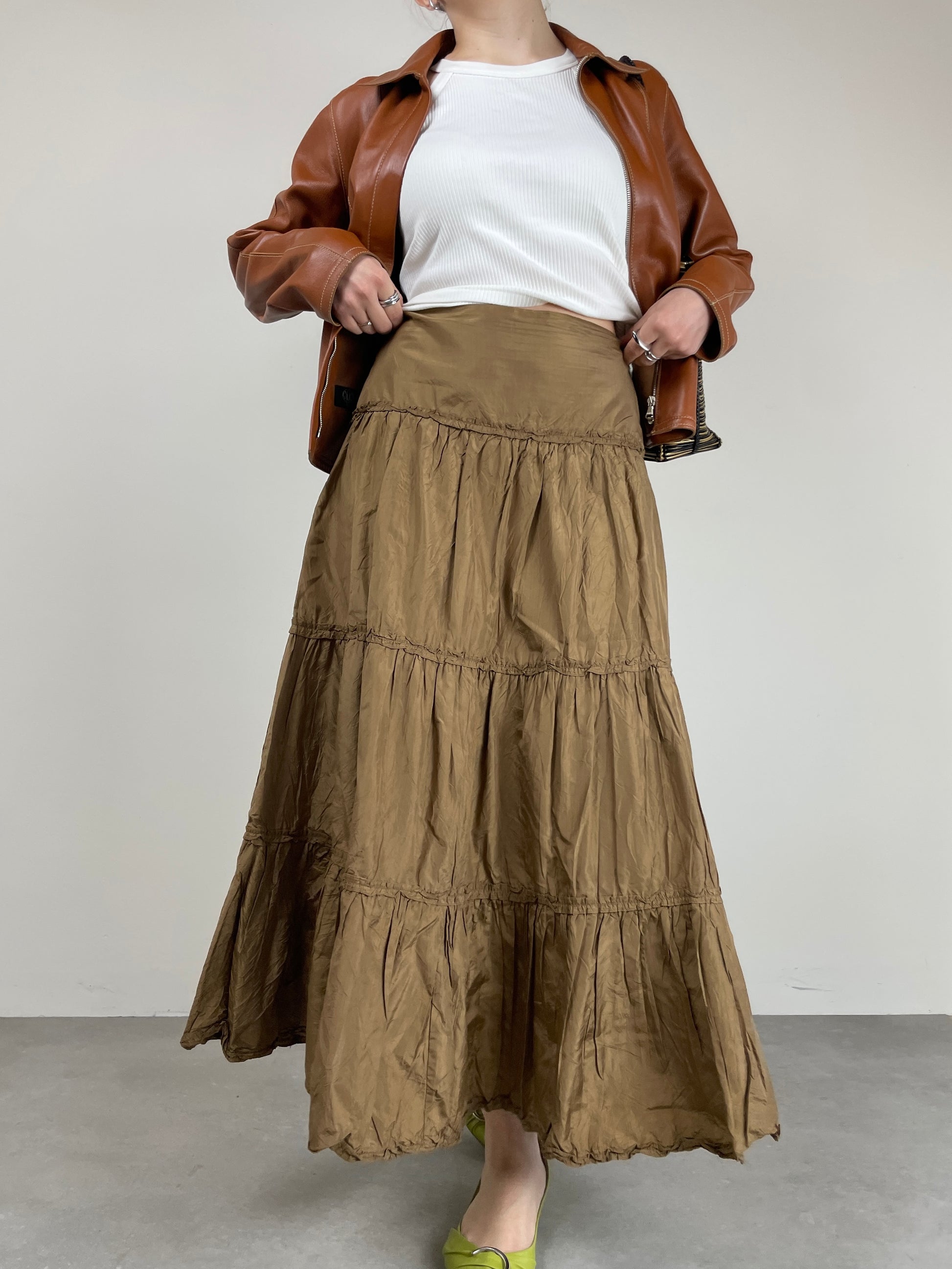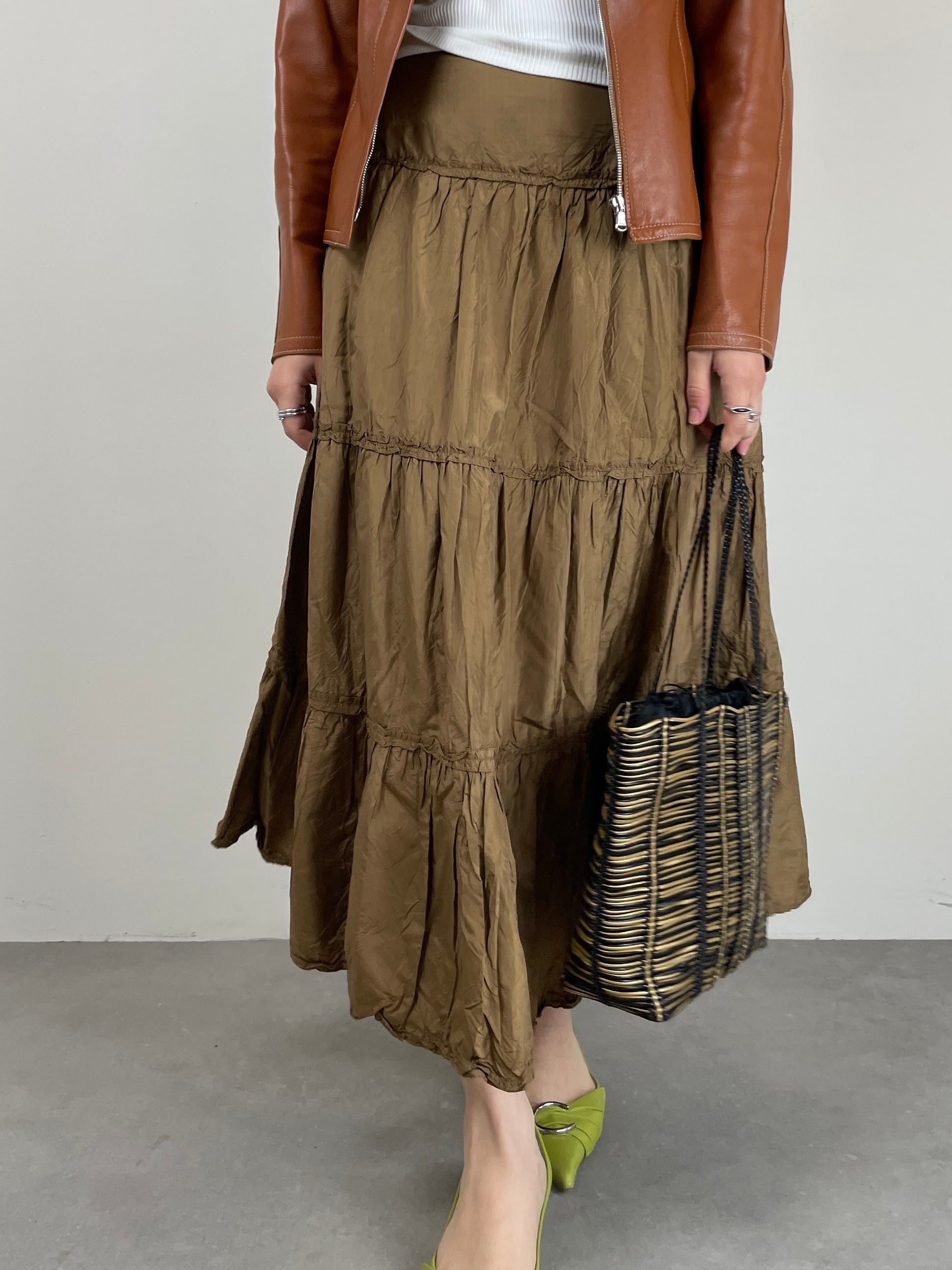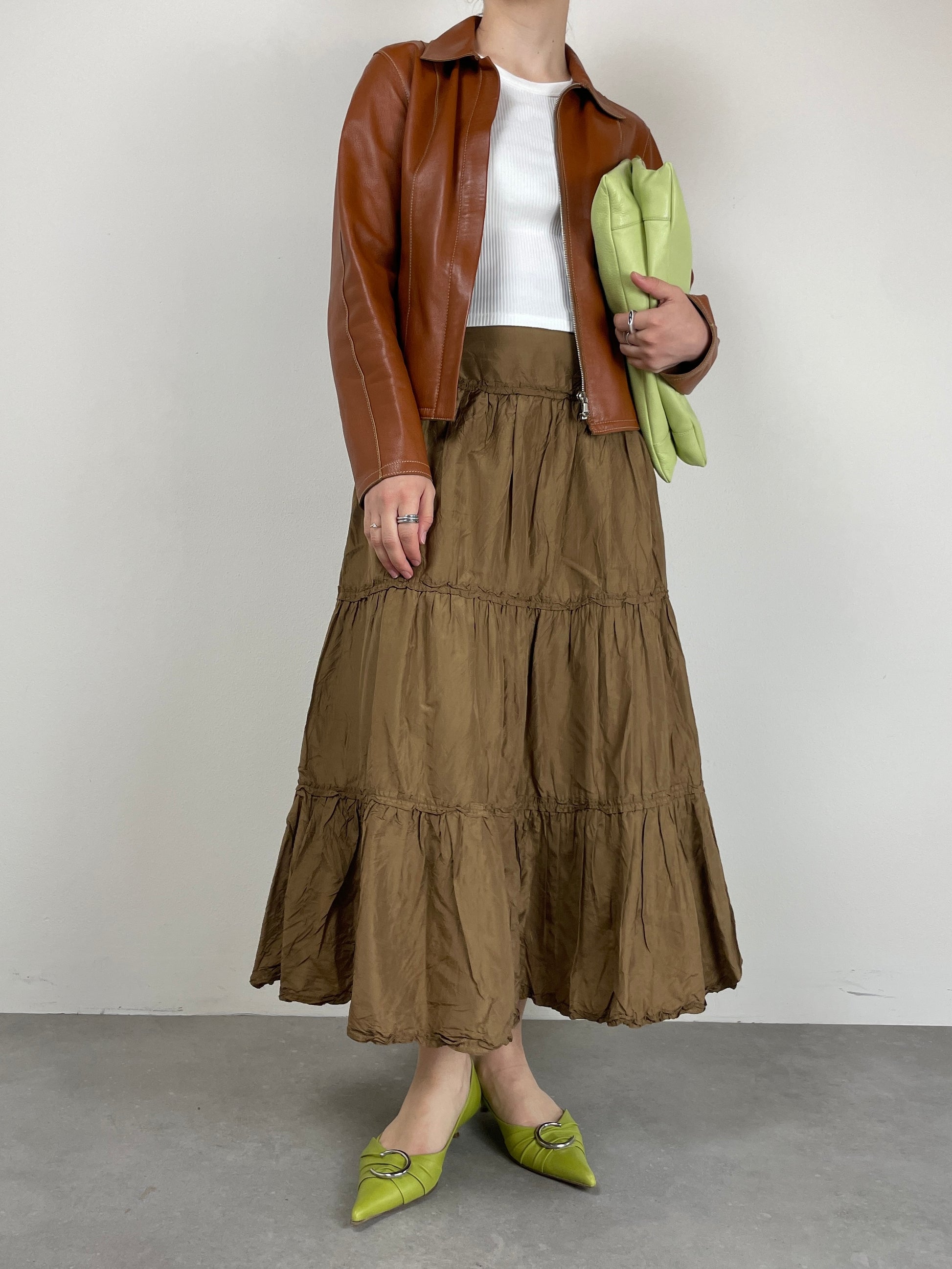 Gonna in pura seta crinkle made in Italy, dal taglio ampio e leggero, con costruzione a balze arricciate e texture cangiante.