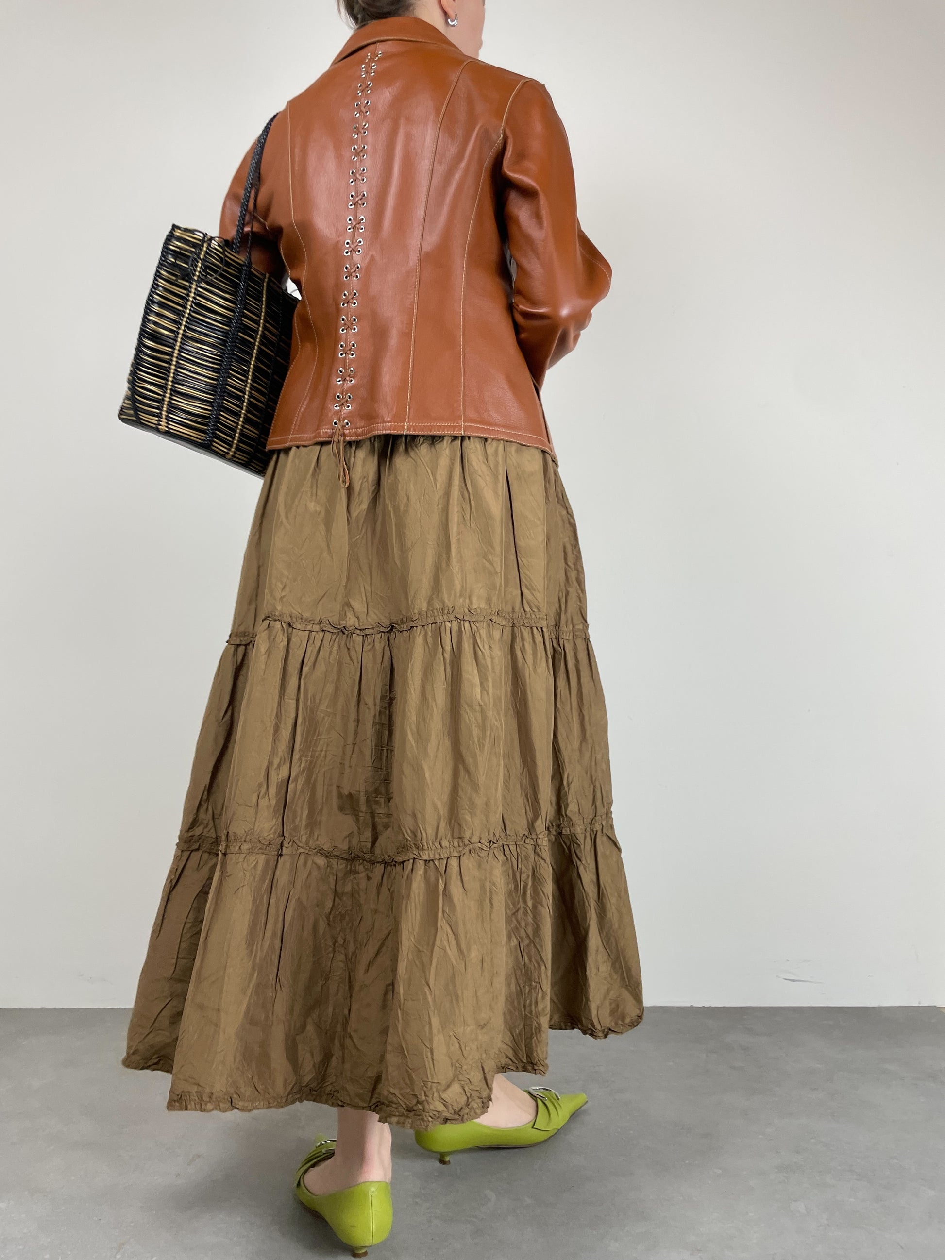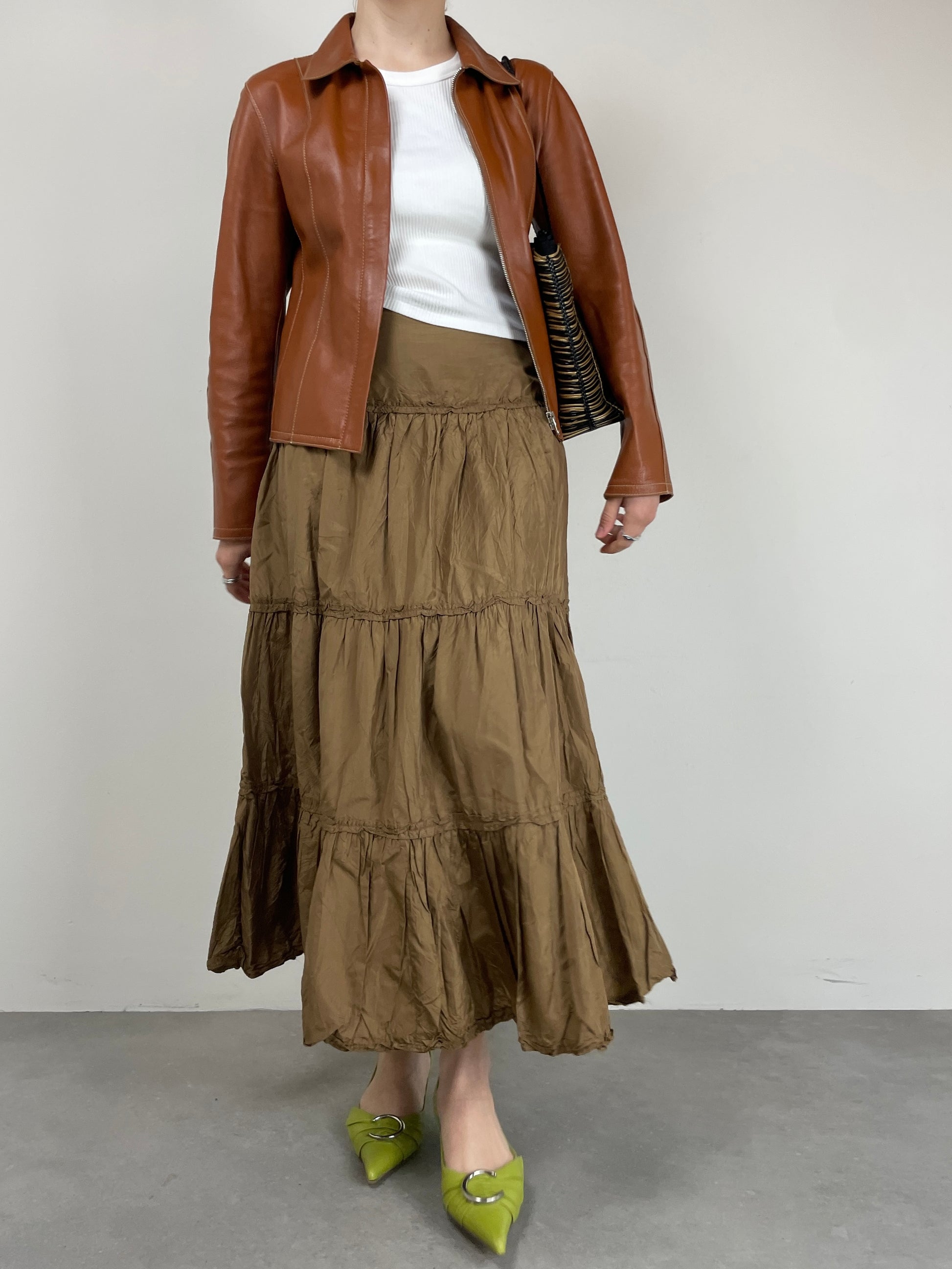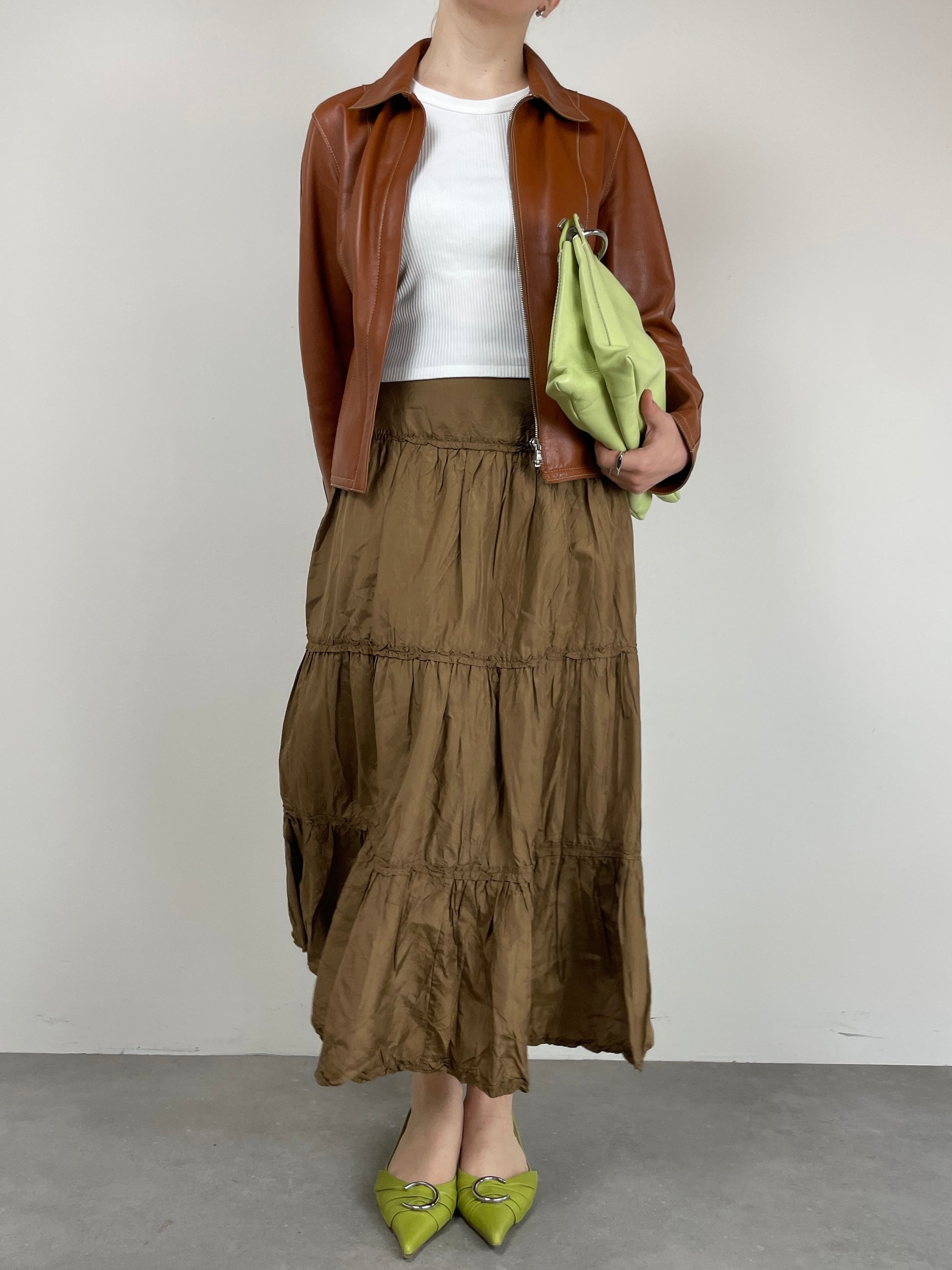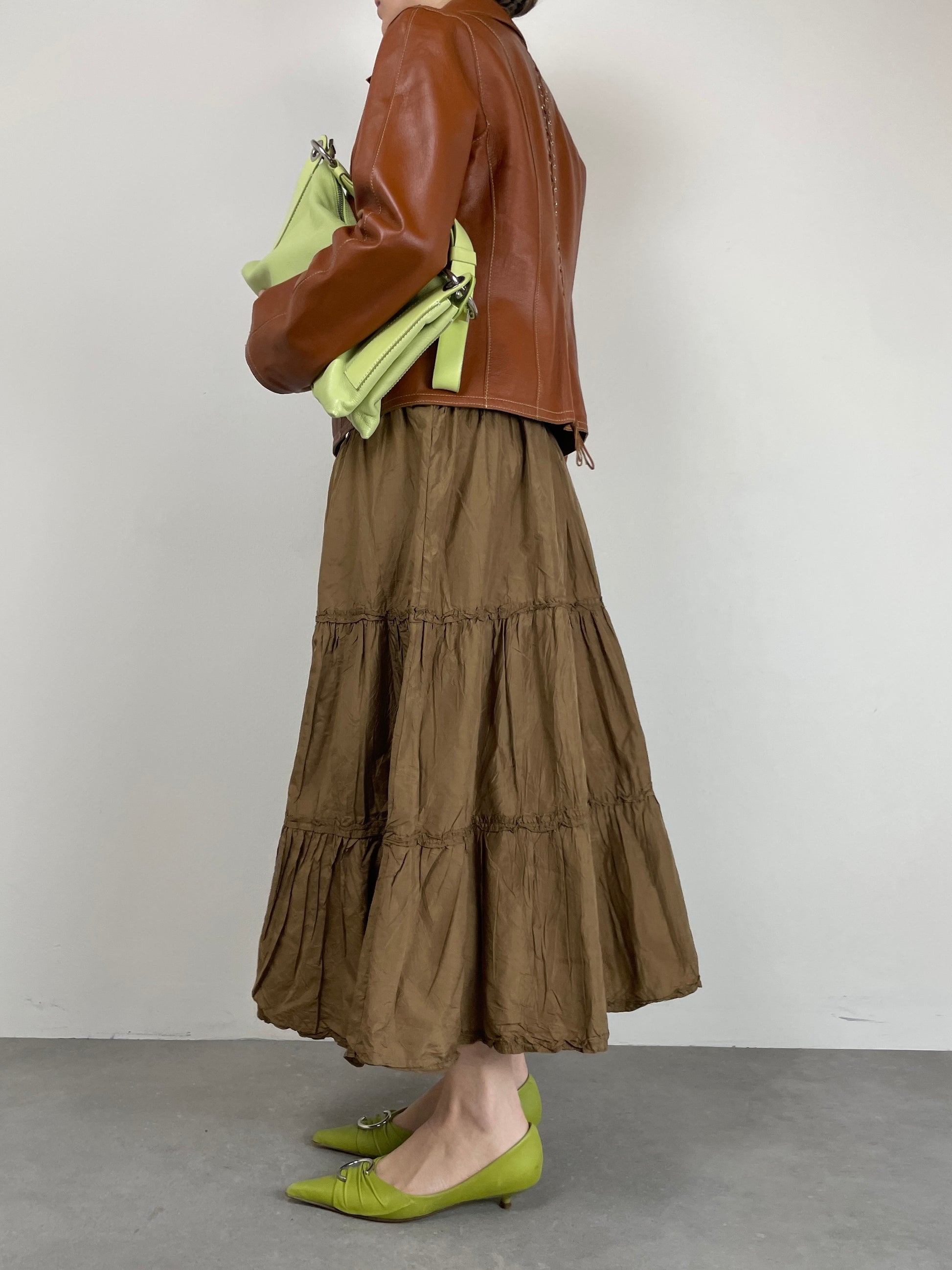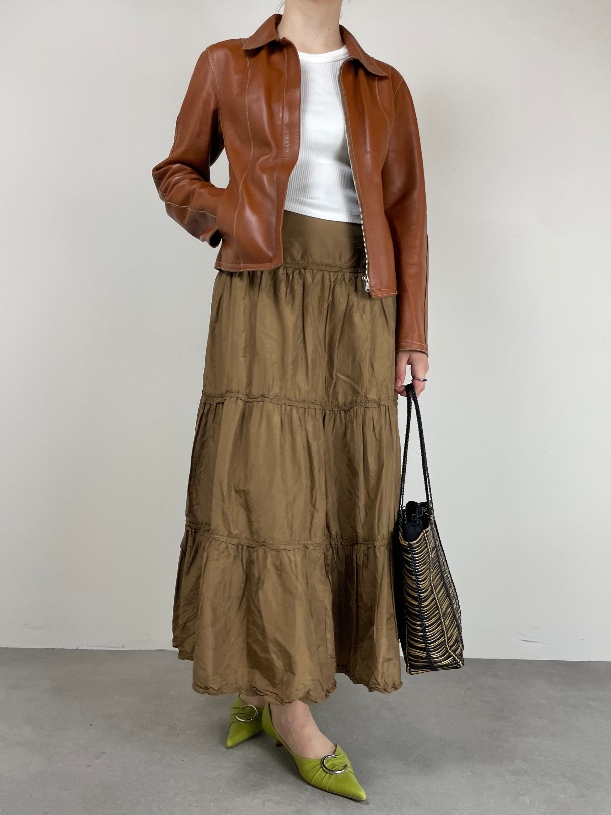 Gonna in pura seta crinkle made in Italy, dal taglio ampio e leggero, con costruzione a balze arricciate e texture cangiante.