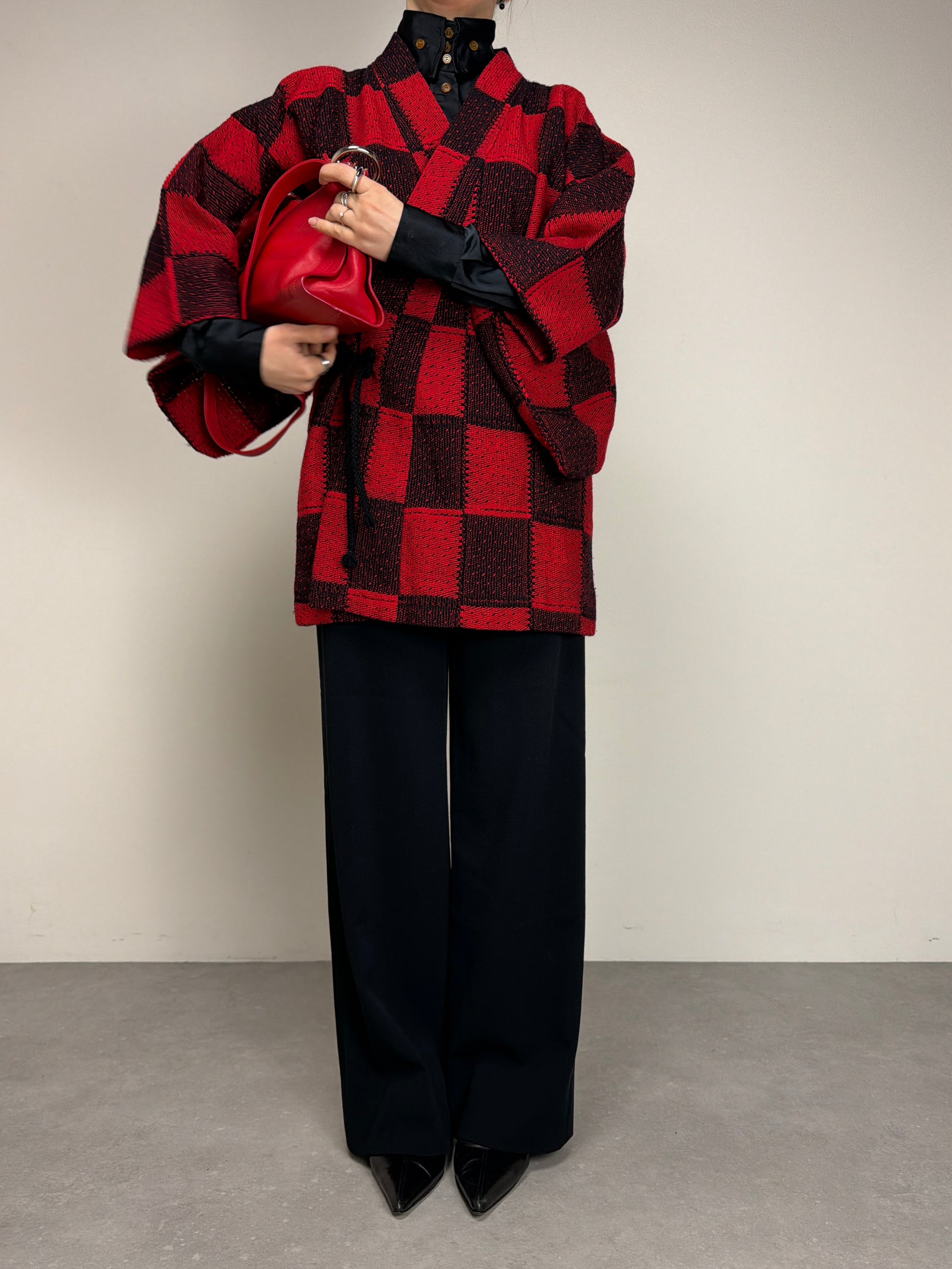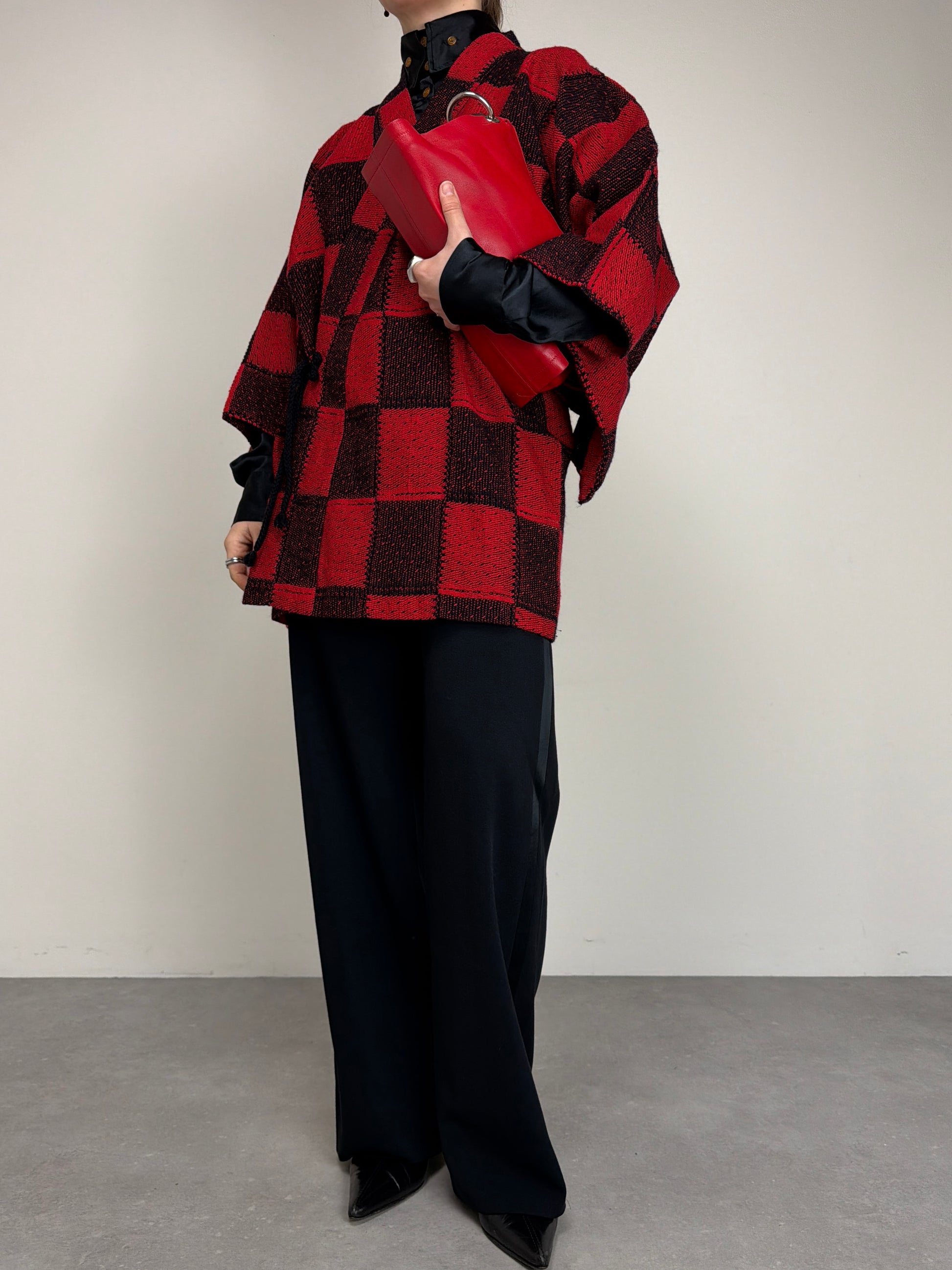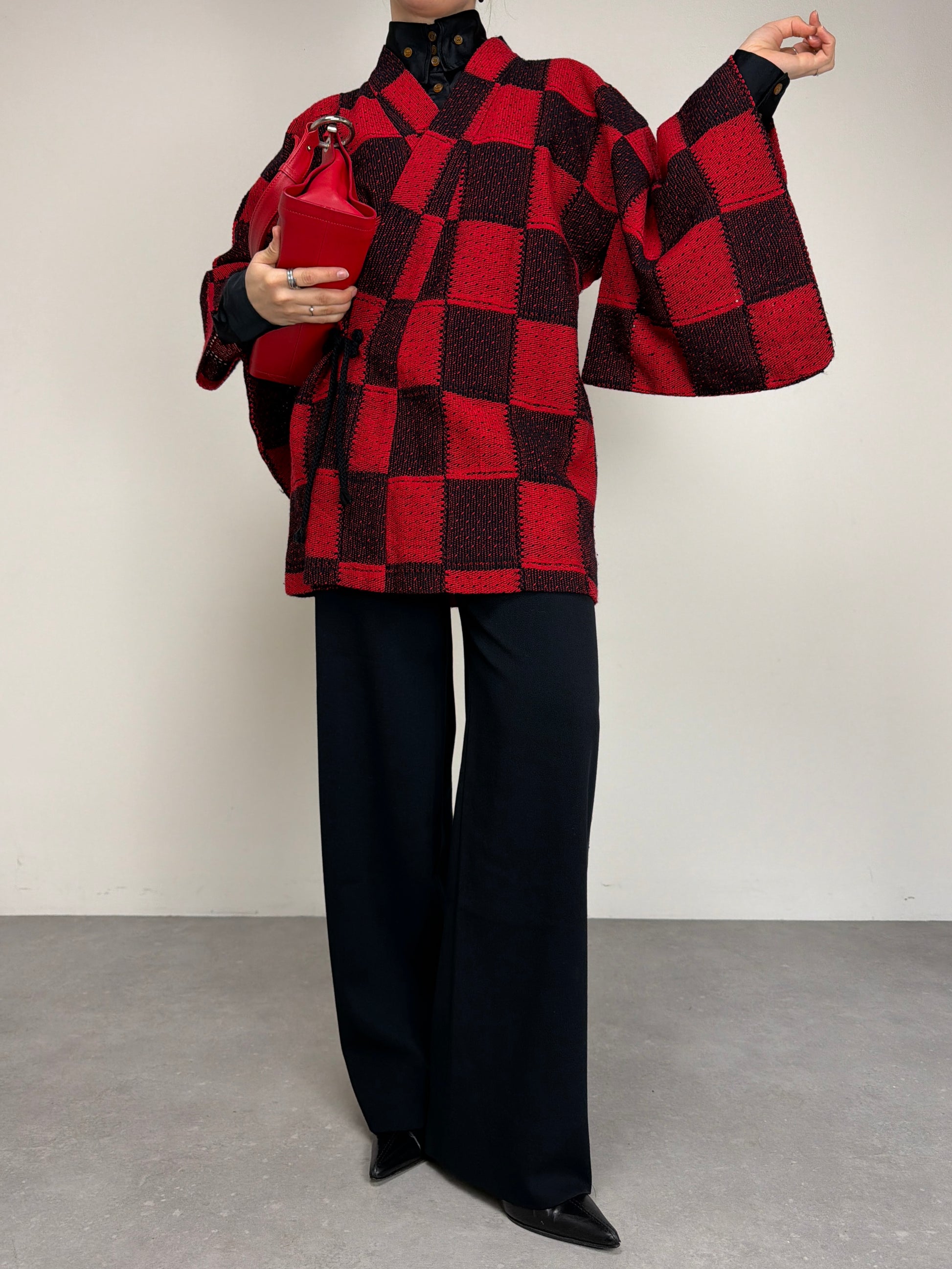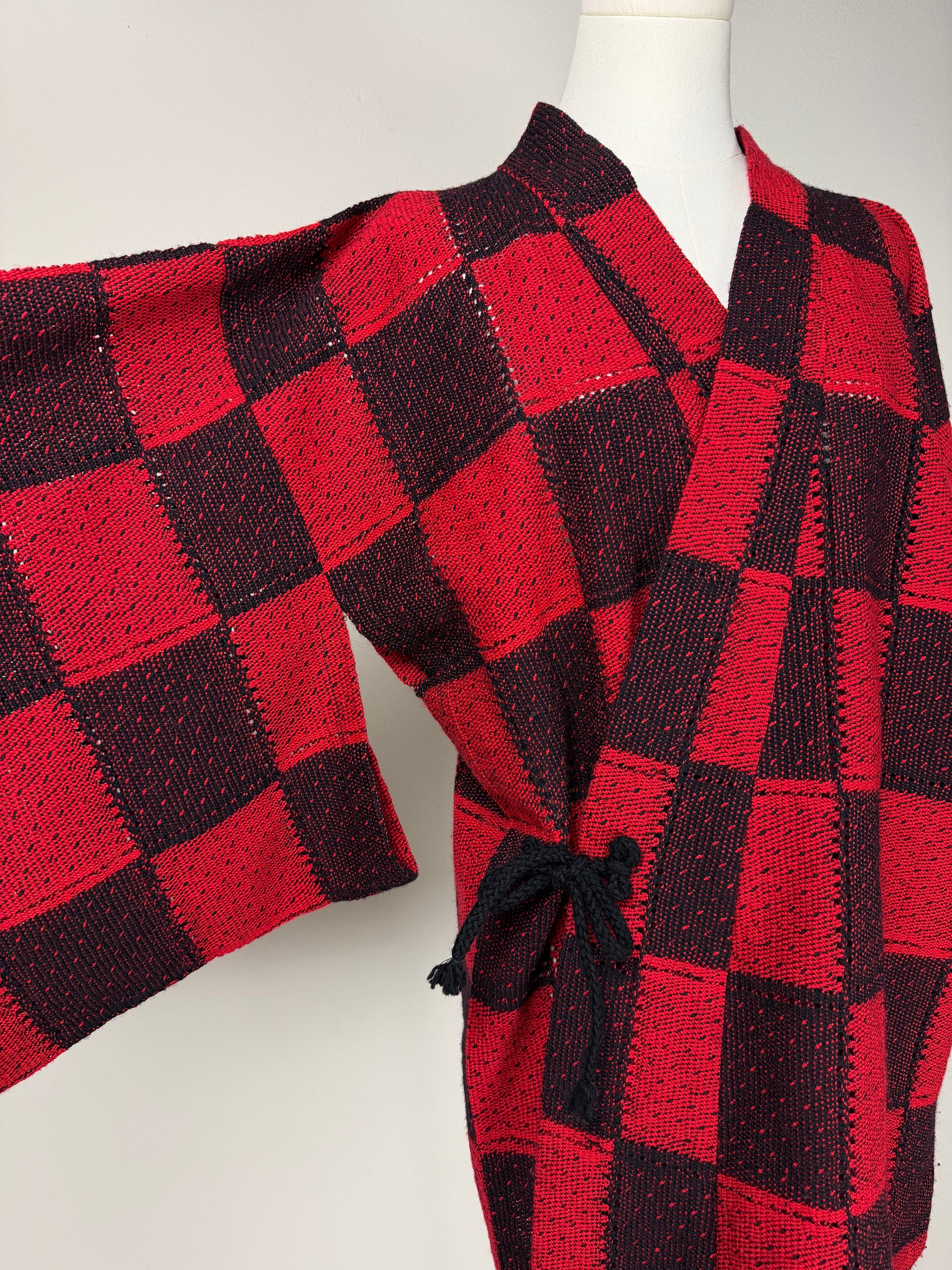 Haori originale giapponese in 100% lana, in maglia intrecciata a quadrati cuciti tra loro. Linea morbida e tipica della tradizione giapponese, con chiusura interna ed esterna tramite laccetti.