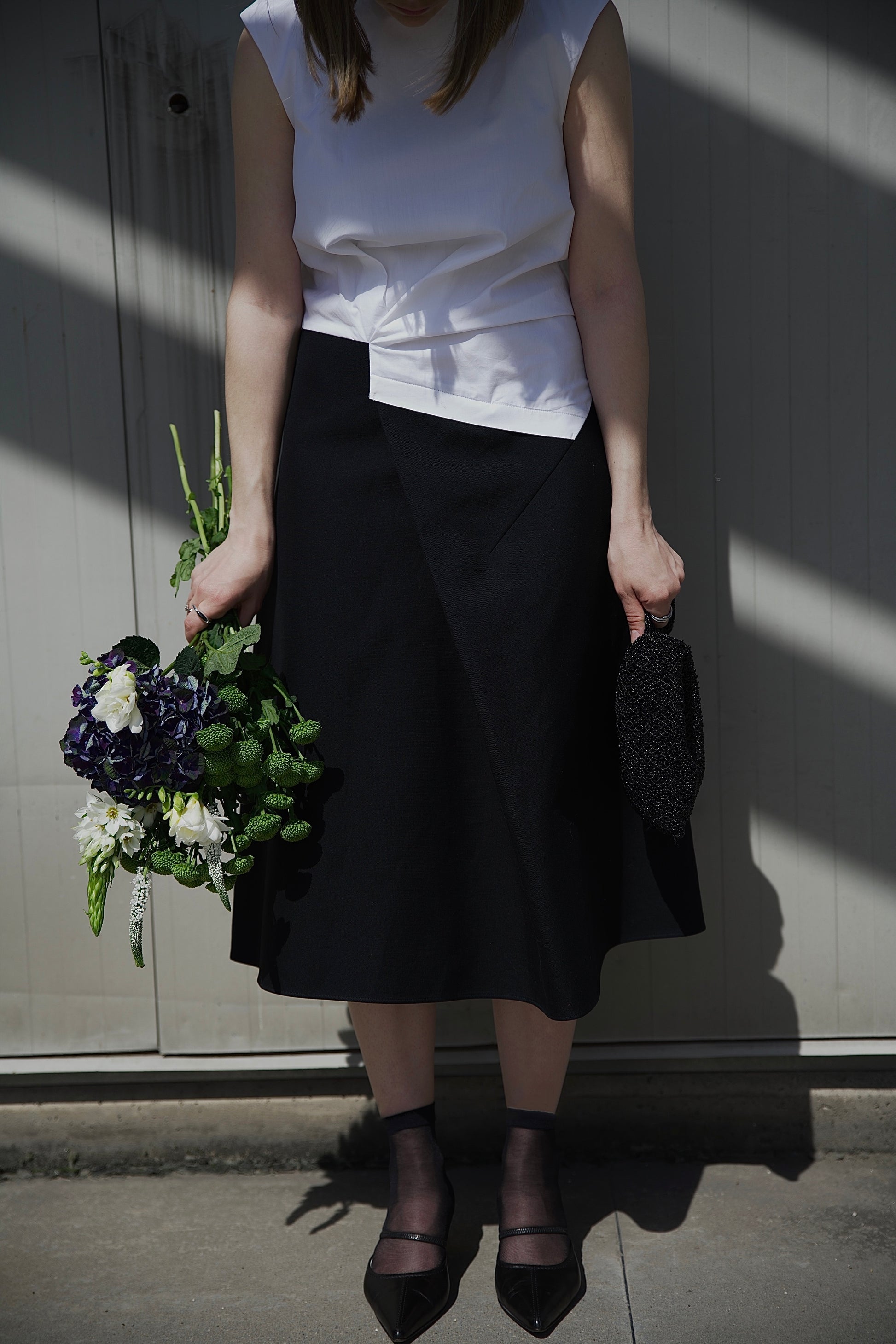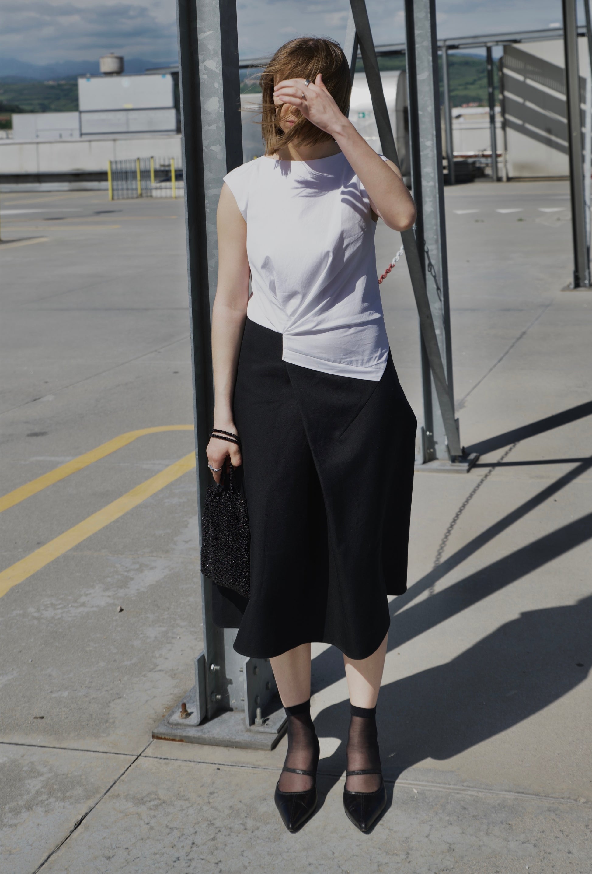 Abito Jil Sander bicolore, con gonna midi e top drappeggiato.