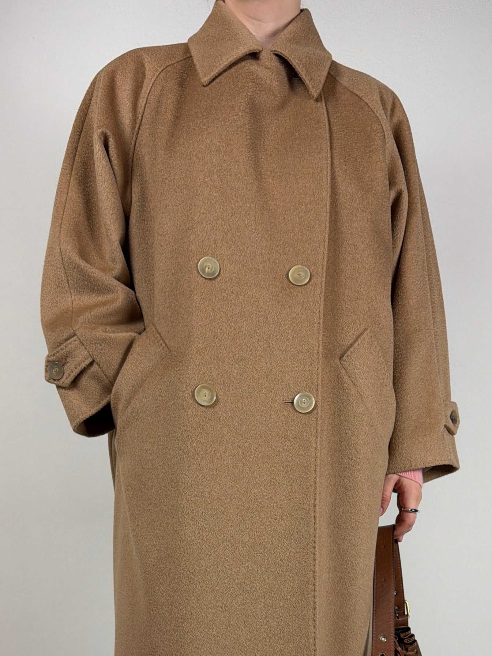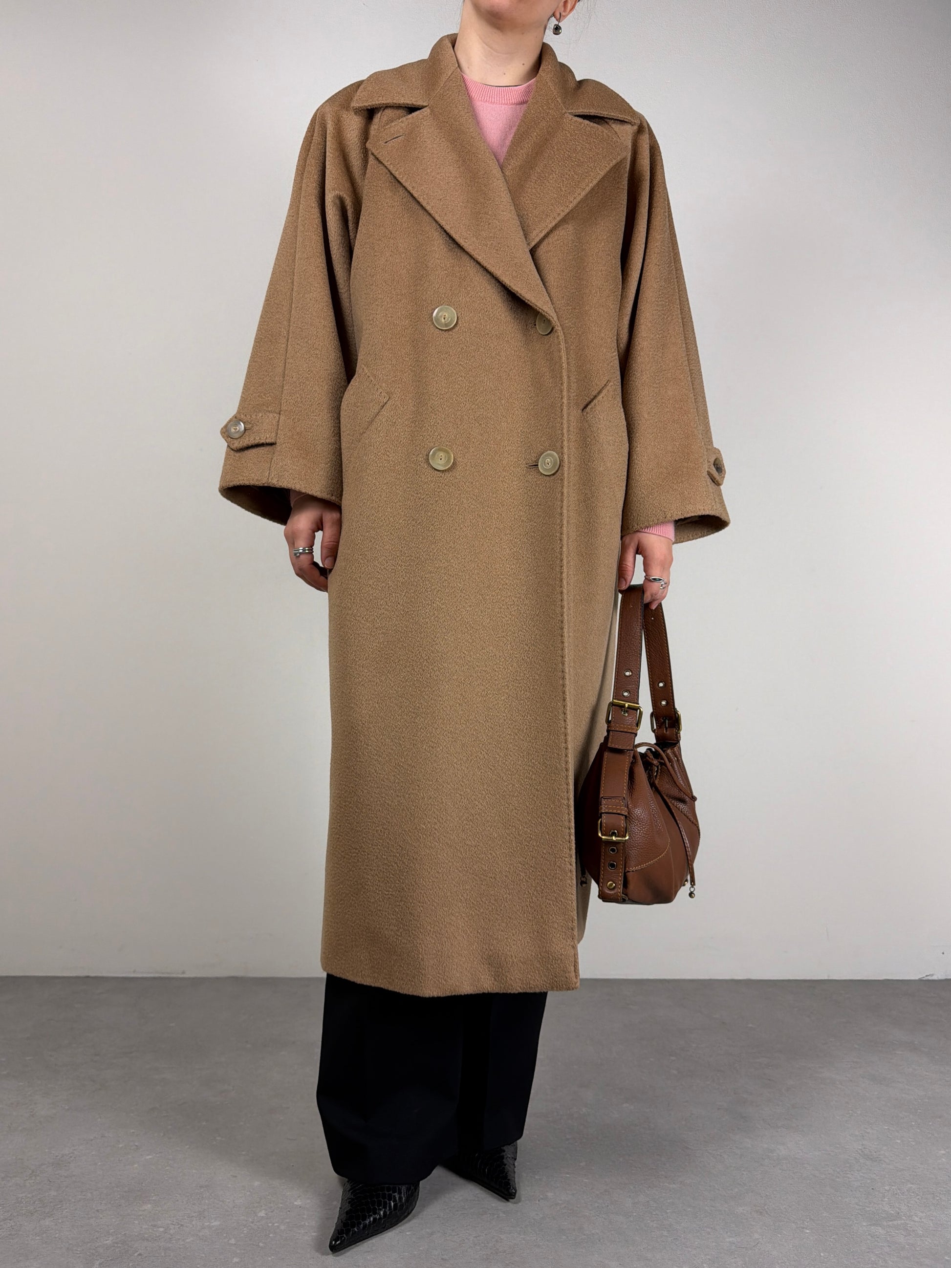 Cappotto Max Mara in 100% pregiato cammello, mano compatta e calda. Linea dritta e morbida, costruzione con manica raglan che permette libertà di movimento e adattamento su diverse spalle.