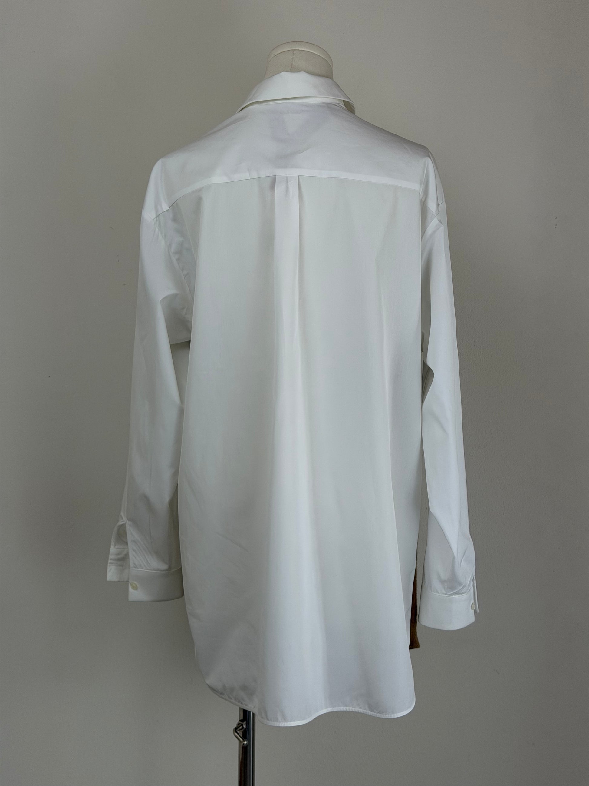 Camicia N°21 in popeline di cotone con inserto frontale effetto gilet in lana color cammello. Il design crea l’illusione di un gilet indossato sopra una camicia.