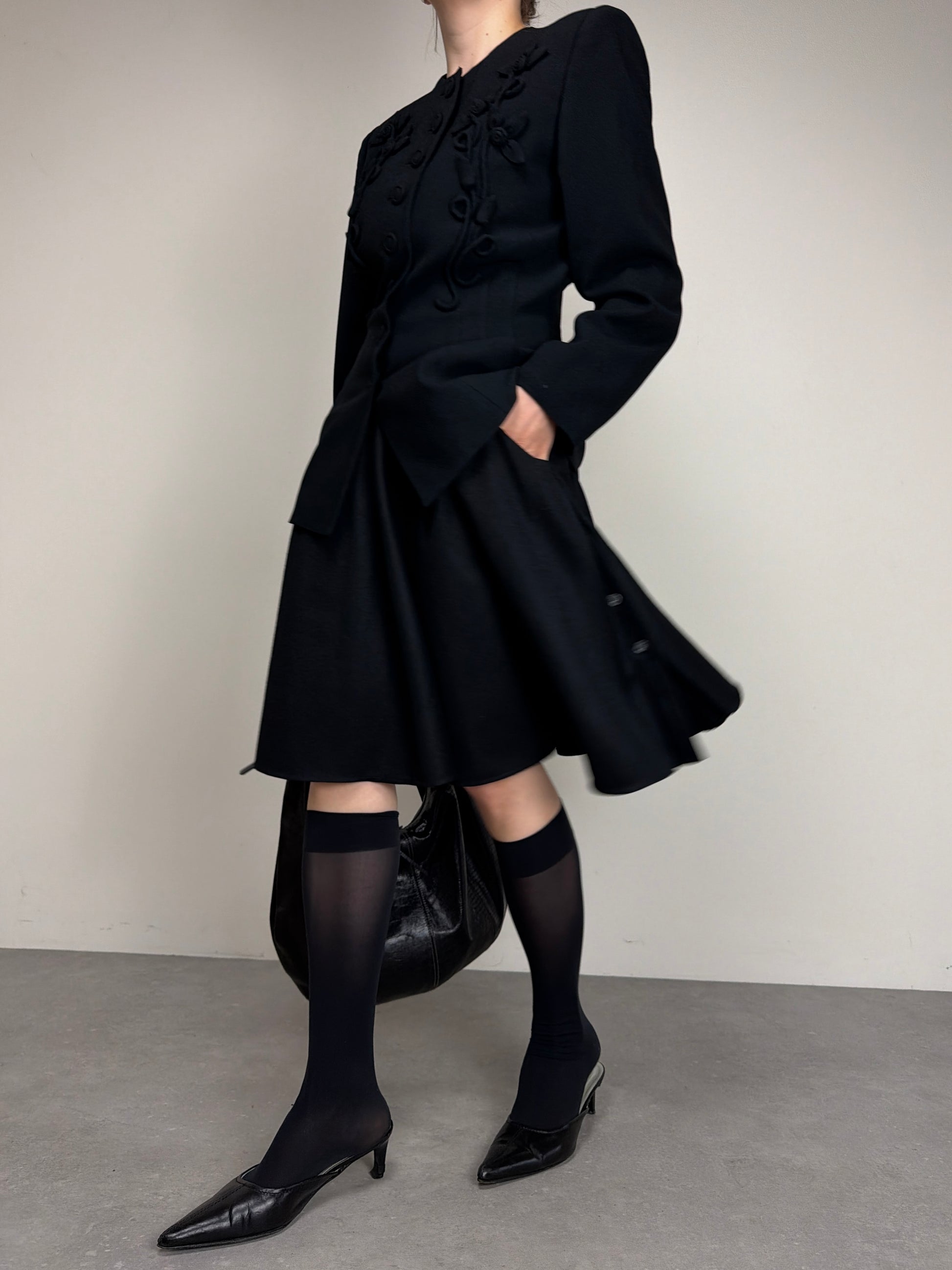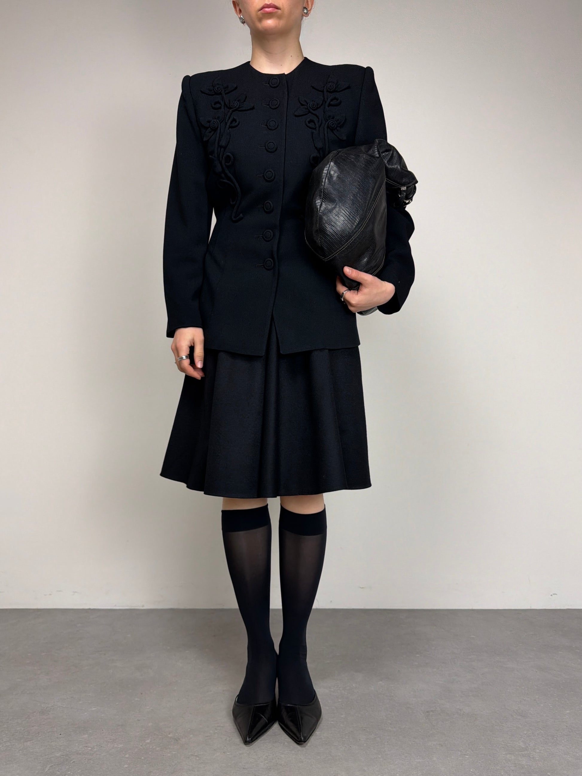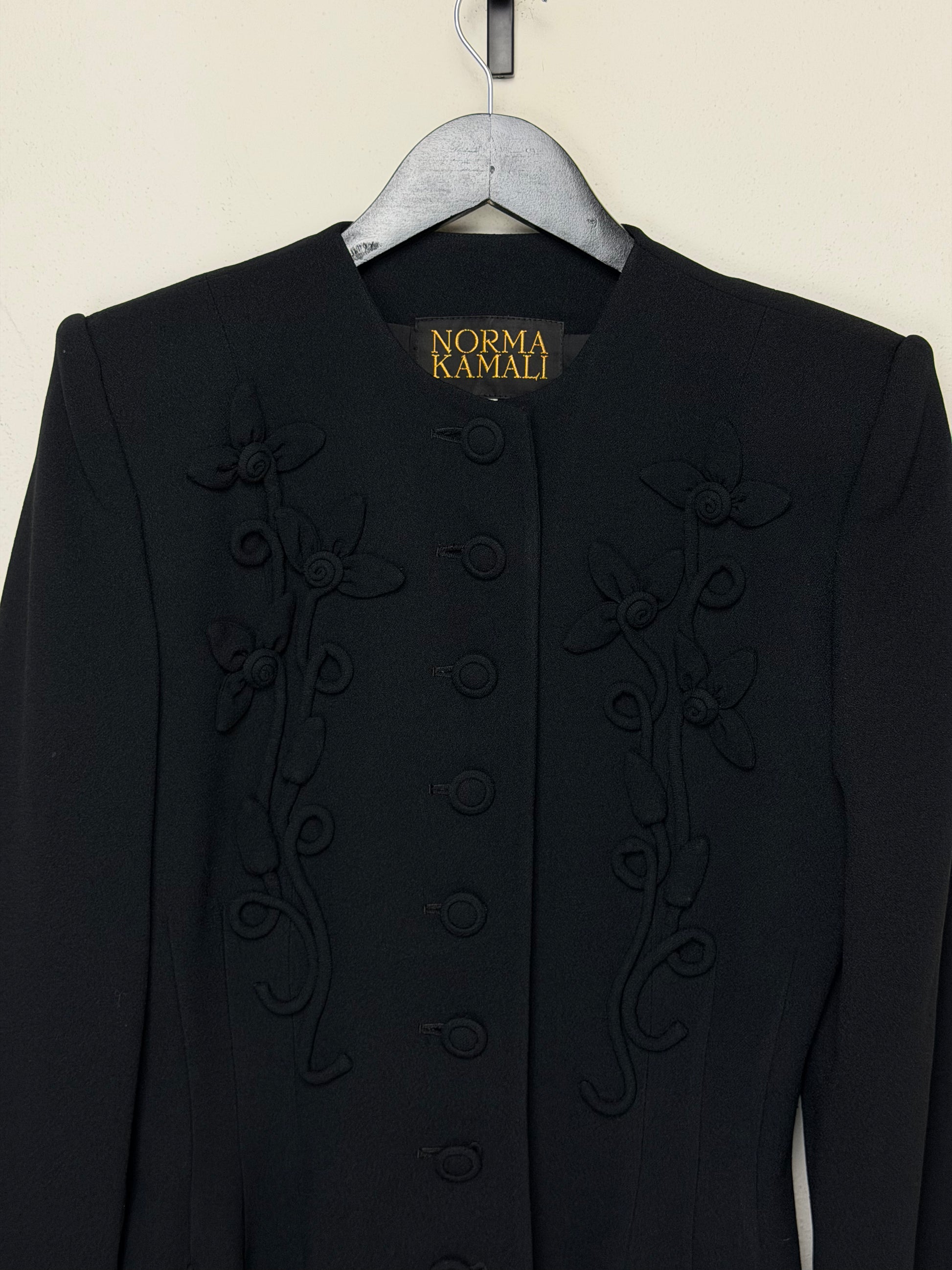 Blazer anni ’80 Norma Kamali, celebre designer americana nota per il suo approccio innovativo e sperimentale che ha rivoluzionato lo stile anni ’70 e ’80 con capi scultorei e dettagli unici. Questo blazer presenta spalle sostenute e linea avvitata, valorizzato da applicazioni floreali sul davanti.