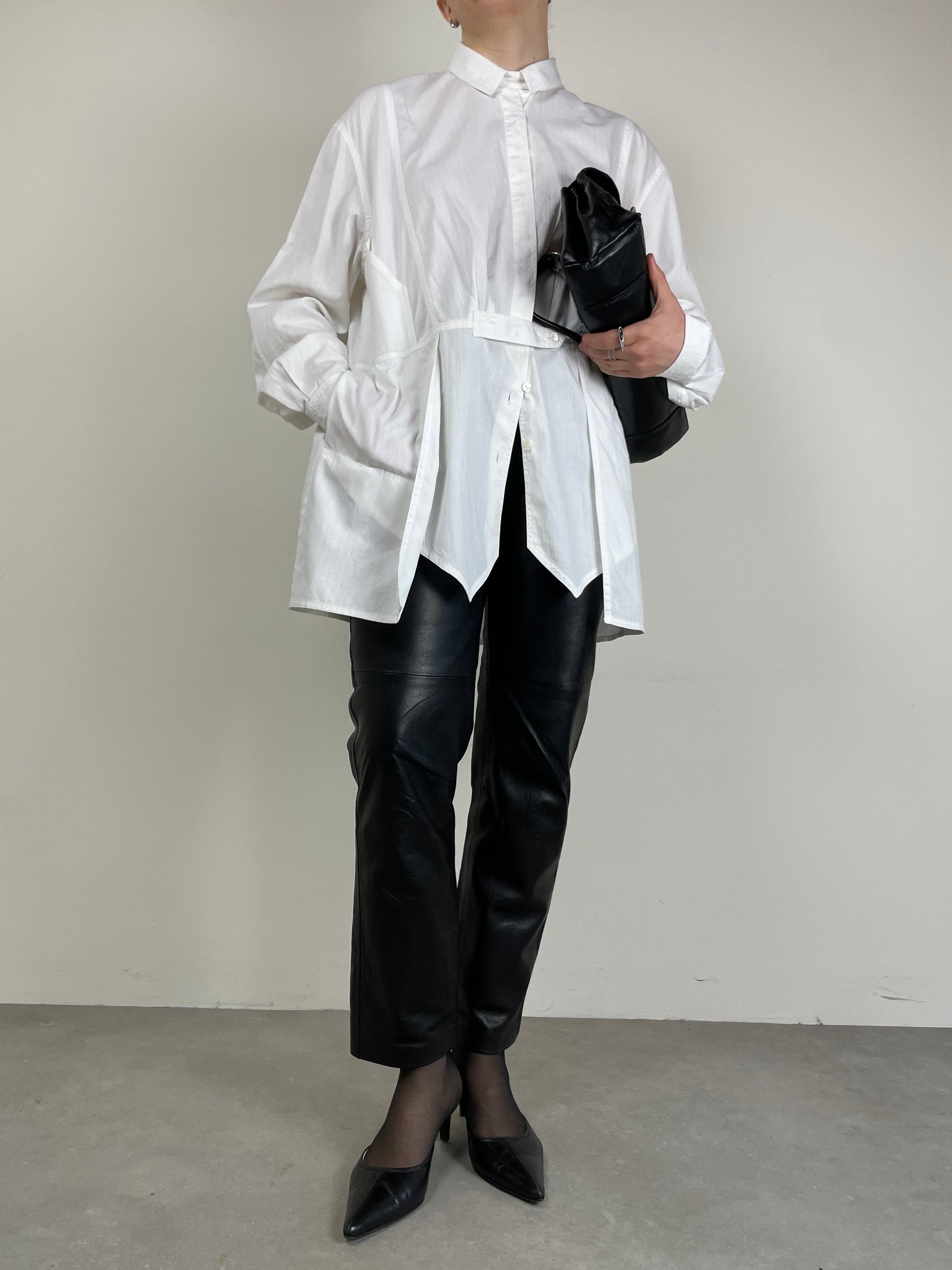 Pantalone vintage in morbida vera pelle nera, dalla linea dritta e struttura leggermente affusolata, completamente foderato internamente.