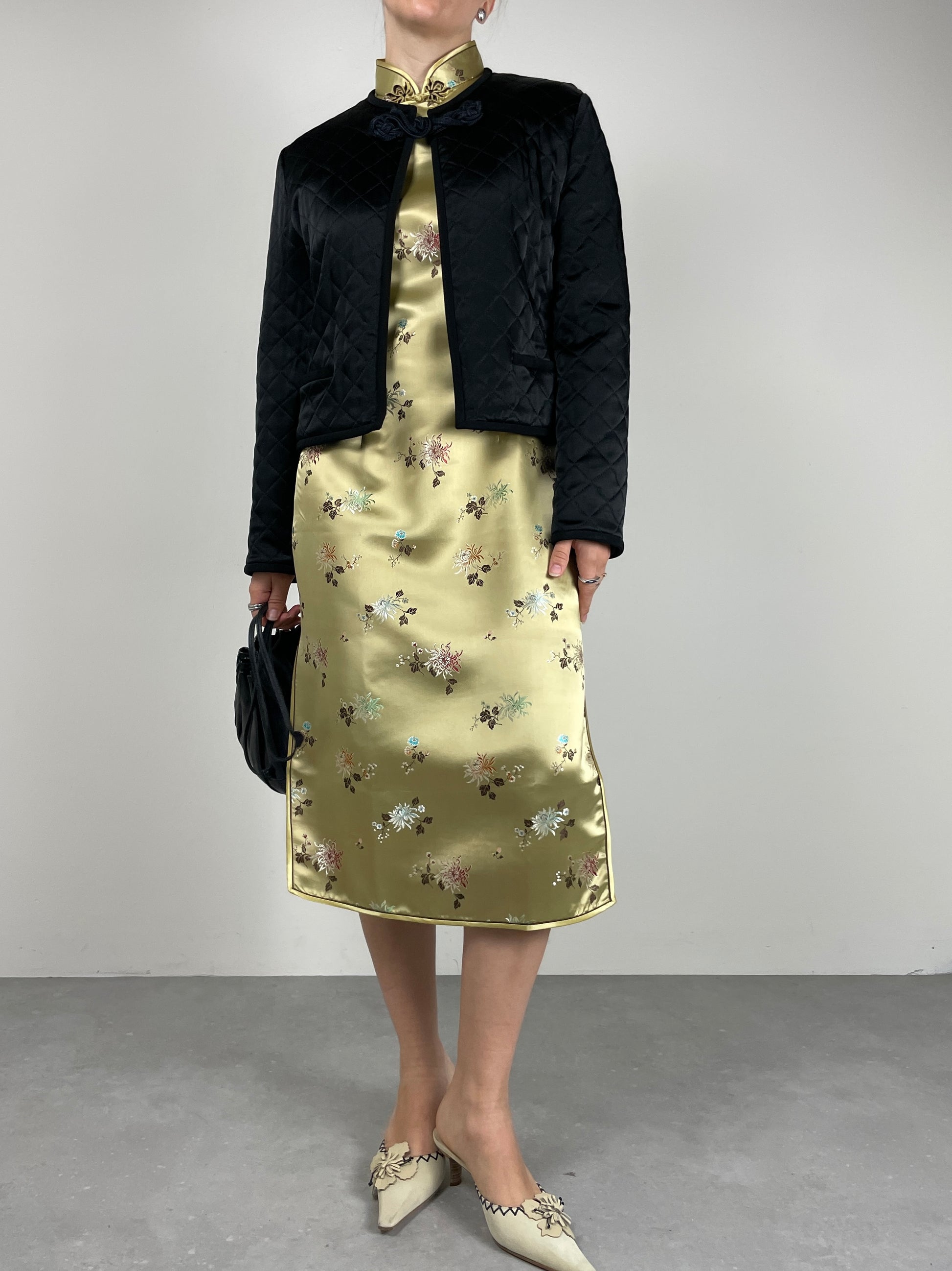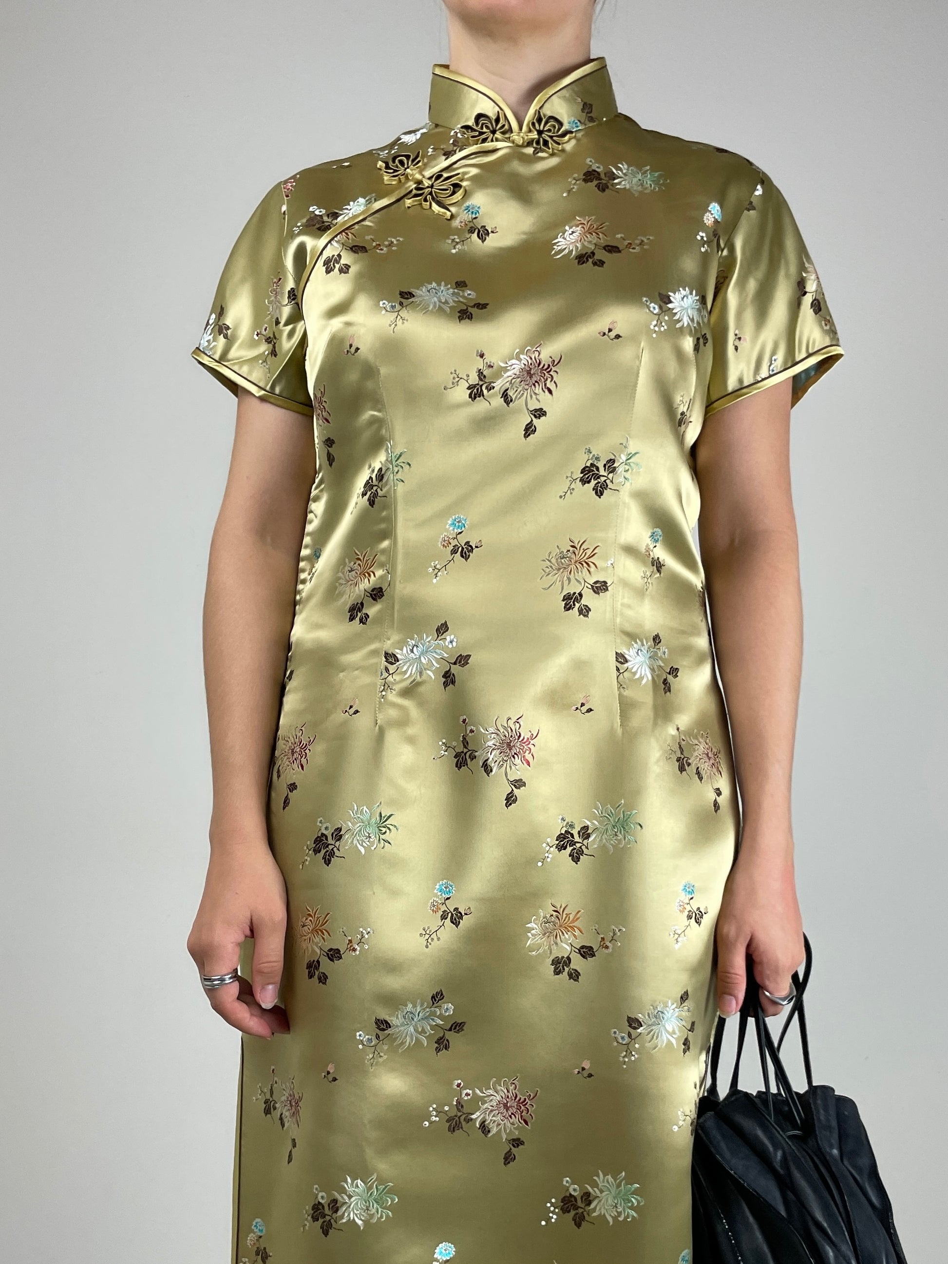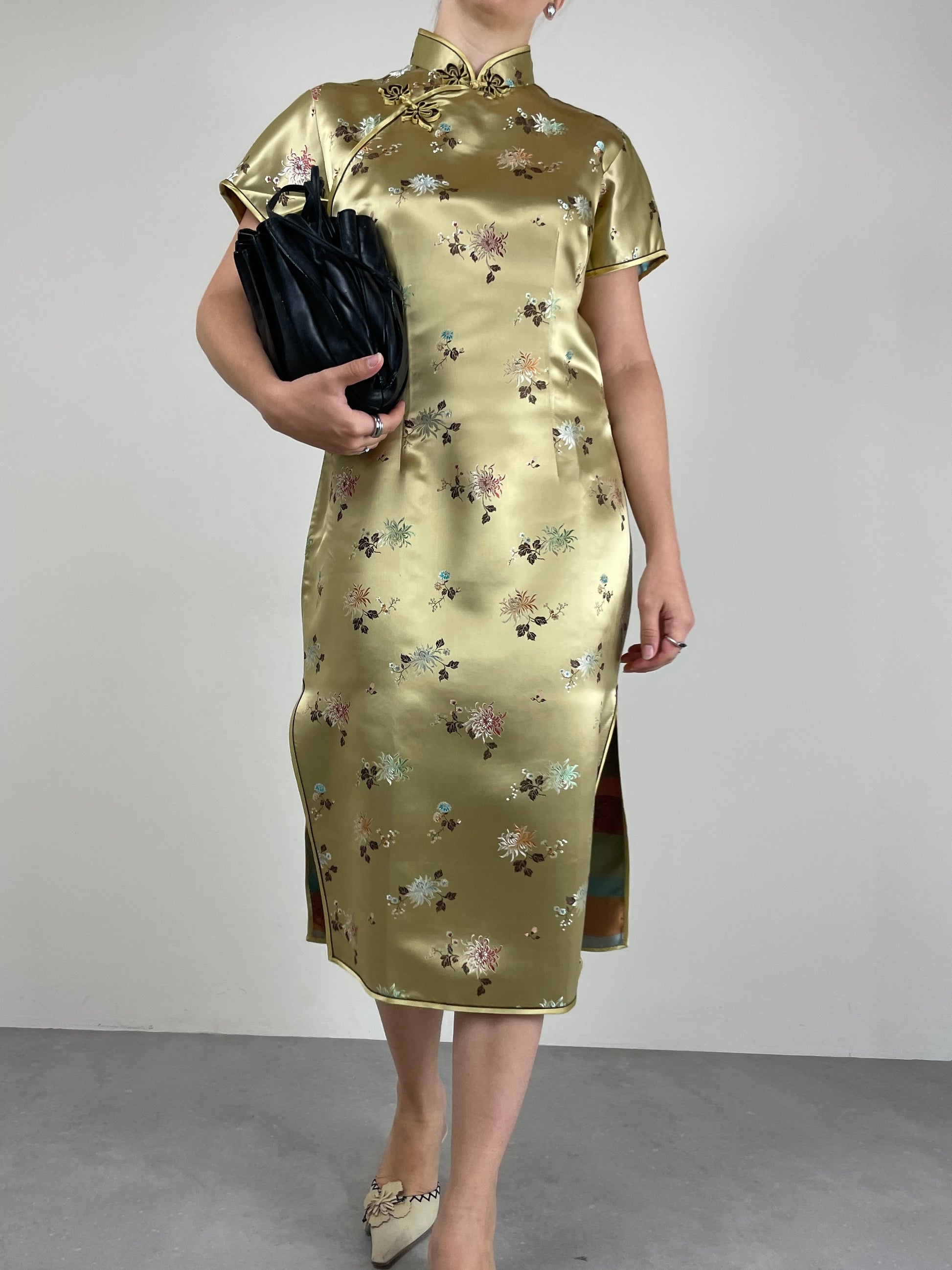 Qipao sartoriale in viscosa color oro con motivo floreale multicolore a effetto jacquard.