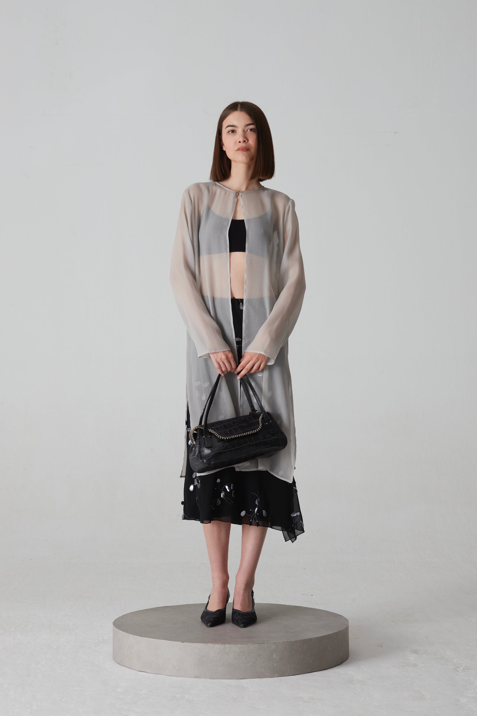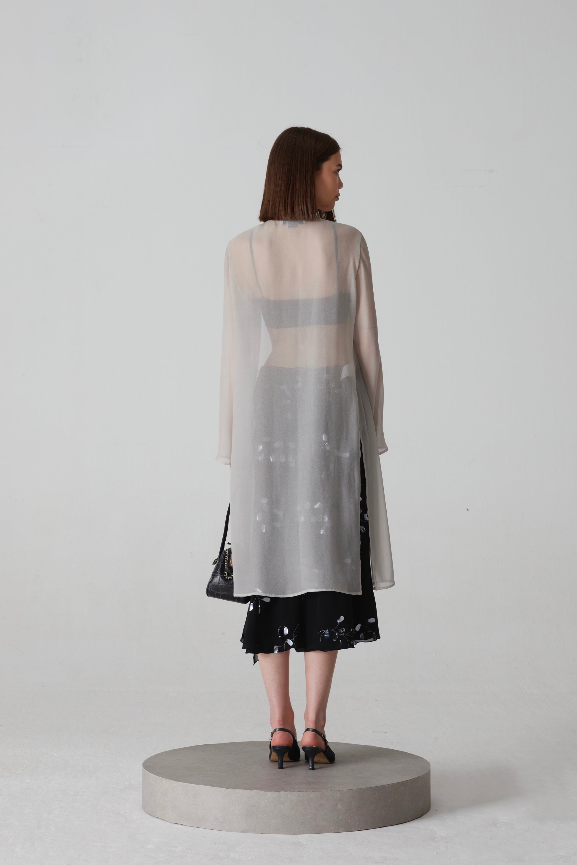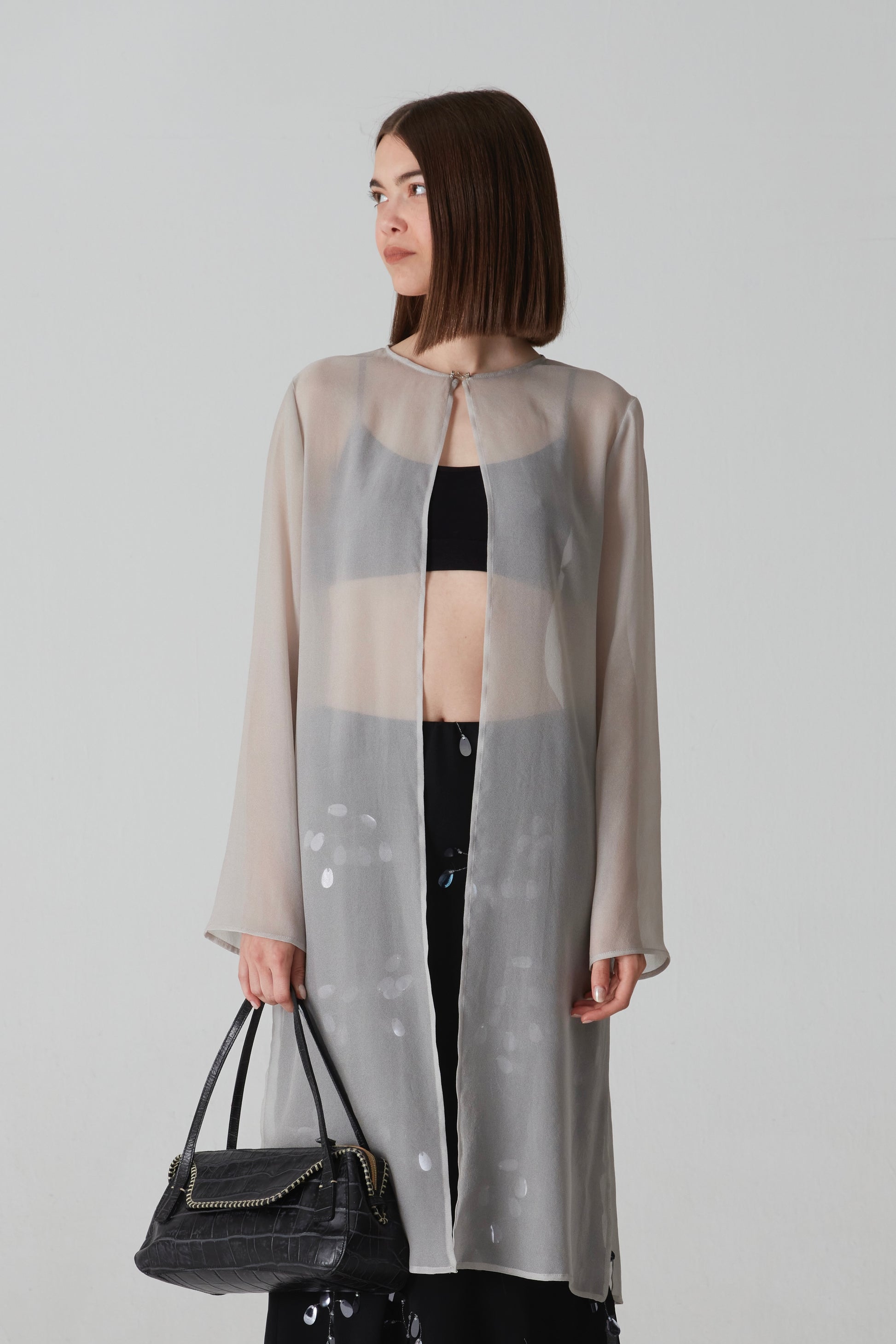 Tunica lunga in crêpe di misto seta color grigio perla, Made in Italy, con trasparenza leggera e taglio essenziale, ancora con cartellino.