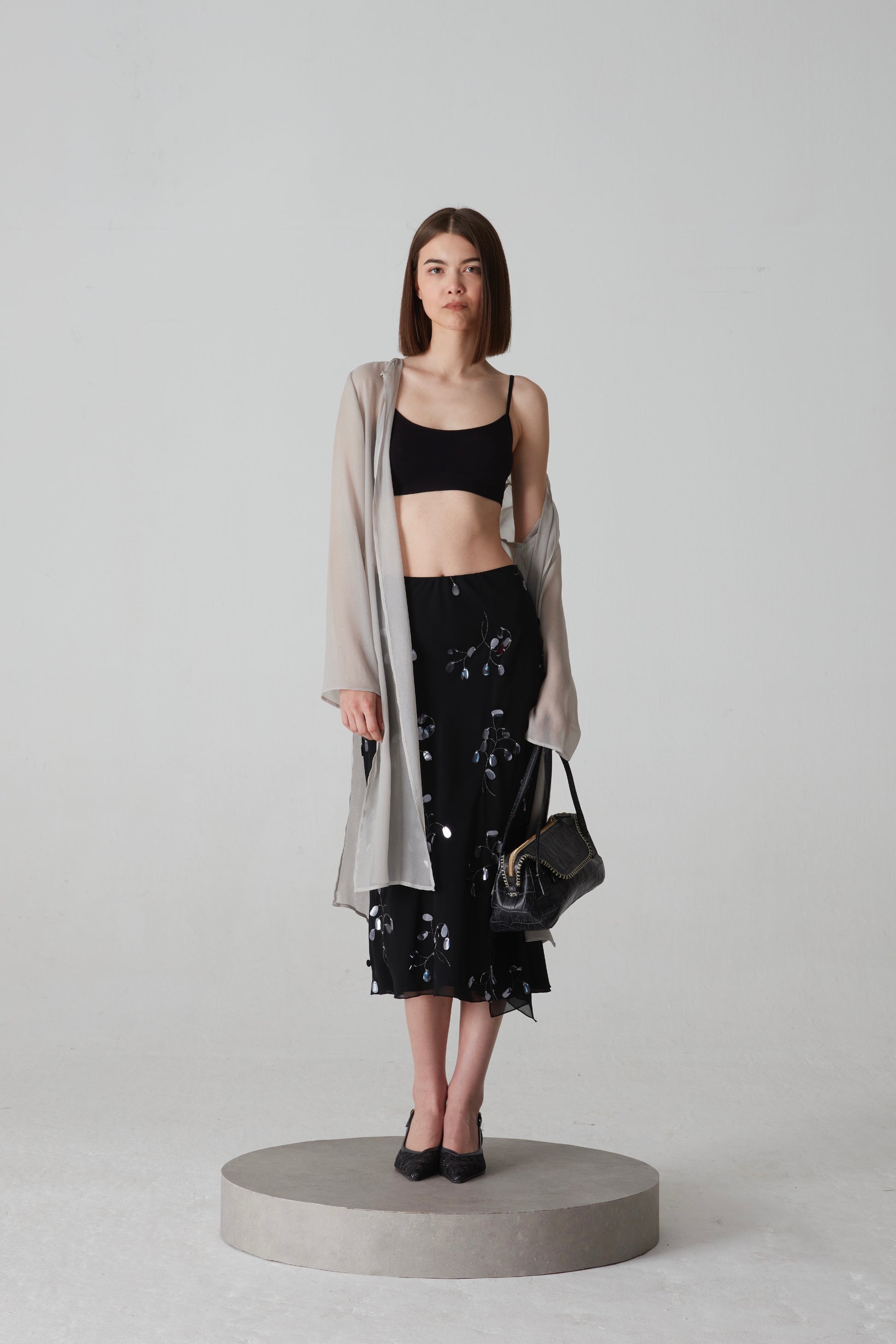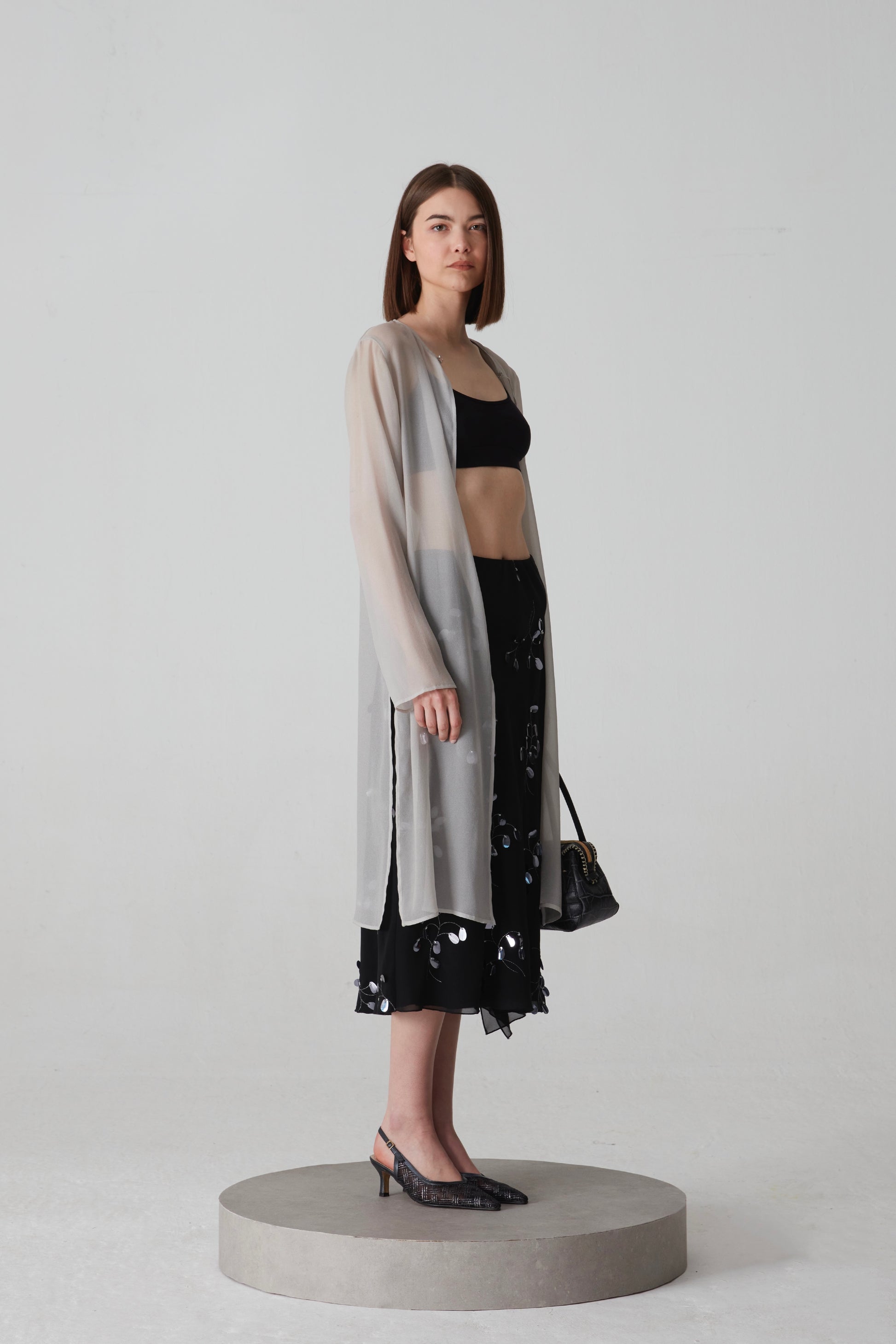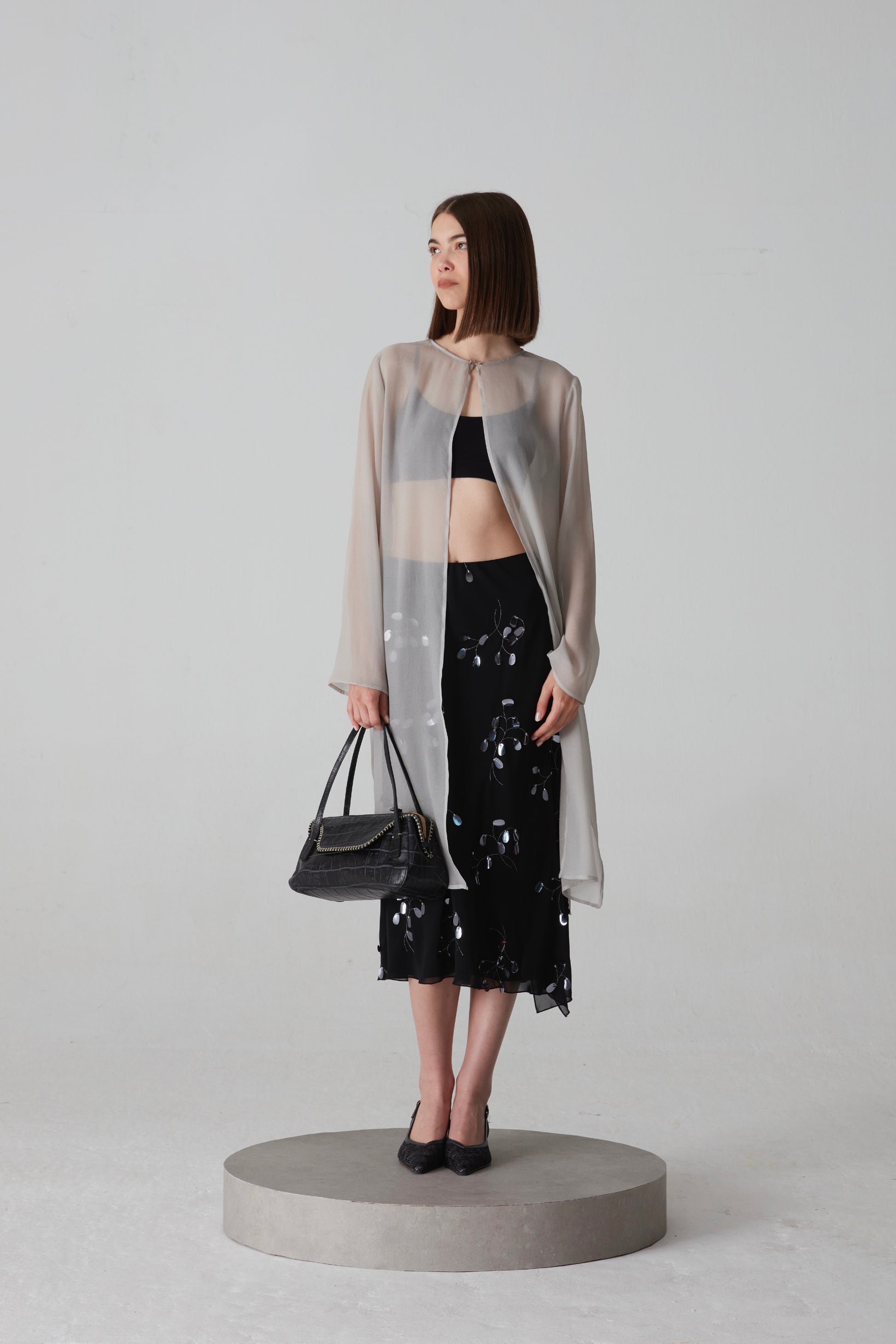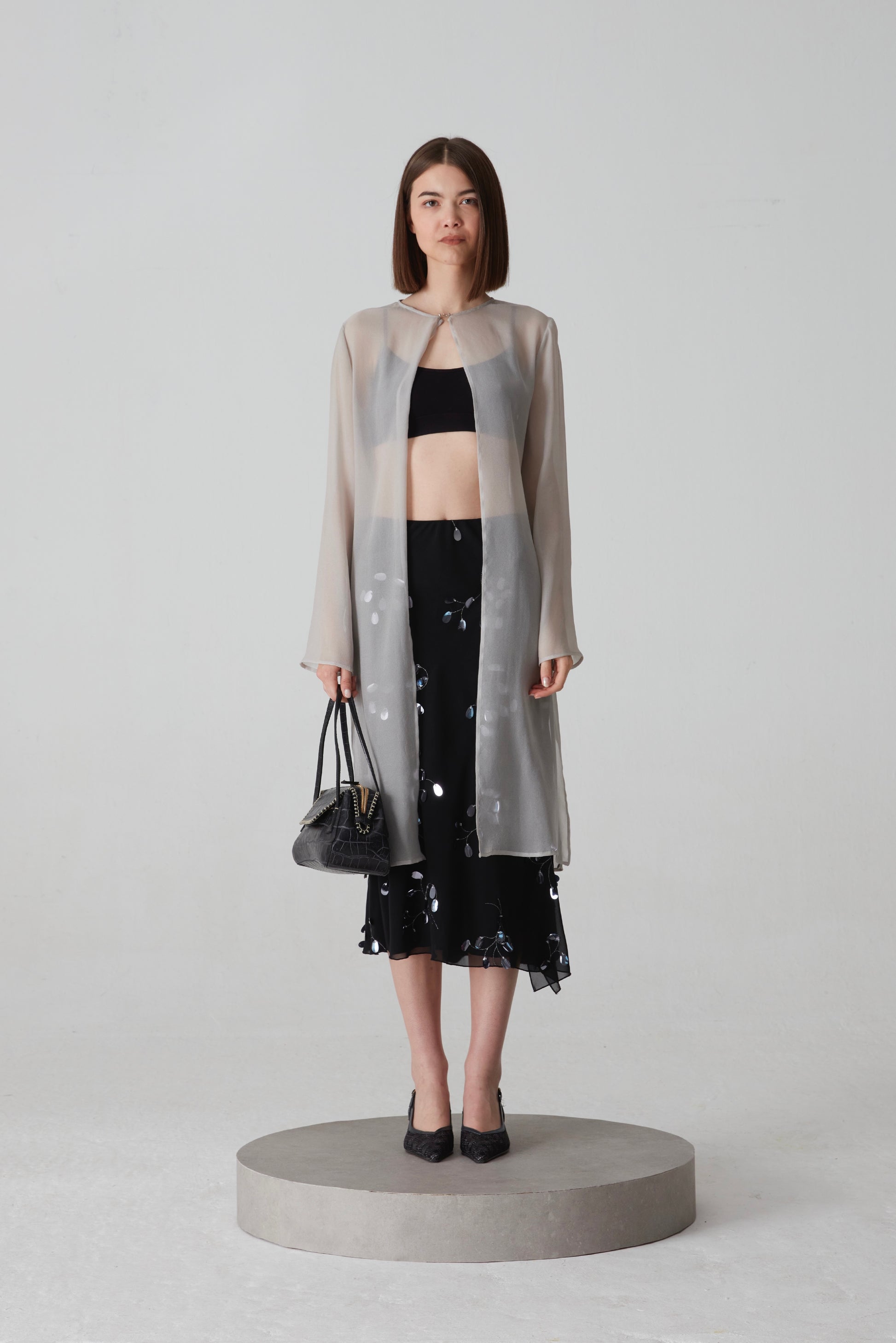 Tunica lunga in crêpe di misto seta color grigio perla, Made in Italy, con trasparenza leggera e taglio essenziale, ancora con cartellino.
