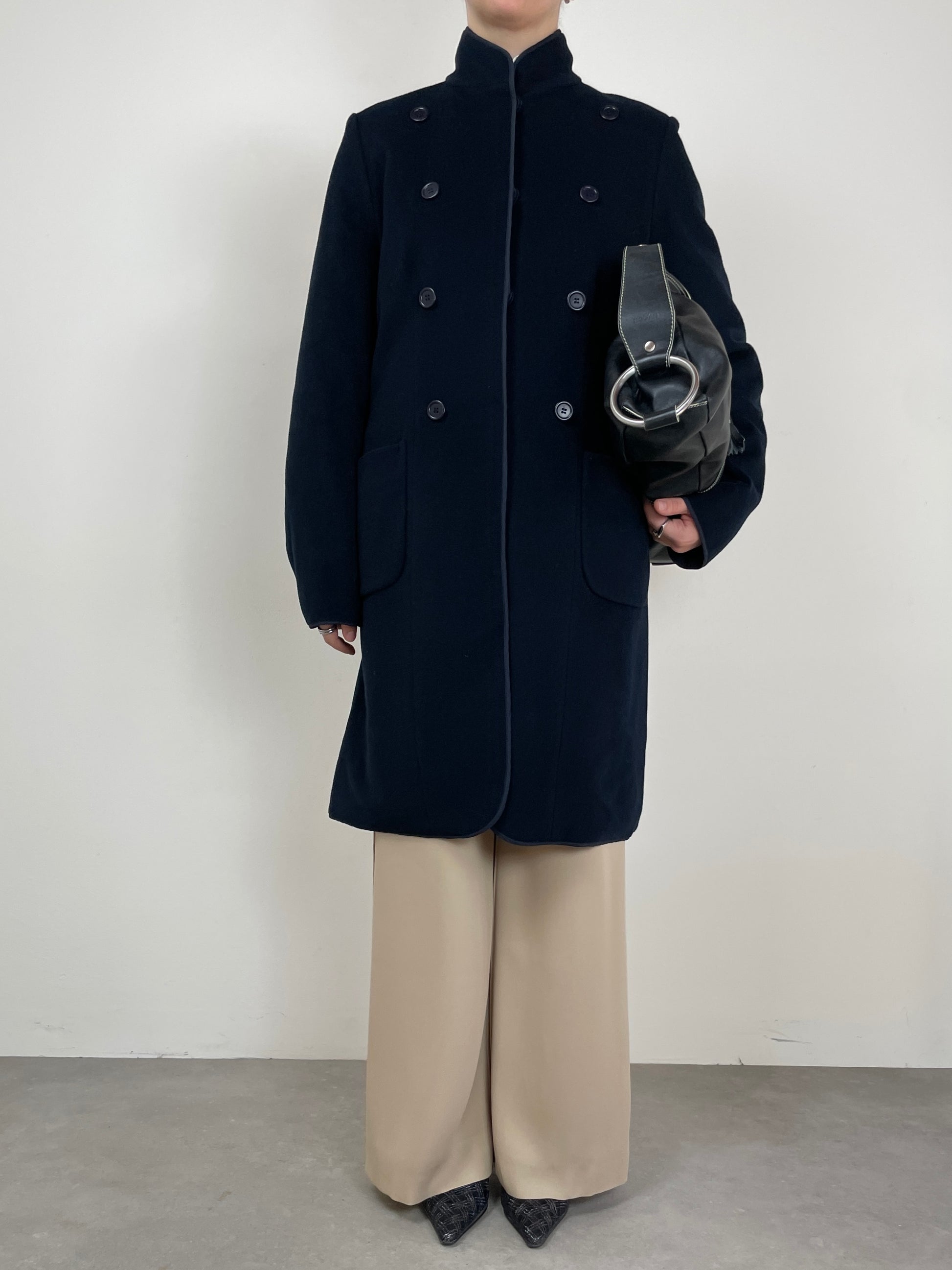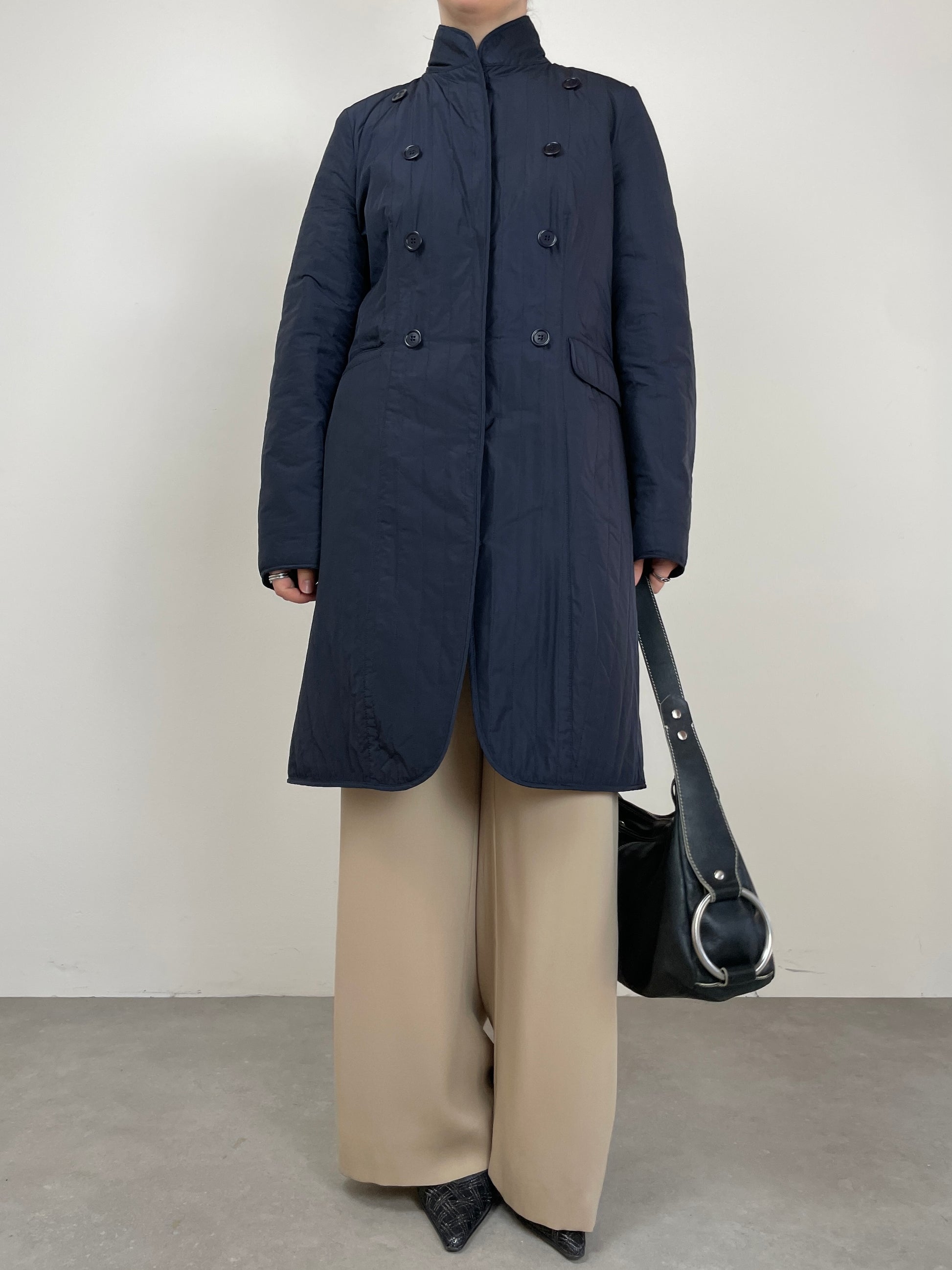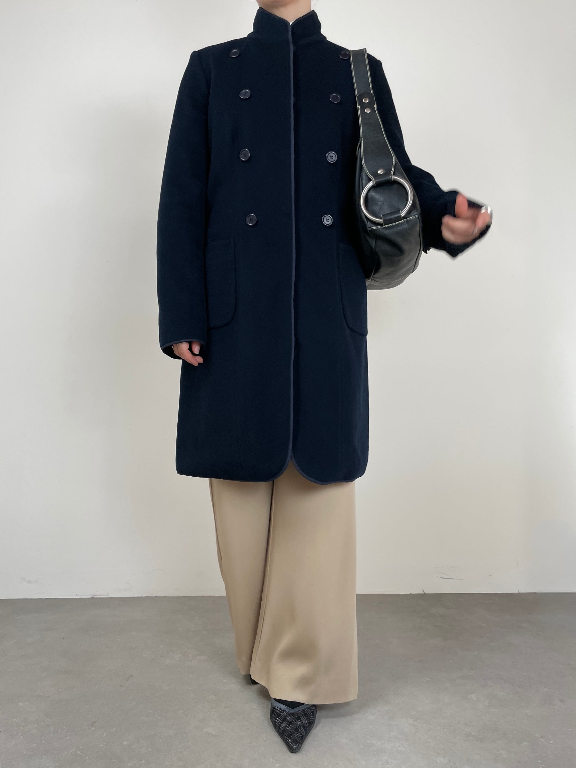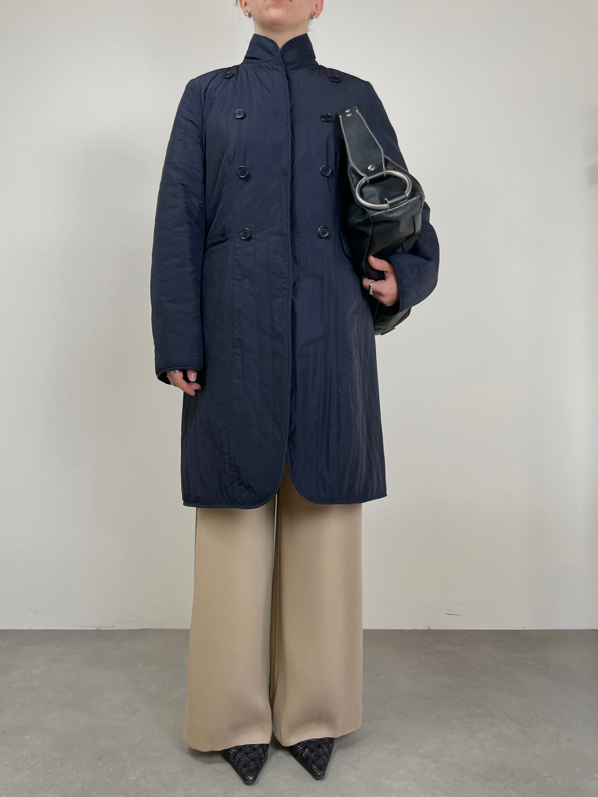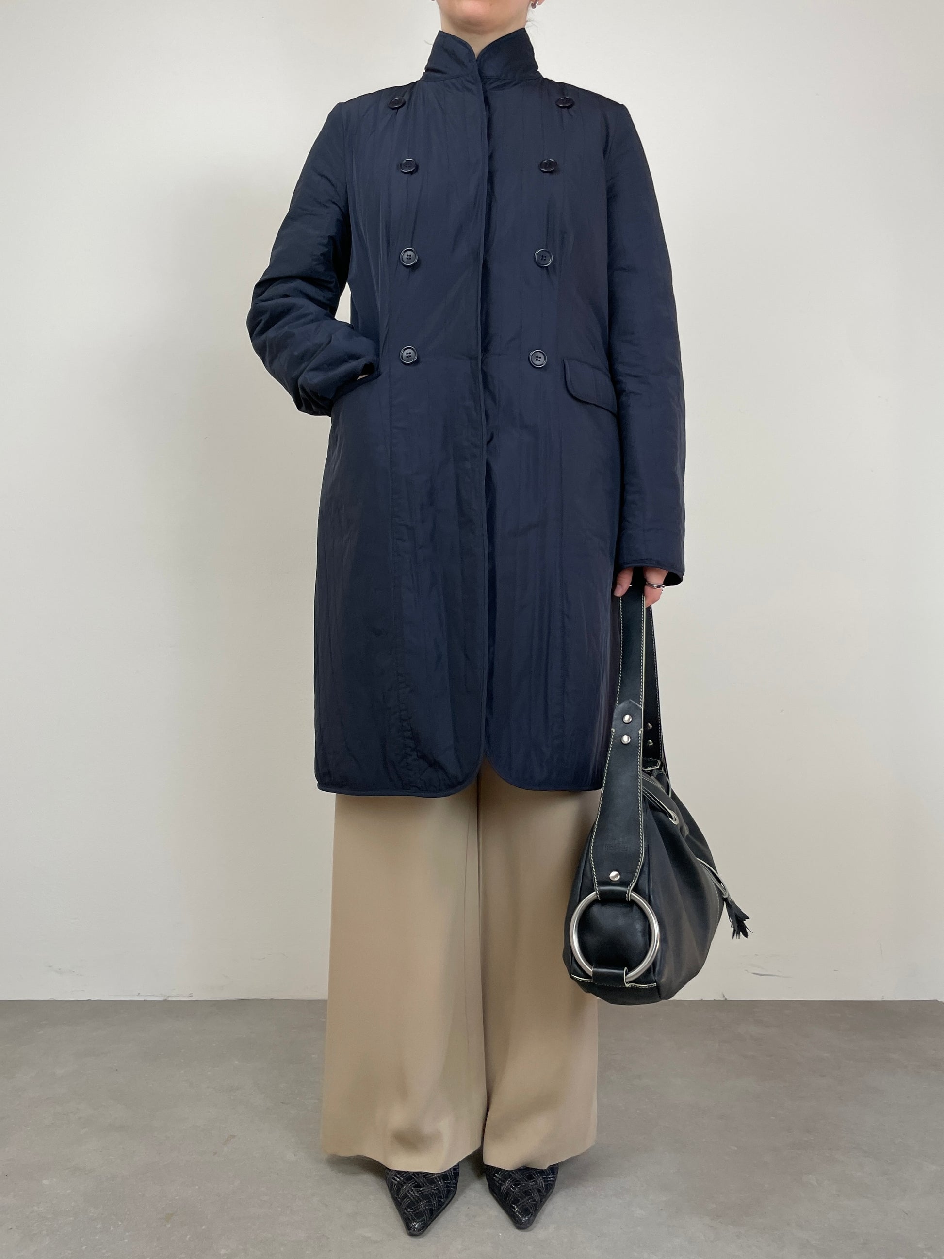 Soprabito reversibile con linea dritta e collo alto, Made in Italy, da un lato in panno sottile in lana e cashmere e dall’altro in tessuto tecnico impermeabile, colore blu notte.