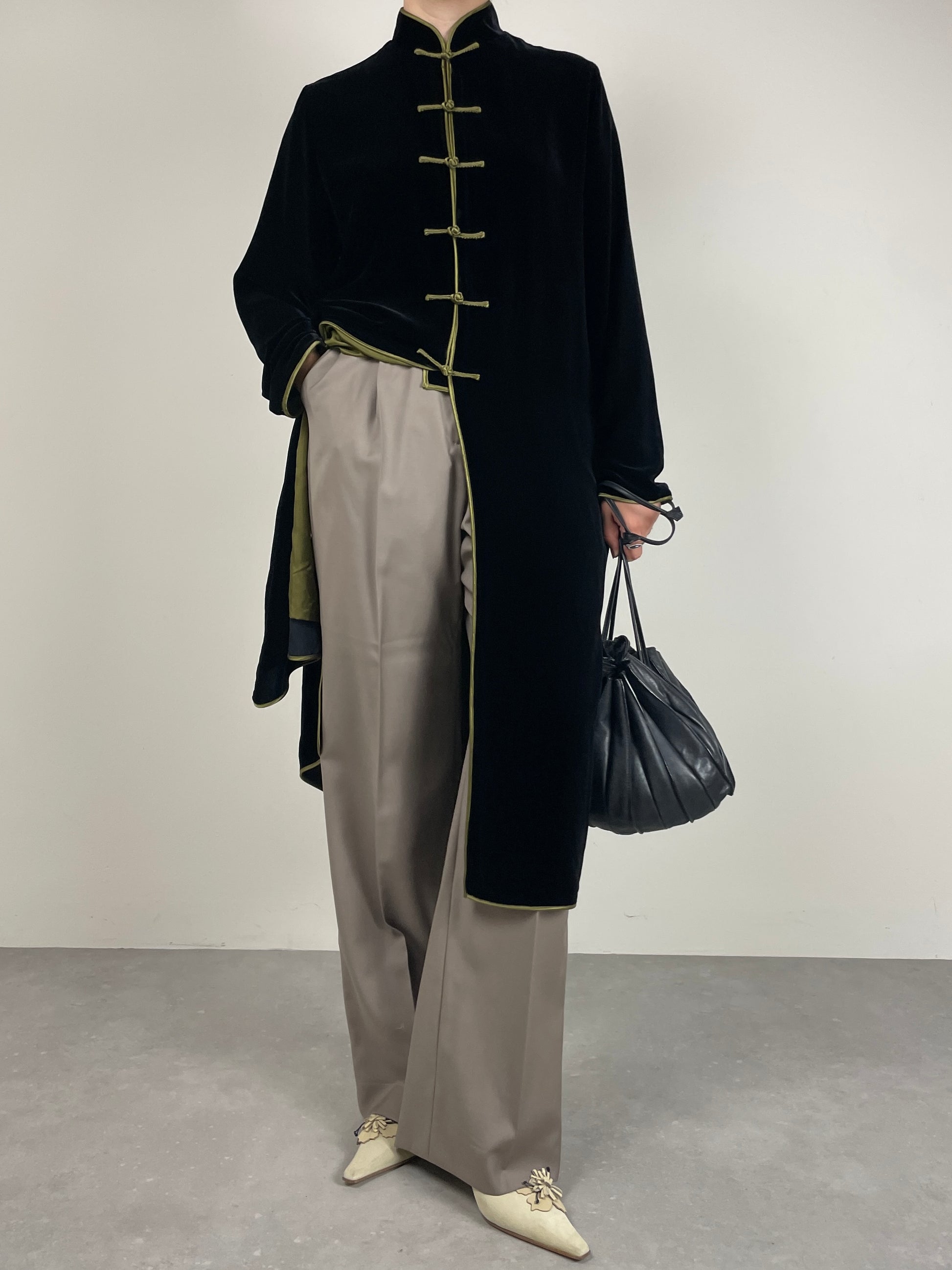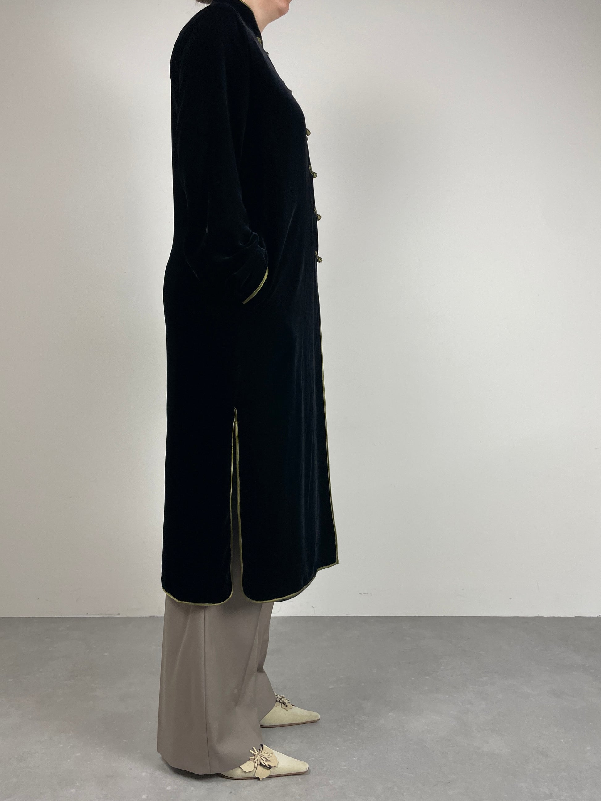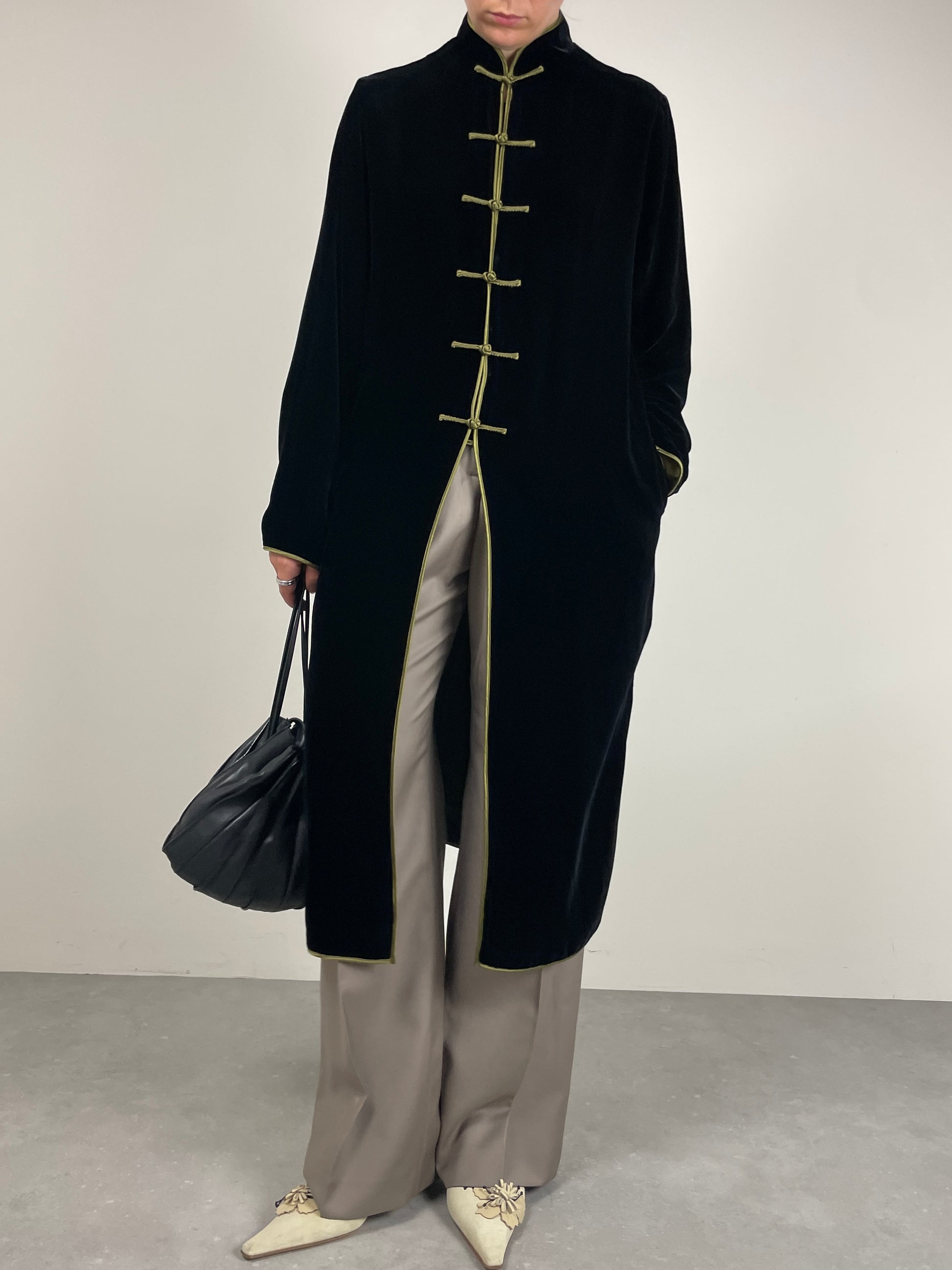 Soprabito lungo in velluto nero misto sera, Made in Italy, dal taglio ispirato allo stile asiatico, rifinito con profili in seta a contrasto verde oliva e chiusura a alamari cinesi.