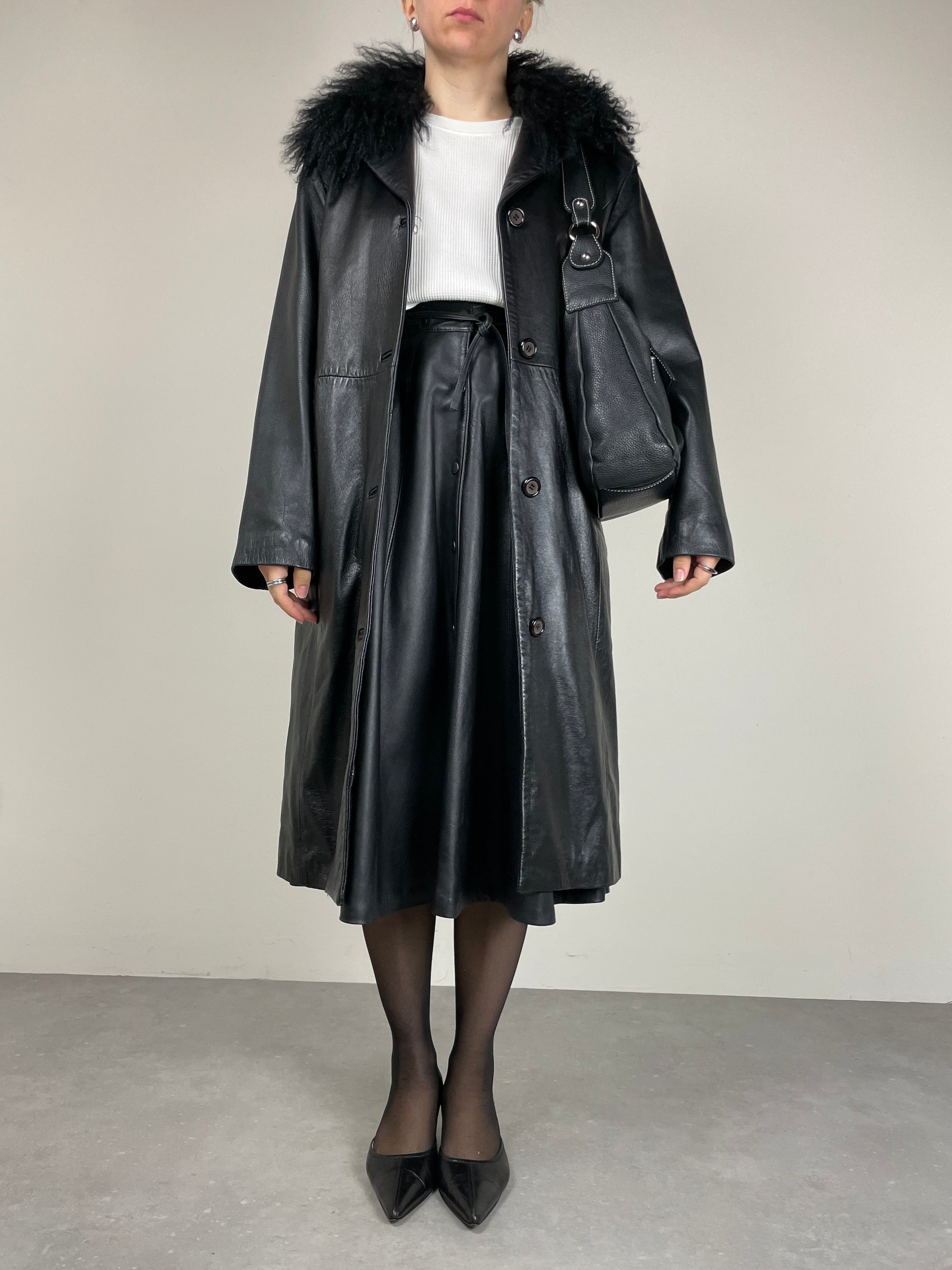 Trench in vera pelle nera con collo in pelliccia di pecora di Mongolia staccabile, dalla linea lunga e leggermente svasata. Realizzato in pelle morbida, ha un taglio dritto e cintura coordinata che definisce la vita.