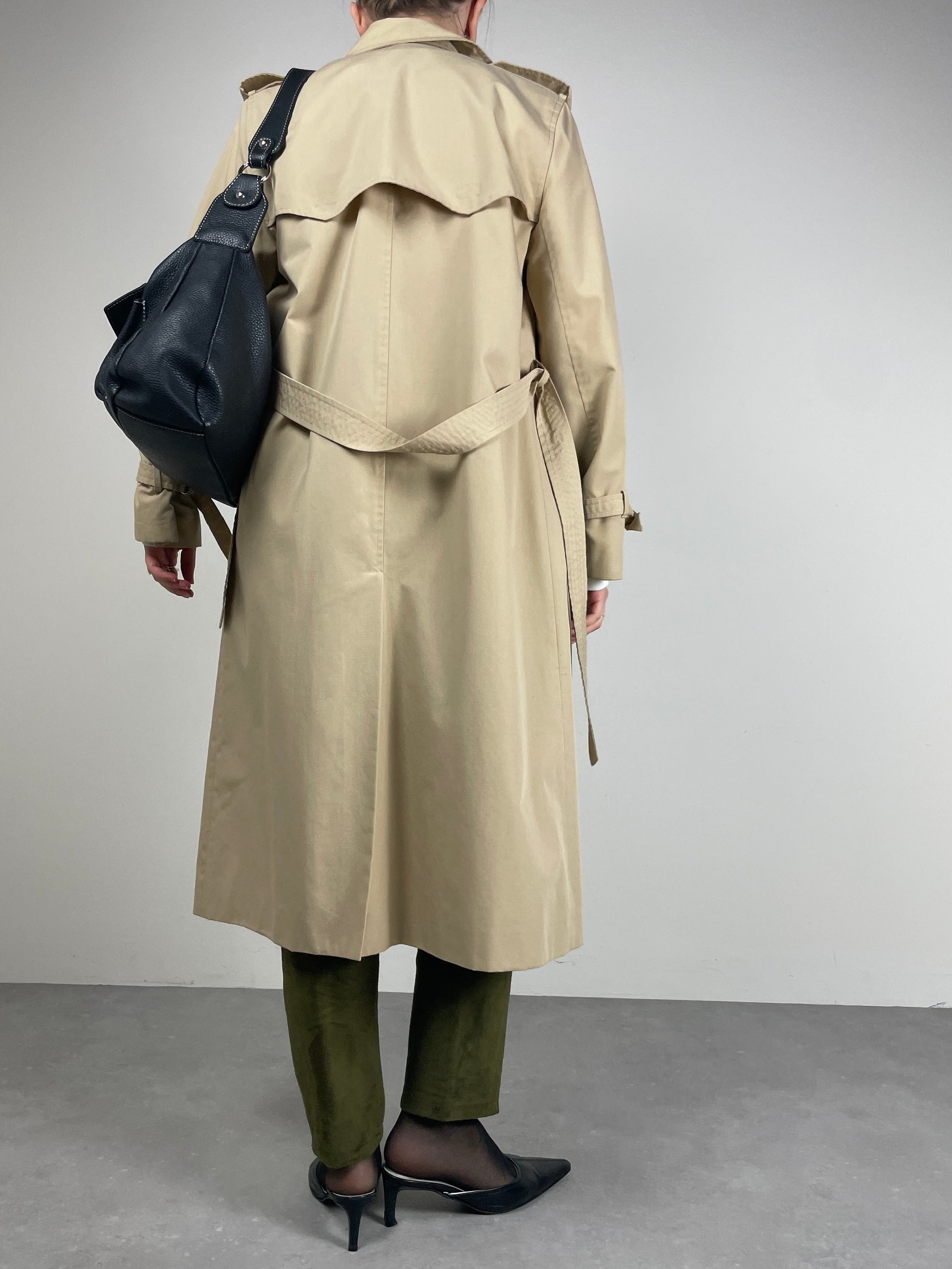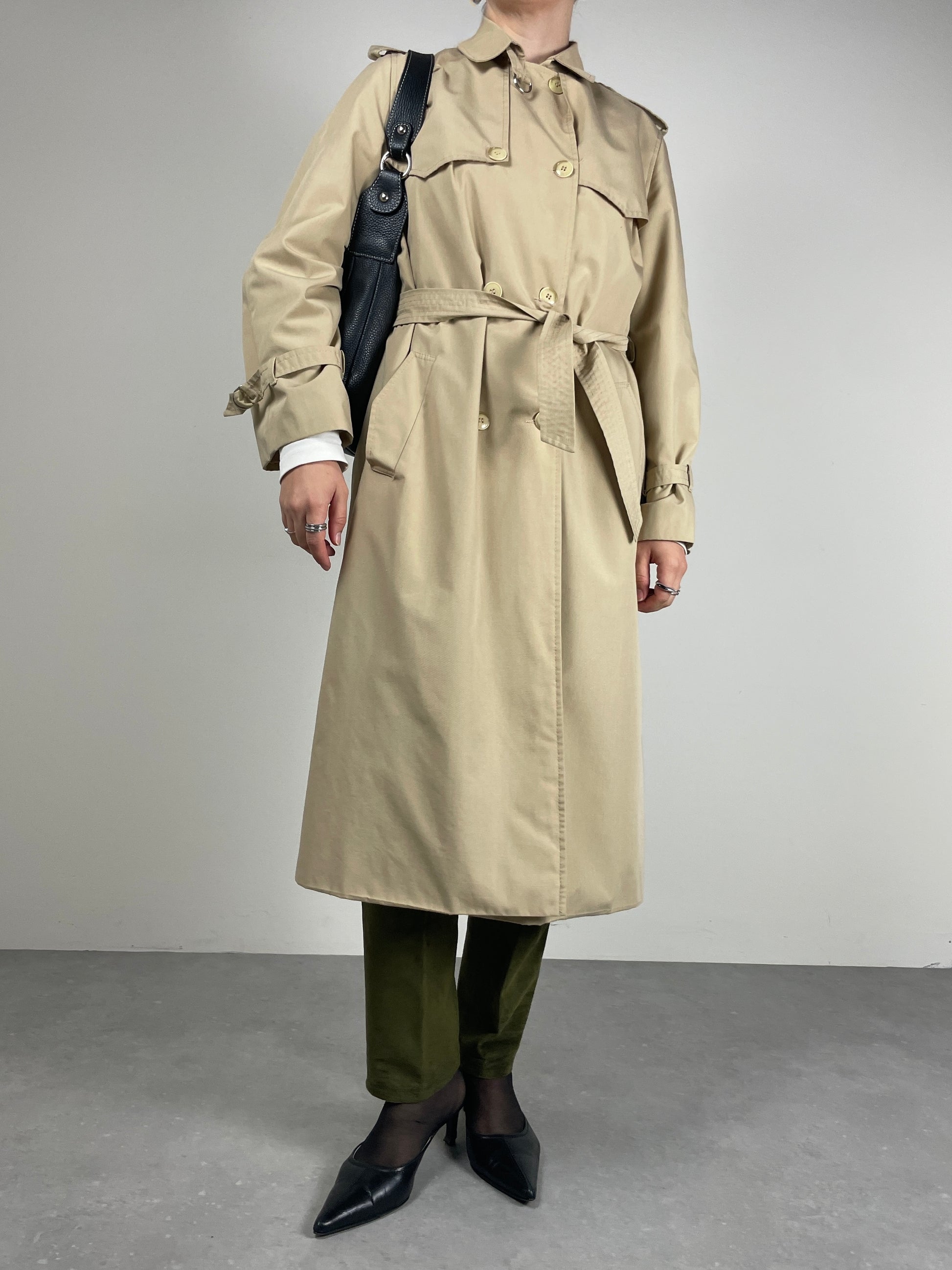 Trench beige vintage in misto cotone, dal taglio classico e fluido con cintura in vita.