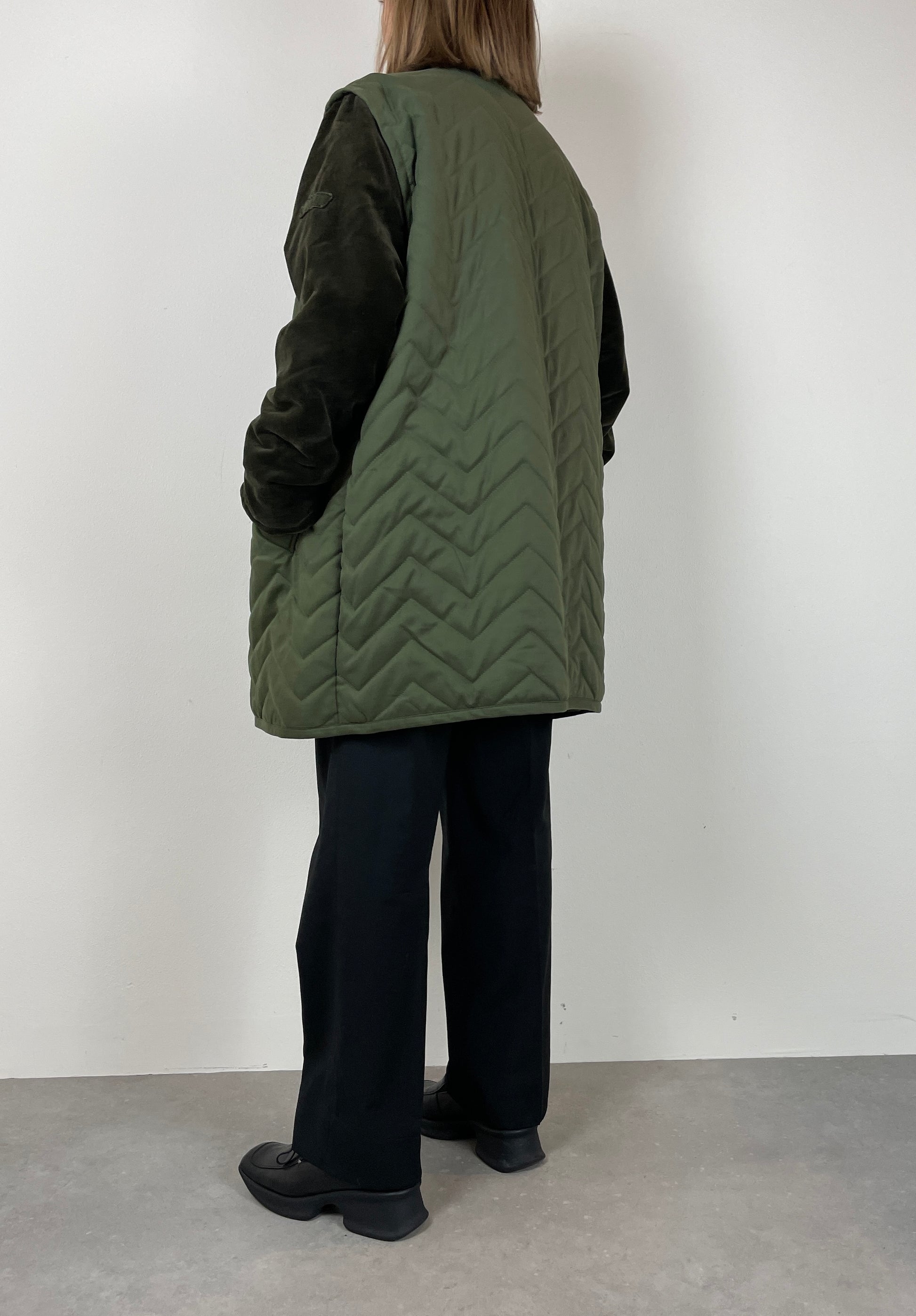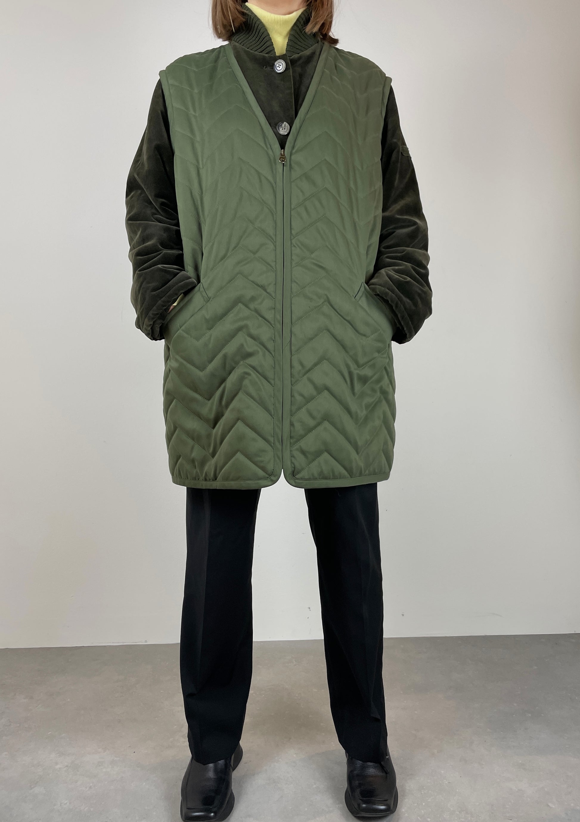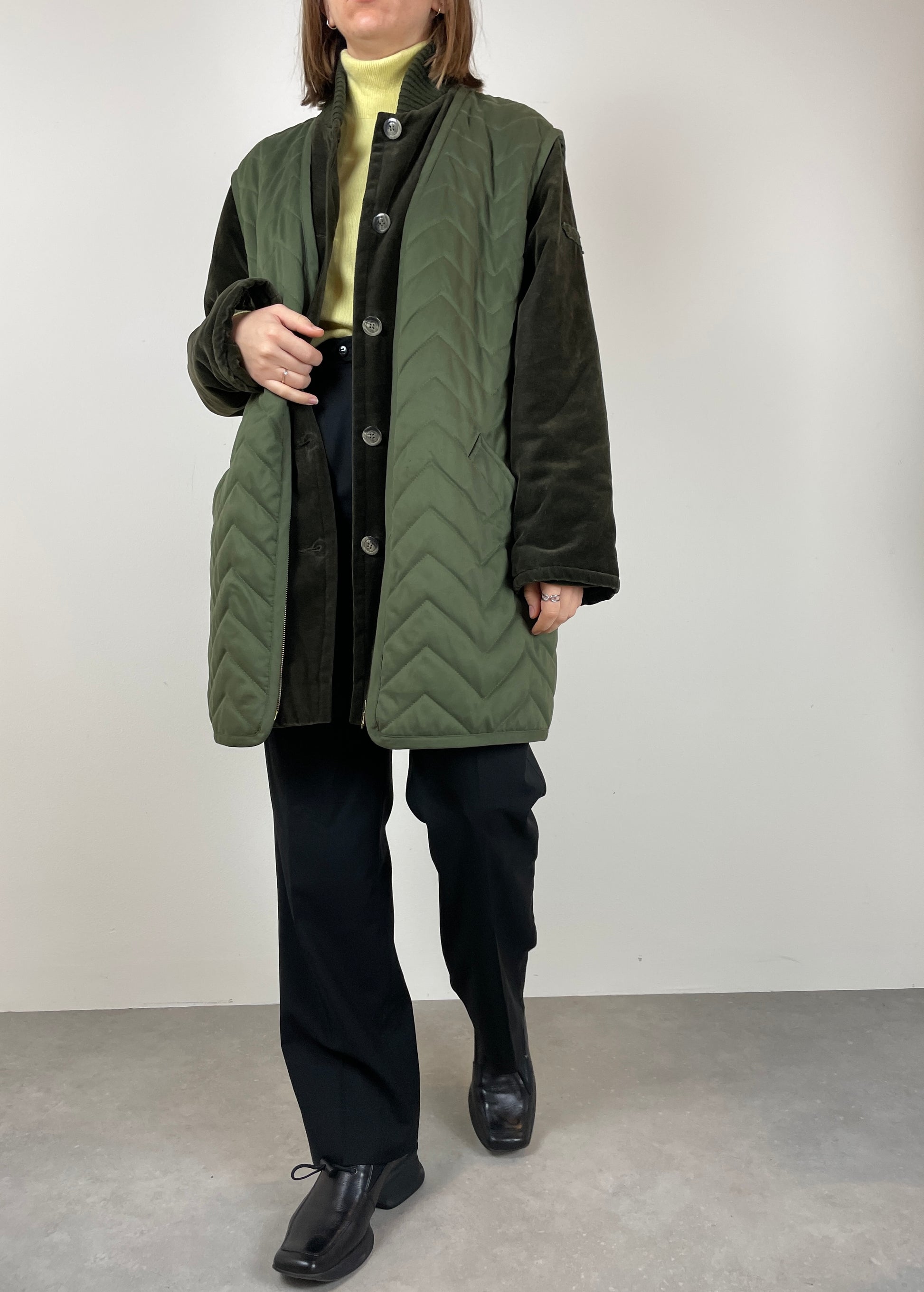 Giacca in velluto verde con gilet trapuntato cucito sopra.