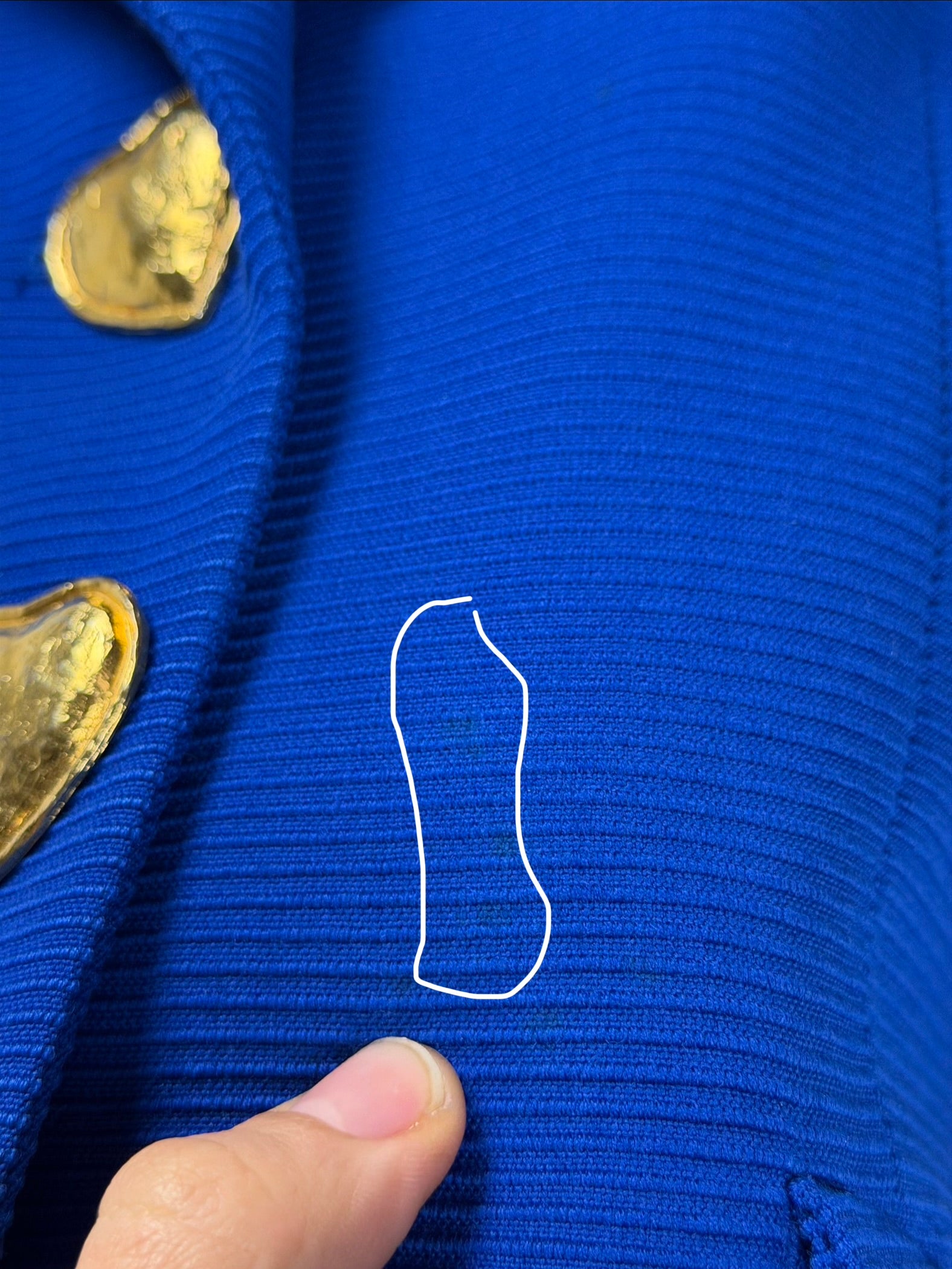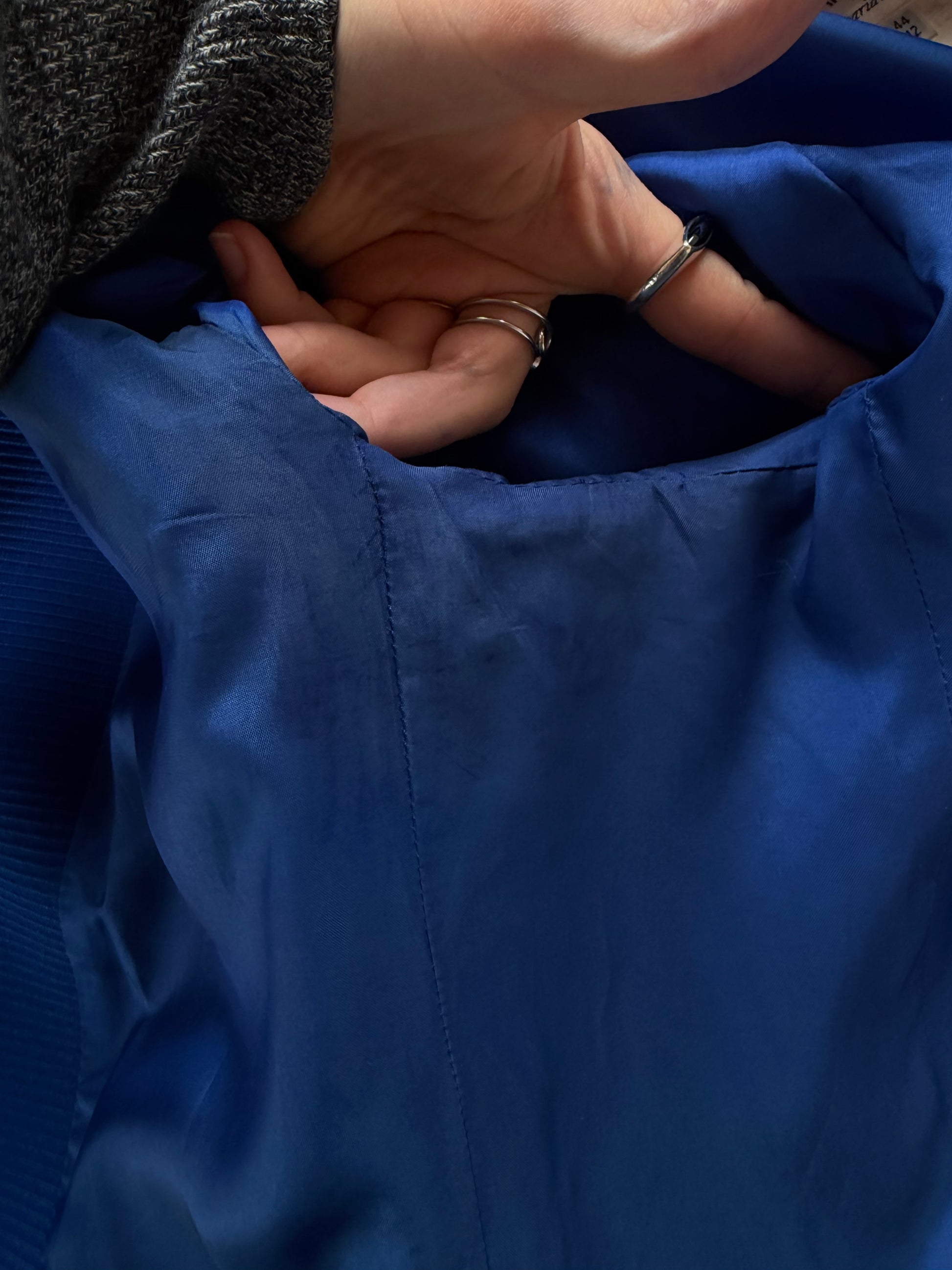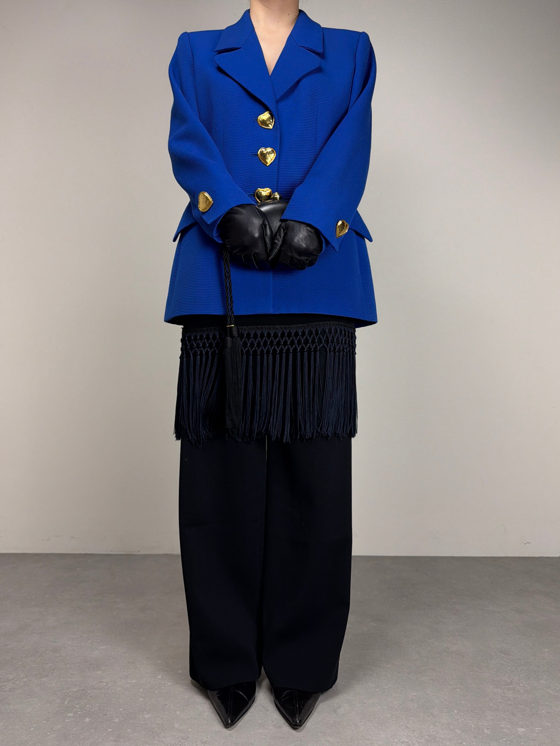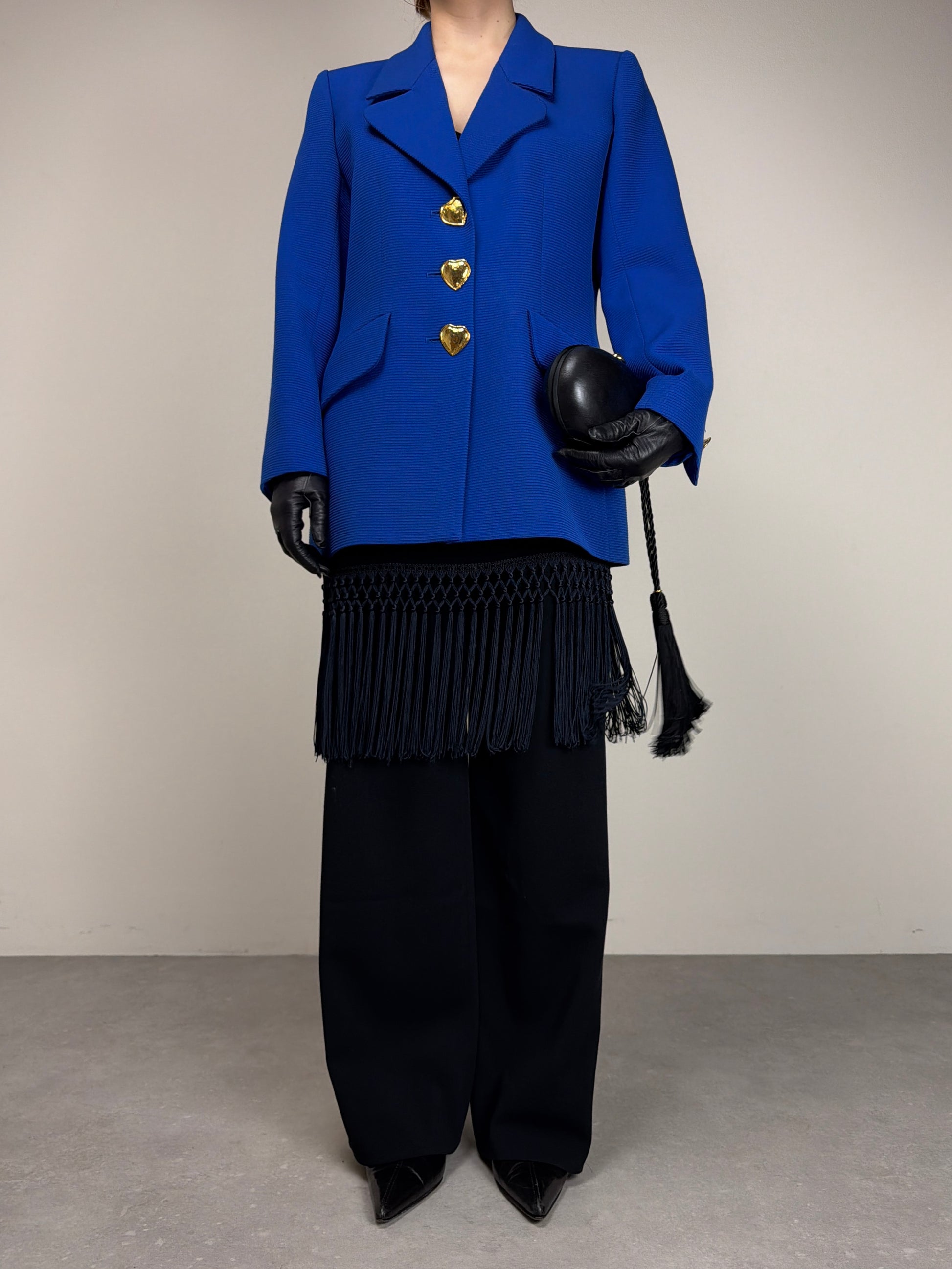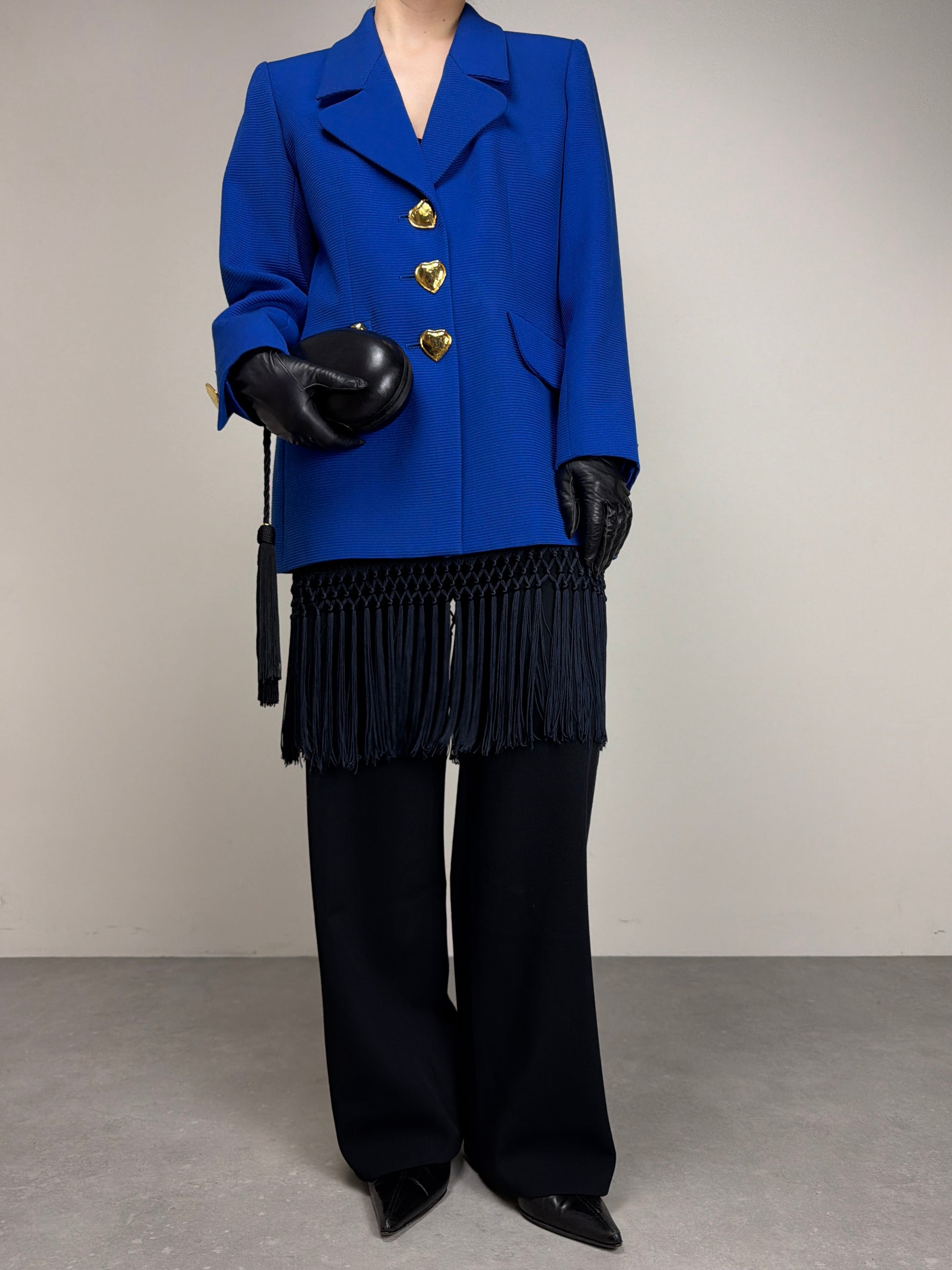 Un blazer iconico Yves Saint Laurent del 1995, realizzato in pura lana blu elettrico dalla linea strutturata. I bottoni gioiello dorati a forma di cuore, firma simbolica della maison, definiscono il carattere del capo, rendendolo immediatamente riconoscibile. Un pezzo da collezione apparso anche nel film Barbie (2023).